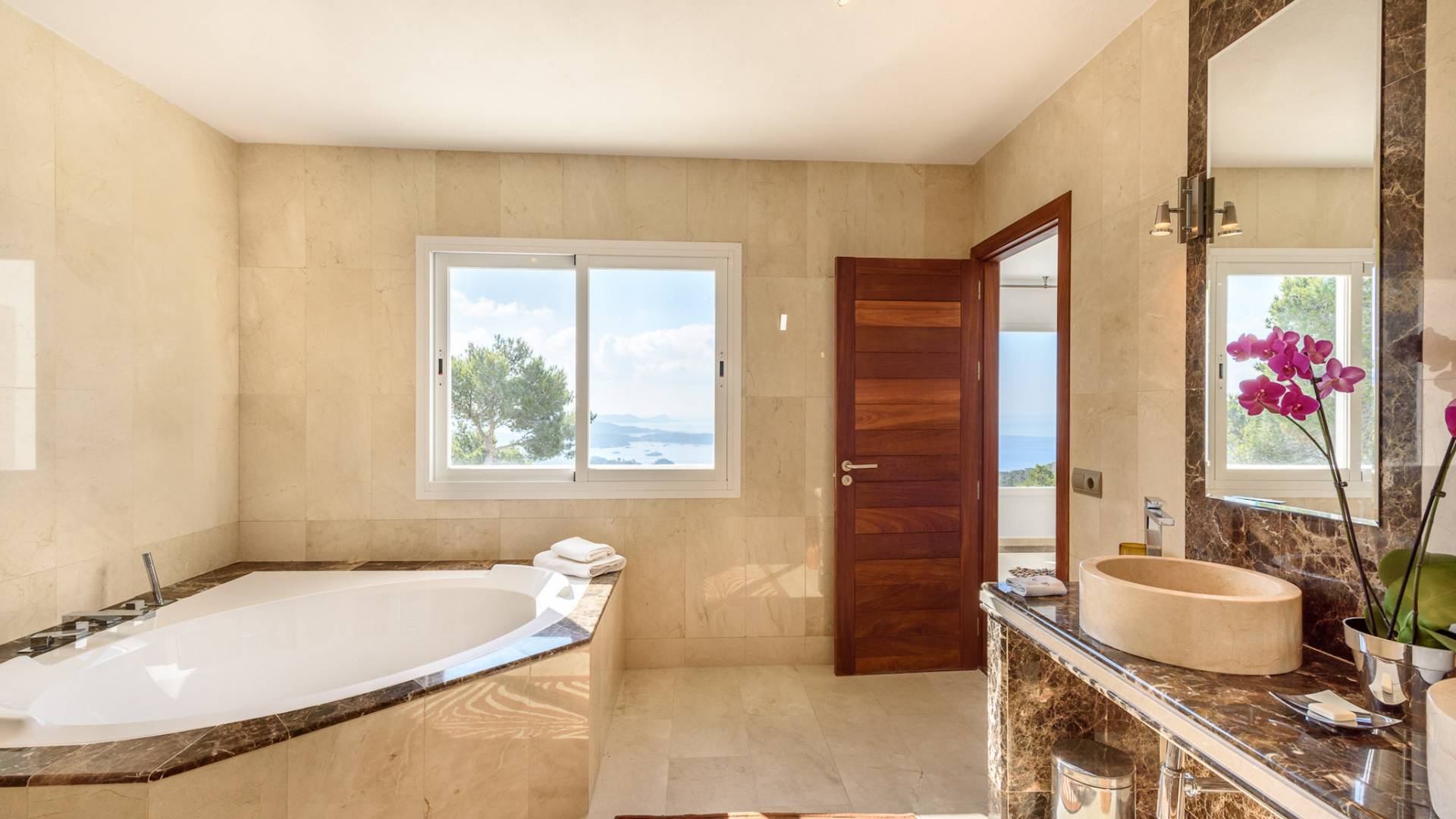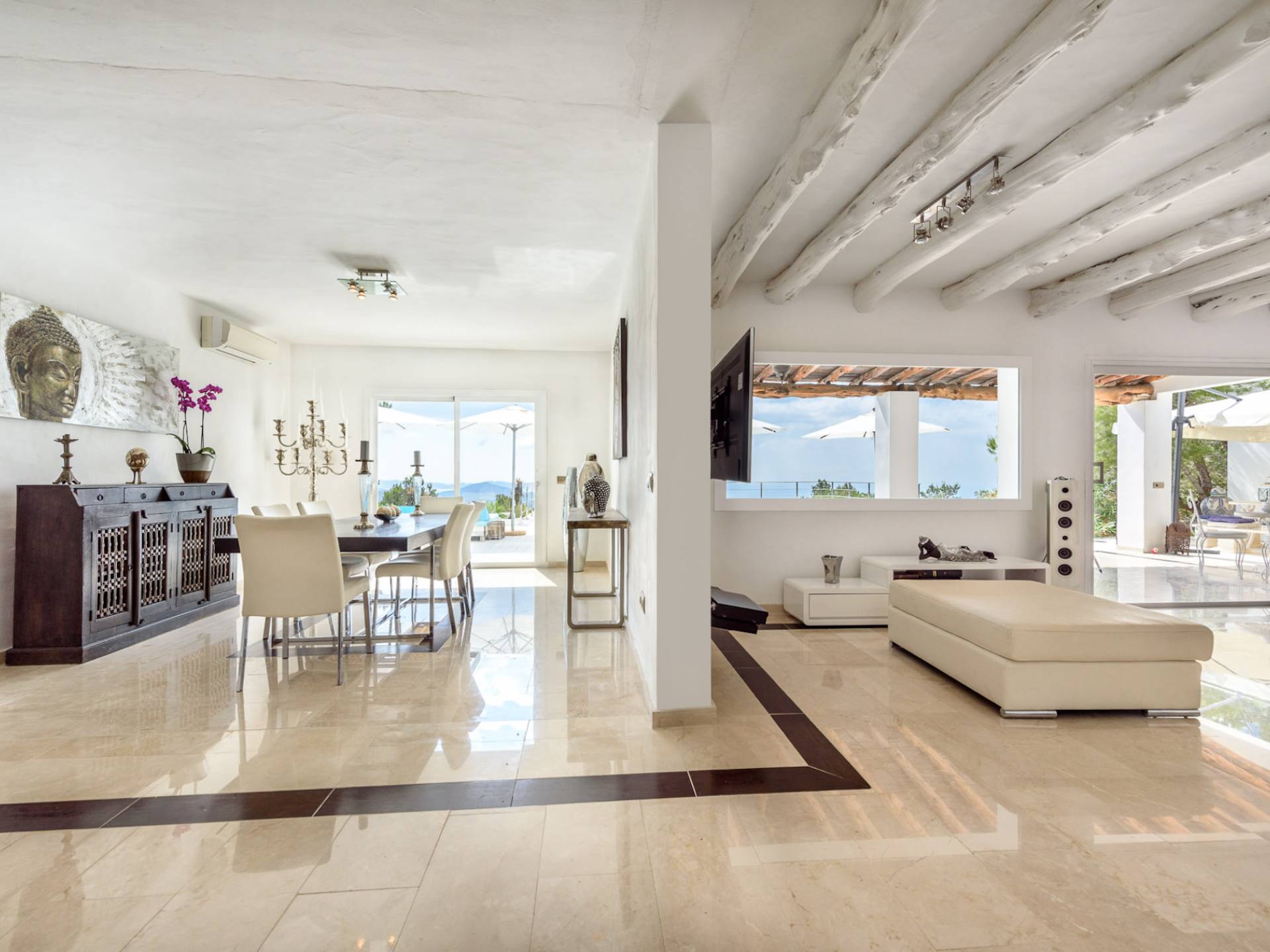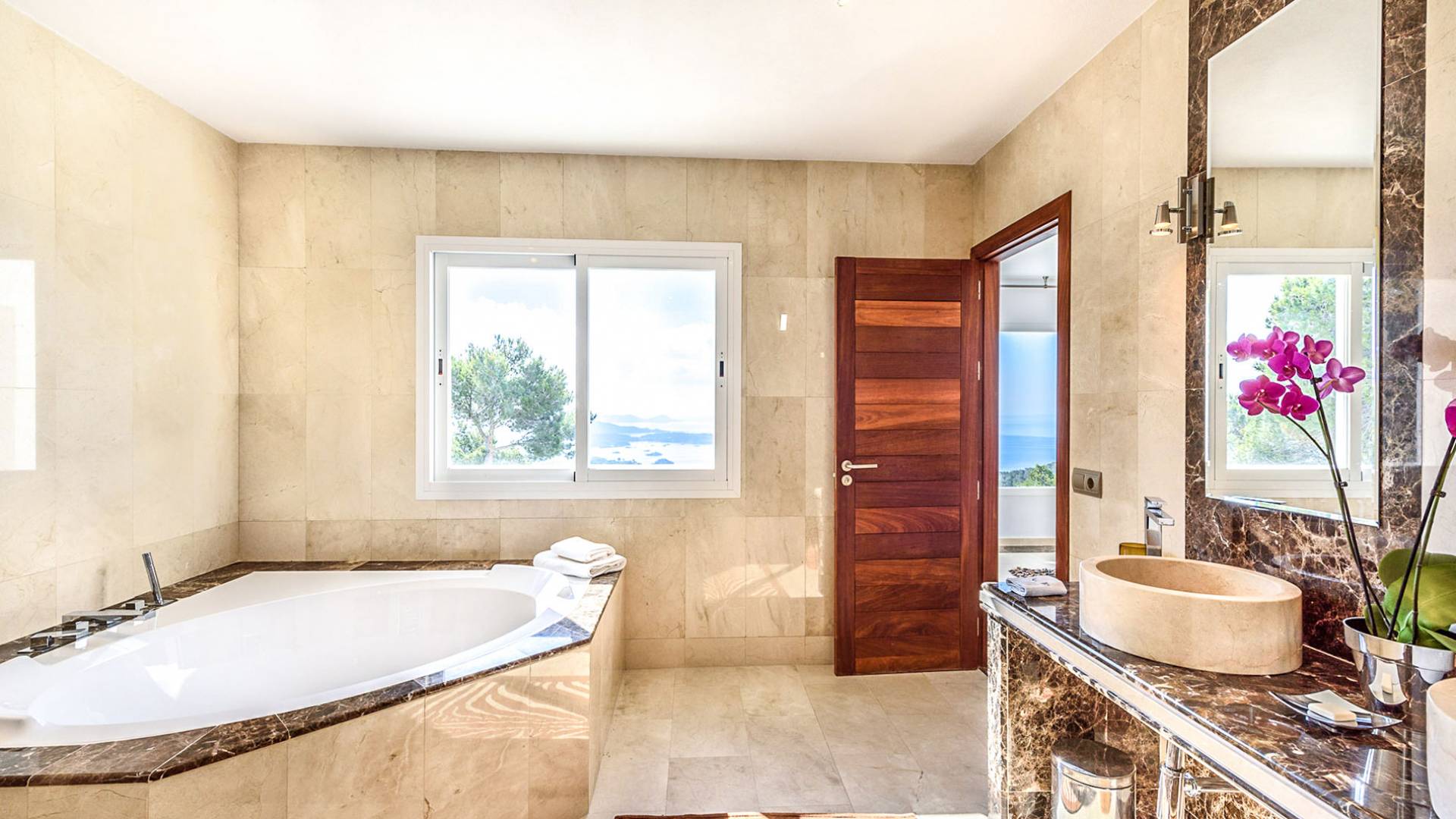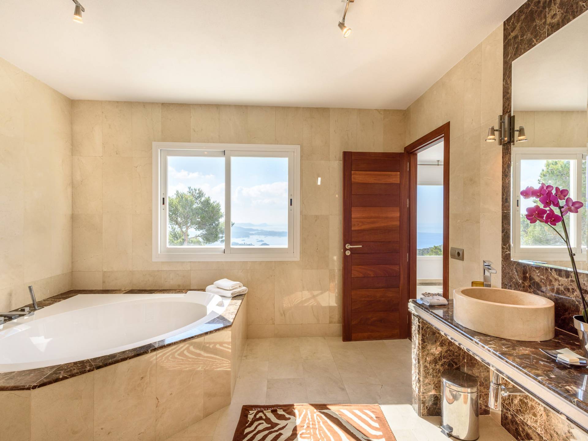 La Casa Romero Ibiza is a modern Moroccan-influenced property with amazing sea views situated in the heart of Ibiza’s golden mile. This beautiful 6 bedroom villa located in Es Cubells is built on a 4,500 m² plot which is fully enclosed with the added security of an electric gate. It is south facing with spectacular sea views to Salinas, Cala Jondal, and Formentera and only 10 minutes from San Jose and Cala Jondal Beach, Ibiza Town is only 20 minutes away.