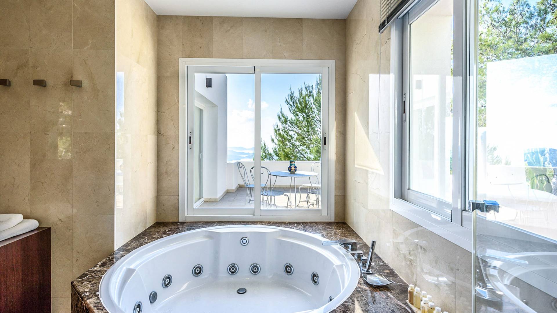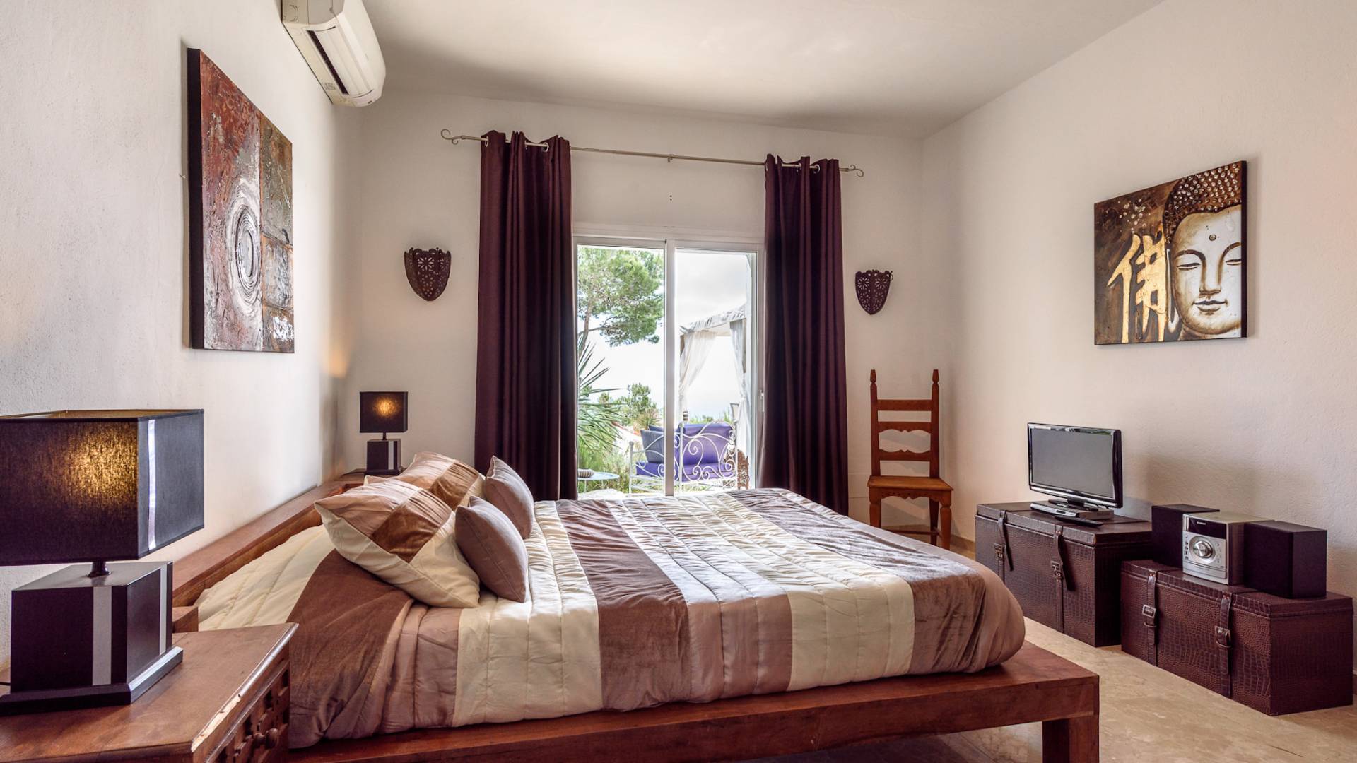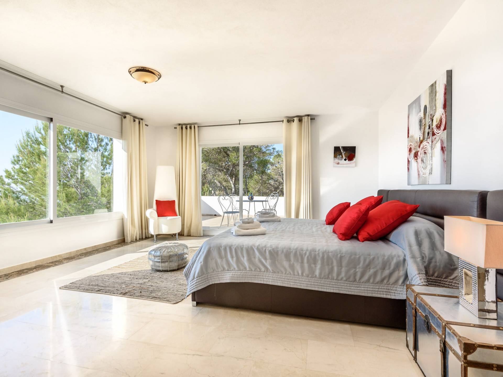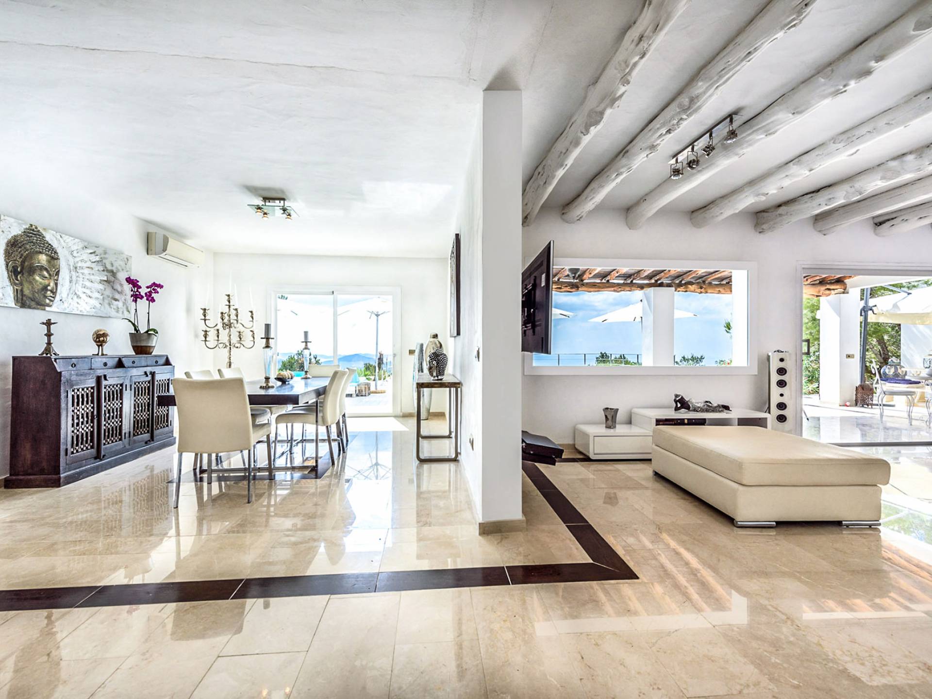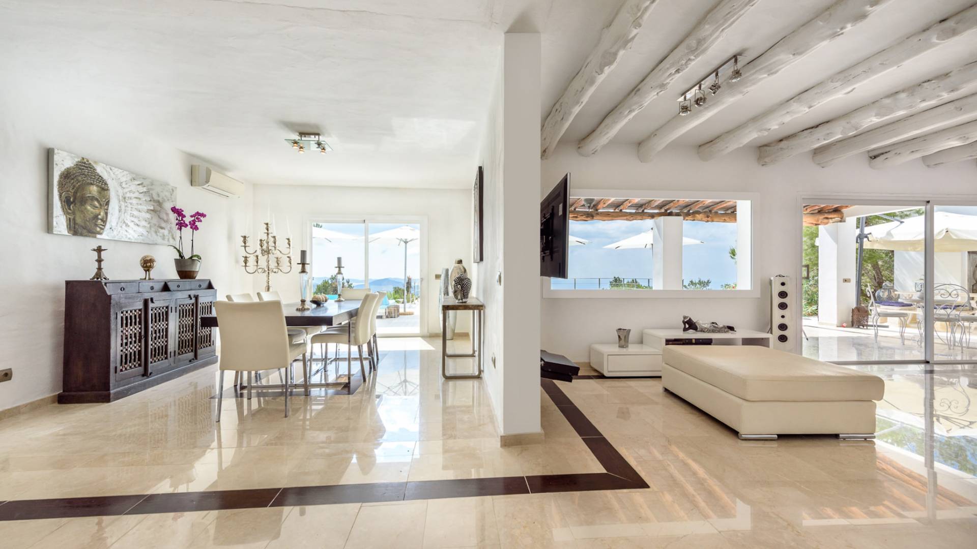 La Casa Romero Ibiza is a modern Moroccan-influenced property with amazing sea views situated in the heart of Ibiza’s golden mile. This beautiful 6 bedroom villa located in Es Cubells is built on a 4,500 m² plot which is fully enclosed with the added security of an electric gate. It is south facing with spectacular sea views to Salinas, Cala Jondal, and Formentera and only 10 minutes from San Jose and Cala Jondal Beach, Ibiza Town is only 20 minutes away.
