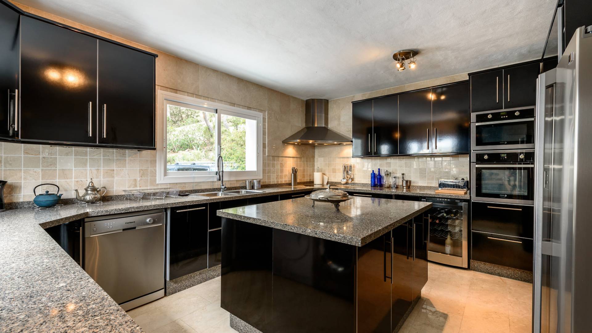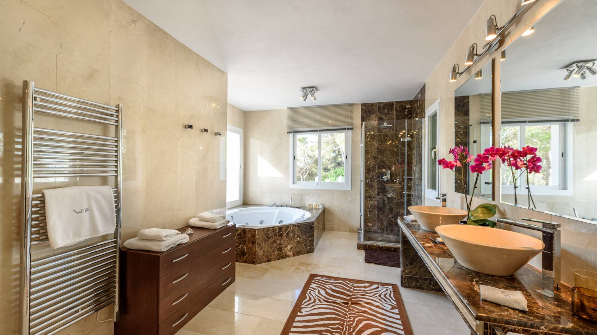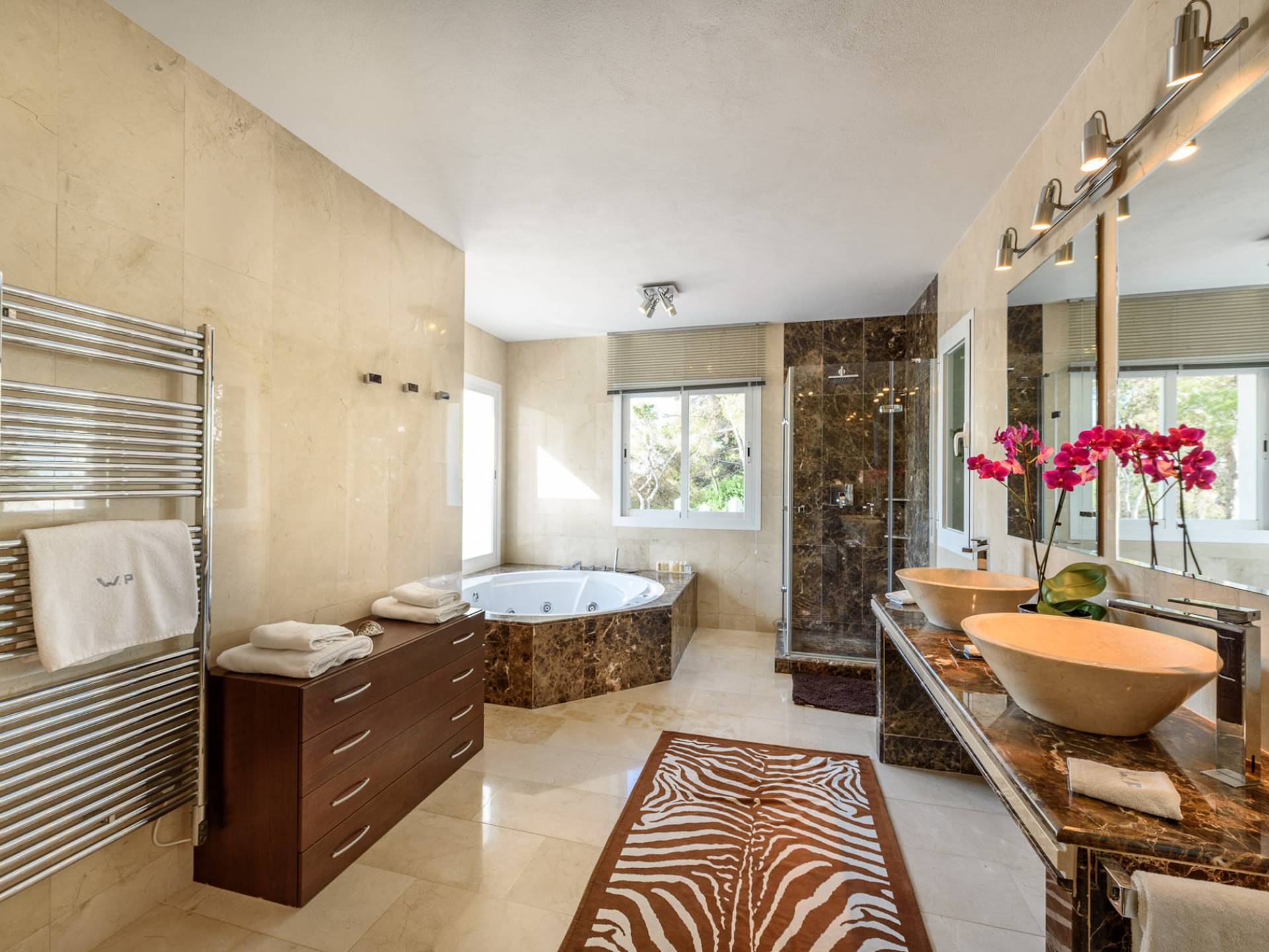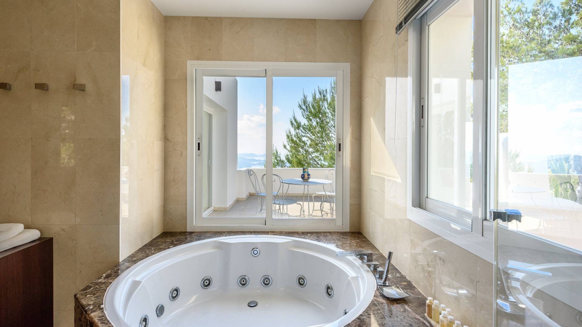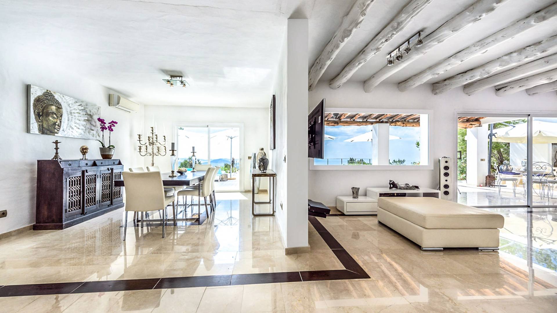 La Casa Romero Ibiza is a modern Moroccan-influenced property with amazing sea views situated in the heart of Ibiza’s golden mile. This beautiful 6 bedroom villa located in Es Cubells is built on a 4,500 m² plot which is fully enclosed with the added security of an electric gate. It is south facing with spectacular sea views to Salinas, Cala Jondal, and Formentera and only 10 minutes from San Jose and Cala Jondal Beach, Ibiza Town is only 20 minutes away.