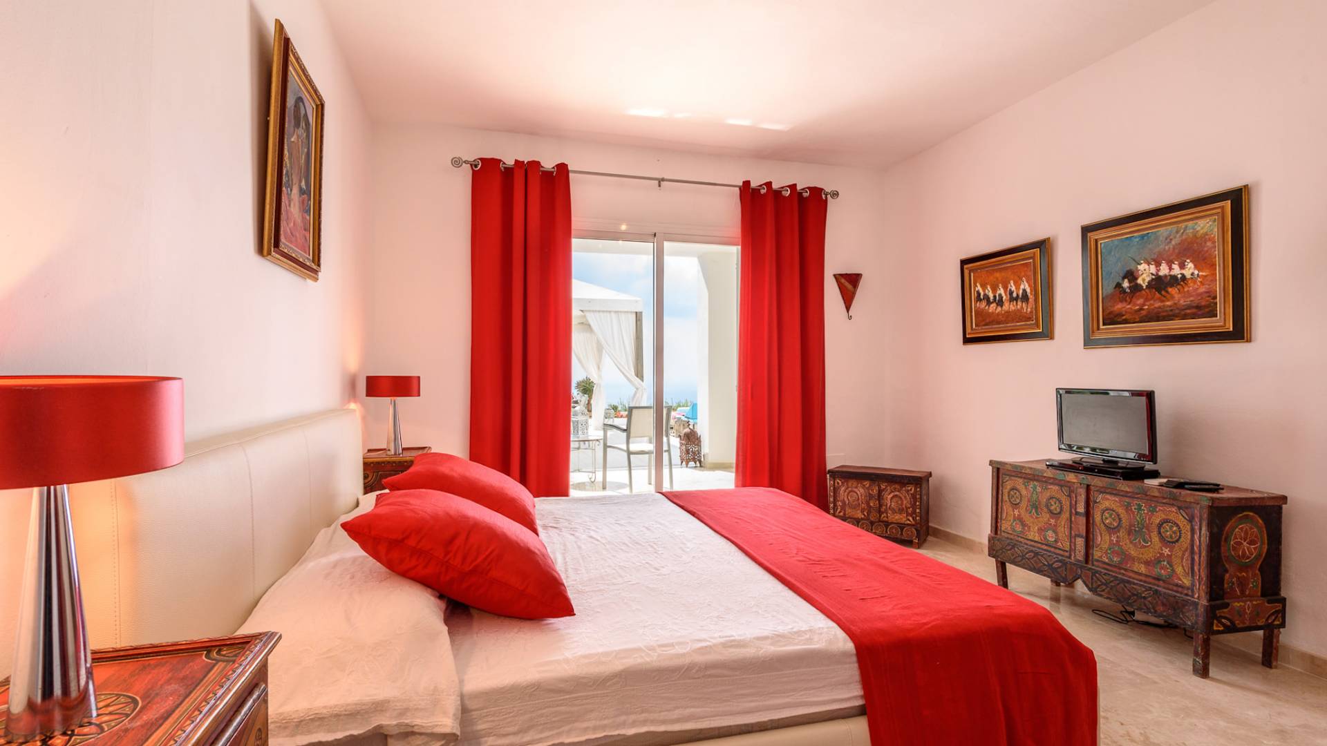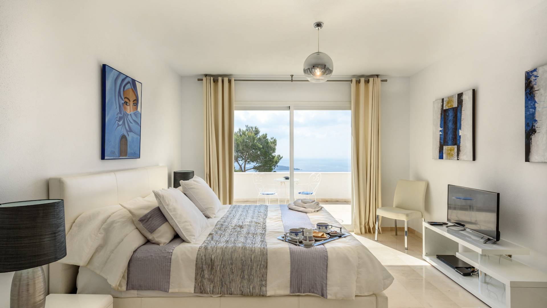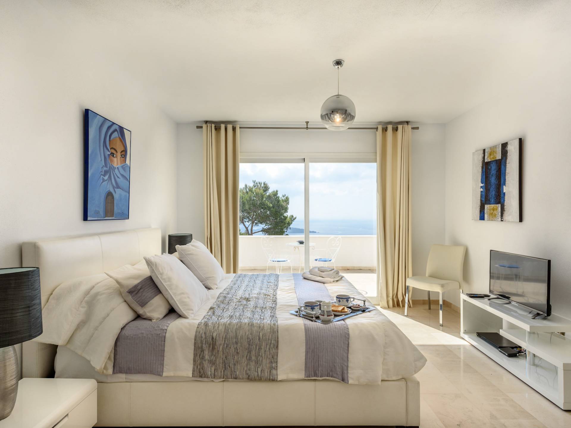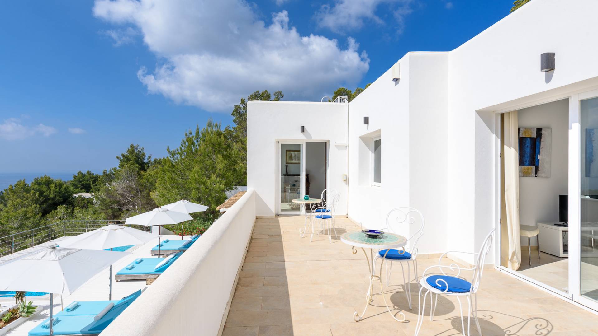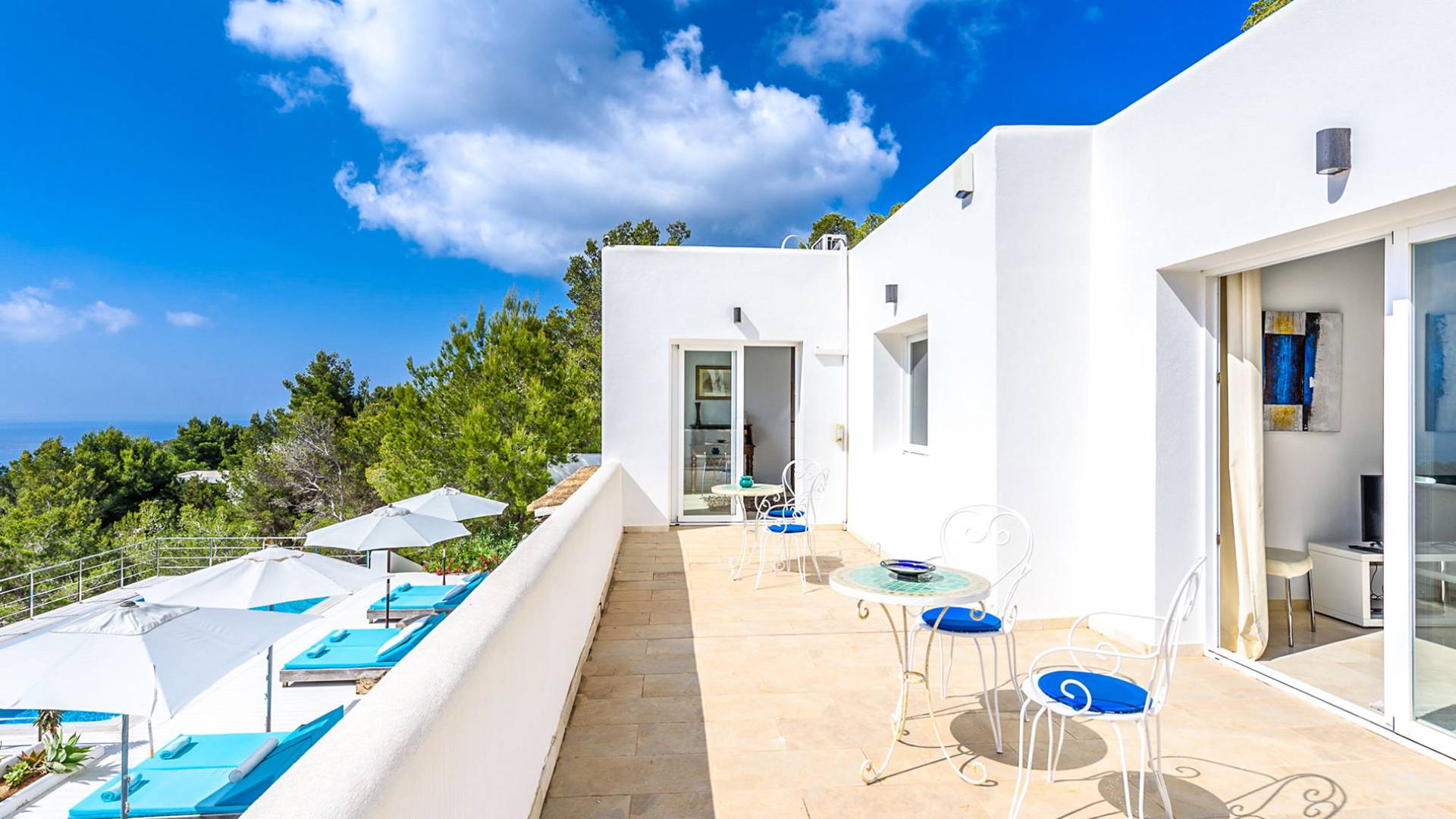 The living areas have been designed and furnished beautifully, the large lounge area boasts a luxurious sofa, satellite TV, and audio chain. The dining room is also spacious with wonderful views looking out onto the terrace and the sea beyond; there is a fully equipped modern kitchen with all modern appliances and a guest bathroom. All areas are fully air-conditioned and have access to WiFi.
