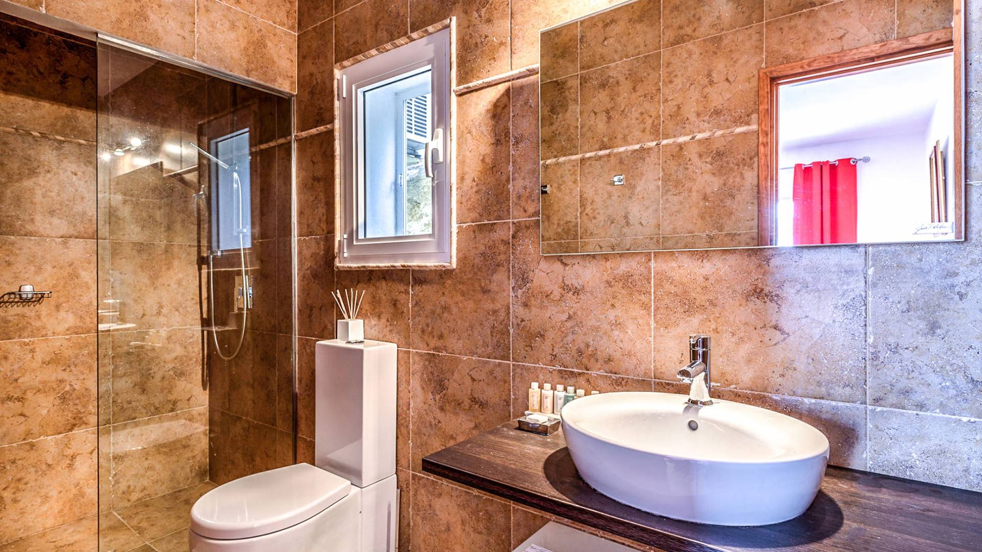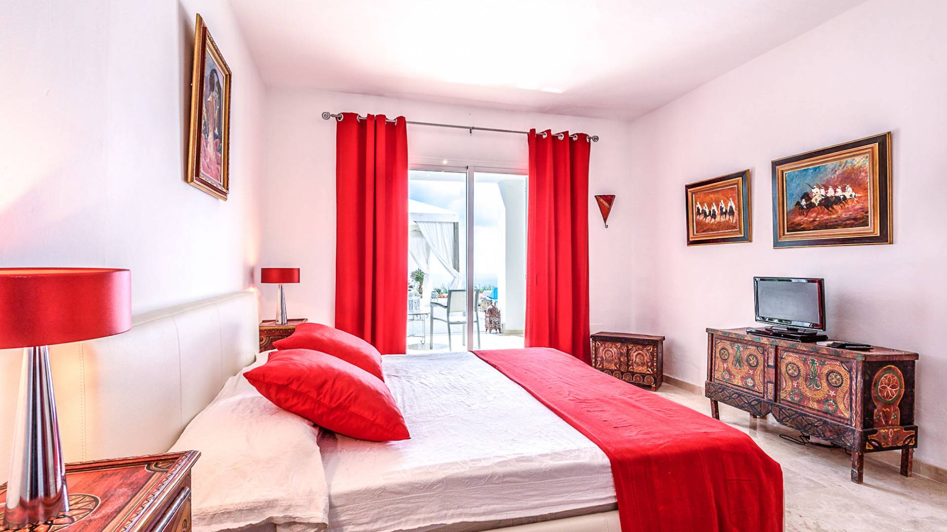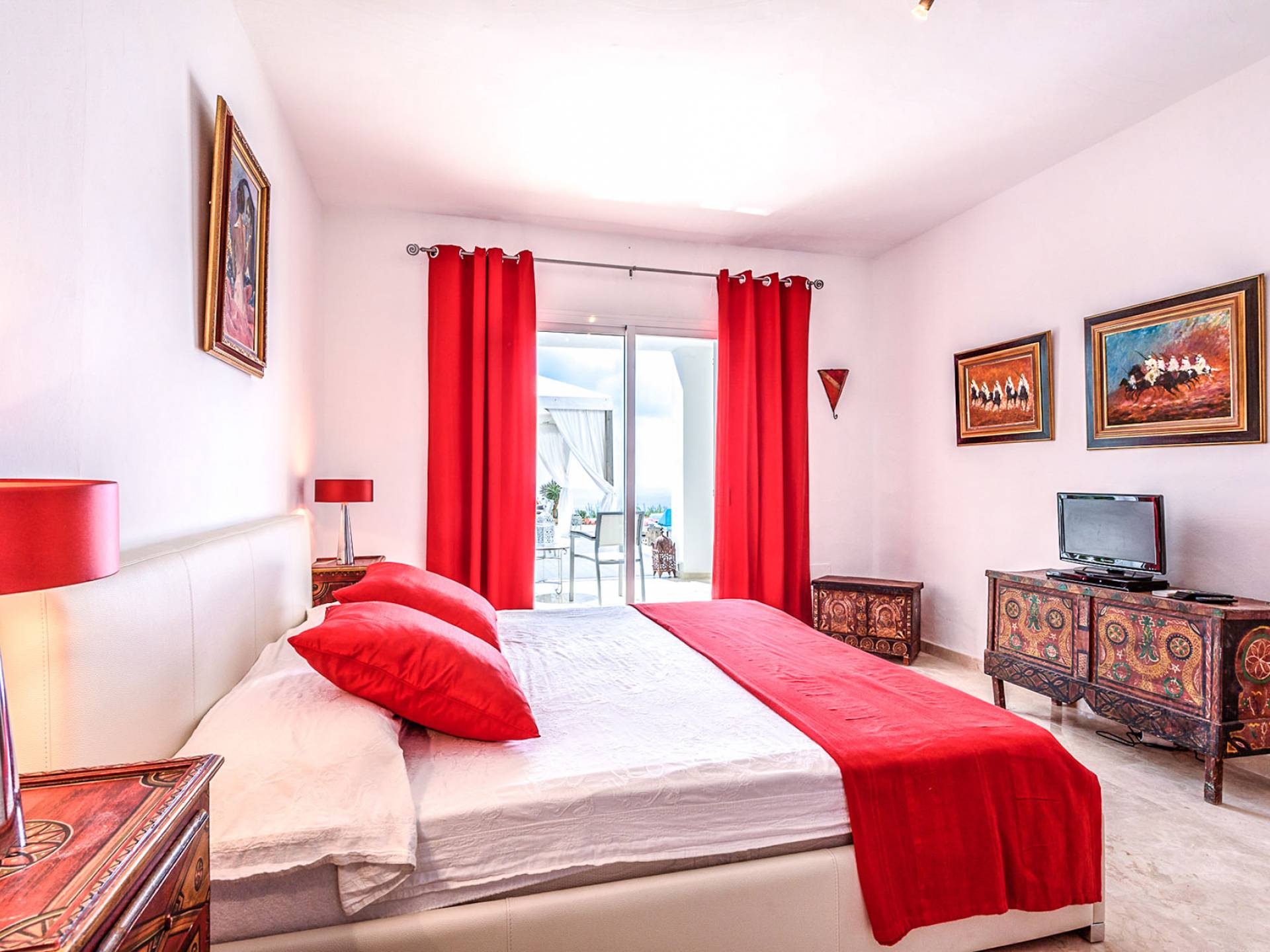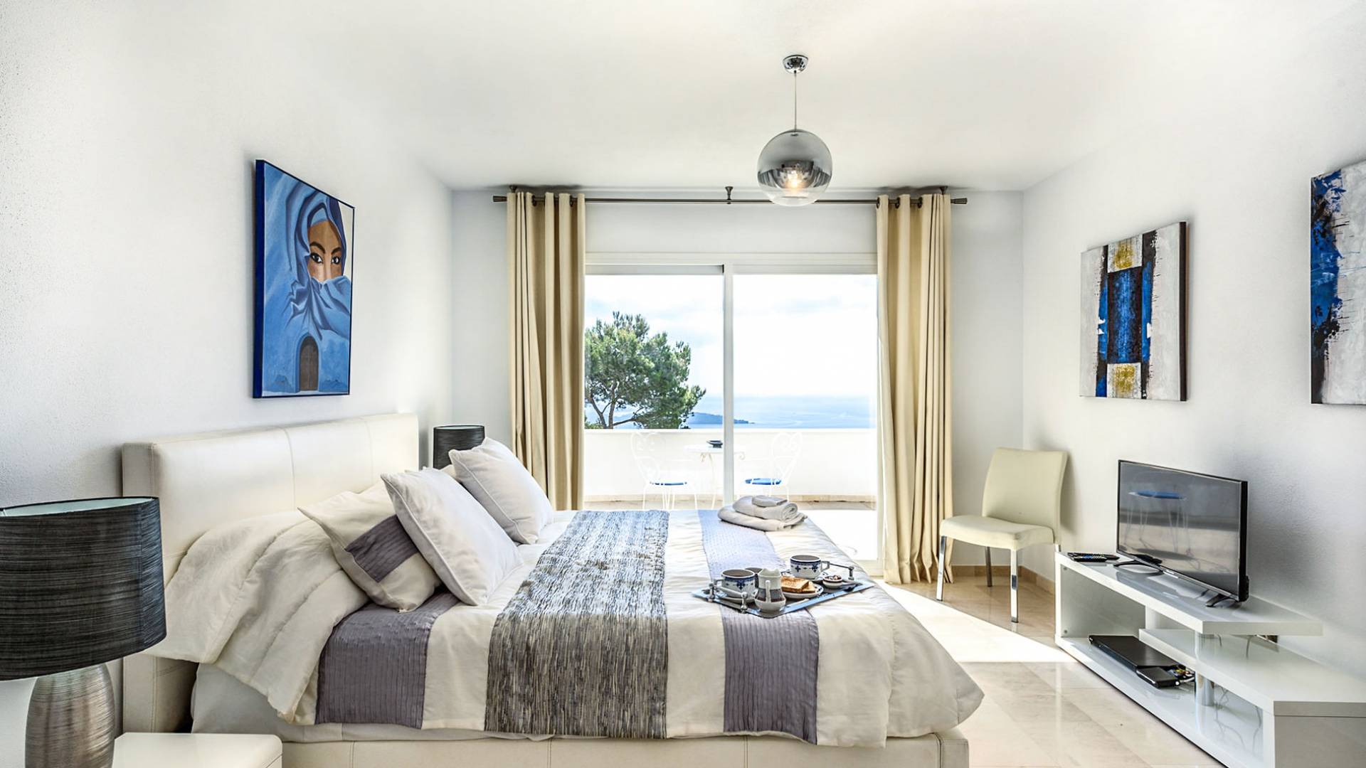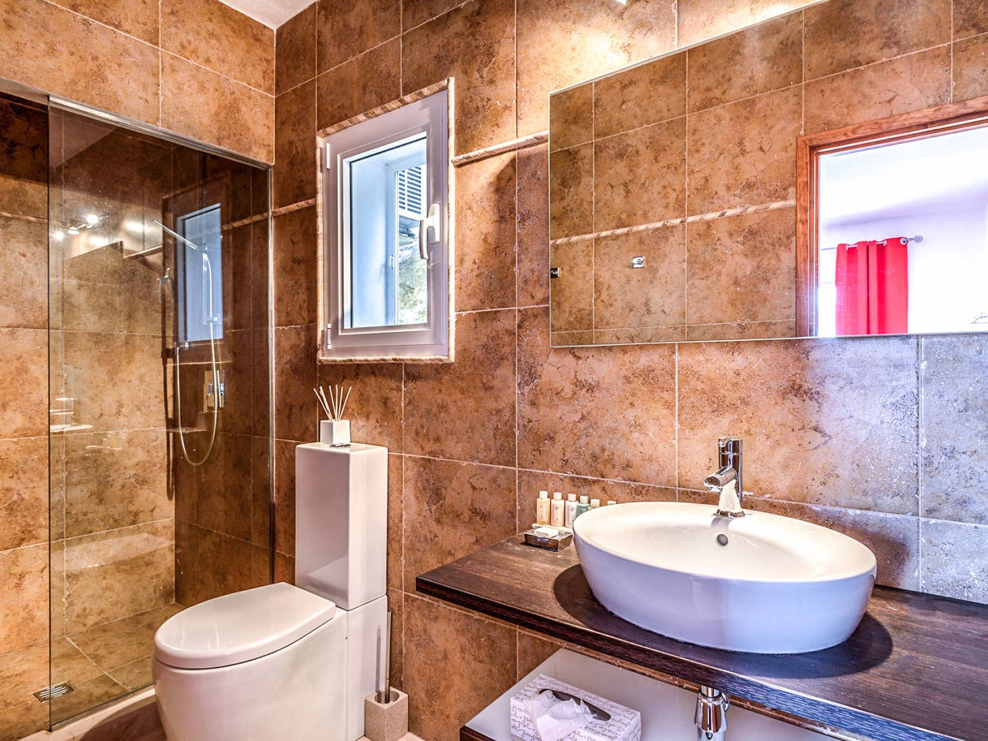 The living areas have been designed and furnished beautifully, the large lounge area boasts a luxurious sofa, satellite TV, and audio chain. The dining room is also spacious with wonderful views looking out onto the terrace and the sea beyond; there is a fully equipped modern kitchen with all modern appliances and a guest bathroom. All areas are fully air-conditioned and have access to WiFi.