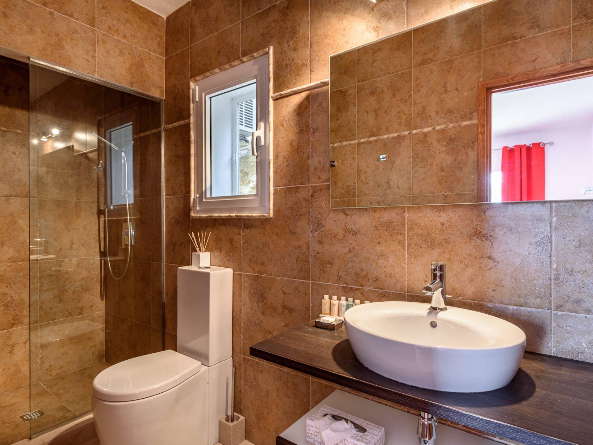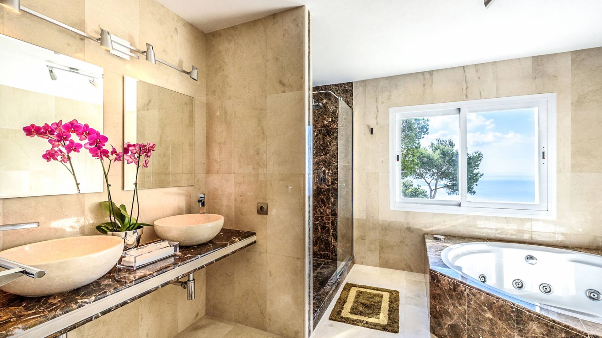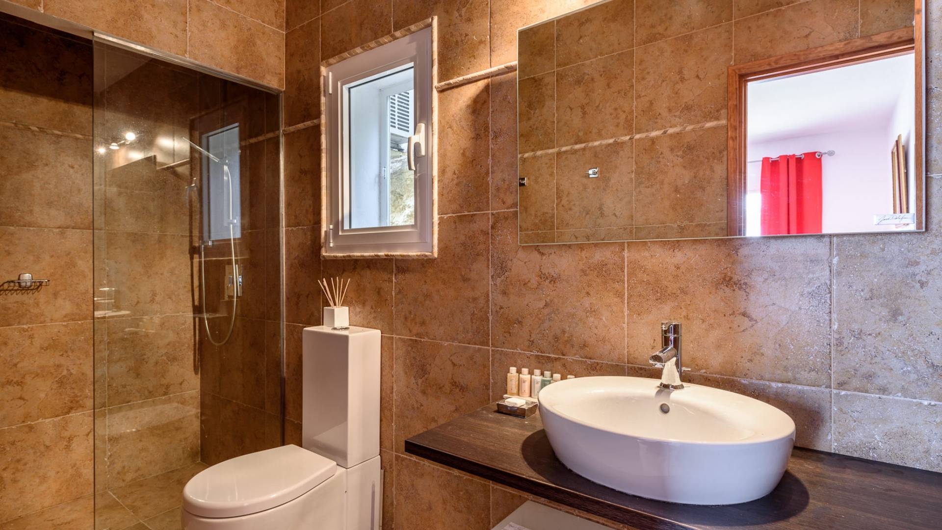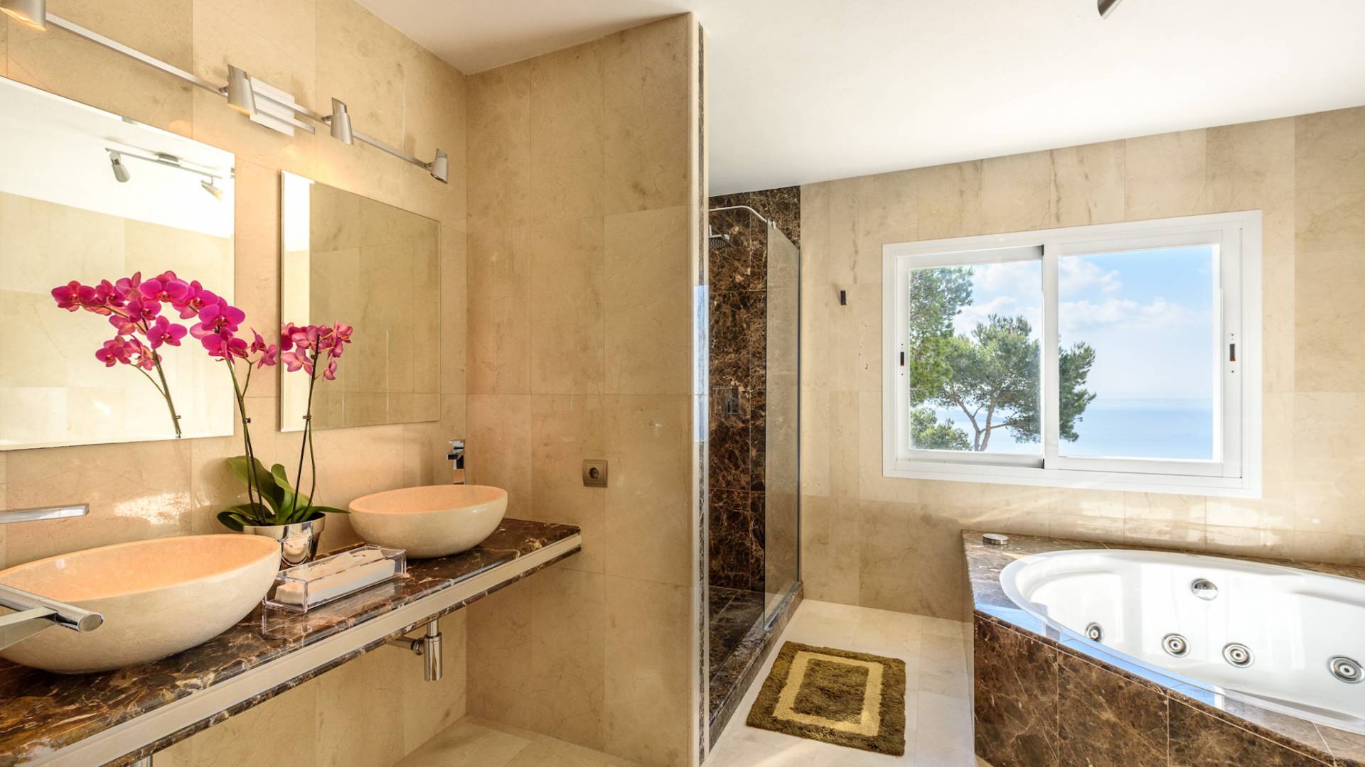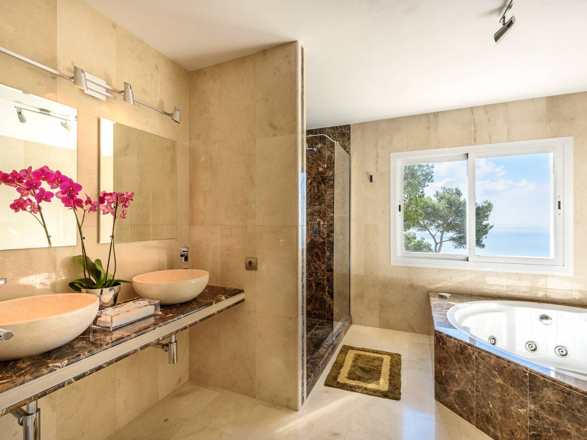The living areas have been designed and furnished beautifully, the large lounge area boasts a luxurious sofa, satellite TV, and audio chain. The dining room is also spacious with wonderful views looking out onto the terrace and the sea beyond; there is a fully equipped modern kitchen with all modern appliances and a guest bathroom. All areas are fully air-conditioned and have access to WiFi.