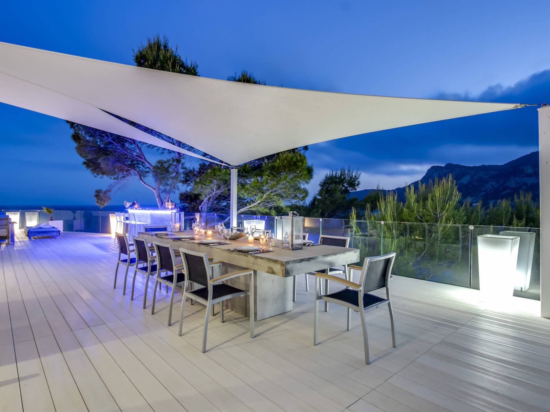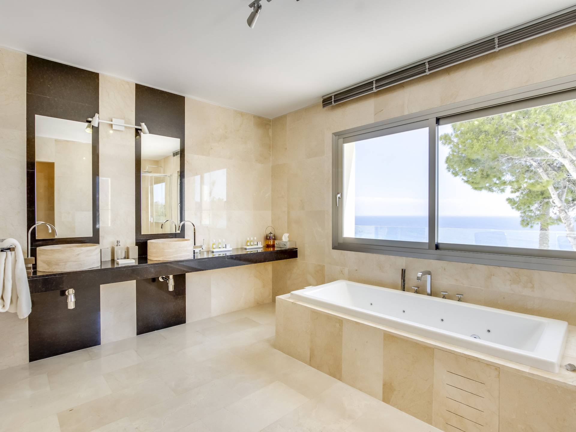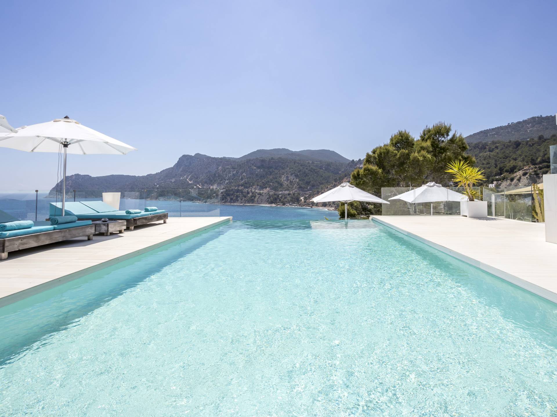It has several large terraces, also with breathtaking views. Due to its excellent location, this luxury villa is extremely private, it also features a fantastic outdoor area with an infinity pool surrounded by single and double sun loungers, parking for 4 cars, several terraces, and chill-out areas, and outdoor dining areas.