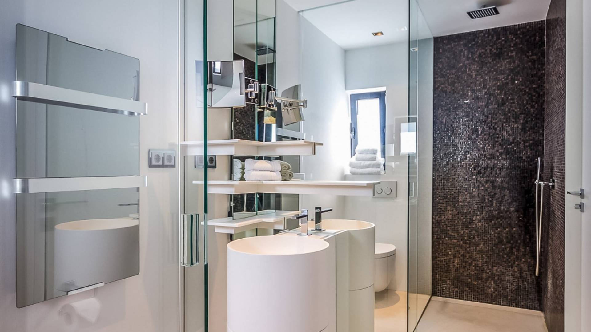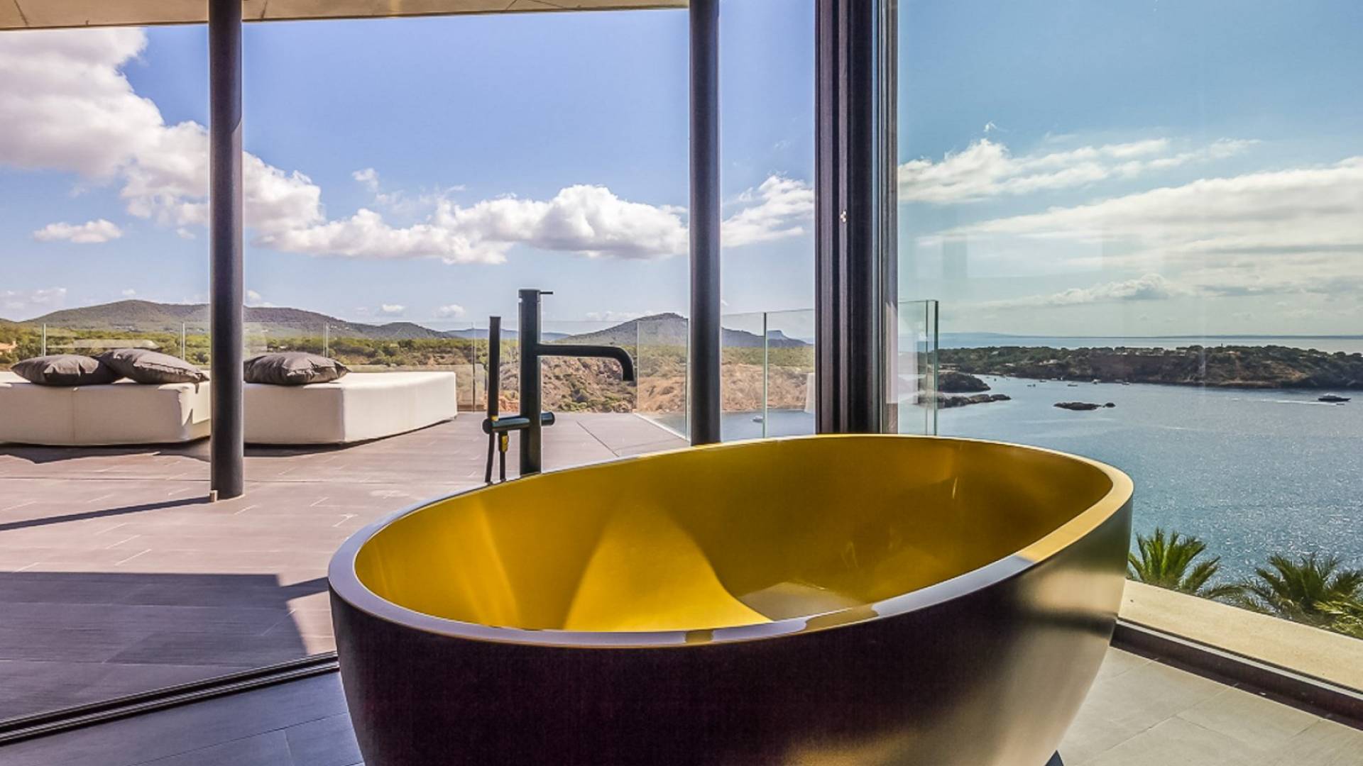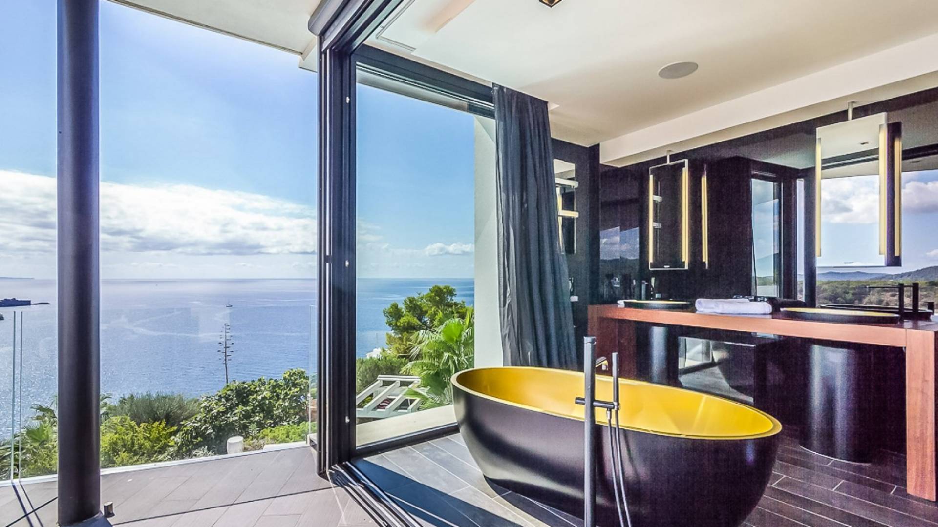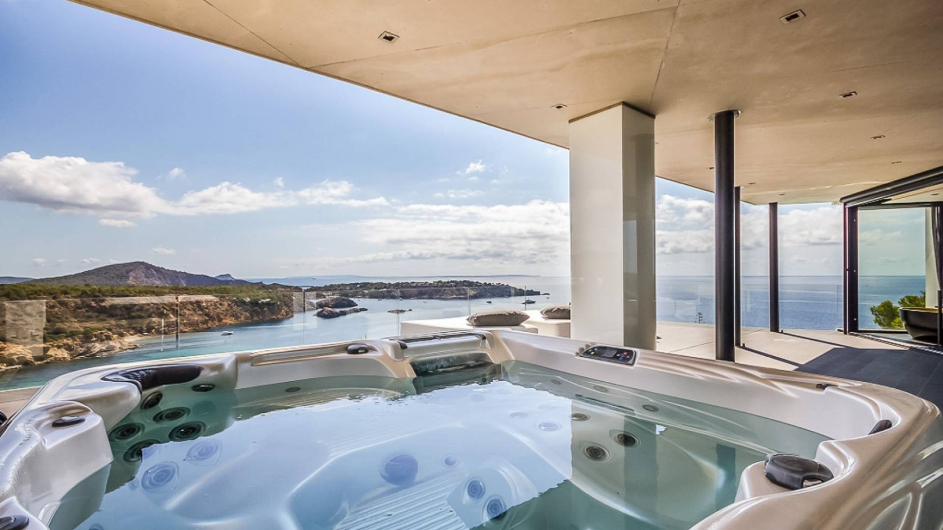 On the first floor, a large master suite features a king-size bed and a huge private terrace. Relax in the large free-standing bathtub to soak up the incredible vista of sparkling sea, or head onto the terrace to enjoy the vista from the hot tub. The other two double rooms both have en-suite bathrooms with rain showers. A fantastic Ibiza villa for a group or a family.