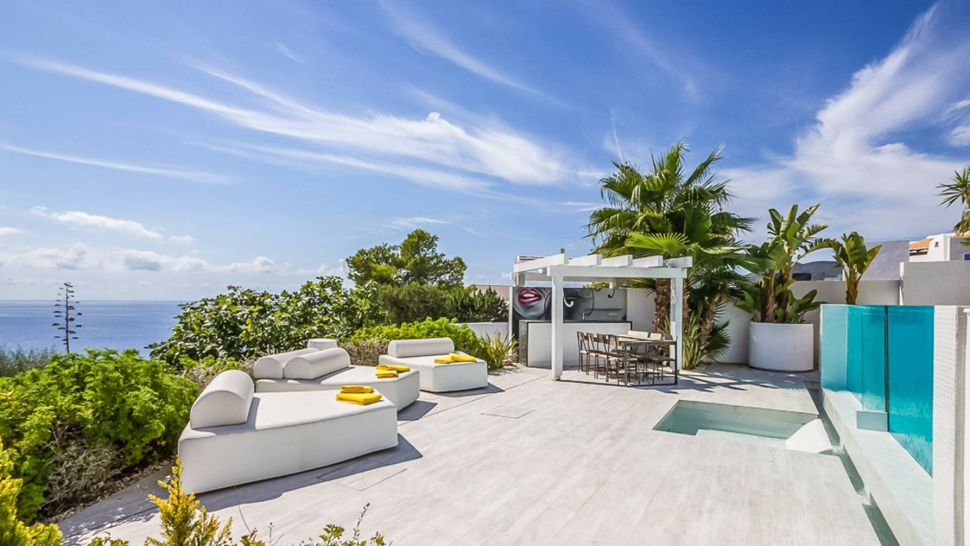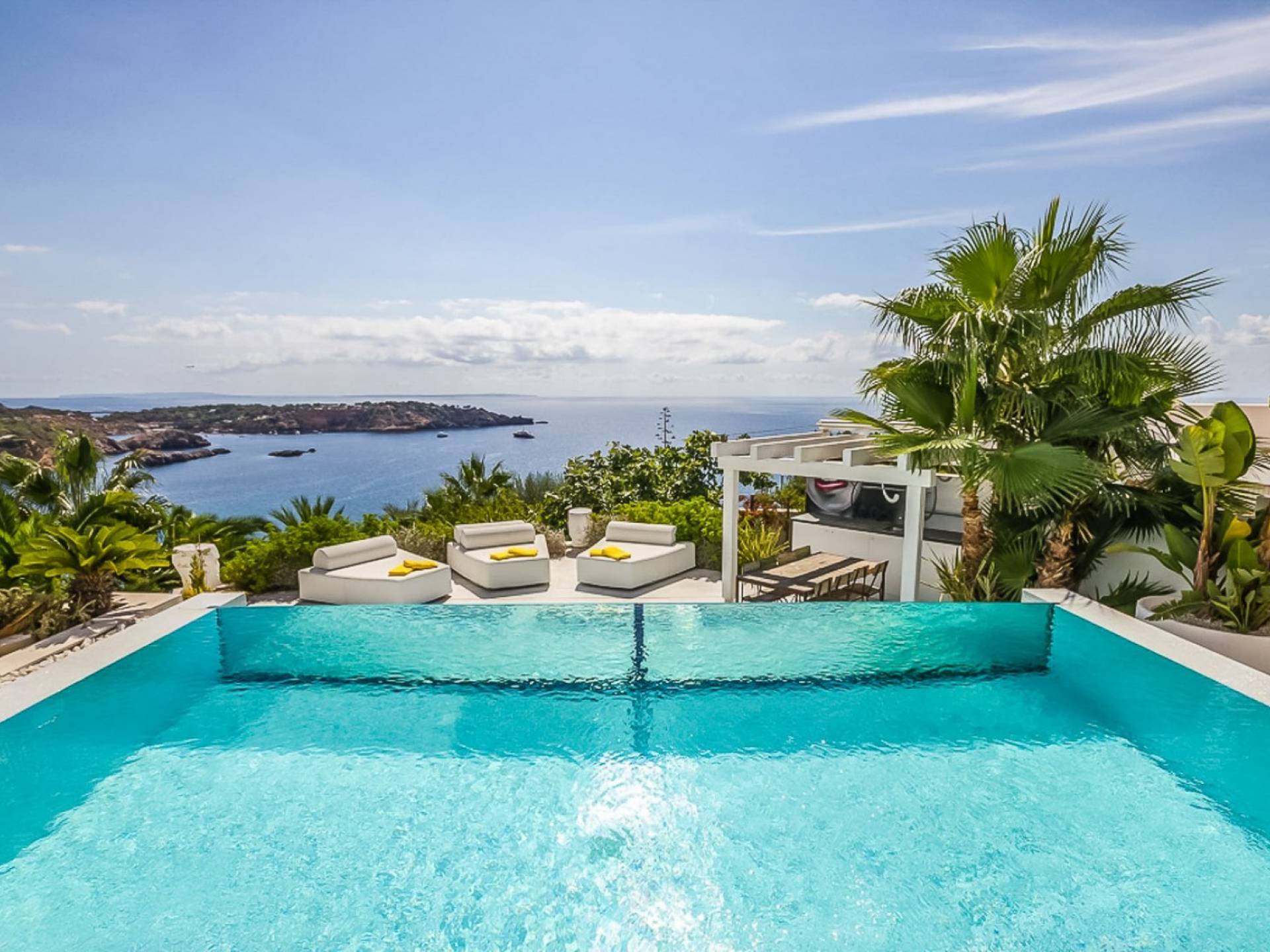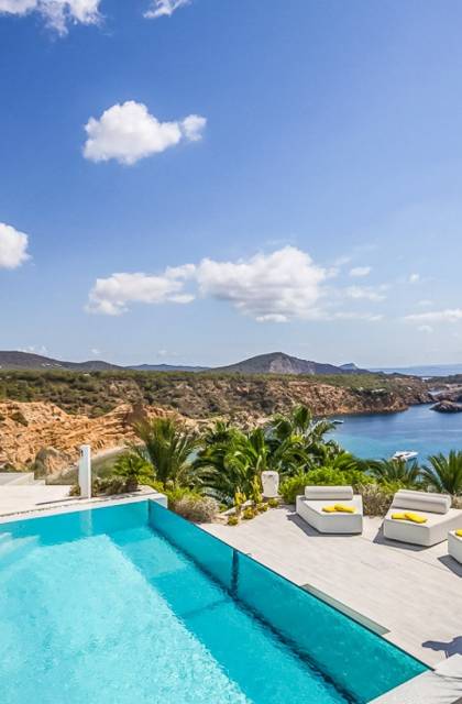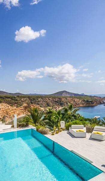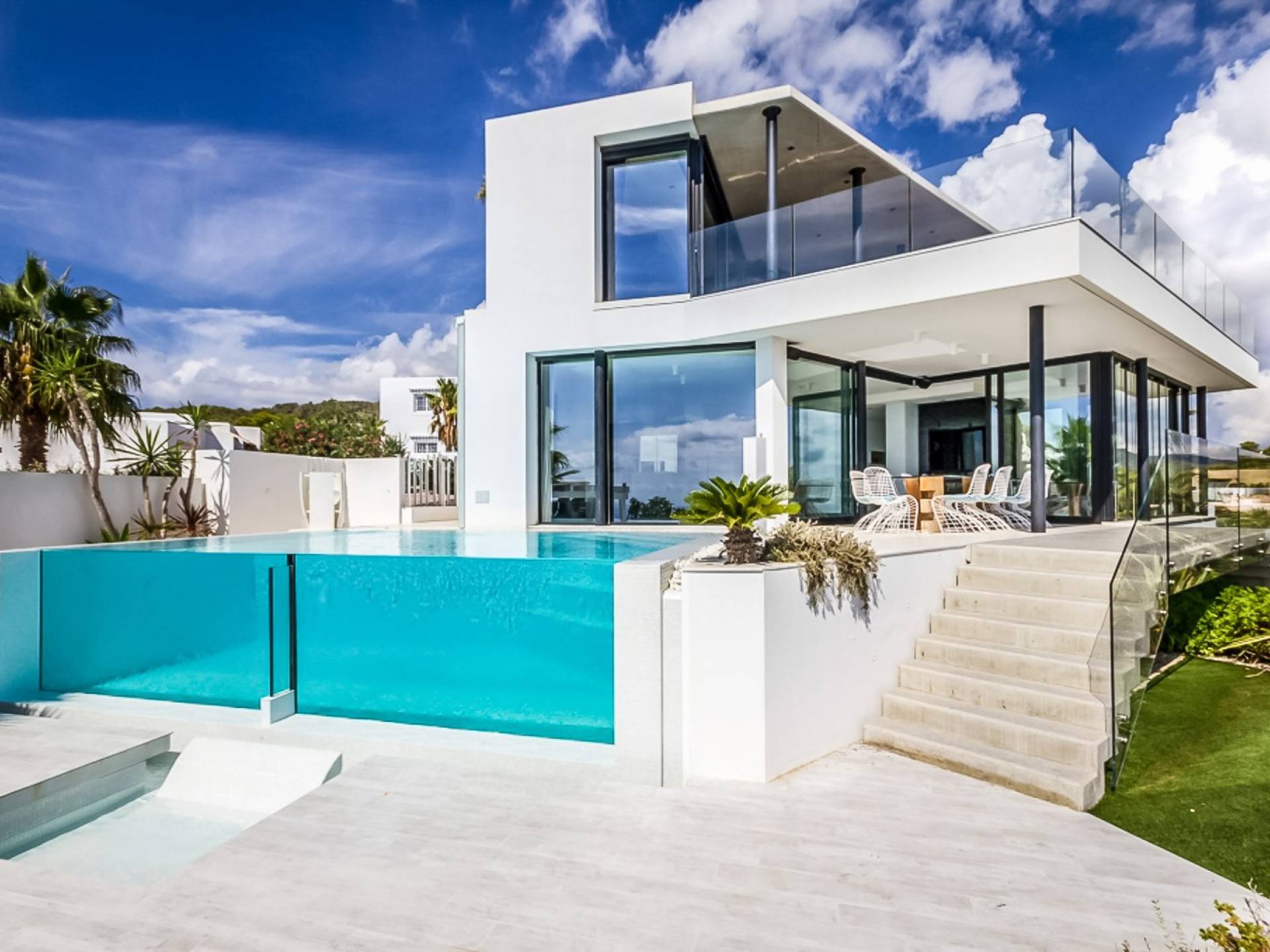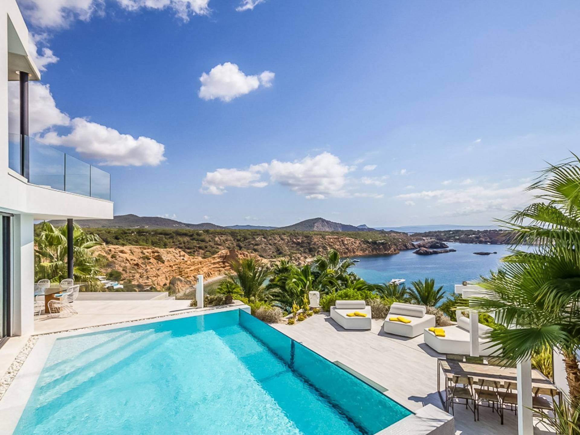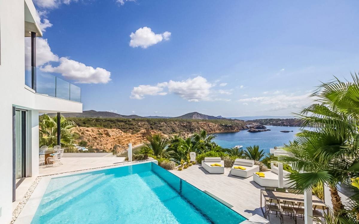 Villa Buena Ibiza is a luxury villa rental with 3 bedrooms and a private pool. This striking modern home occupies a commanding position above the beautiful bay of Es Torrent, affording wonderful views across the sparkling waters of the bay and the craggy cliffs and coves of Ibiza’s south coast.