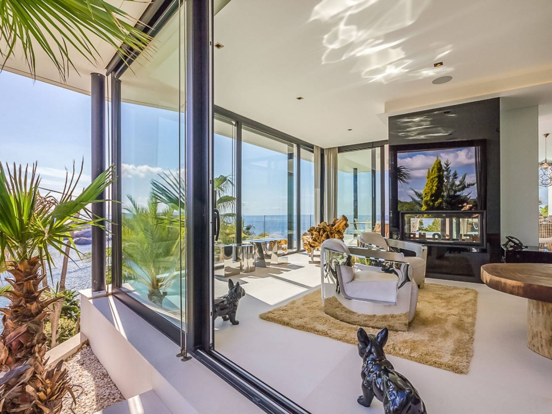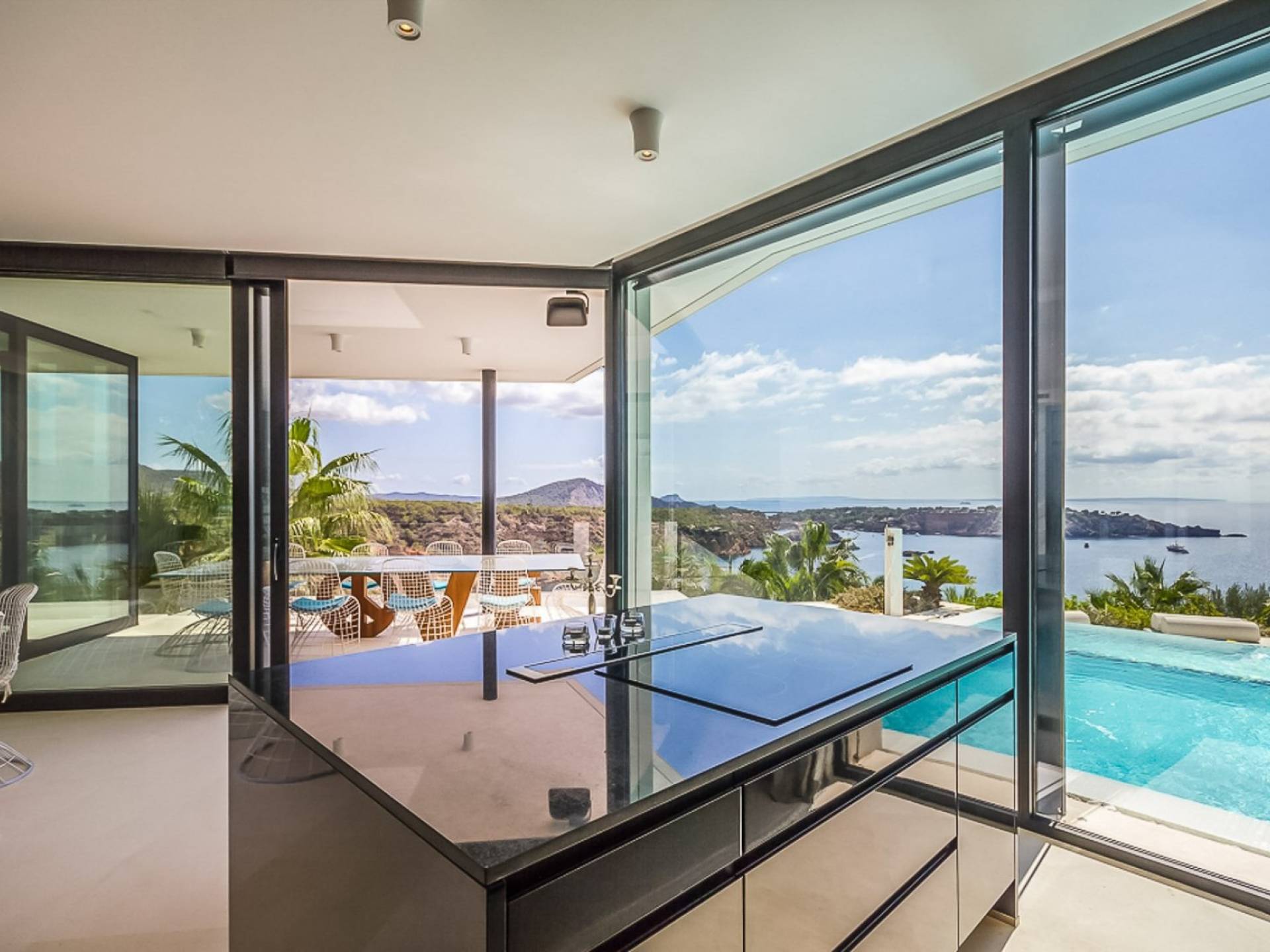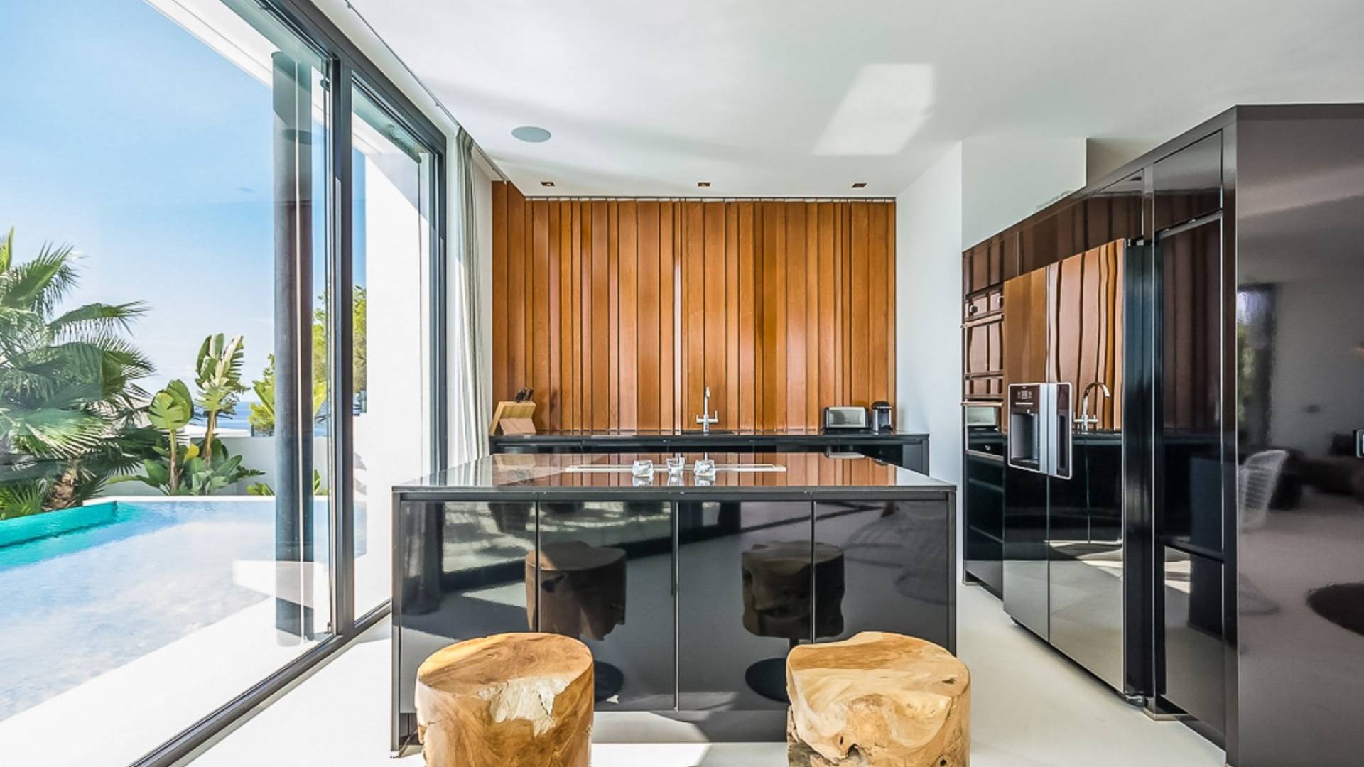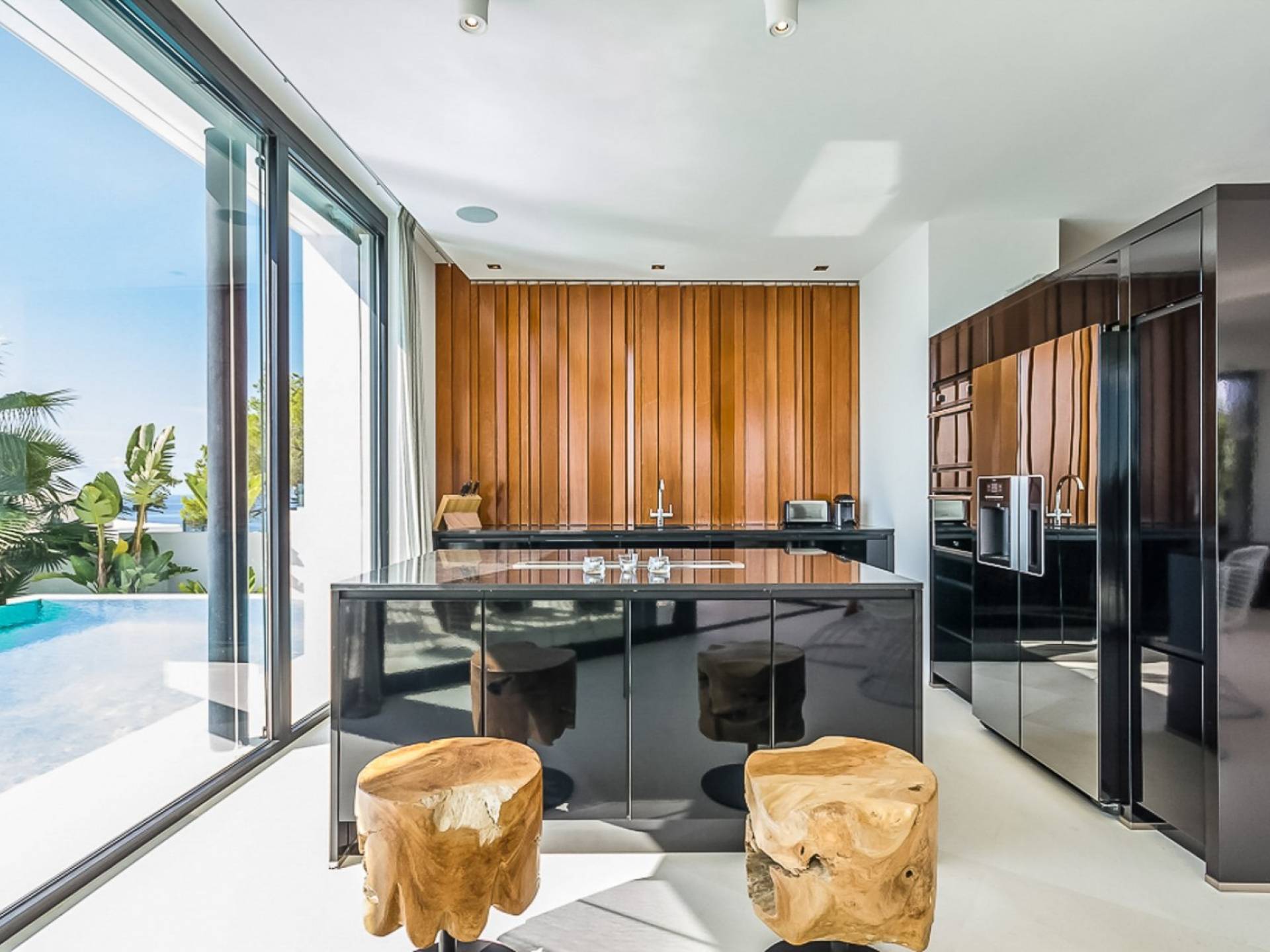 Manicured gardens wrap around the house to reveal a further chill-out space with exterior seating looking out over the bay. Steps here wind back up the building to the wonderful first-floor terrace so that wherever you are in this beautiful home you find yourself wowed by the view. Inside, the sleek modern kitchen looks out over the pool and the sea beyond. The glass walls on the south side of the building maximize the impact of the view throughout the open-plan living room and breakfast table.