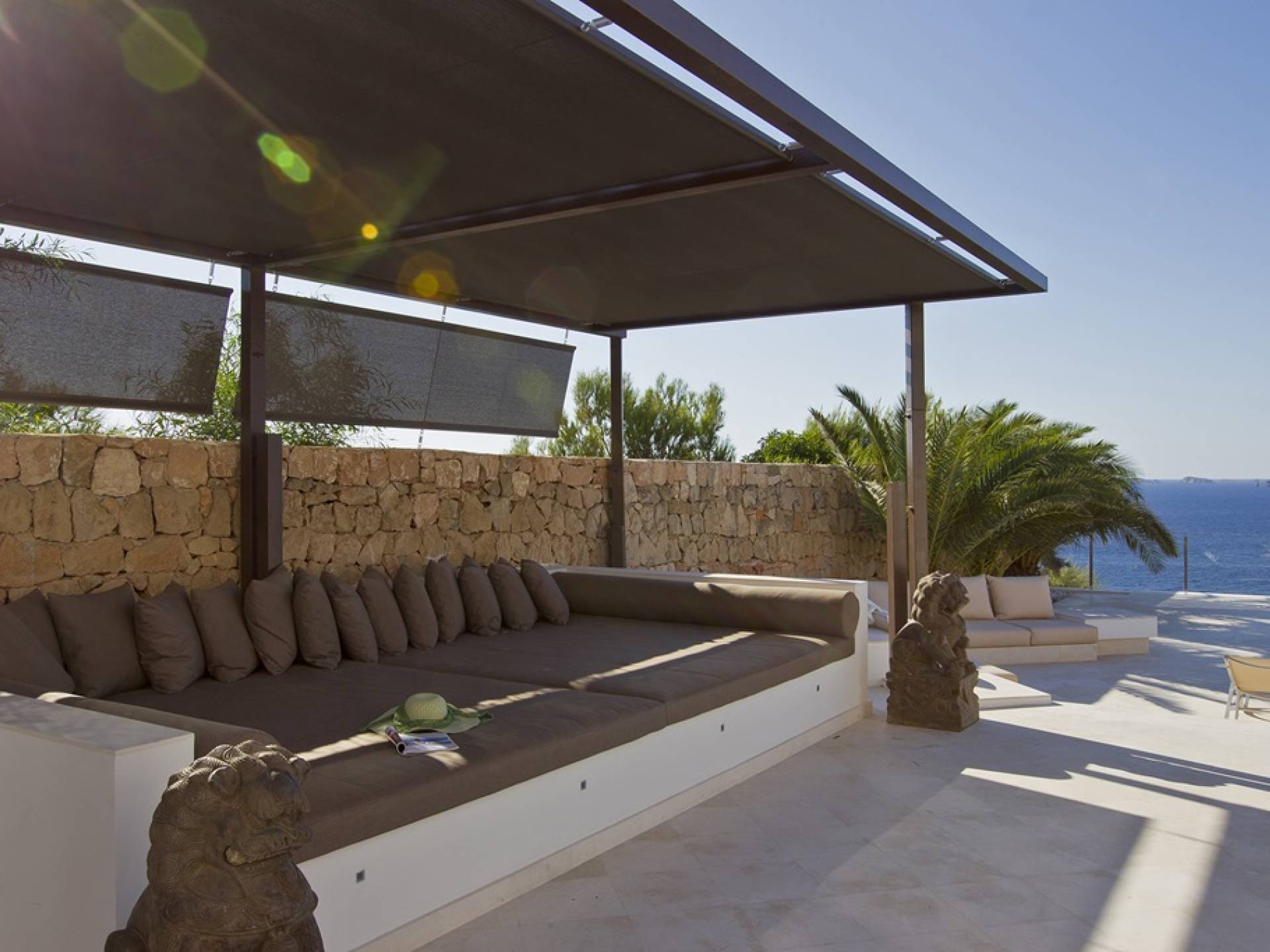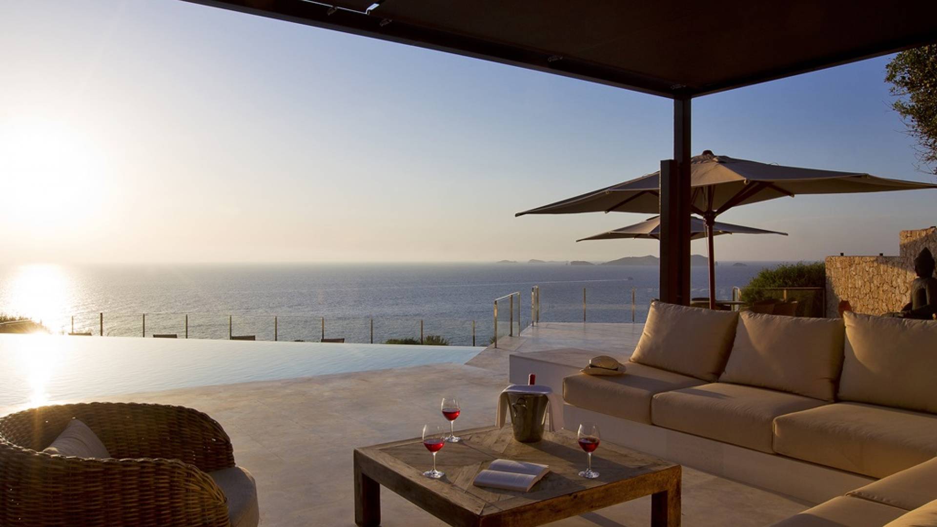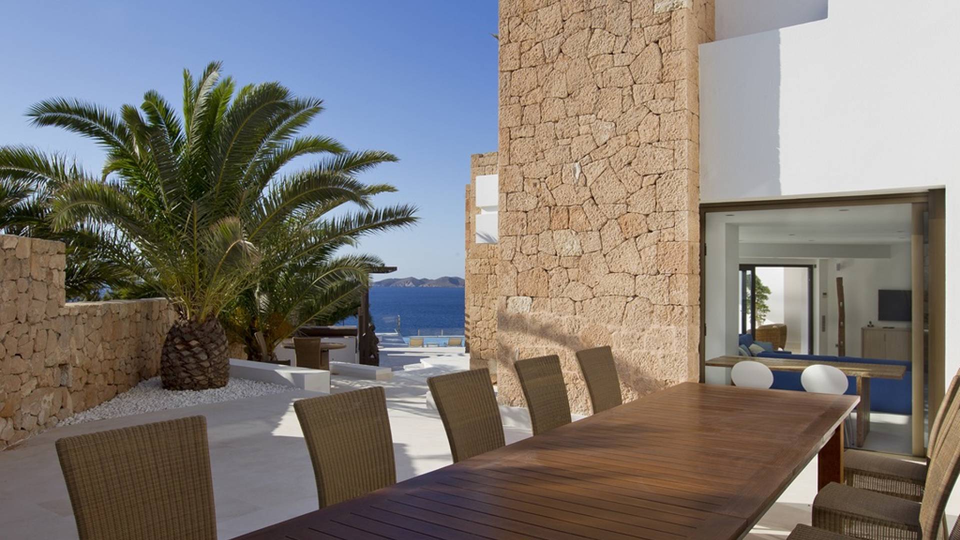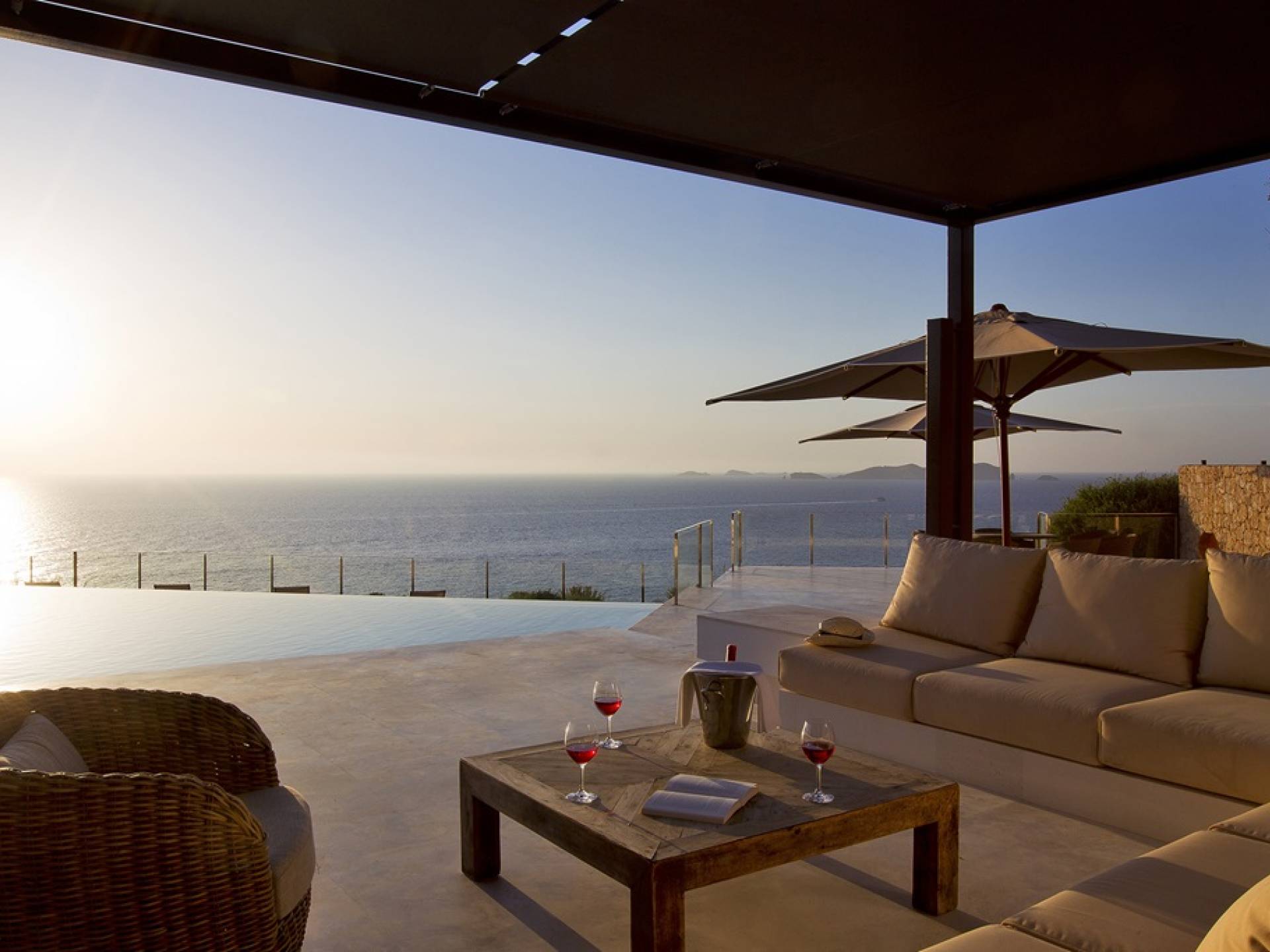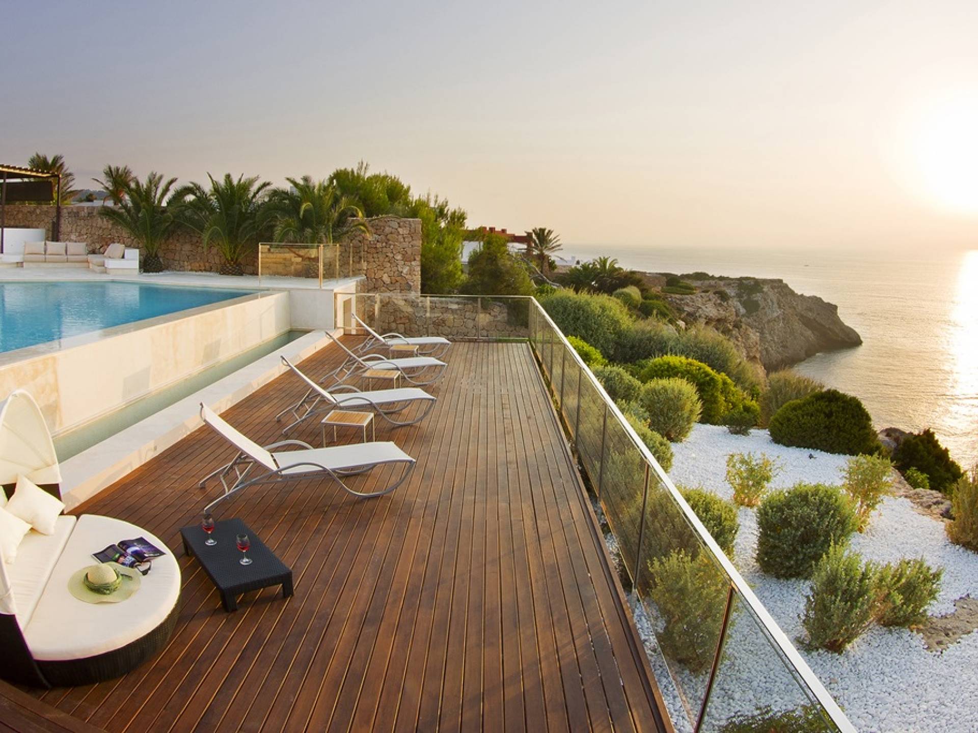 Villa Mares Ibiza, situated right on the seafront, it measures more than 750 m2 and is south-west facing... the sunset views are sensational! It has luxurious accommodation with exceptional finishings and has been voted one of the best villas in Ibiza. There is a wonderfully spacious lounge with huge comfortable sofas where there are floor to ceiling windows which open out onto the amazing terrace. There is a dining room with seating easily accommodating 12 people and a state of the art modern kitchen with all top of the range fixtures and fittings and a fully equipped office.