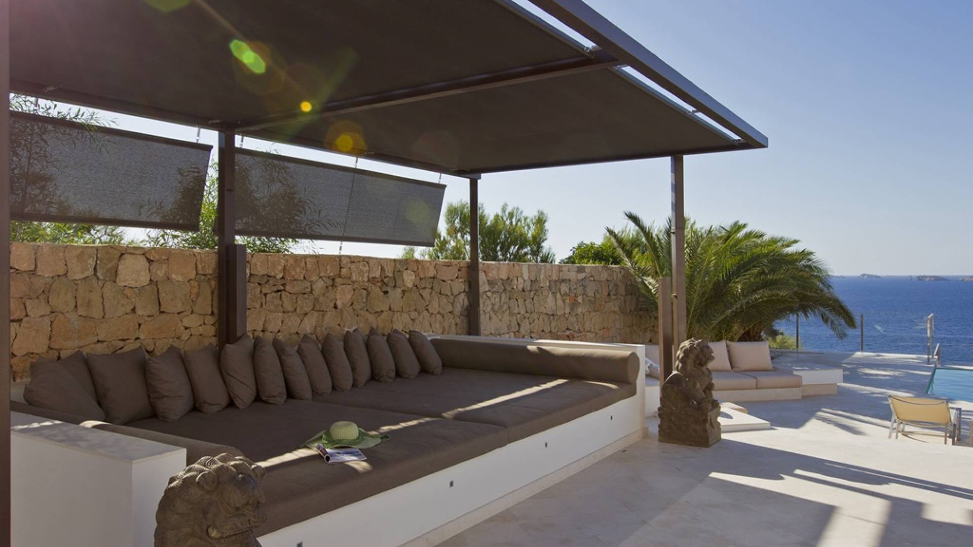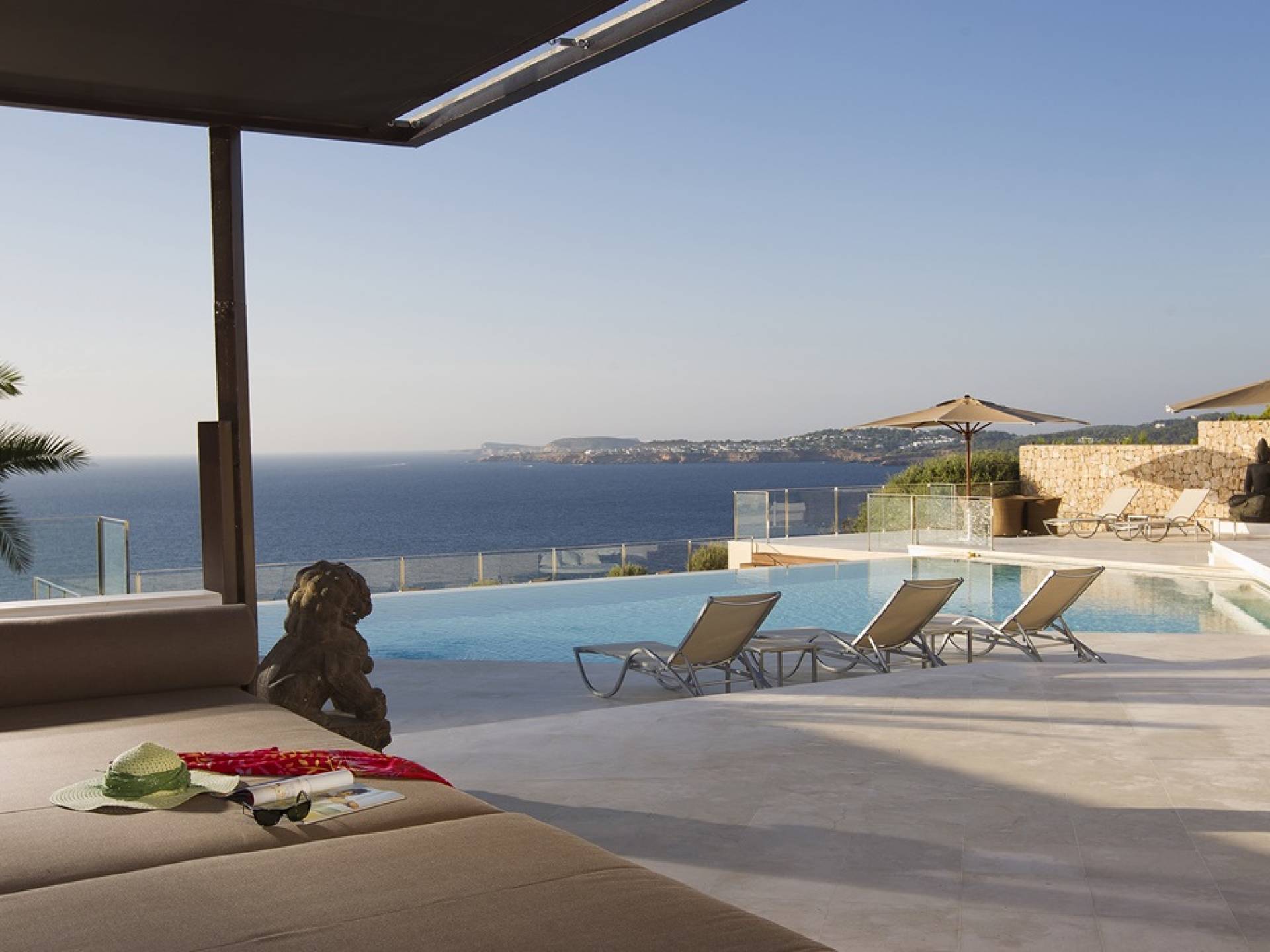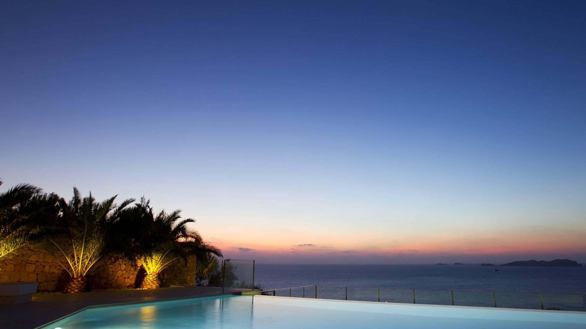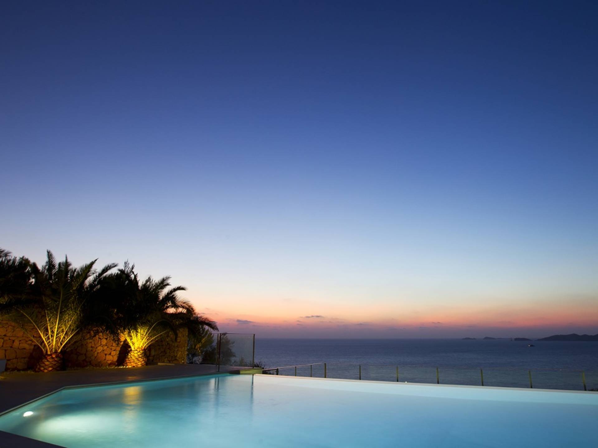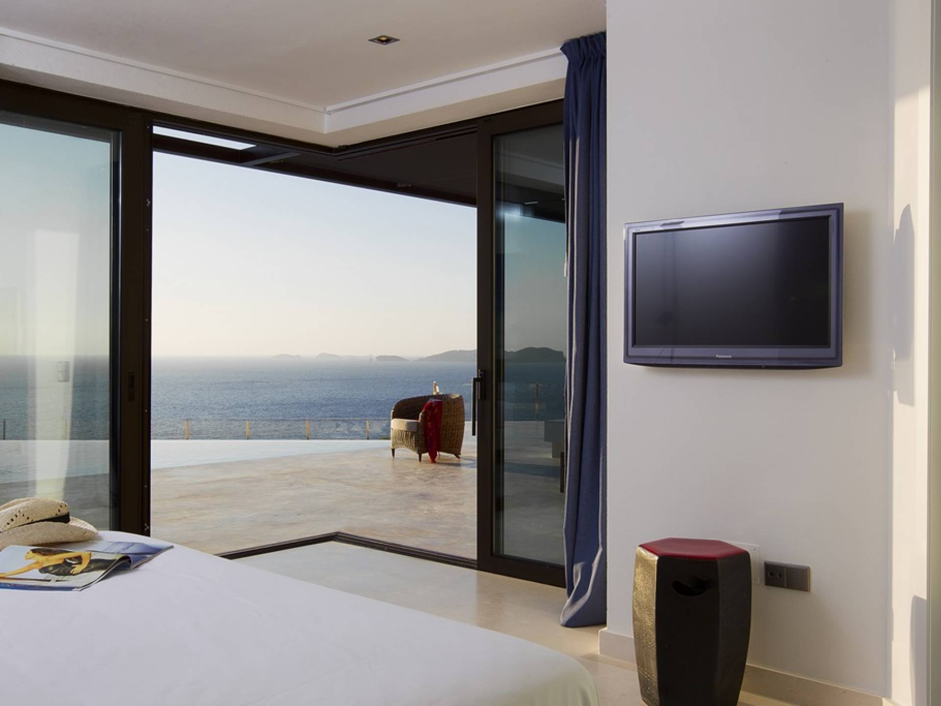 Villa Mares Ibiza, situated right on the seafront, it measures more than 750 m2 and is south-west facing... the sunset views are sensational! It has luxurious accommodation with exceptional finishings and has been voted one of the best villas in Ibiza. There is a wonderfully spacious lounge with huge comfortable sofas where there are floor to ceiling windows which open out onto the amazing terrace. There is a dining room with seating easily accommodating 12 people and a state of the art modern kitchen with all top of the range fixtures and fittings and a fully equipped office.