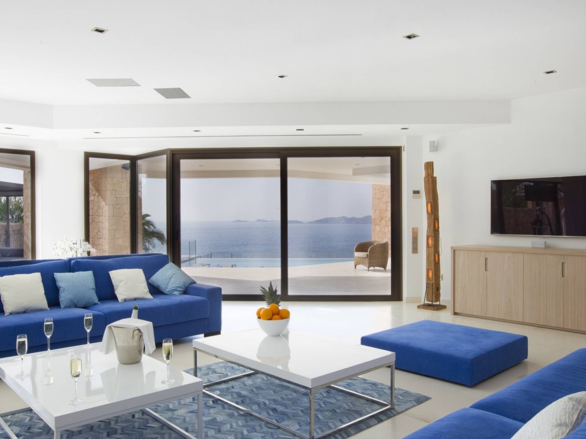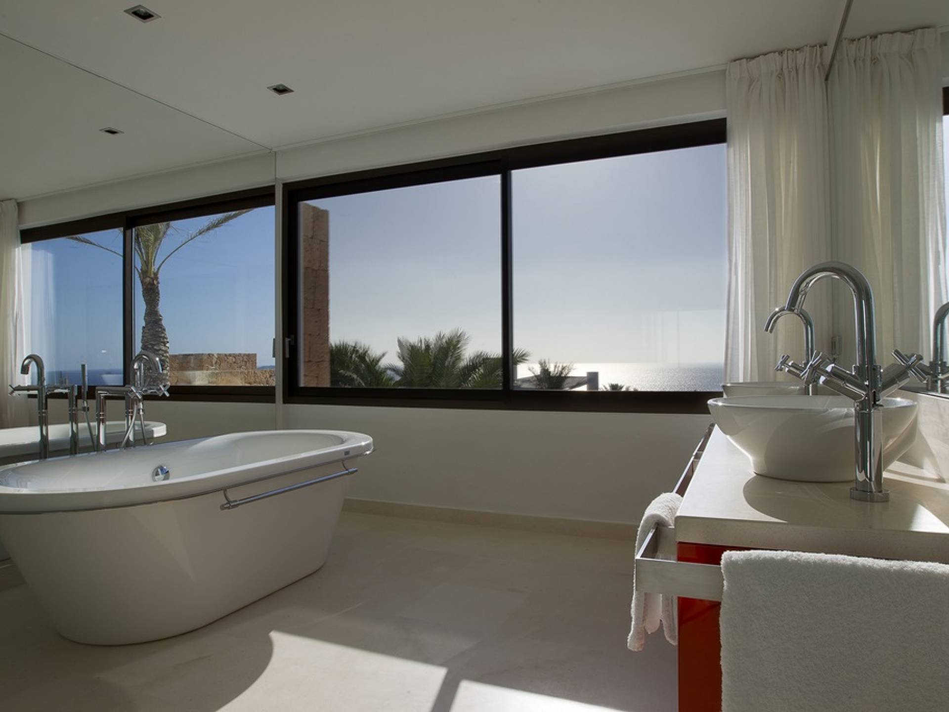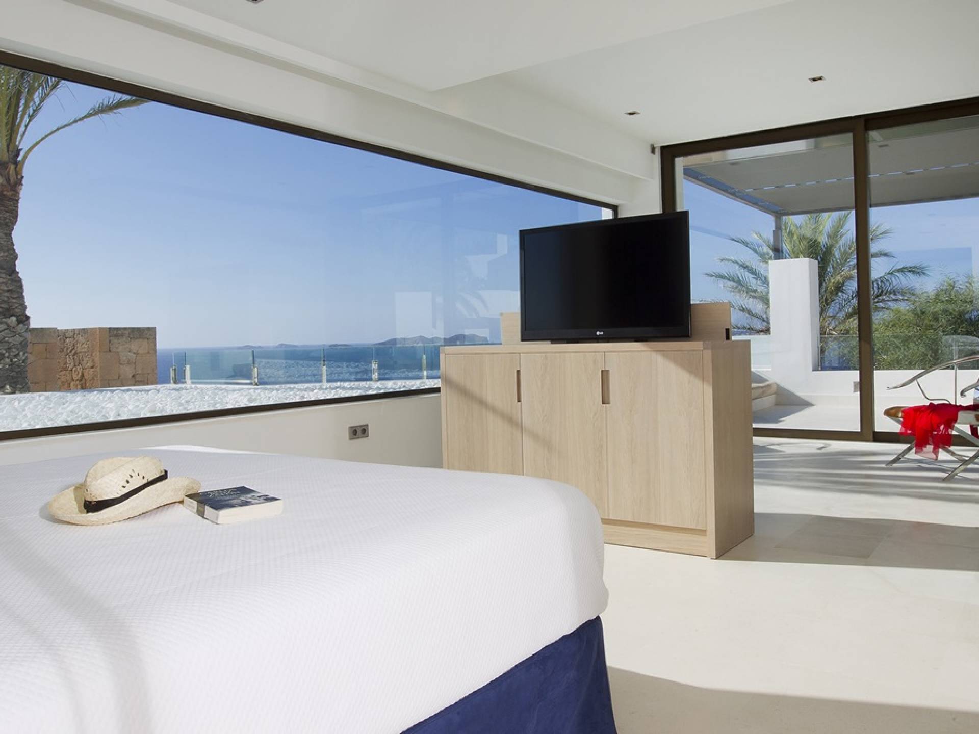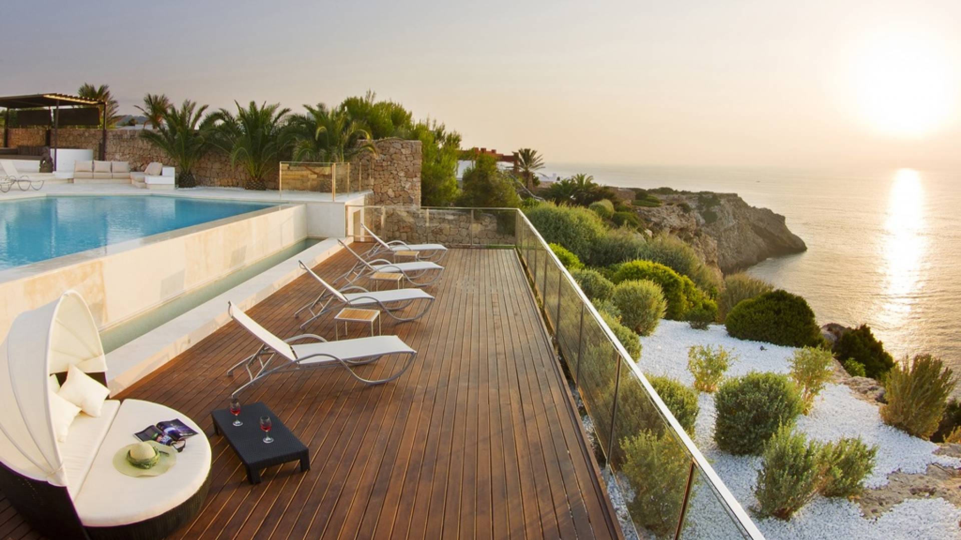 Villa Mares Ibiza, situated right on the seafront, it measures more than 750 m2 and is south-west facing... the sunset views are sensational! It has luxurious accommodation with exceptional finishings and has been voted one of the best villas in Ibiza. There is a wonderfully spacious lounge with huge comfortable sofas where there are floor to ceiling windows which open out onto the amazing terrace. There is a dining room with seating easily accommodating 12 people and a state of the art modern kitchen with all top of the range fixtures and fittings and a fully equipped office.