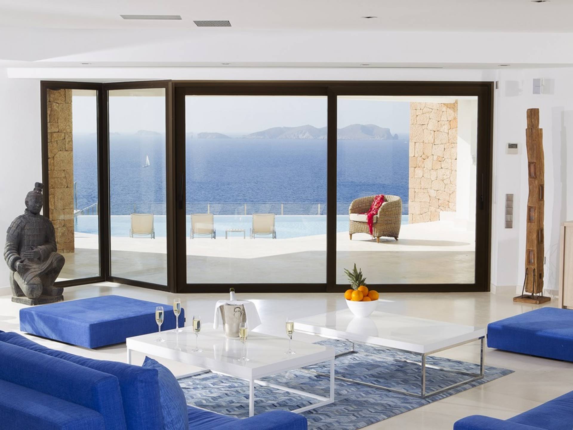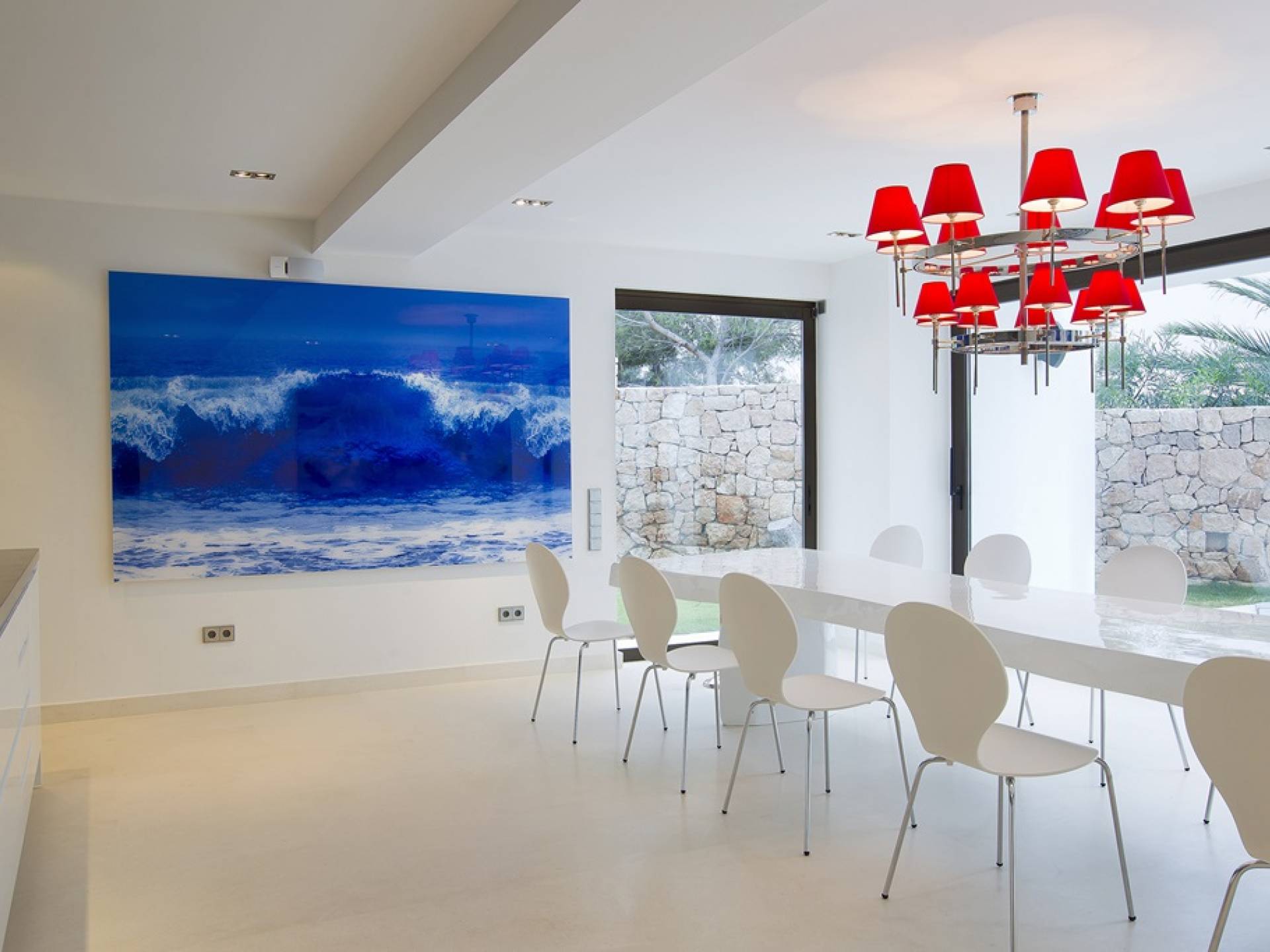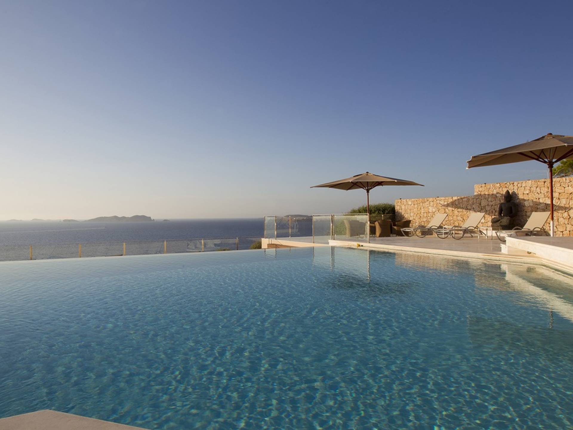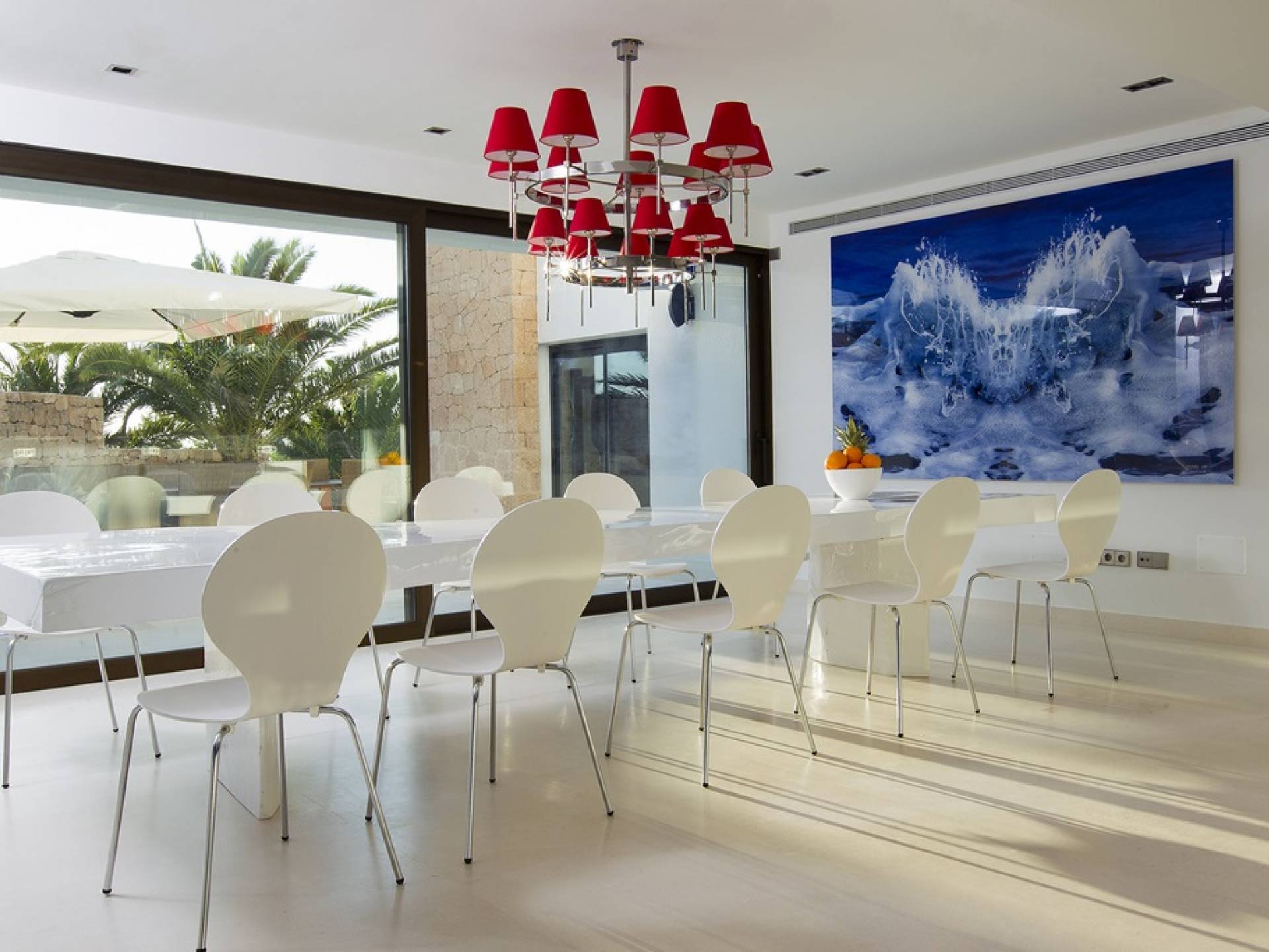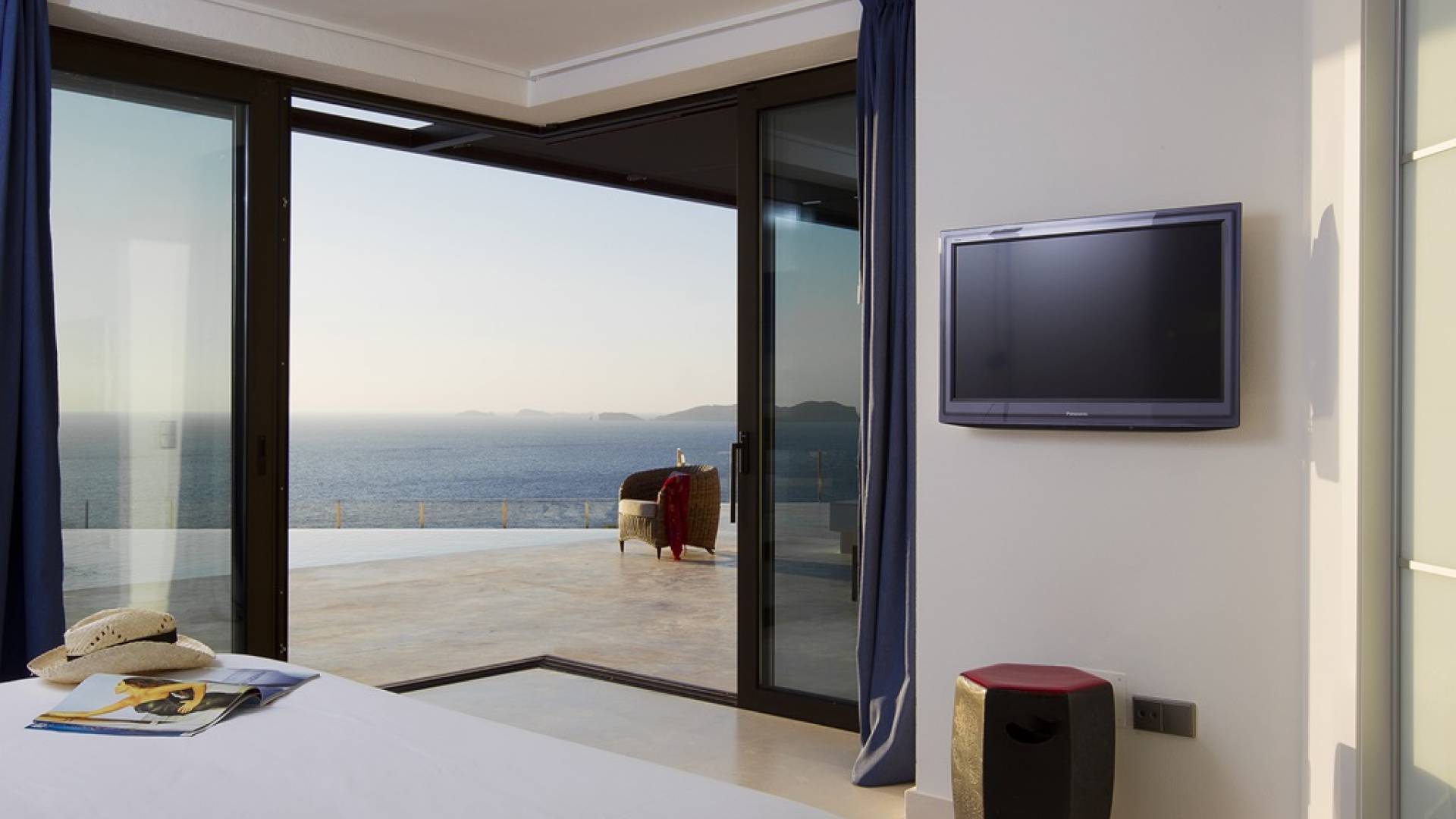 Villa Mares Ibiza, situated right on the seafront, it measures more than 750 m2 and is south-west facing... the sunset views are sensational! It has luxurious accommodation with exceptional finishings and has been voted one of the best villas in Ibiza. There is a wonderfully spacious lounge with huge comfortable sofas where there are floor to ceiling windows which open out onto the amazing terrace. There is a dining room with seating easily accommodating 12 people and a state of the art modern kitchen with all top of the range fixtures and fittings and a fully equipped office.