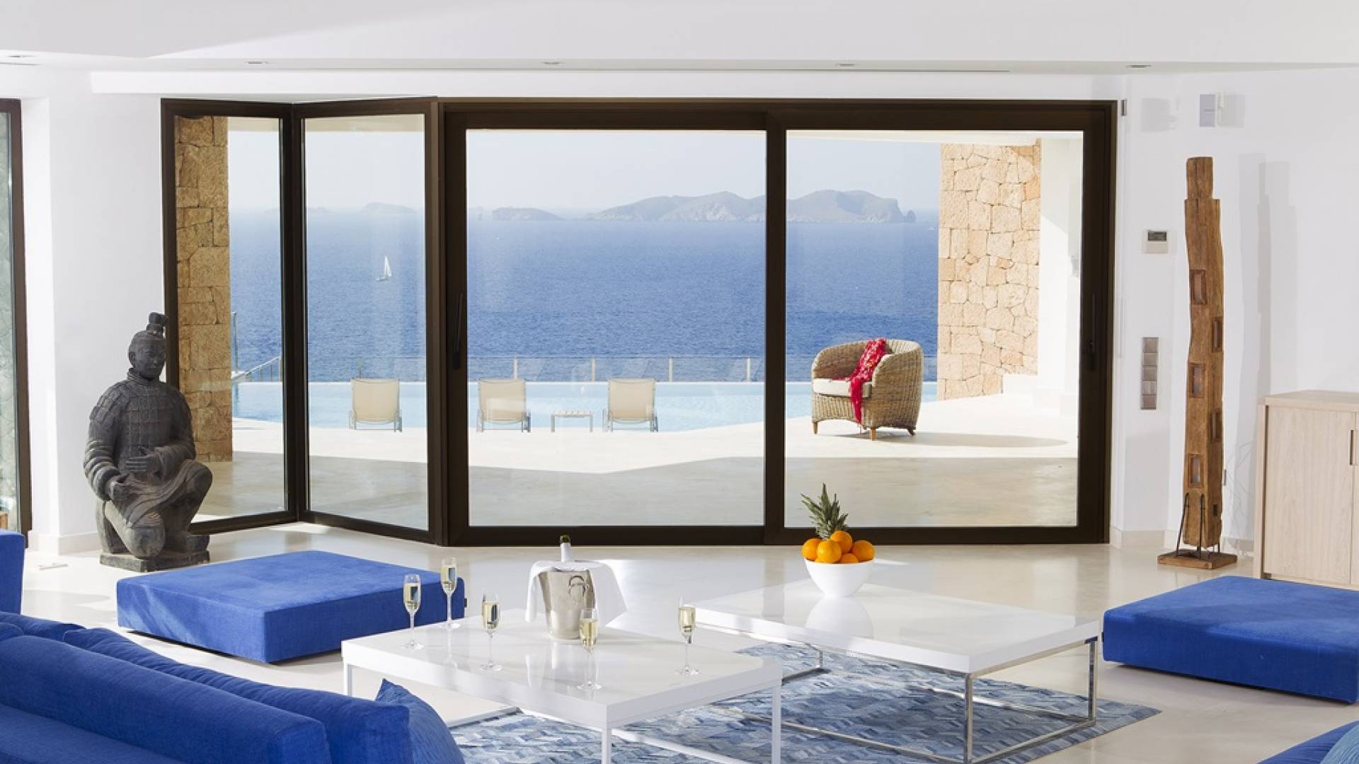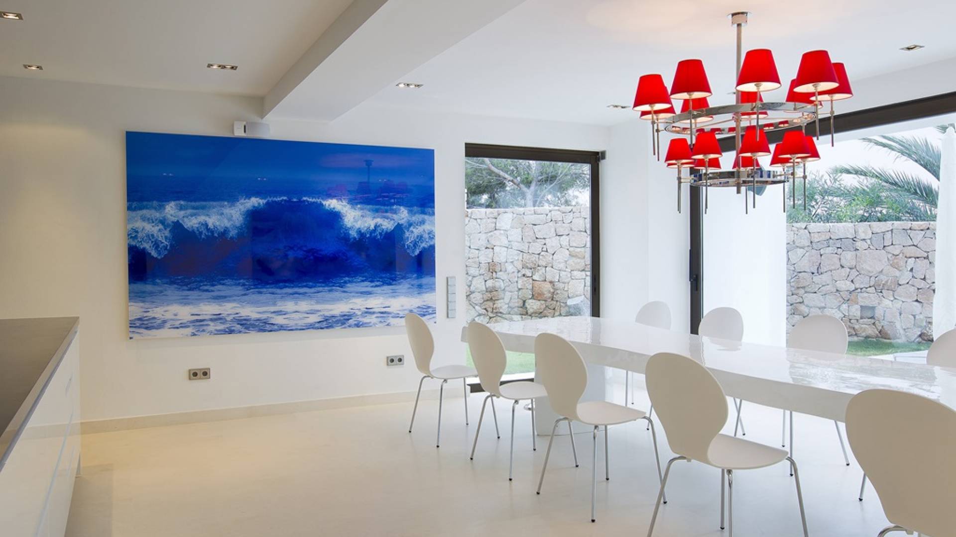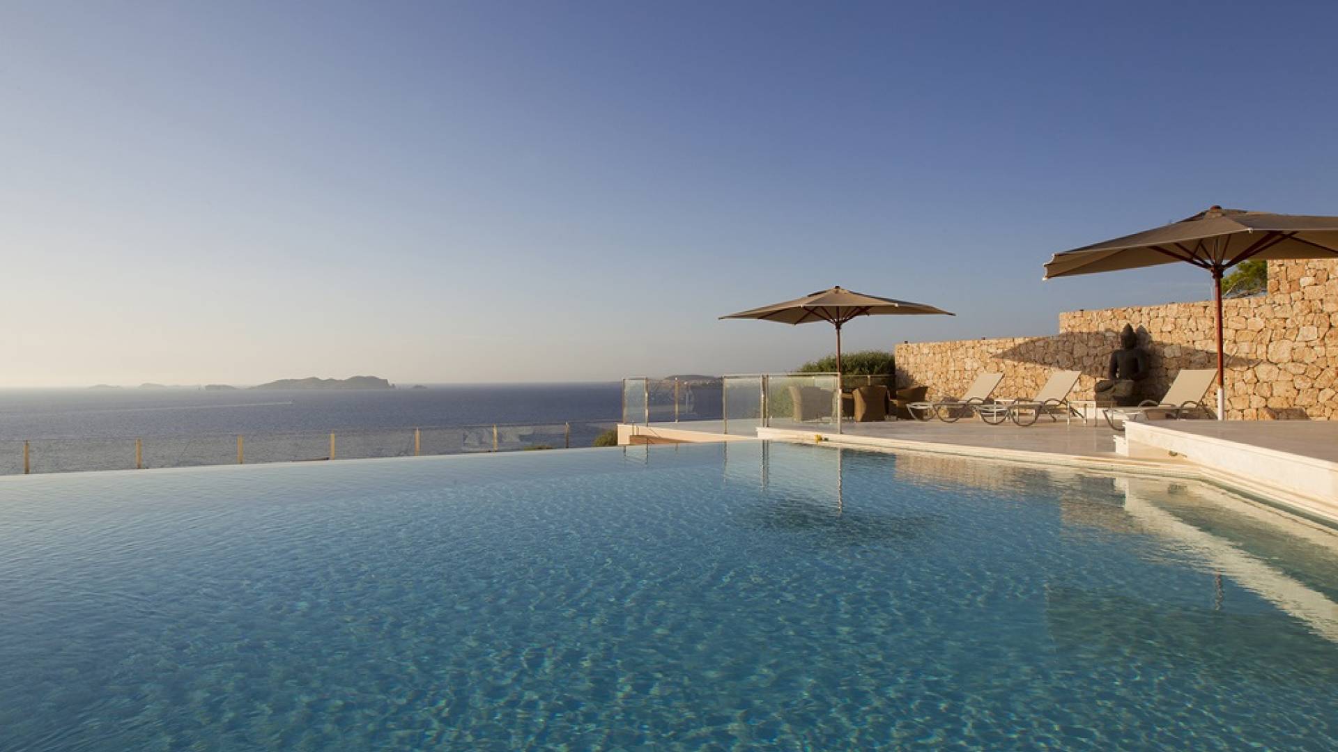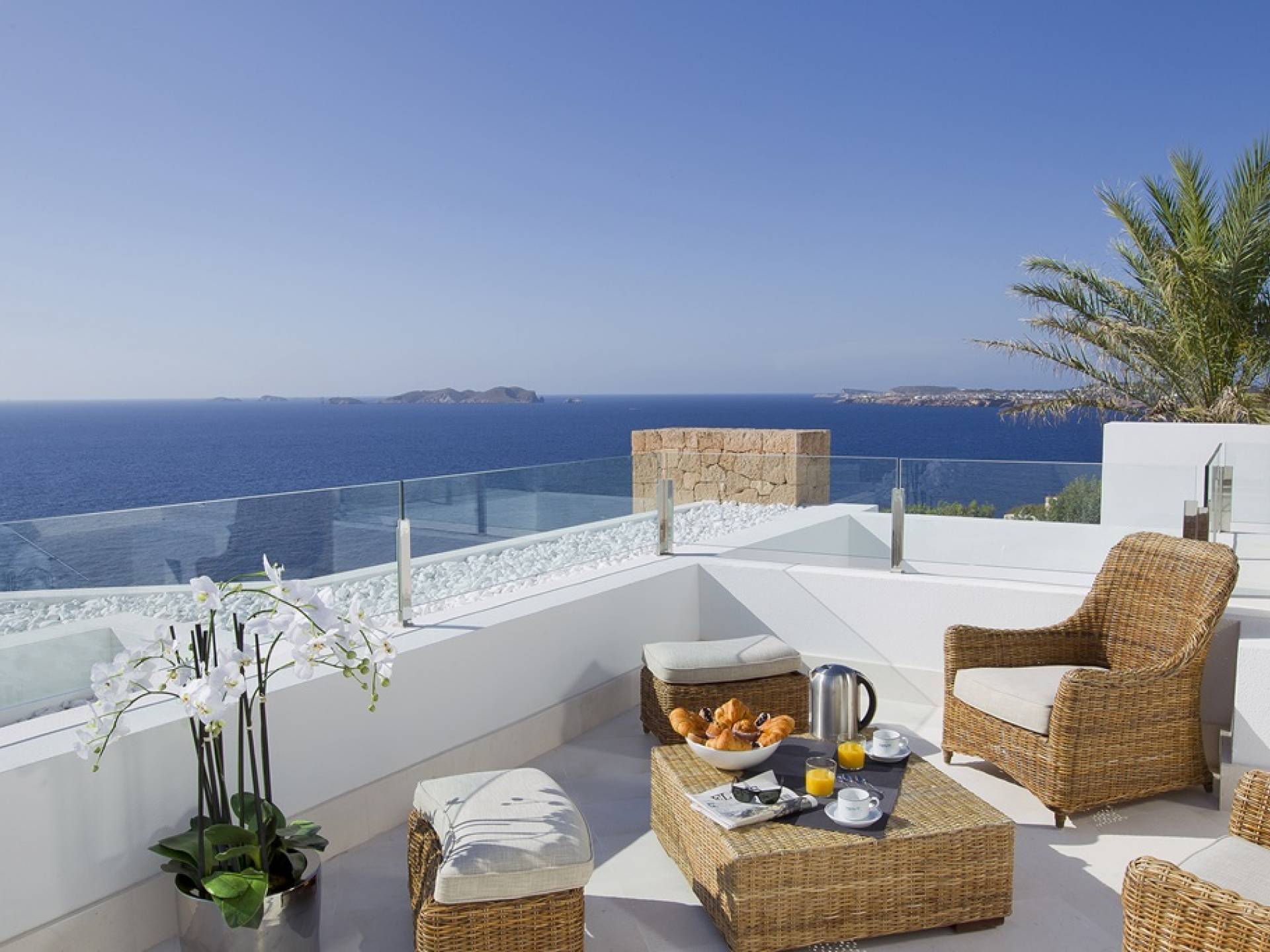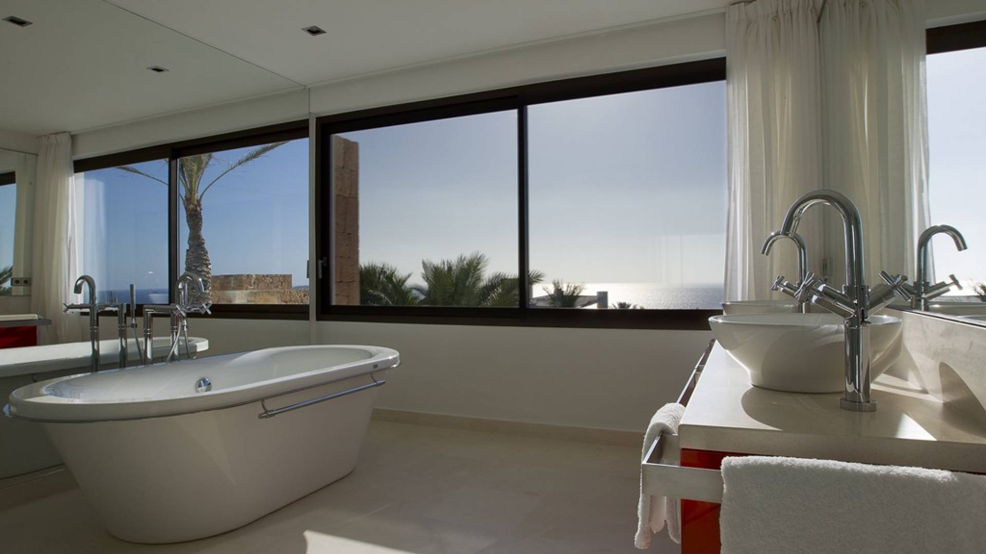 Villa Mares Ibiza, situated right on the seafront, it measures more than 750 m2 and is south-west facing... the sunset views are sensational! It has luxurious accommodation with exceptional finishings and has been voted one of the best villas in Ibiza. There is a wonderfully spacious lounge with huge comfortable sofas where there are floor to ceiling windows which open out onto the amazing terrace. There is a dining room with seating easily accommodating 12 people and a state of the art modern kitchen with all top of the range fixtures and fittings and a fully equipped office.