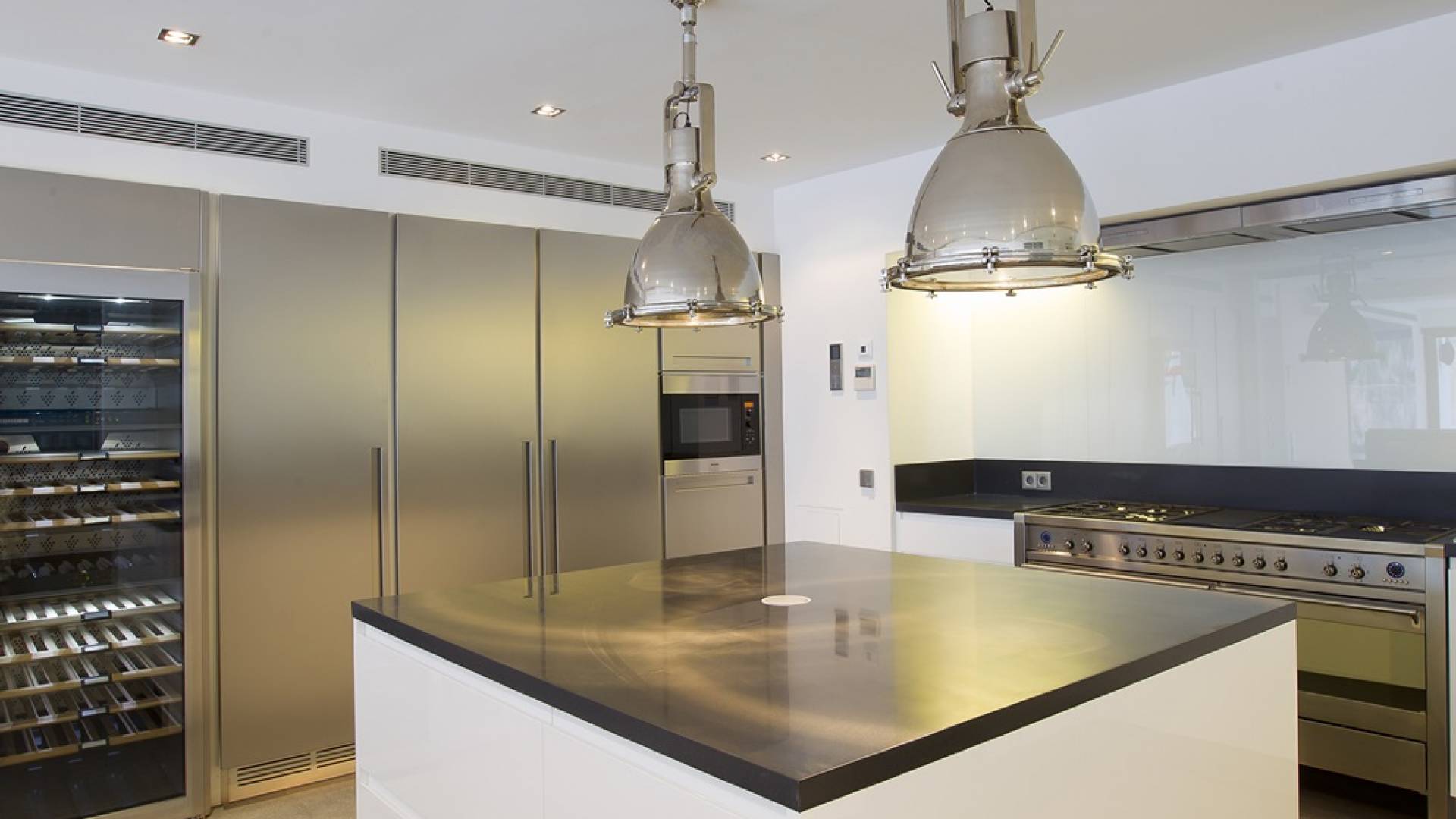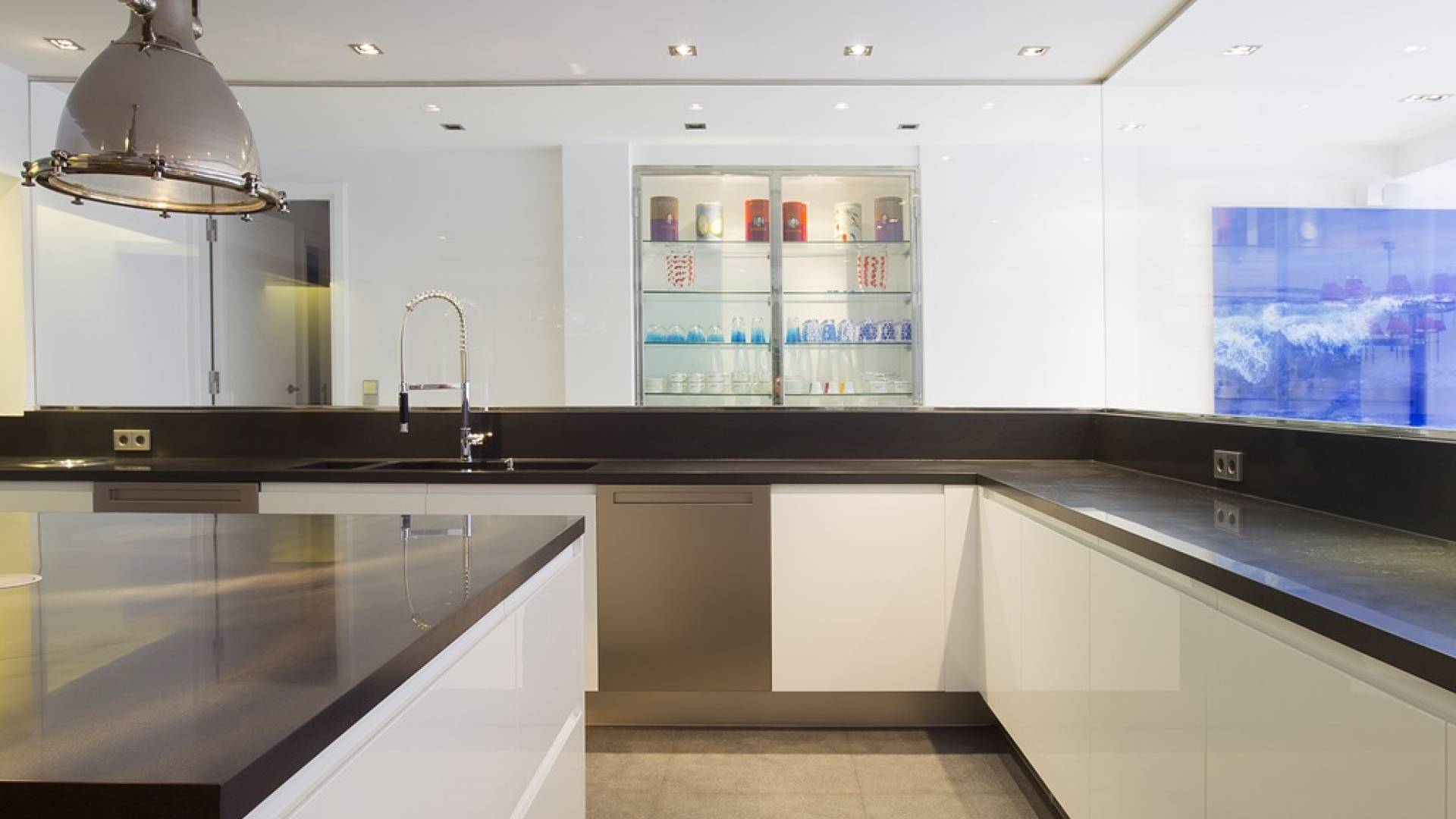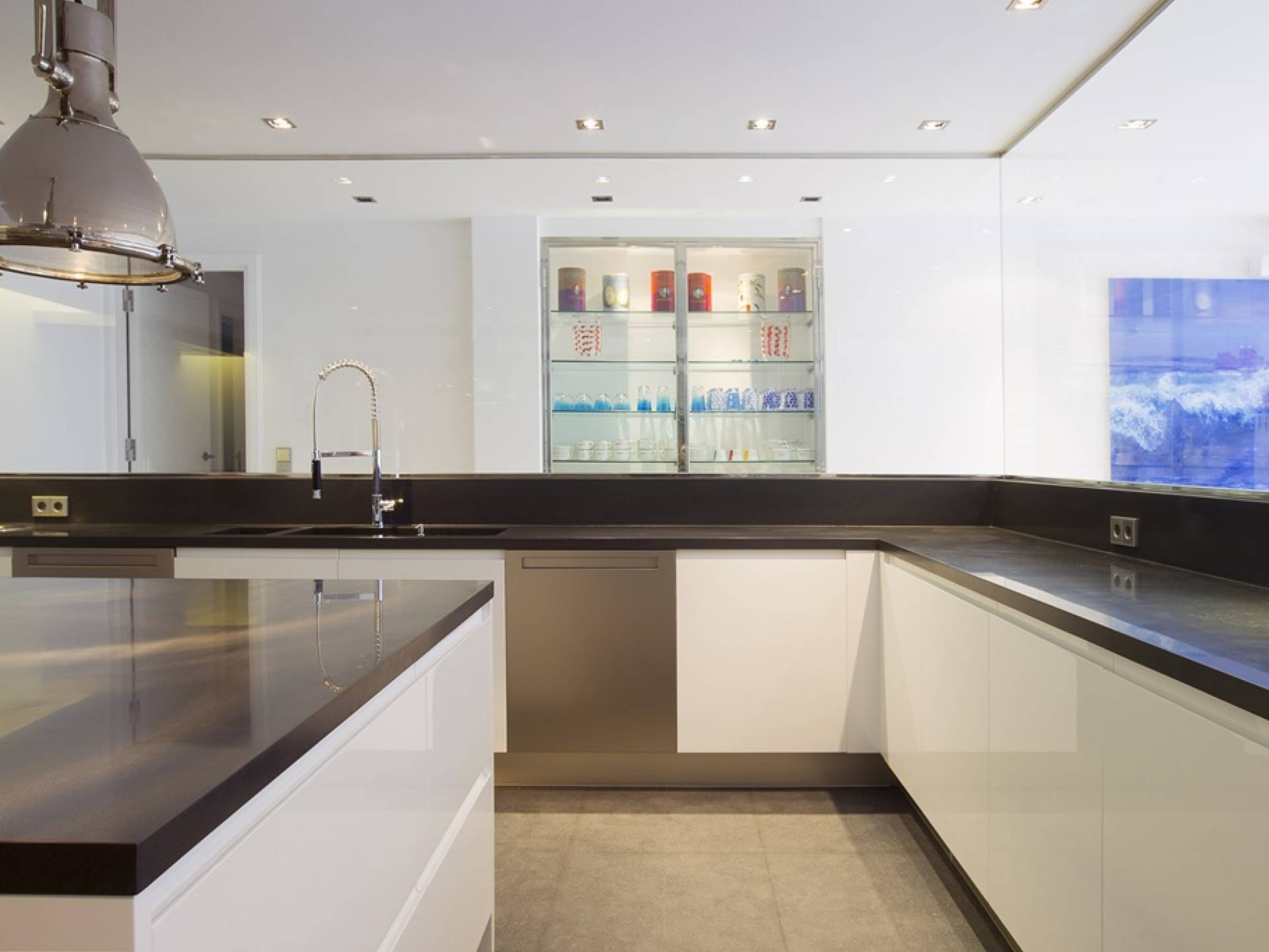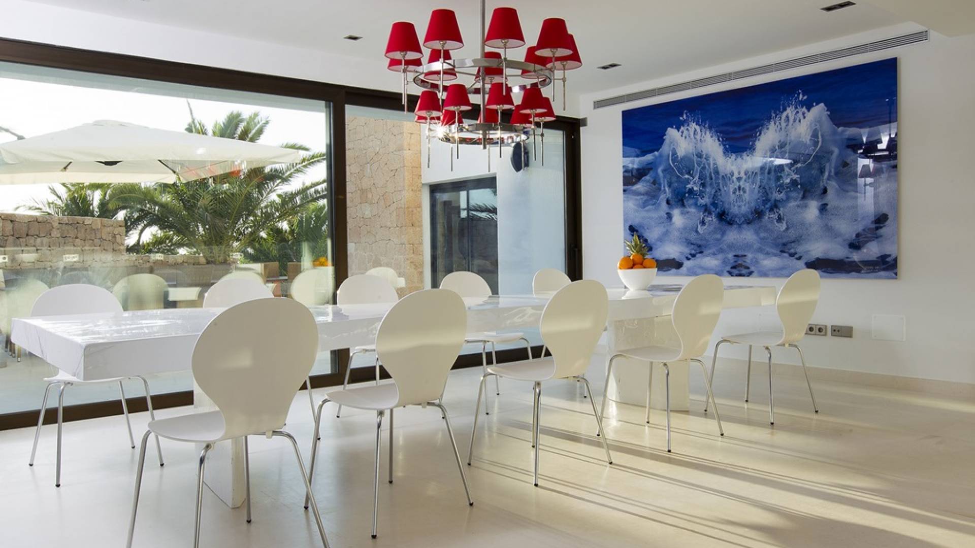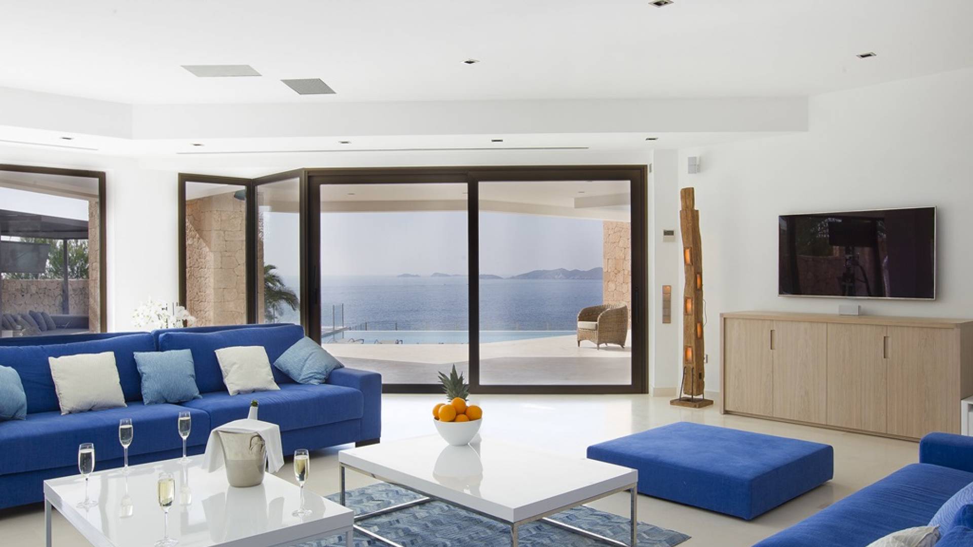 Villa Mares Ibiza, situated right on the seafront, it measures more than 750 m2 and is south-west facing... the sunset views are sensational! It has luxurious accommodation with exceptional finishings and has been voted one of the best villas in Ibiza. There is a wonderfully spacious lounge with huge comfortable sofas where there are floor to ceiling windows which open out onto the amazing terrace. There is a dining room with seating easily accommodating 12 people and a state of the art modern kitchen with all top of the range fixtures and fittings and a fully equipped office.
