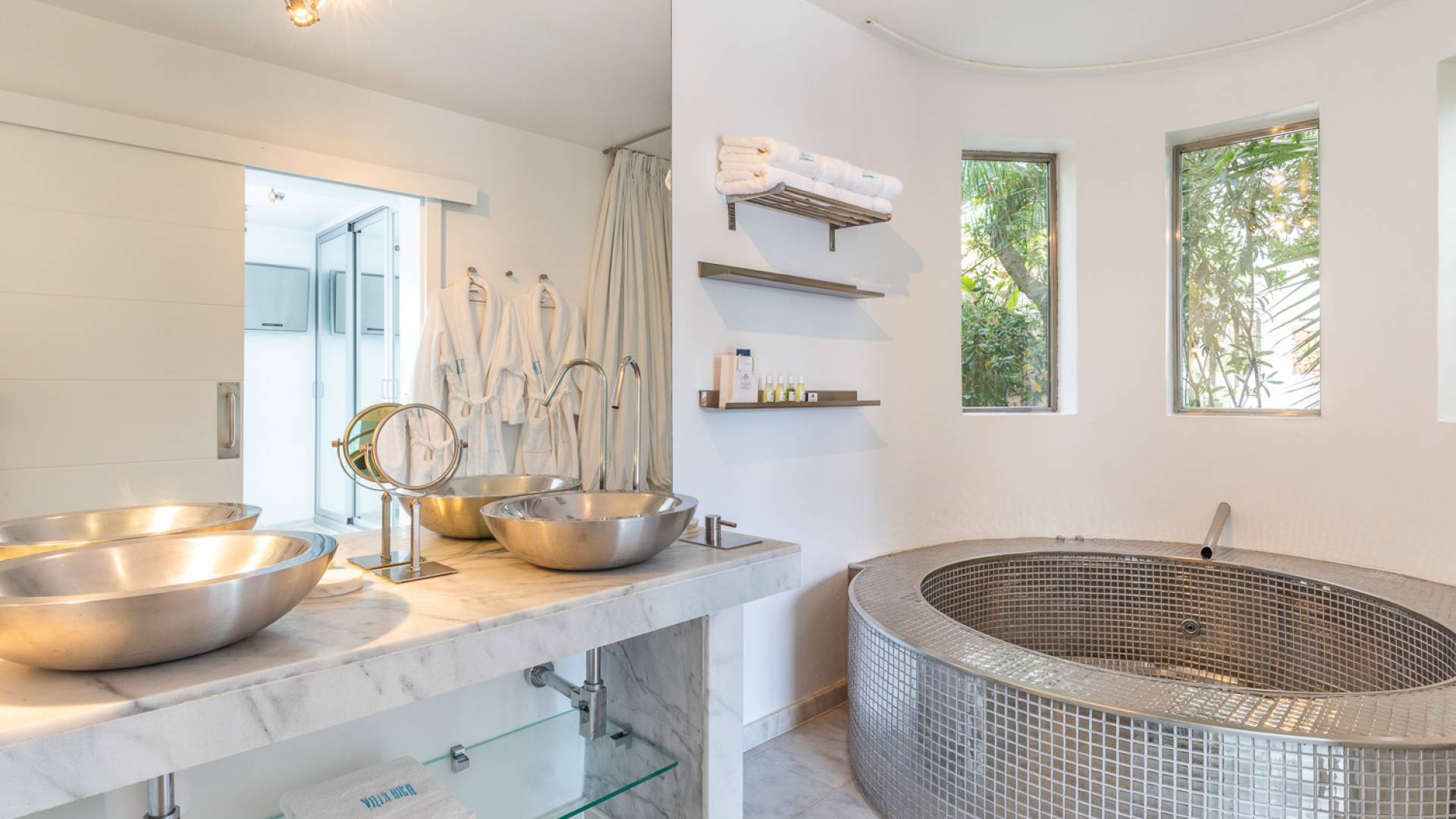 There is an outdoor Jacuzzi where you can enjoy the views while drinking a nice cocktail. There, you can decide if you want to have another look in one of the beach clubs, or just enjoy your private sunset. In the distance, you hear the waves break on the beach villa.