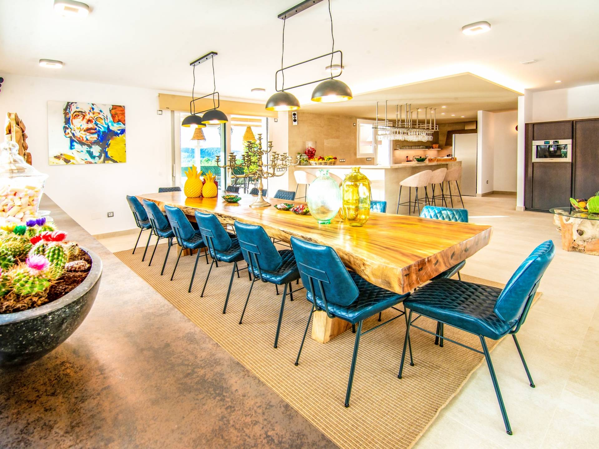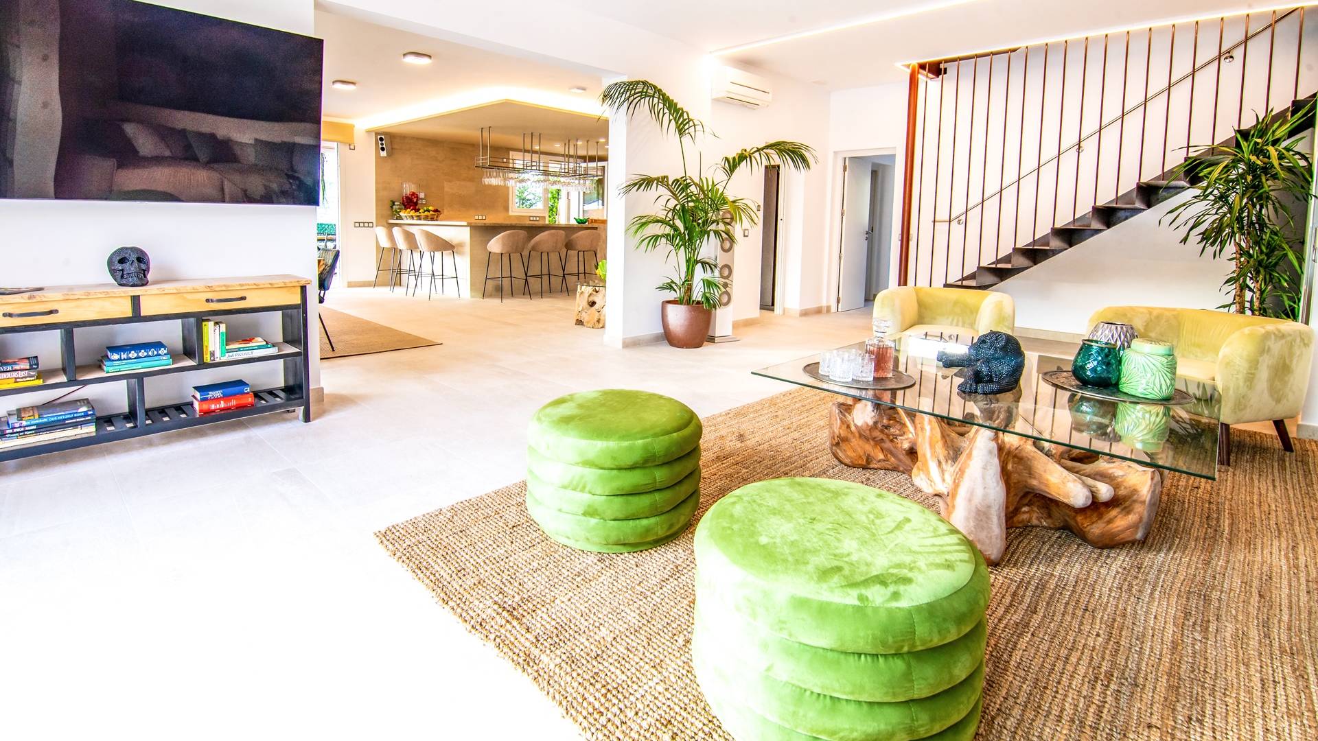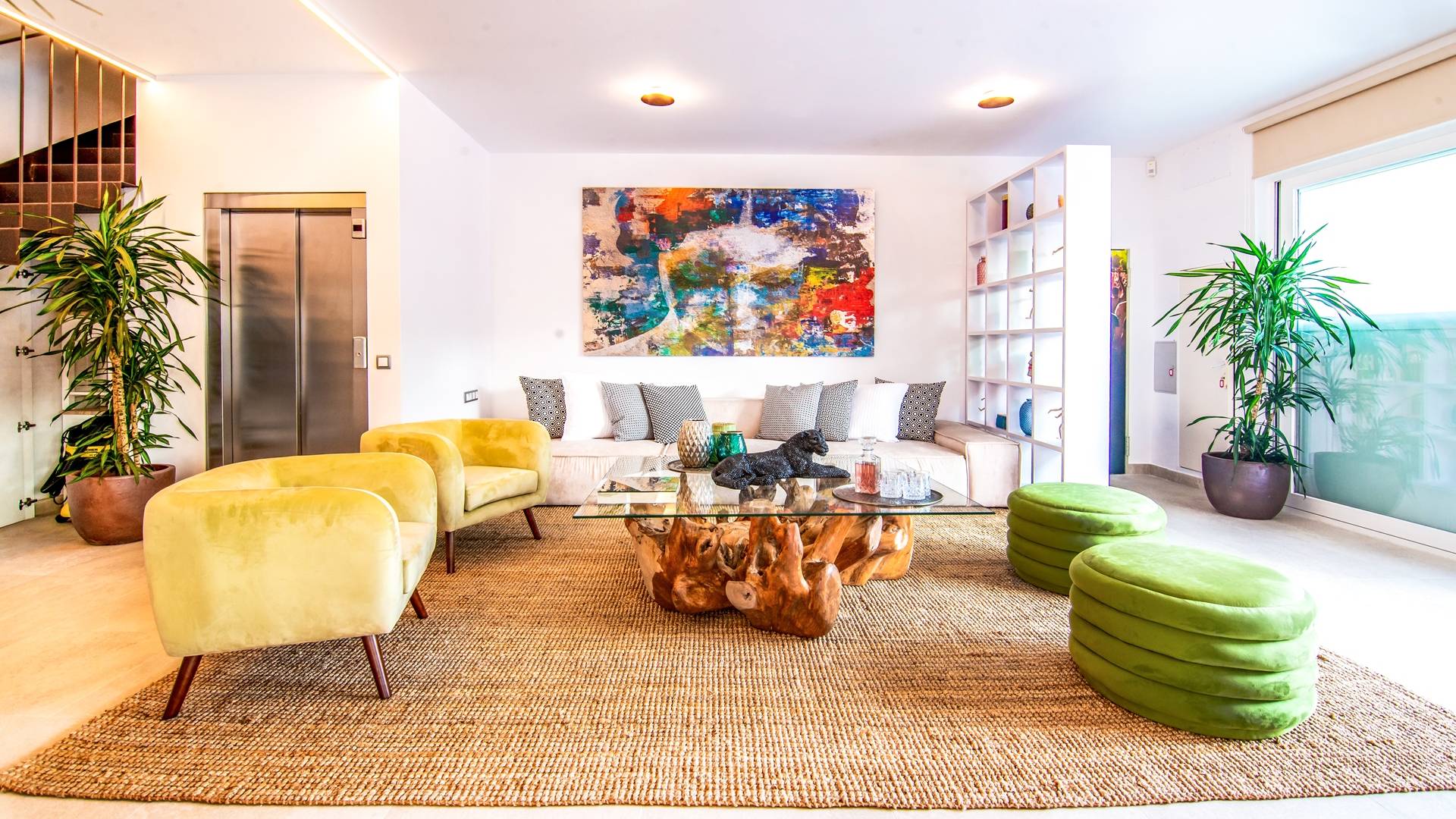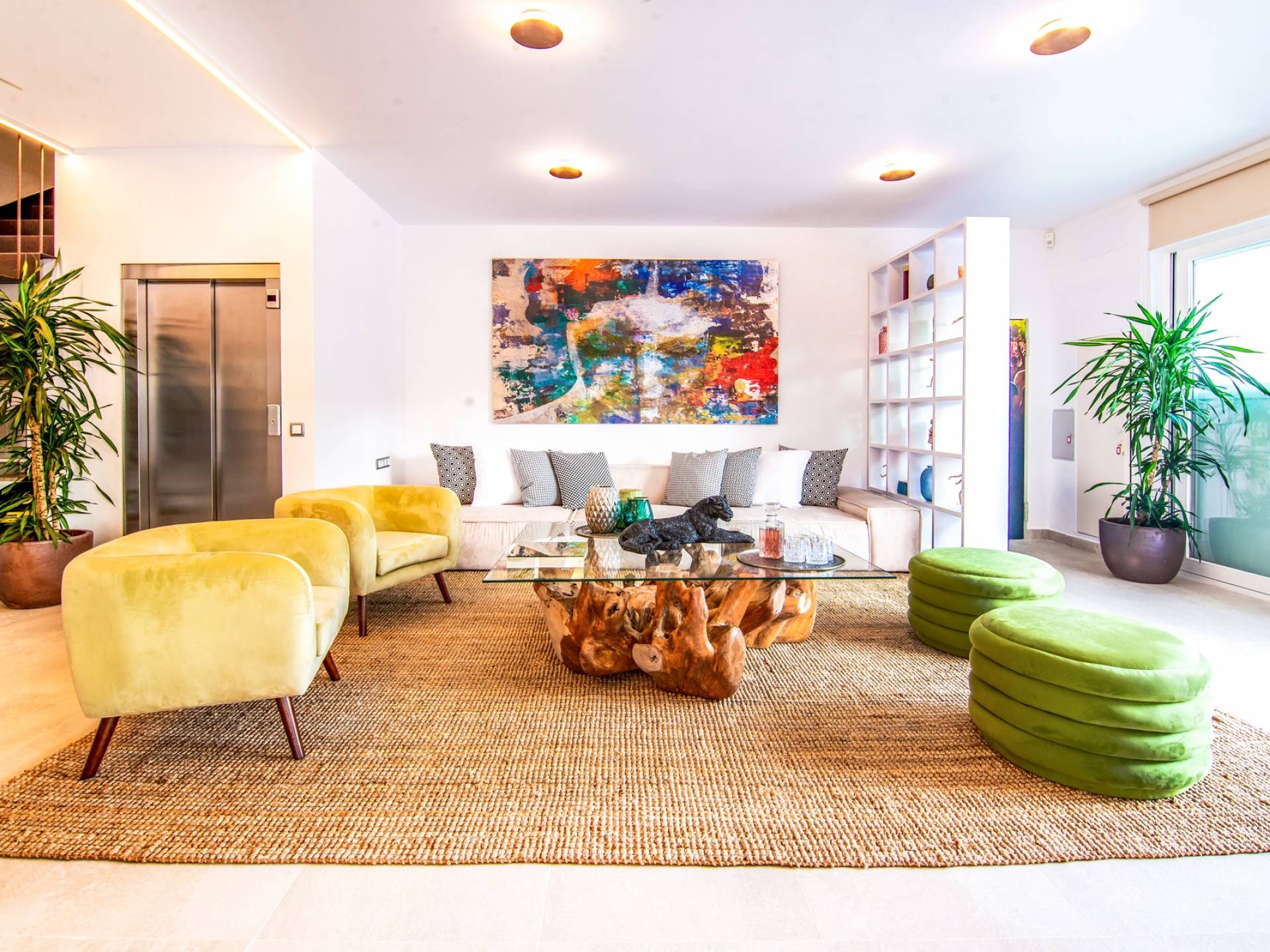 At the entrance, we find the stairs and the elevator that give access to all the floors of the house including the roof terrace. It is divided into the ground floor and the first floor, it has 6 double bedrooms, each with its own bathroom, built-in wardrobe and personalized decoration, a spacious living room with a dining area. If it happens that your trip is for business, it can serve as a meeting room or if you prefer outdoors, there is also a large table on the porch terrace.
