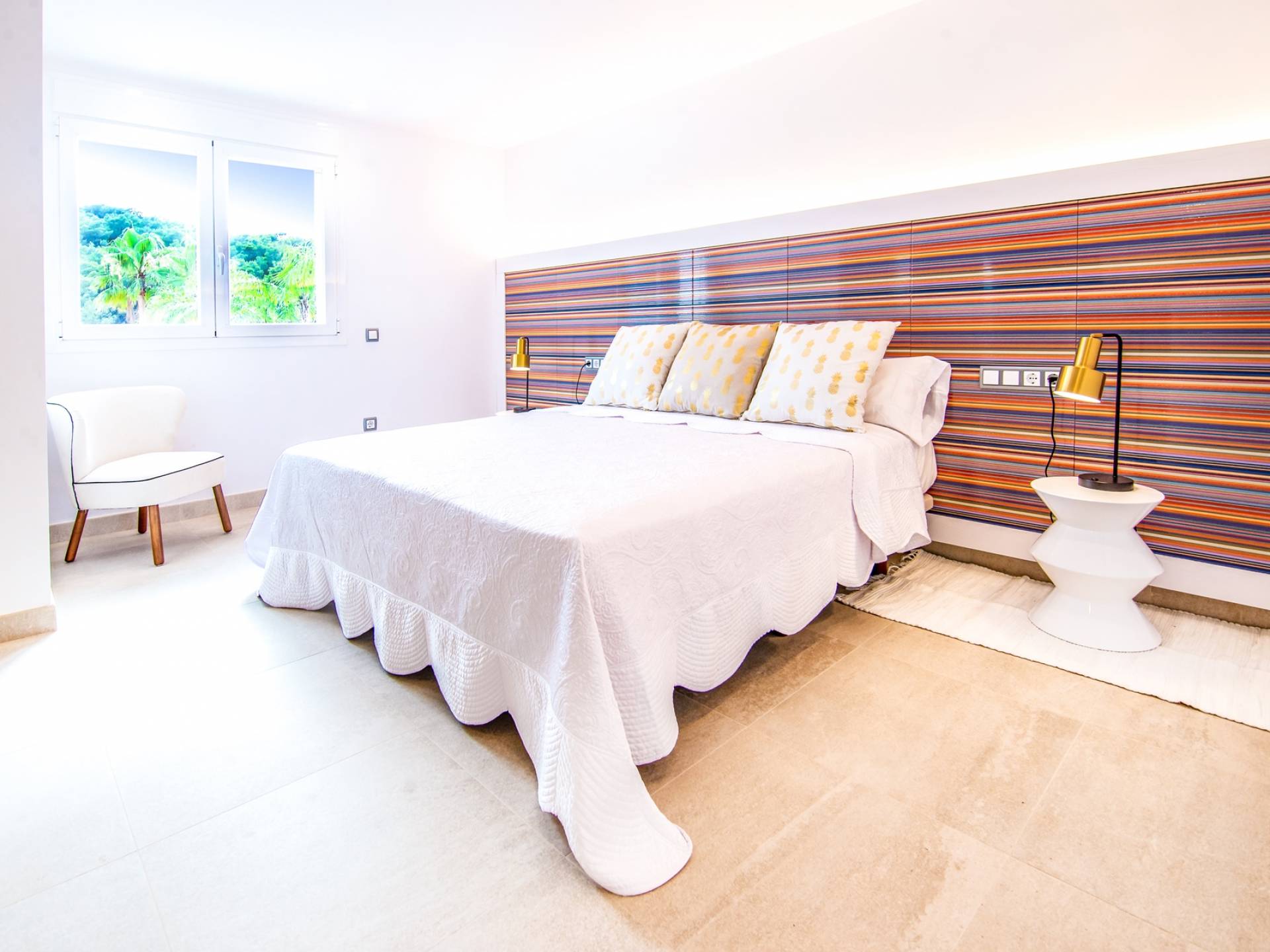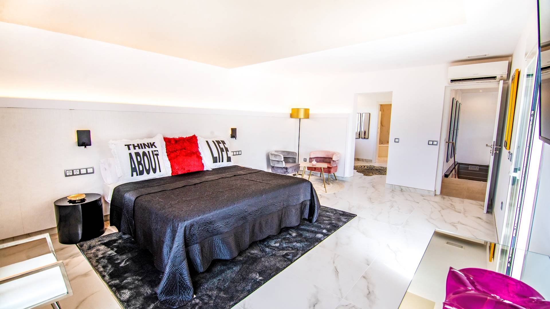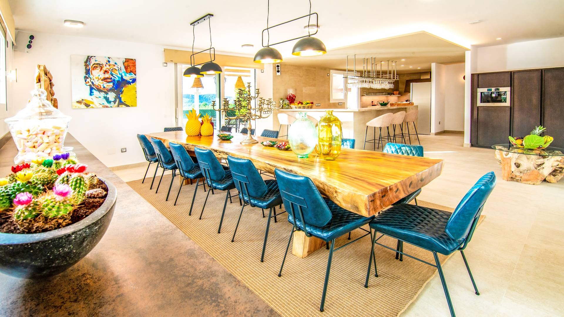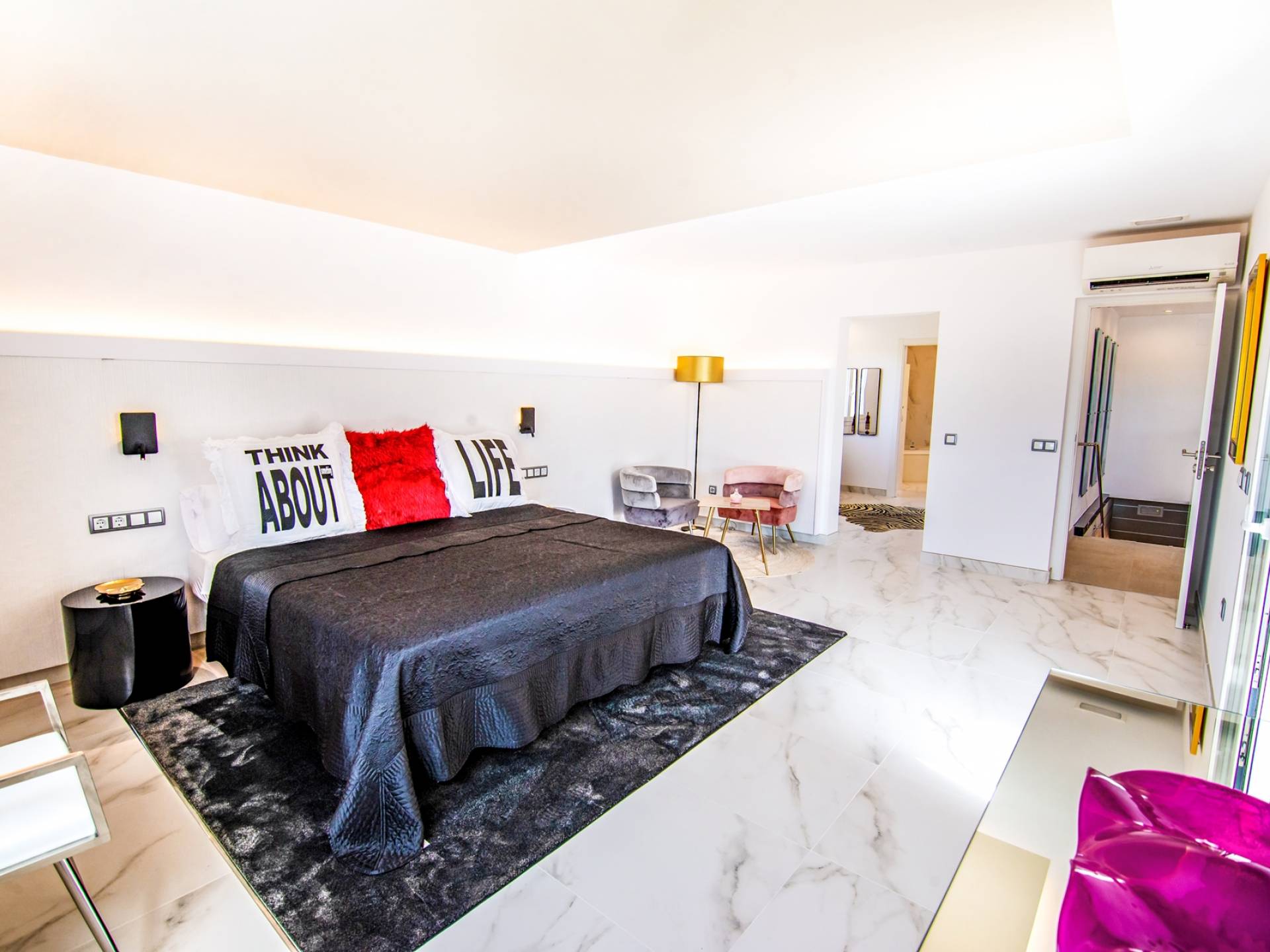 At the entrance, we find the stairs and the elevator that give access to all the floors of the house including the roof terrace. It is divided into the ground floor and the first floor, it has 6 double bedrooms, each with its own bathroom, built-in wardrobe and personalized decoration, a spacious living room with a dining area. If it happens that your trip is for business, it can serve as a meeting room or if you prefer outdoors, there is also a large table on the porch terrace.