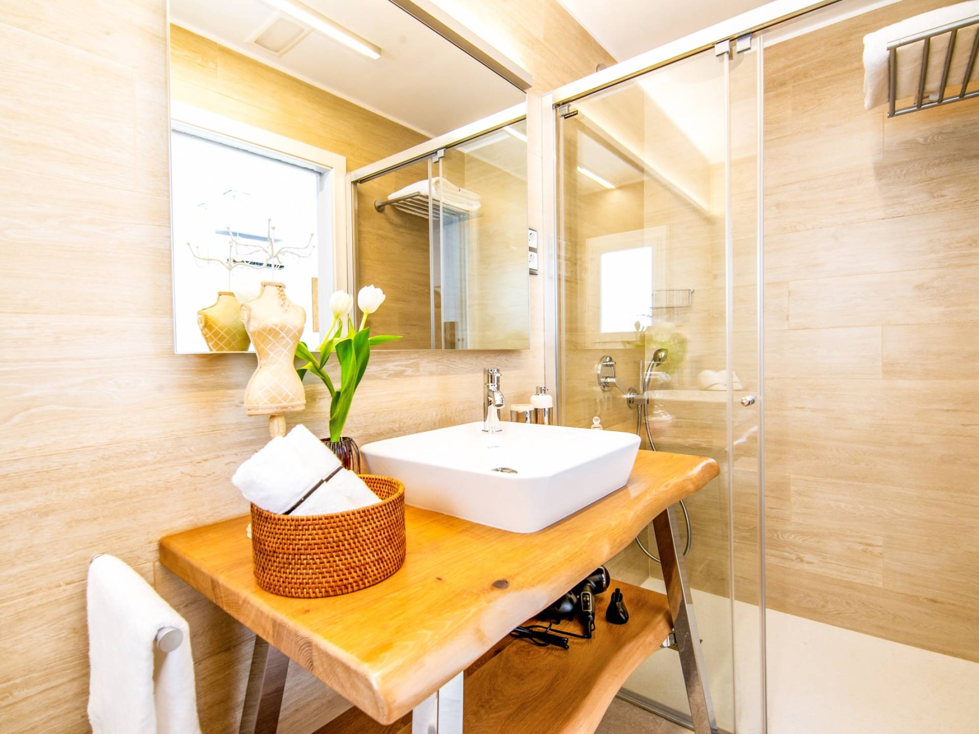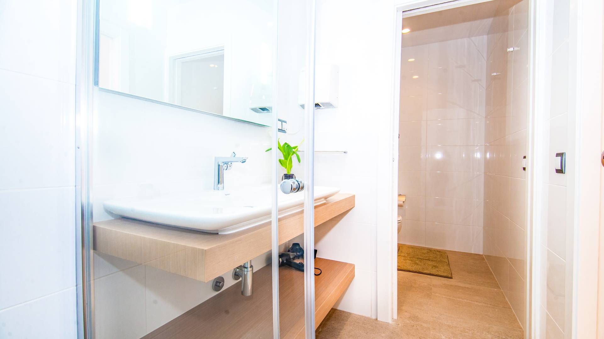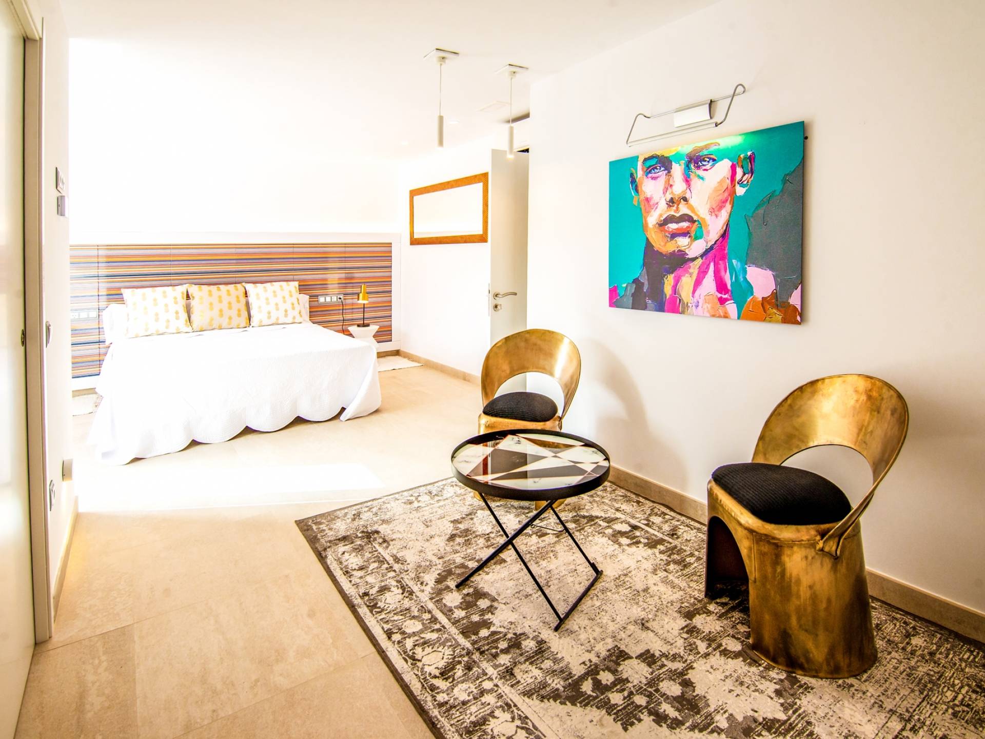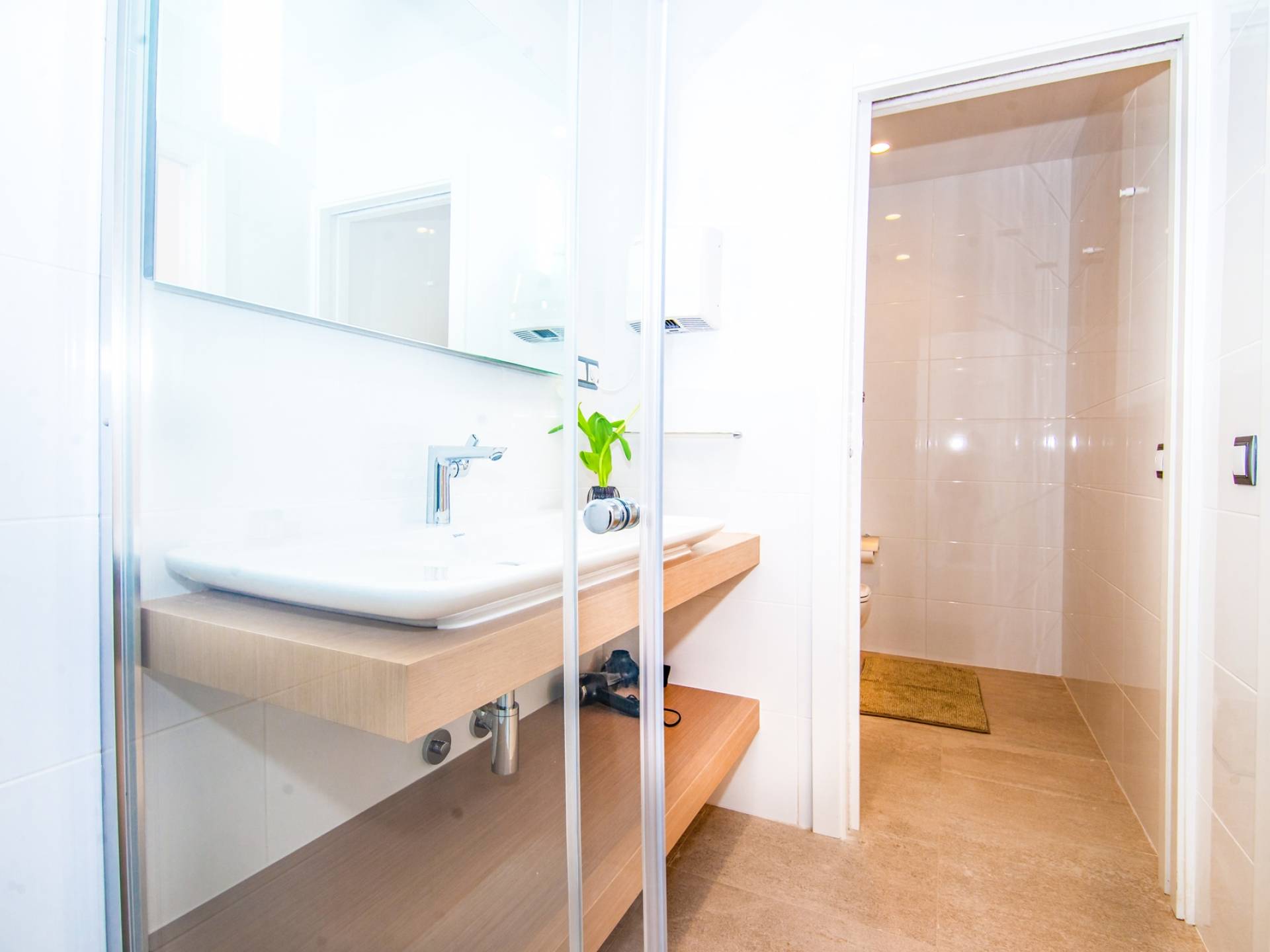 At the entrance, we find the stairs and the elevator that give access to all the floors of the house including the roof terrace. It is divided into the ground floor and the first floor, it has 6 double bedrooms, each with its own bathroom, built-in wardrobe and personalized decoration, a spacious living room with a dining area. If it happens that your trip is for business, it can serve as a meeting room or if you prefer outdoors, there is also a large table on the porch terrace.