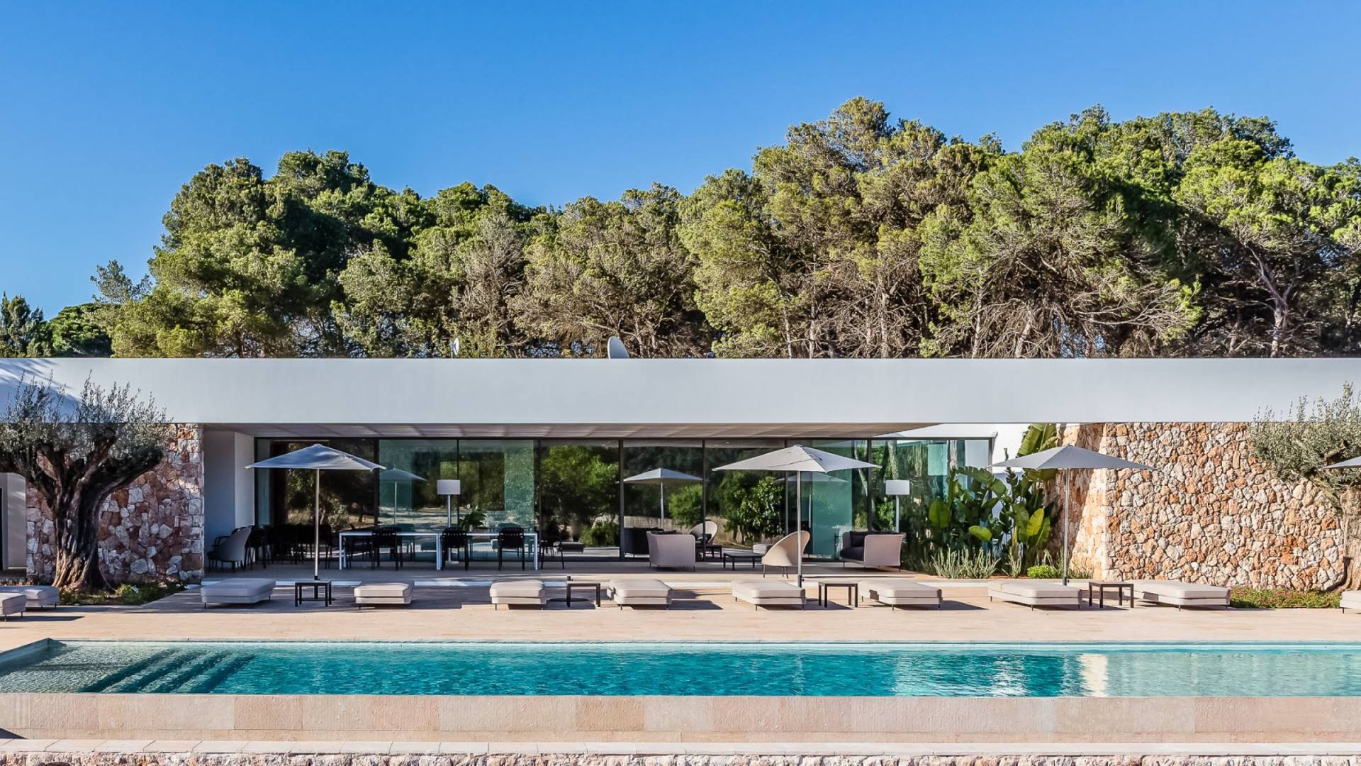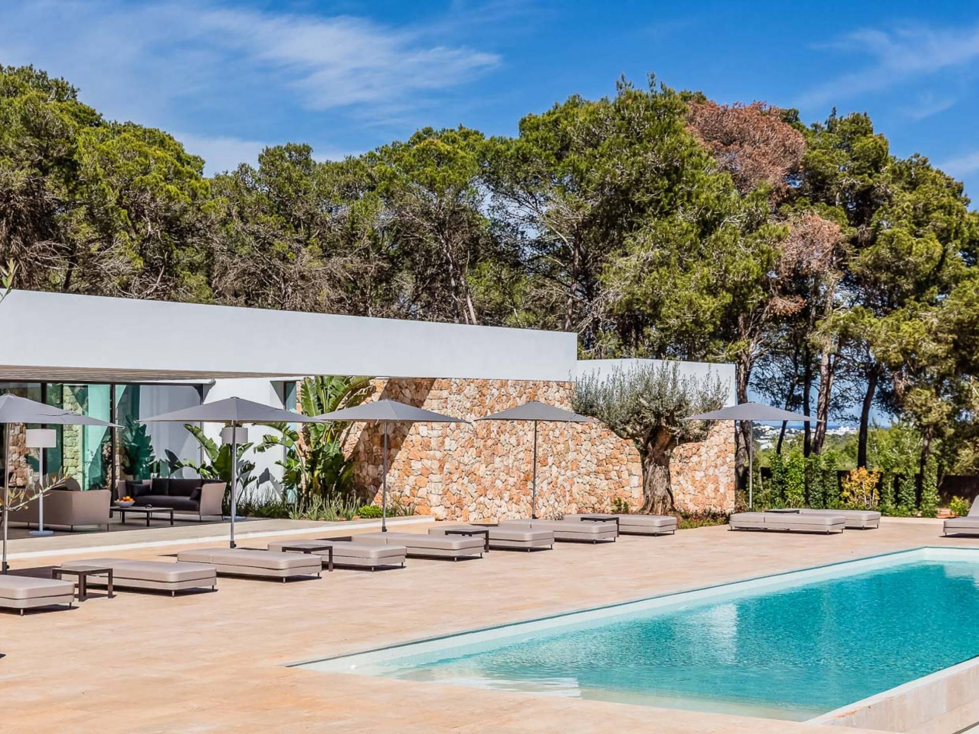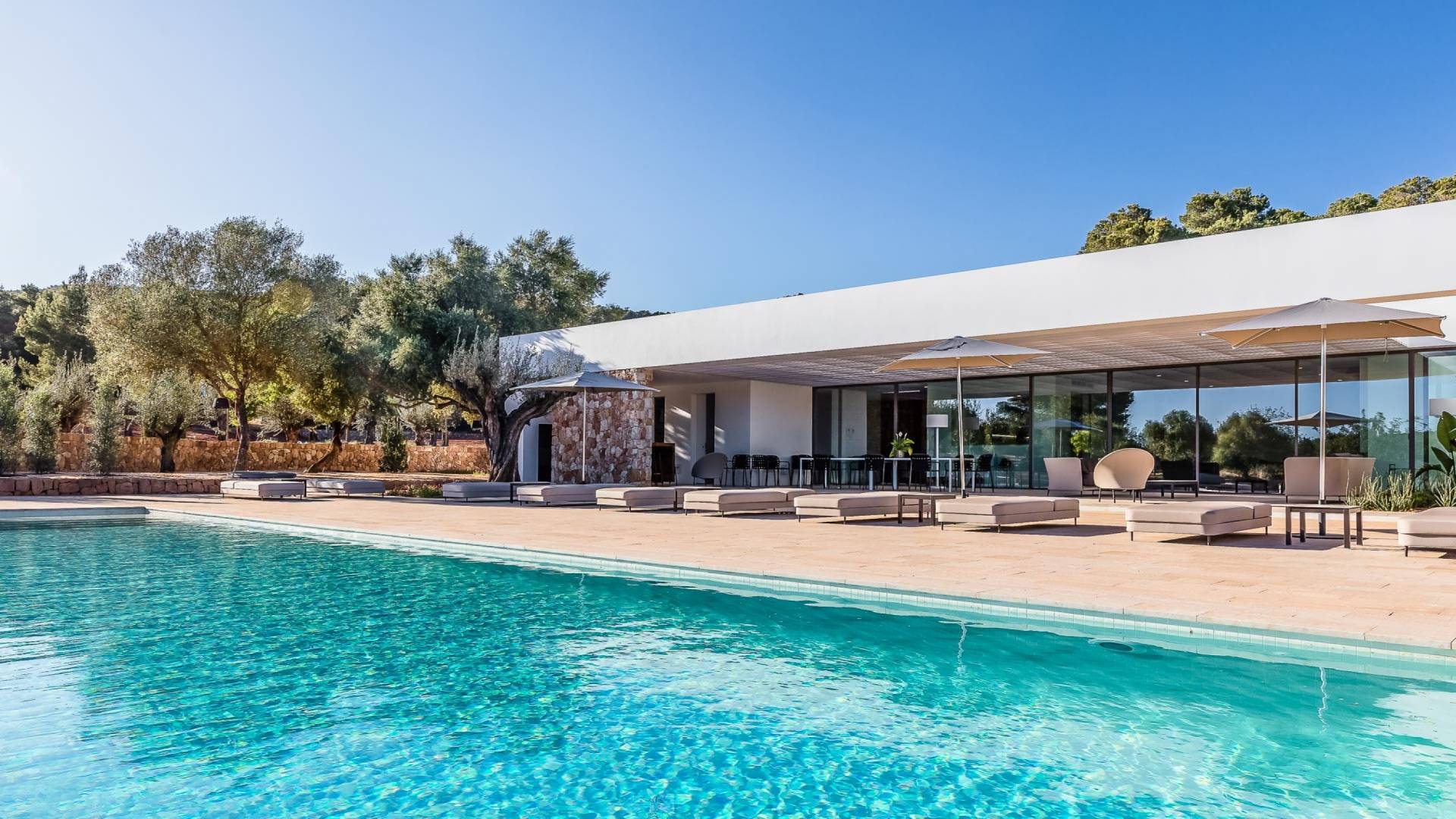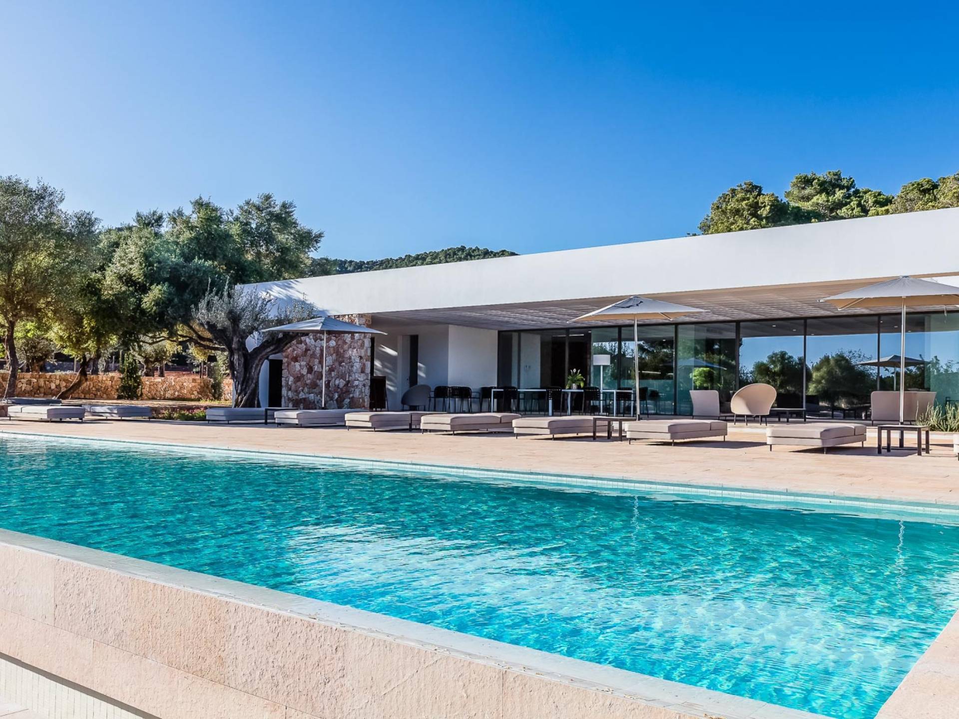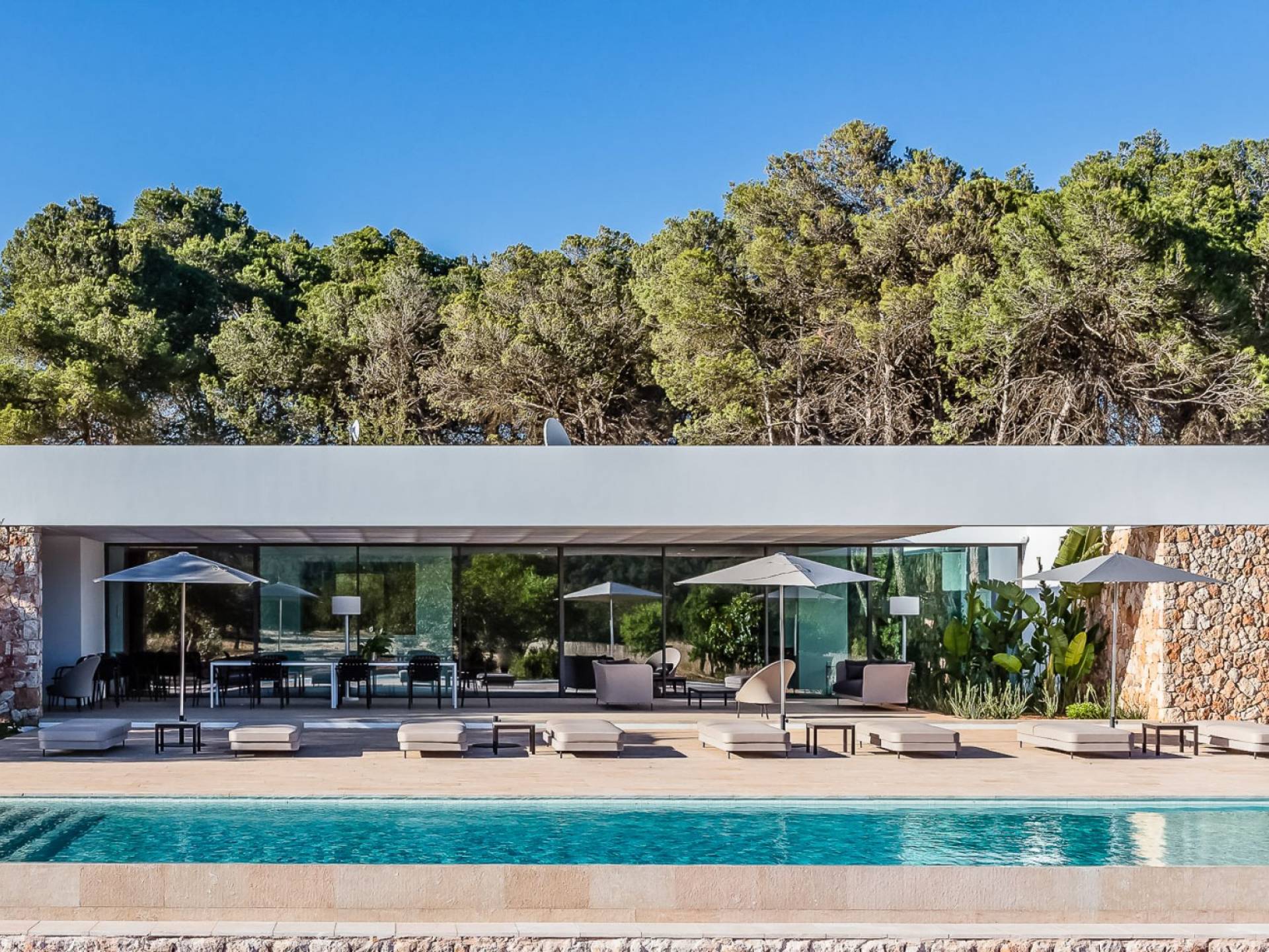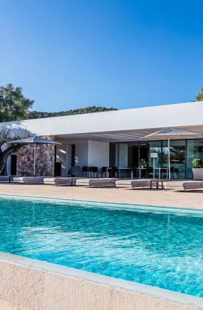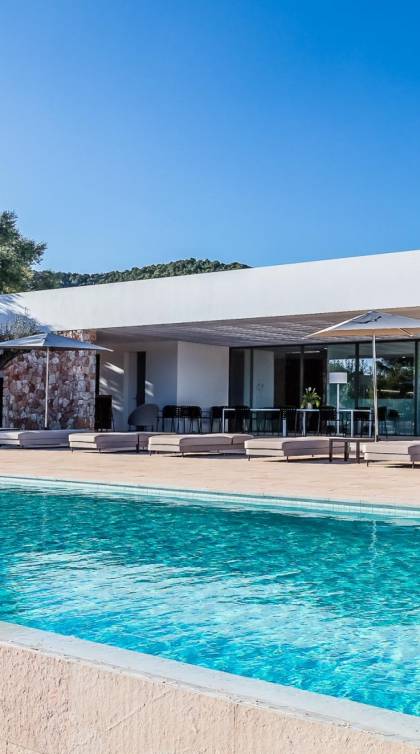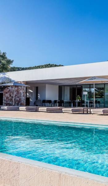 Villa Eclipse Ibiza is a modern villa located in the centre of the island with large outdoor entertaining areas. This immaculate property is completely new and oozes modern architecture and style. It has been finished to a very high standard and offers 5 star comfort. The villa has 480 m2, and 20,000 m2 of land surrounds it.