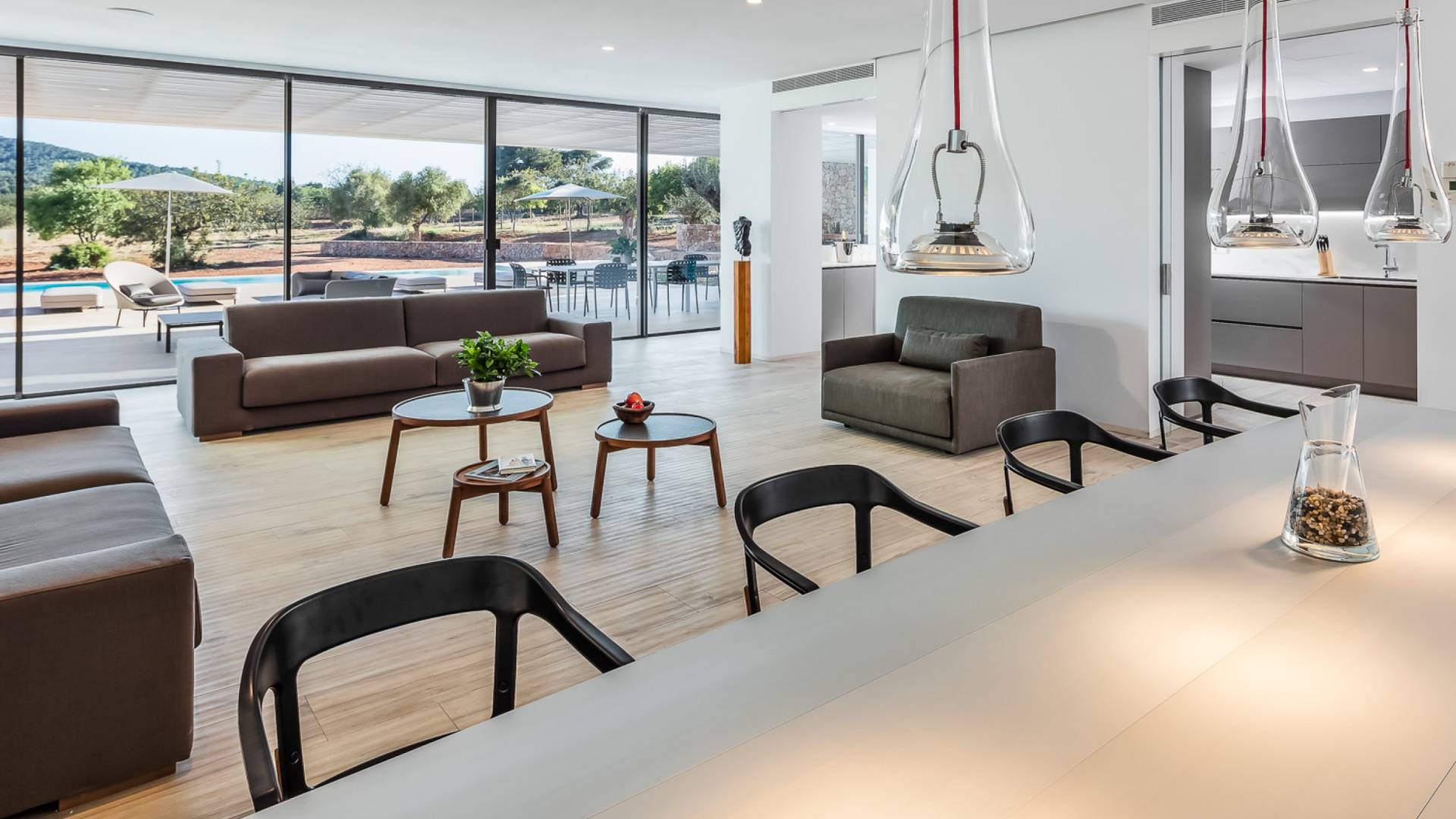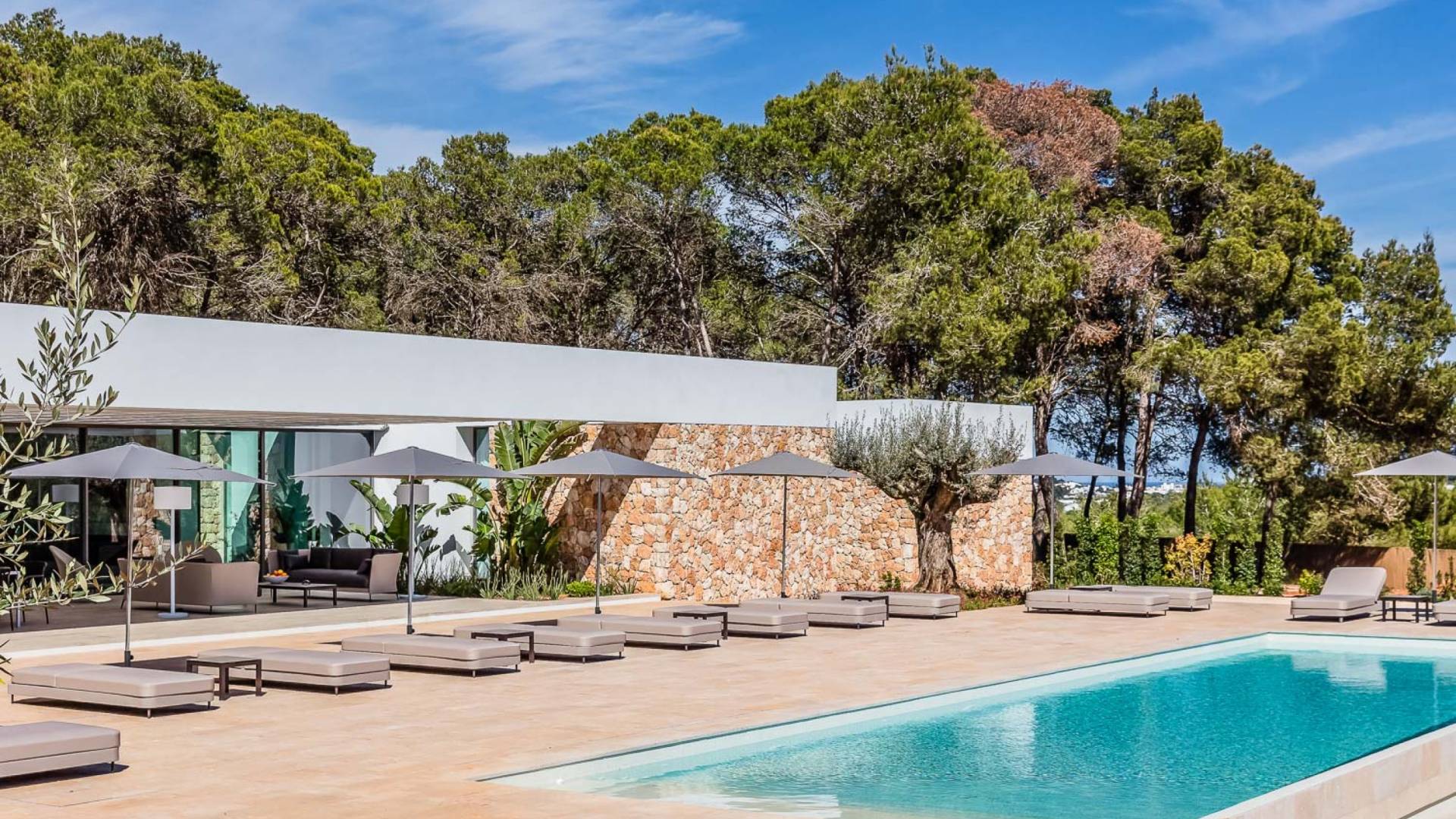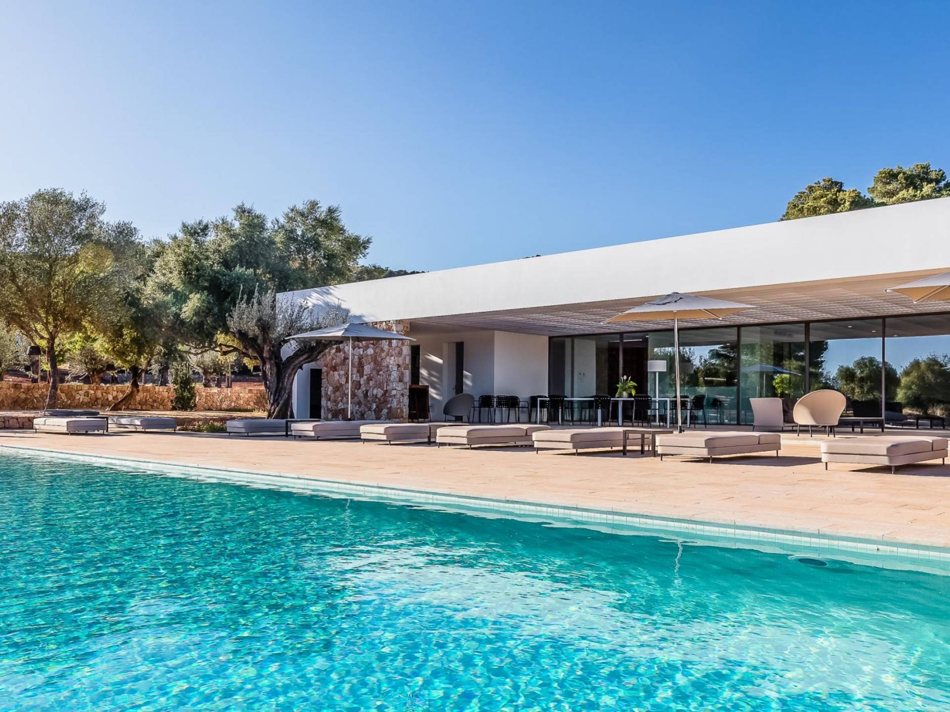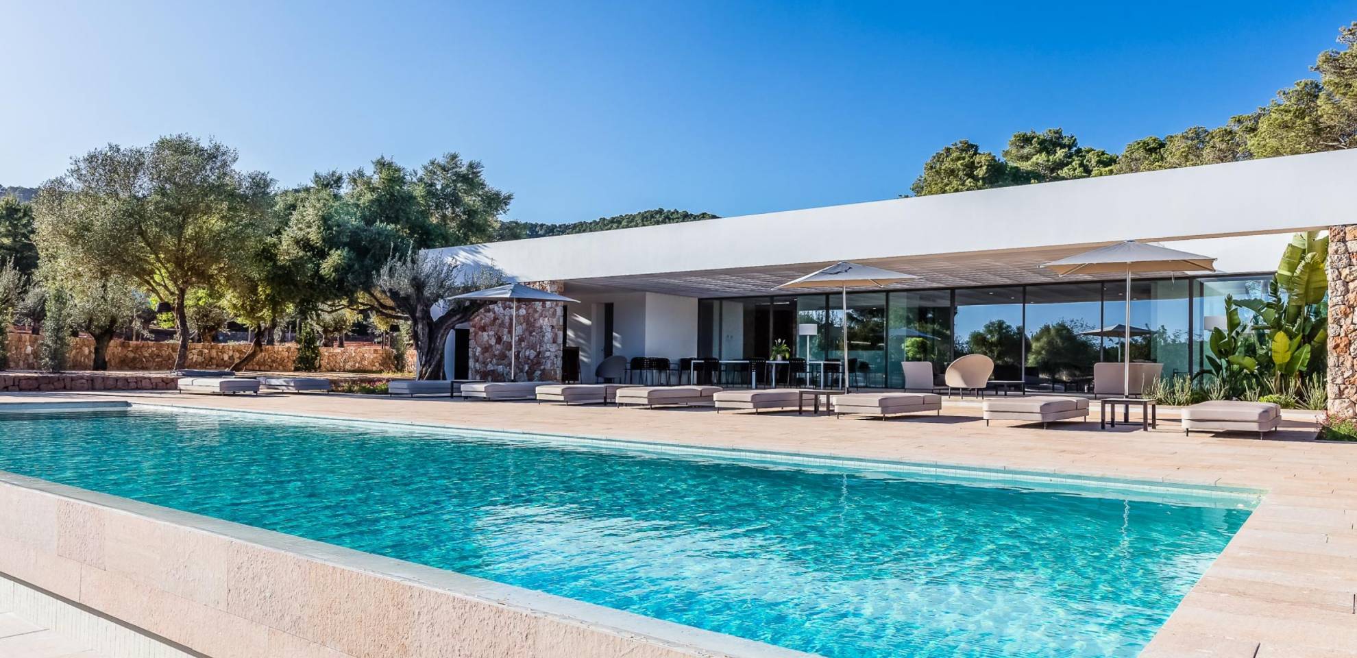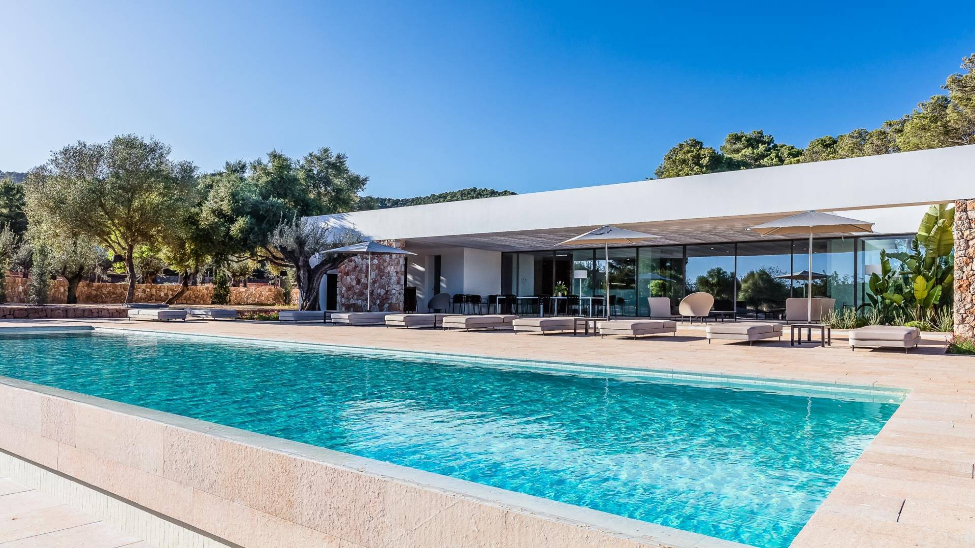 Villa Eclipse Ibiza is a modern villa located in the centre of the island with large outdoor entertaining areas. This immaculate property is completely new and oozes modern architecture and style. It has been finished to a very high standard and offers 5 star comfort. The villa has 480 m2, and 20,000 m2 of land surrounds it.