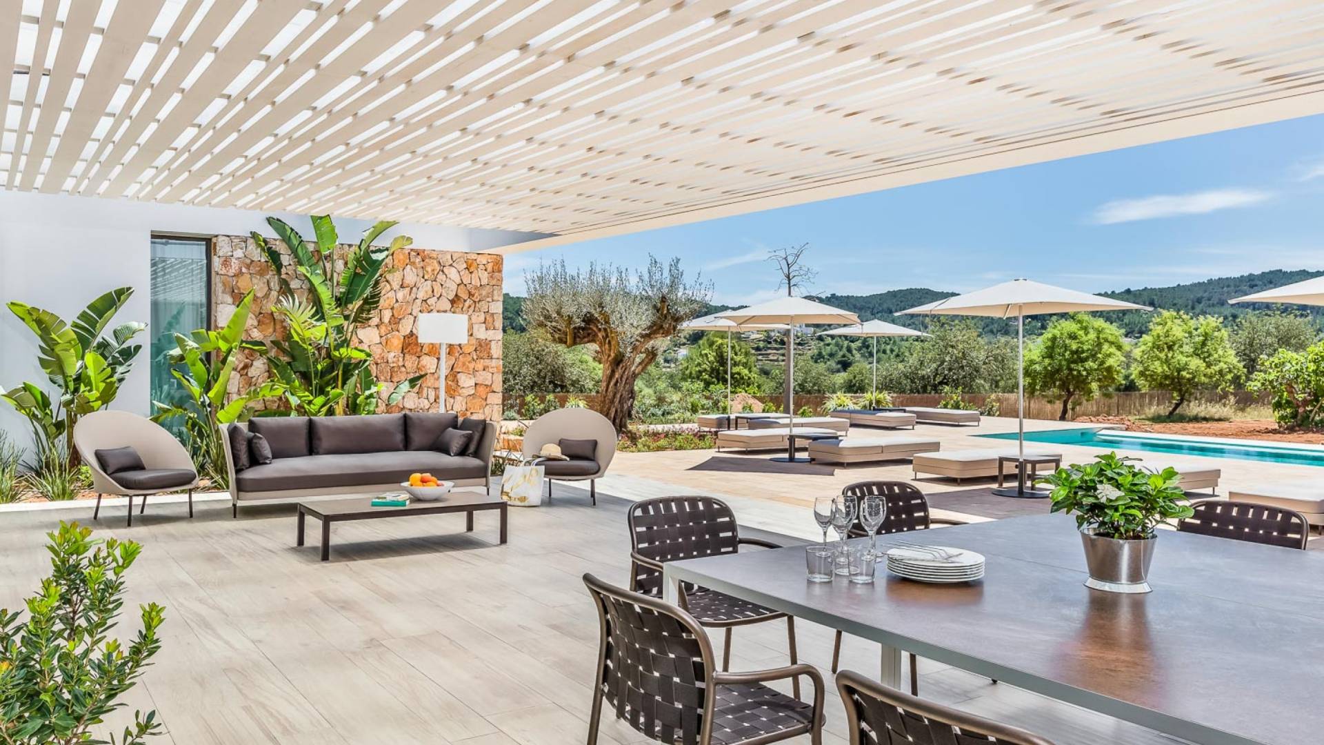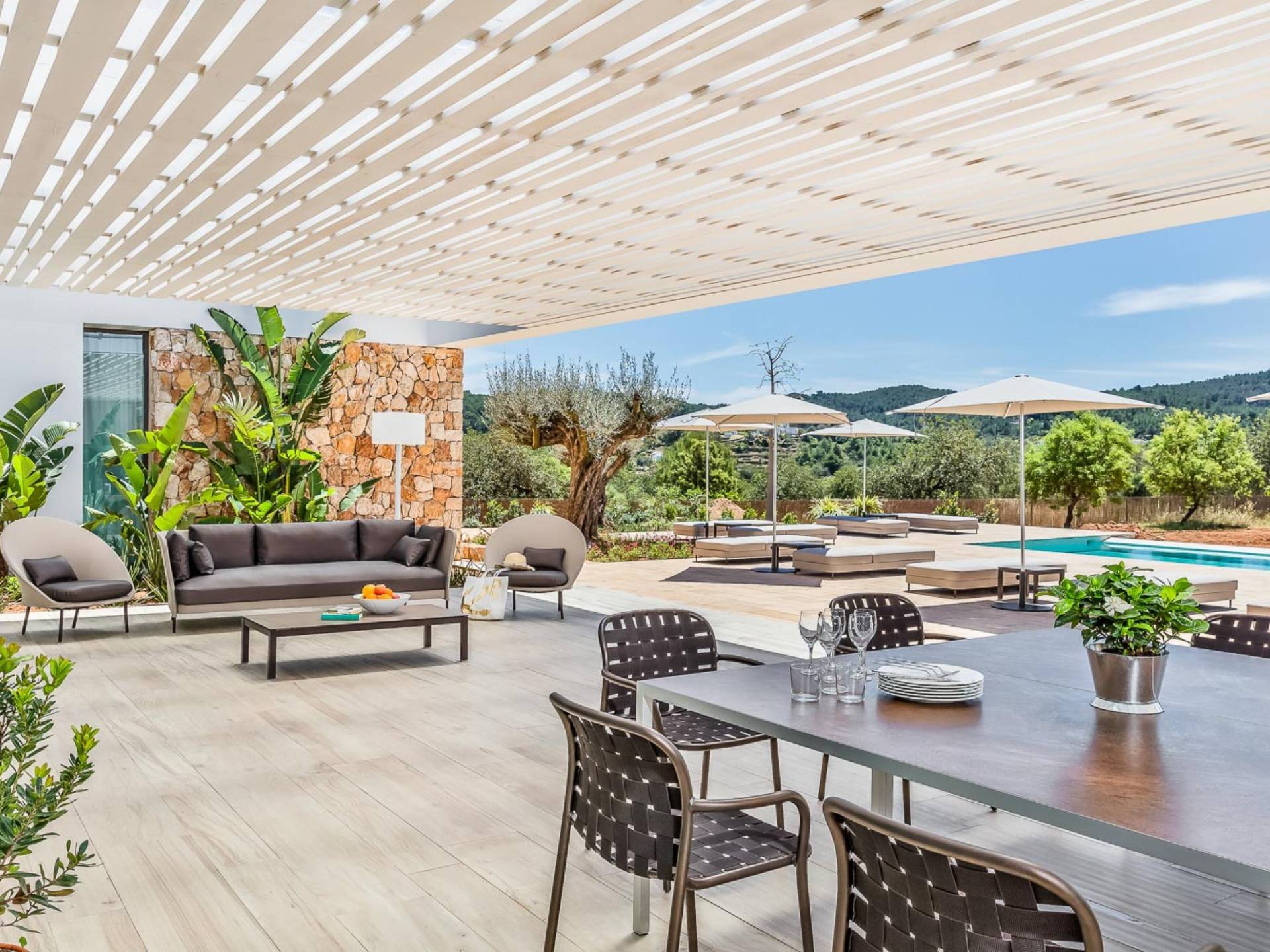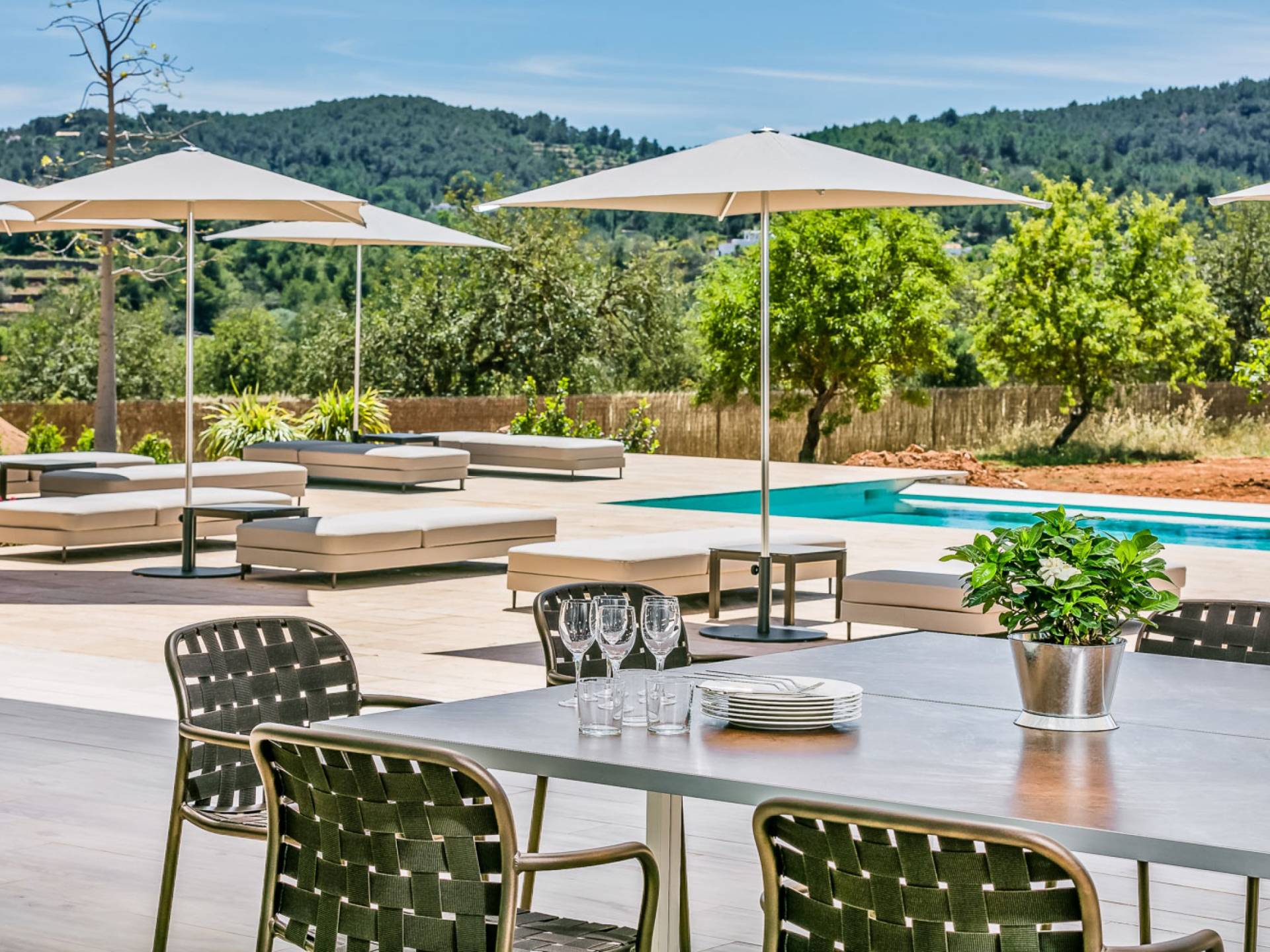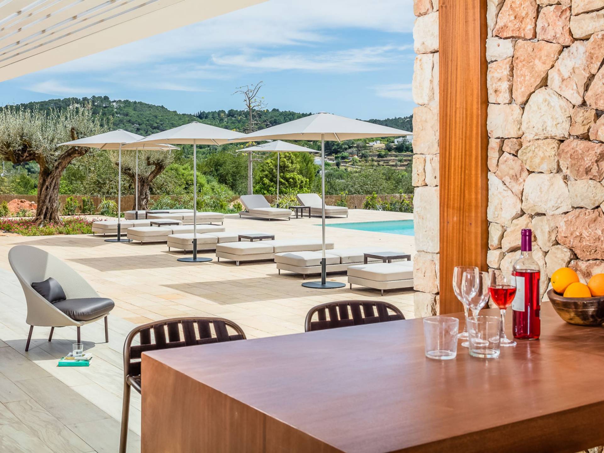 Villa Eclipse Ibiza outdoor areas are stunning and include a large swimming pool surrounded by sun beds, parasols and ample outdoor furniture for 14 guests. There are fantastic mountain and countryside views surrounding Santa Eulalia, an outdoor barbecue and 2nd kitchen area, terraces, garage and an outside dining and chill out area for 14 guests.