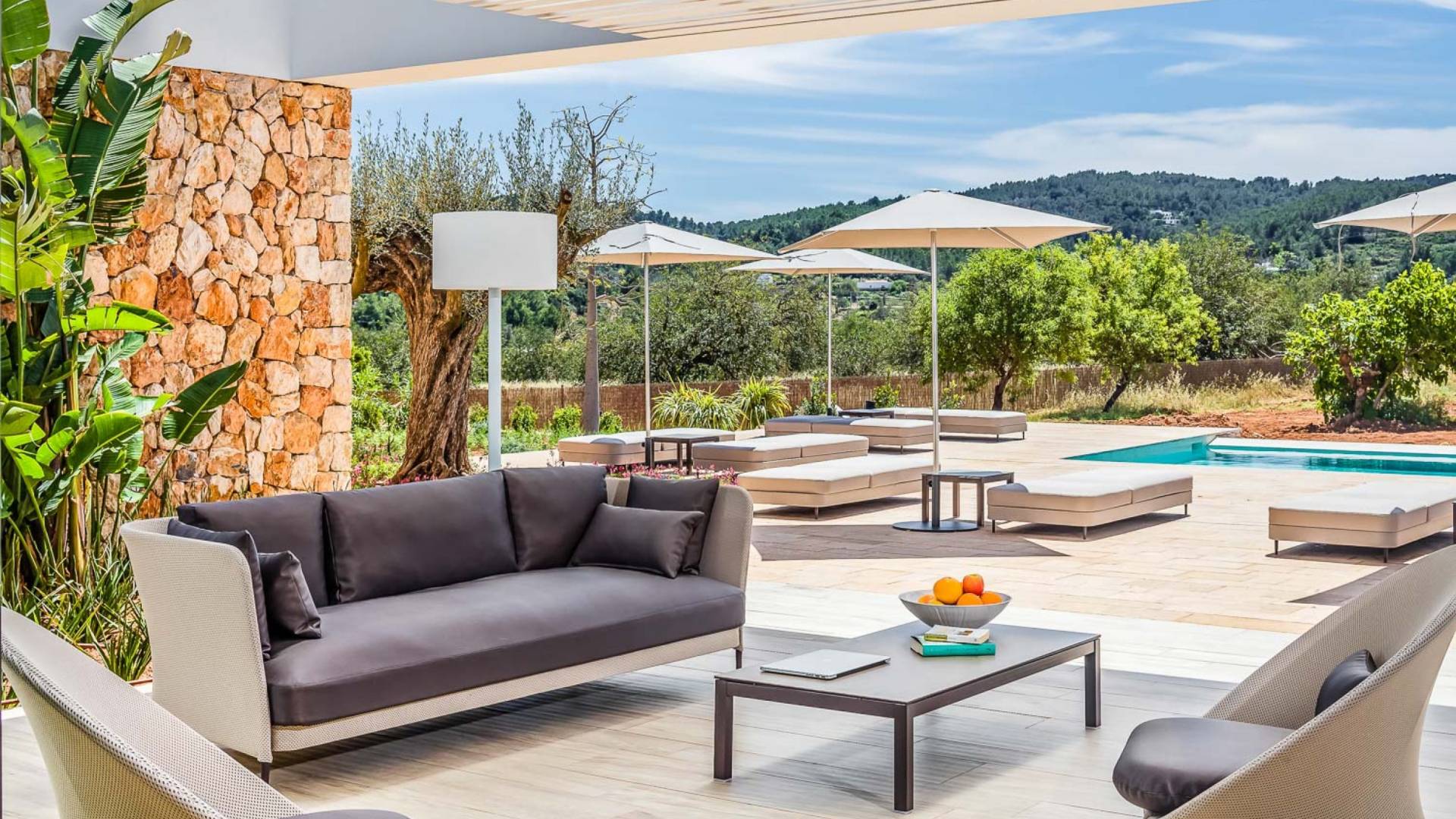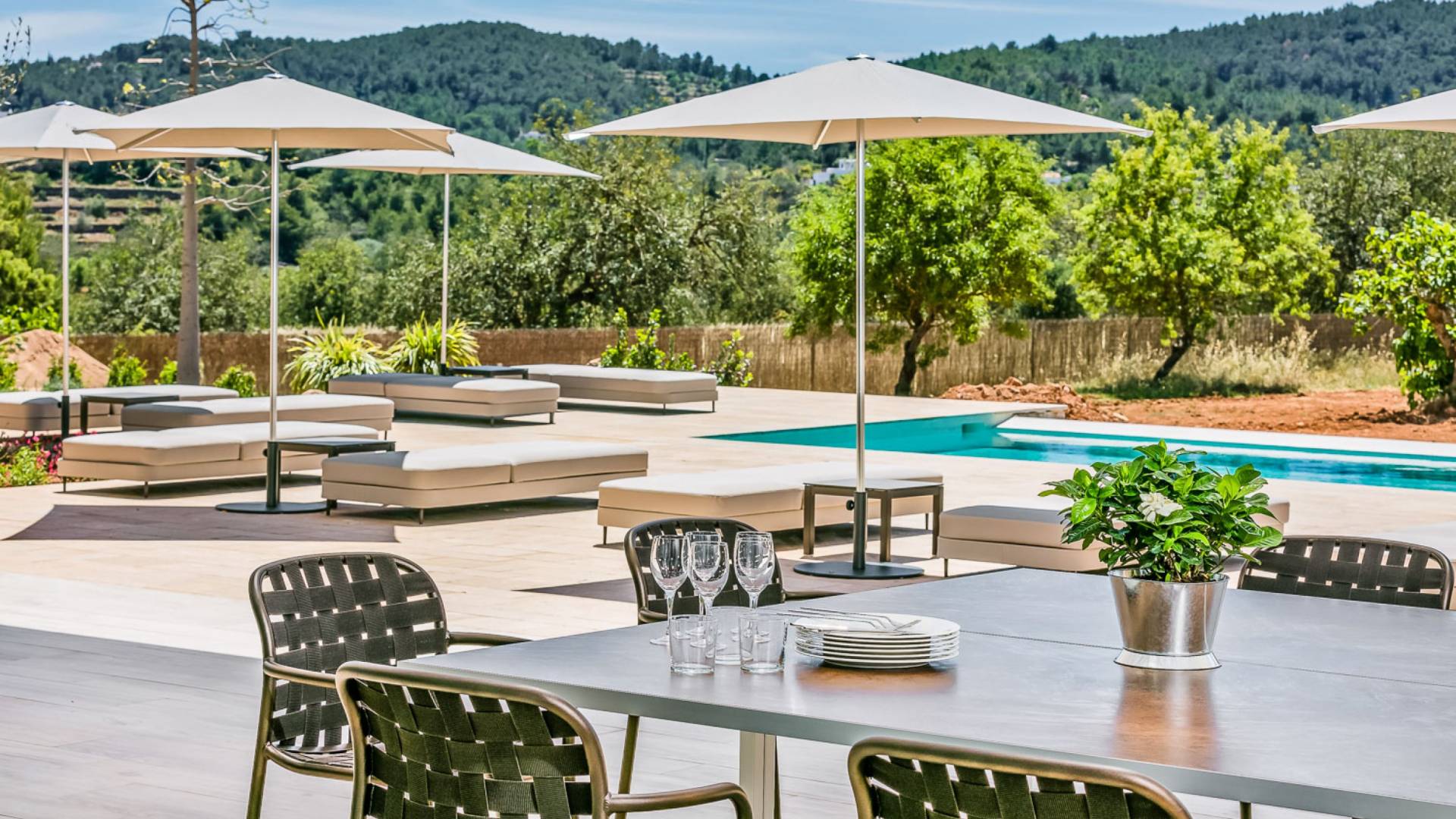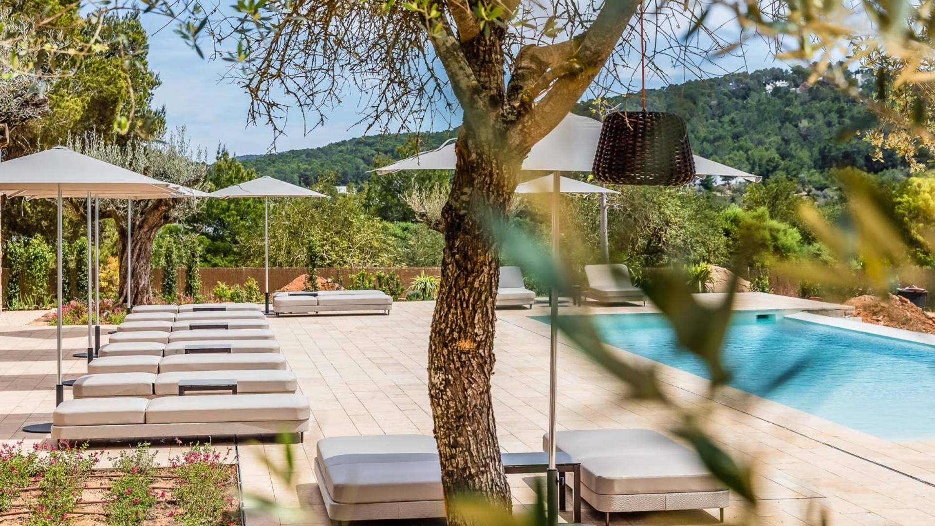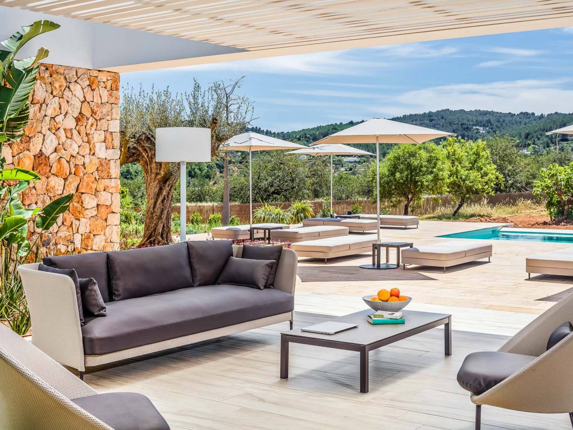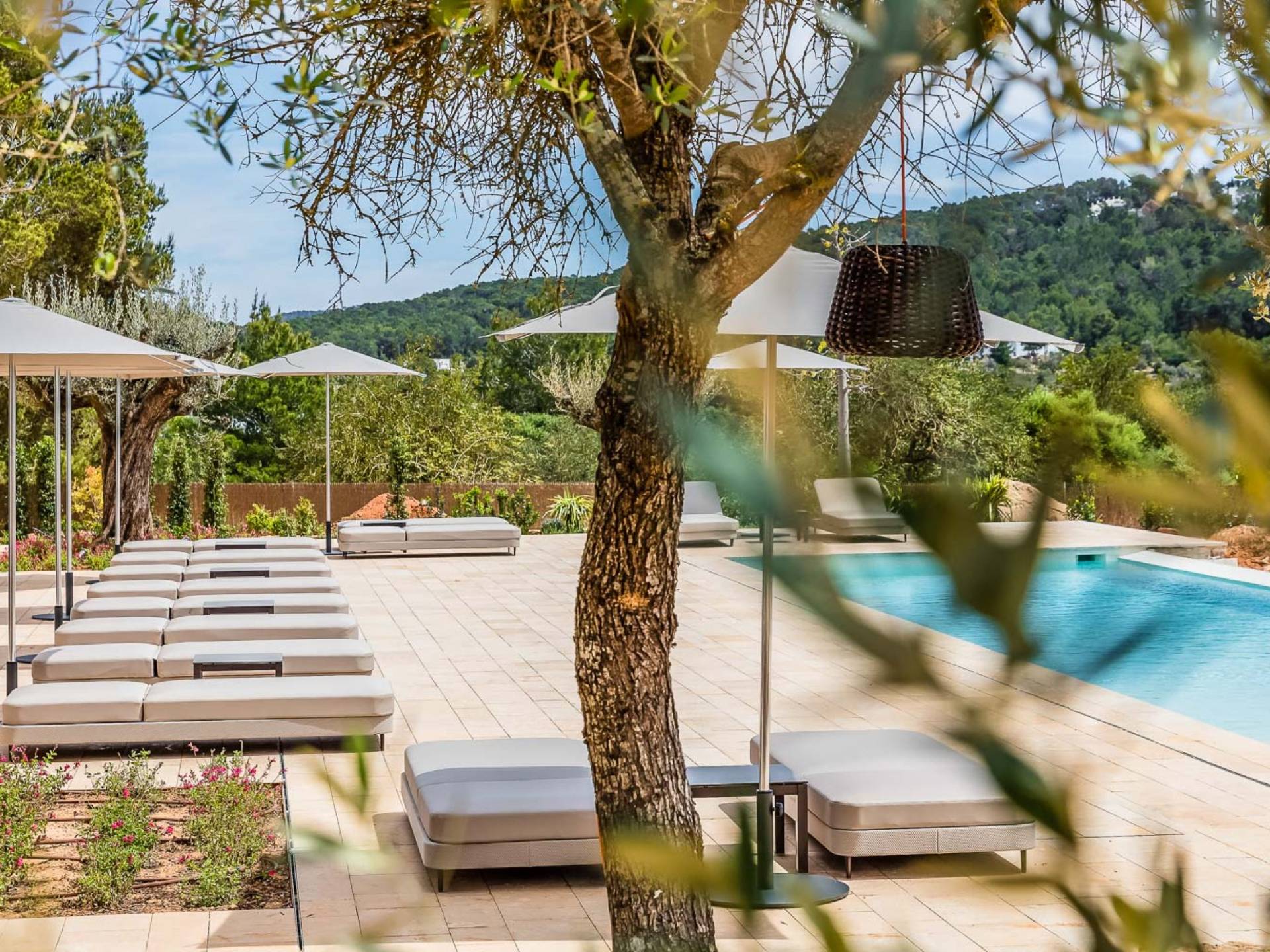 Villa Eclipse Ibiza outdoor areas are stunning and include a large swimming pool surrounded by sun beds, parasols and ample outdoor furniture for 14 guests. There are fantastic mountain and countryside views surrounding Santa Eulalia, an outdoor barbecue and 2nd kitchen area, terraces, garage and an outside dining and chill out area for 14 guests.
