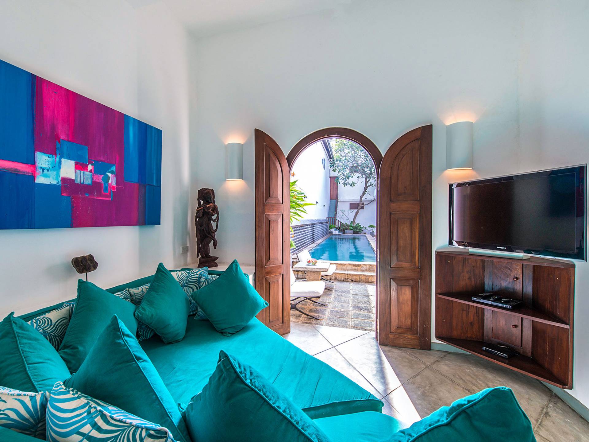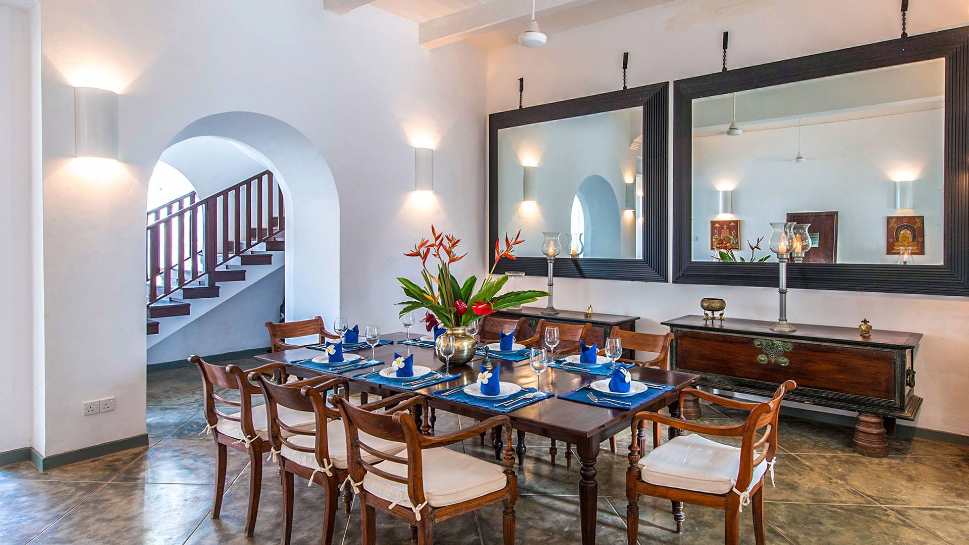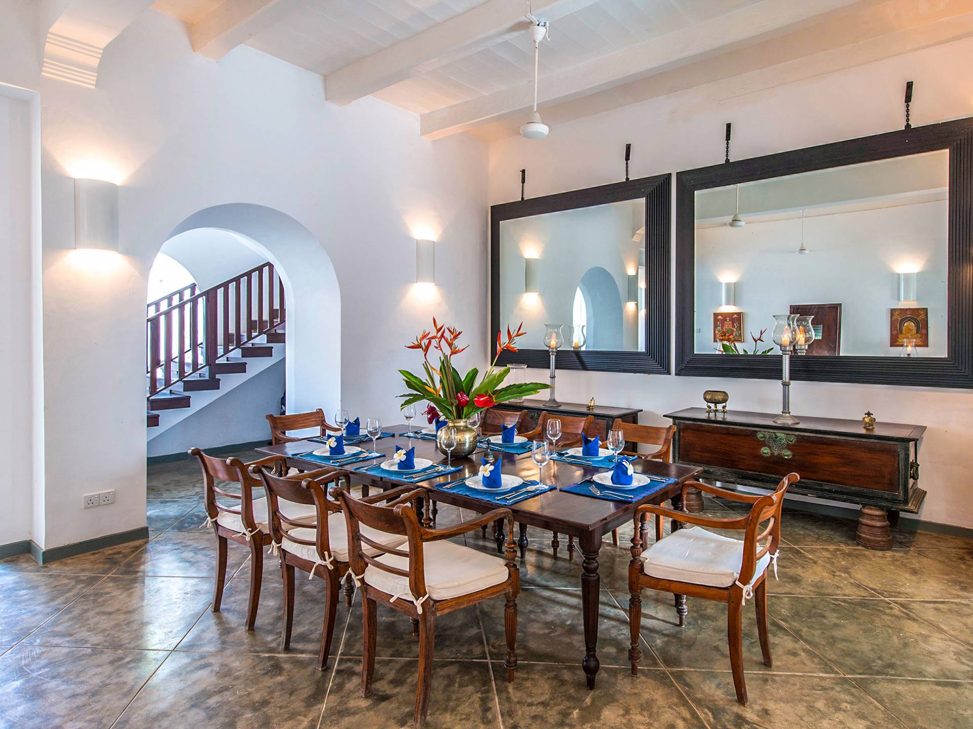 Ambassador's House Galle enjoys a harmonious blend of modern luxury amenities and classy vintage style. Buddhist artwork and the jewel-toned private pool evoke the ambiance of an enchanted exotic haven, infusing your stay with a timeless serenity. Laze in the sunlight on lounge chairs and immerse yourself into nature’s sounds. Take a deep in the pool to cool off the heat and join your loved ones for a home-catered meal in either one of the indoor or outdoor dining.