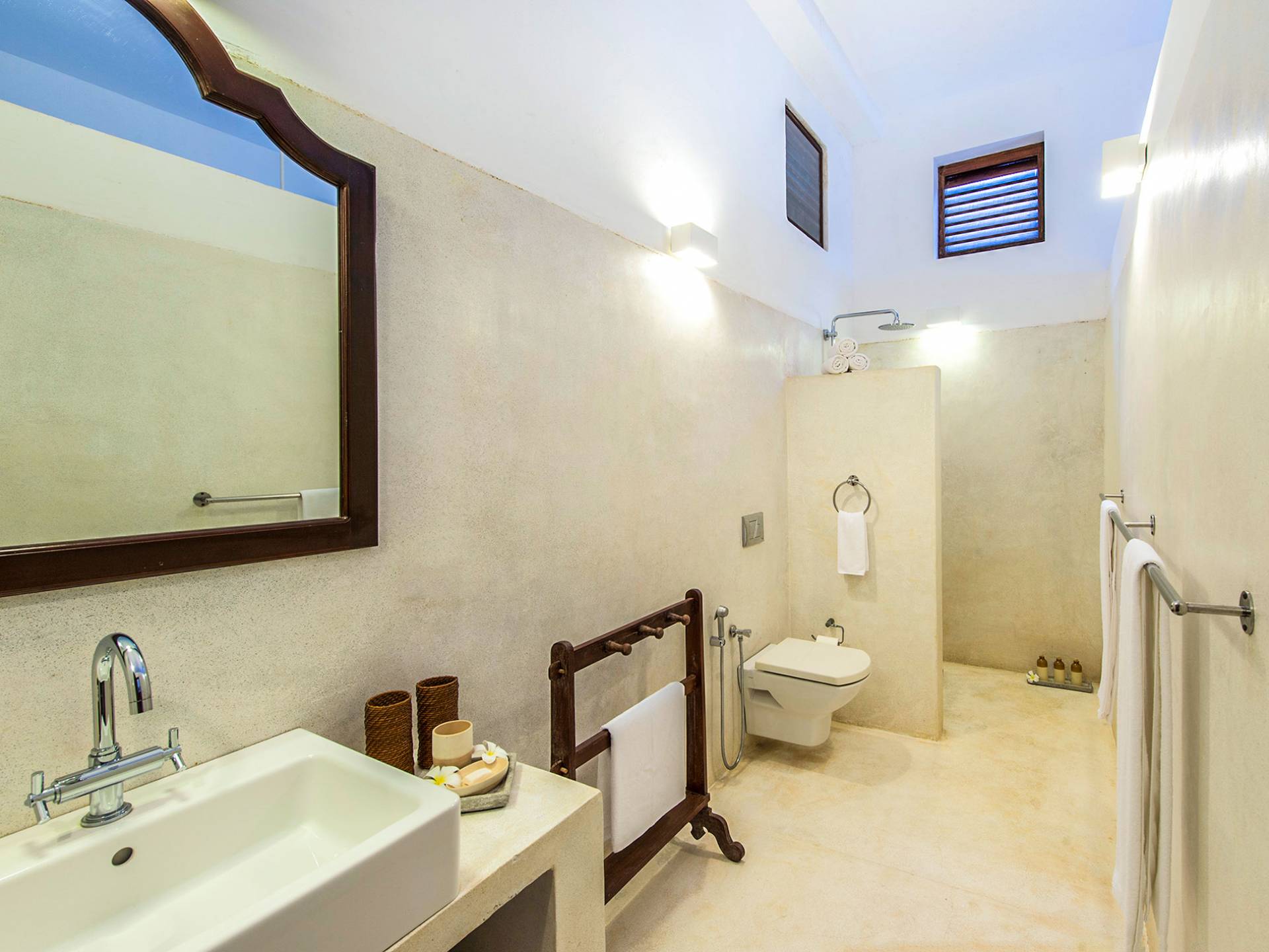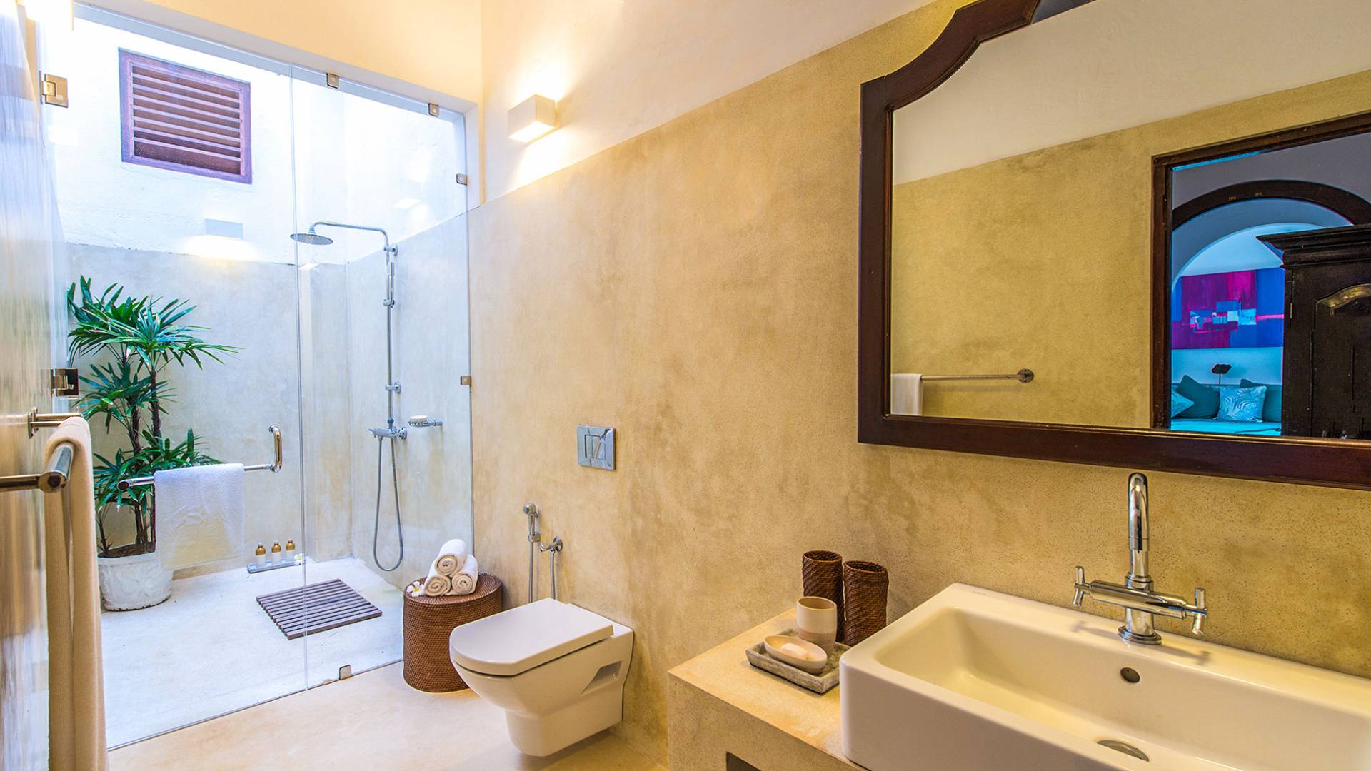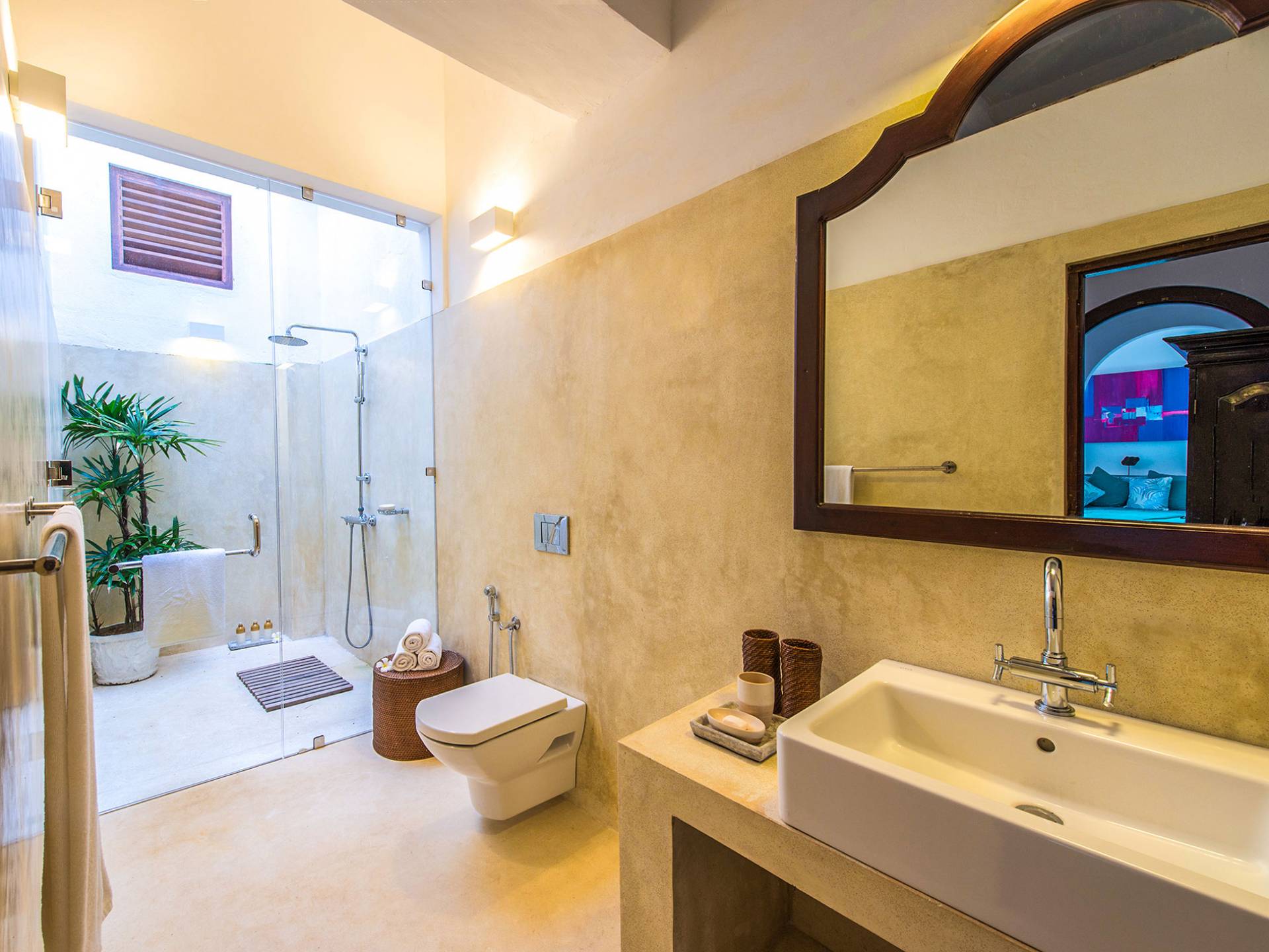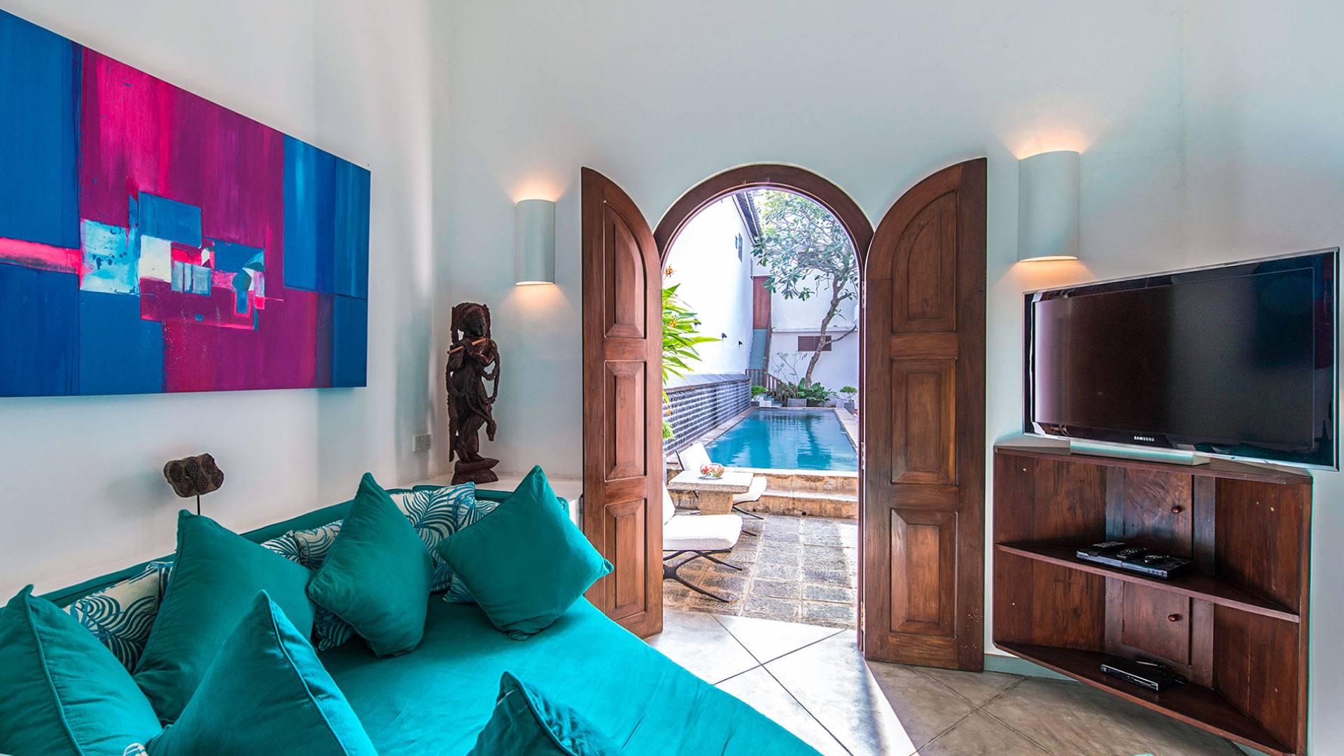 Ambassador's House Galle enjoys a harmonious blend of modern luxury amenities and classy vintage style. Buddhist artwork and the jewel-toned private pool evoke the ambiance of an enchanted exotic haven, infusing your stay with a timeless serenity. Laze in the sunlight on lounge chairs and immerse yourself into nature’s sounds. Take a deep in the pool to cool off the heat and join your loved ones for a home-catered meal in either one of the indoor or outdoor dining.