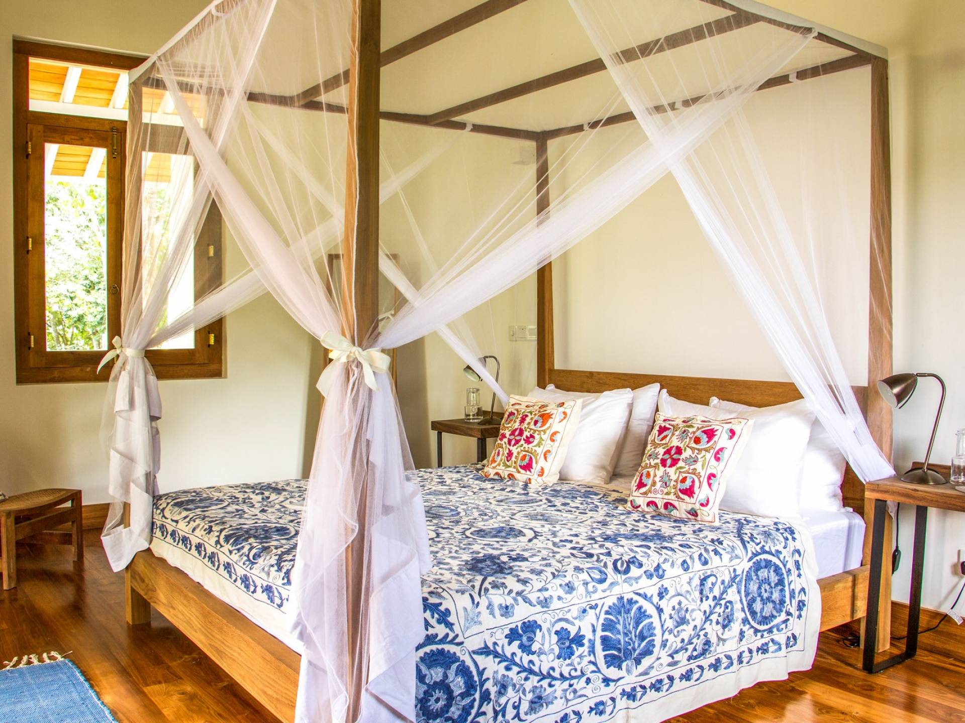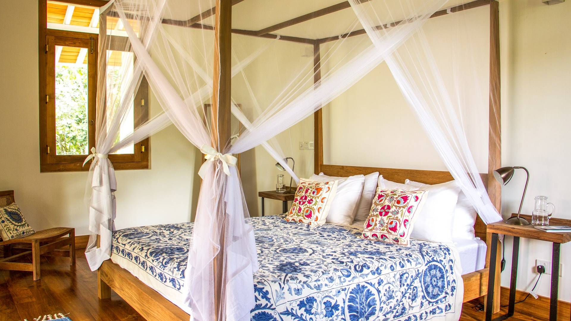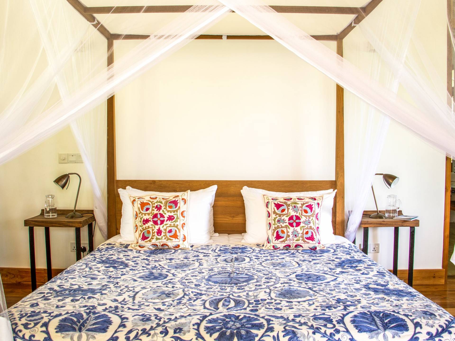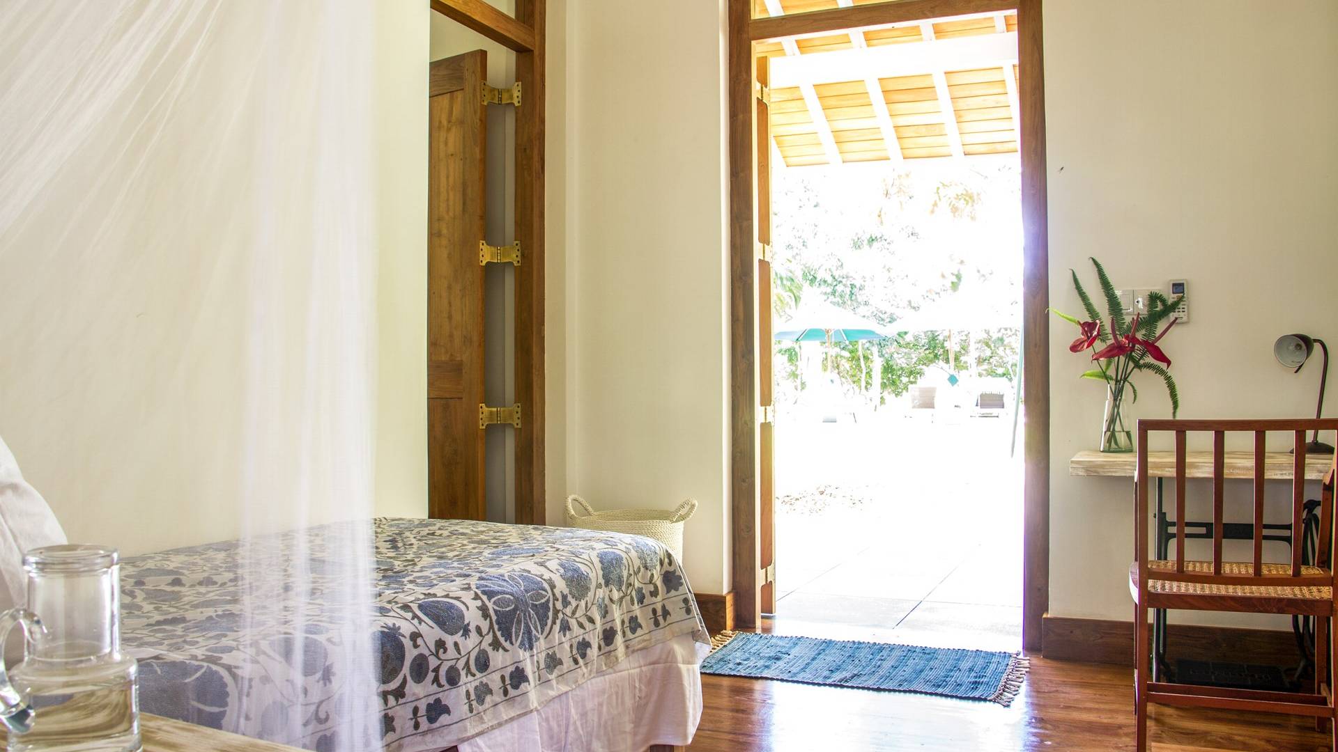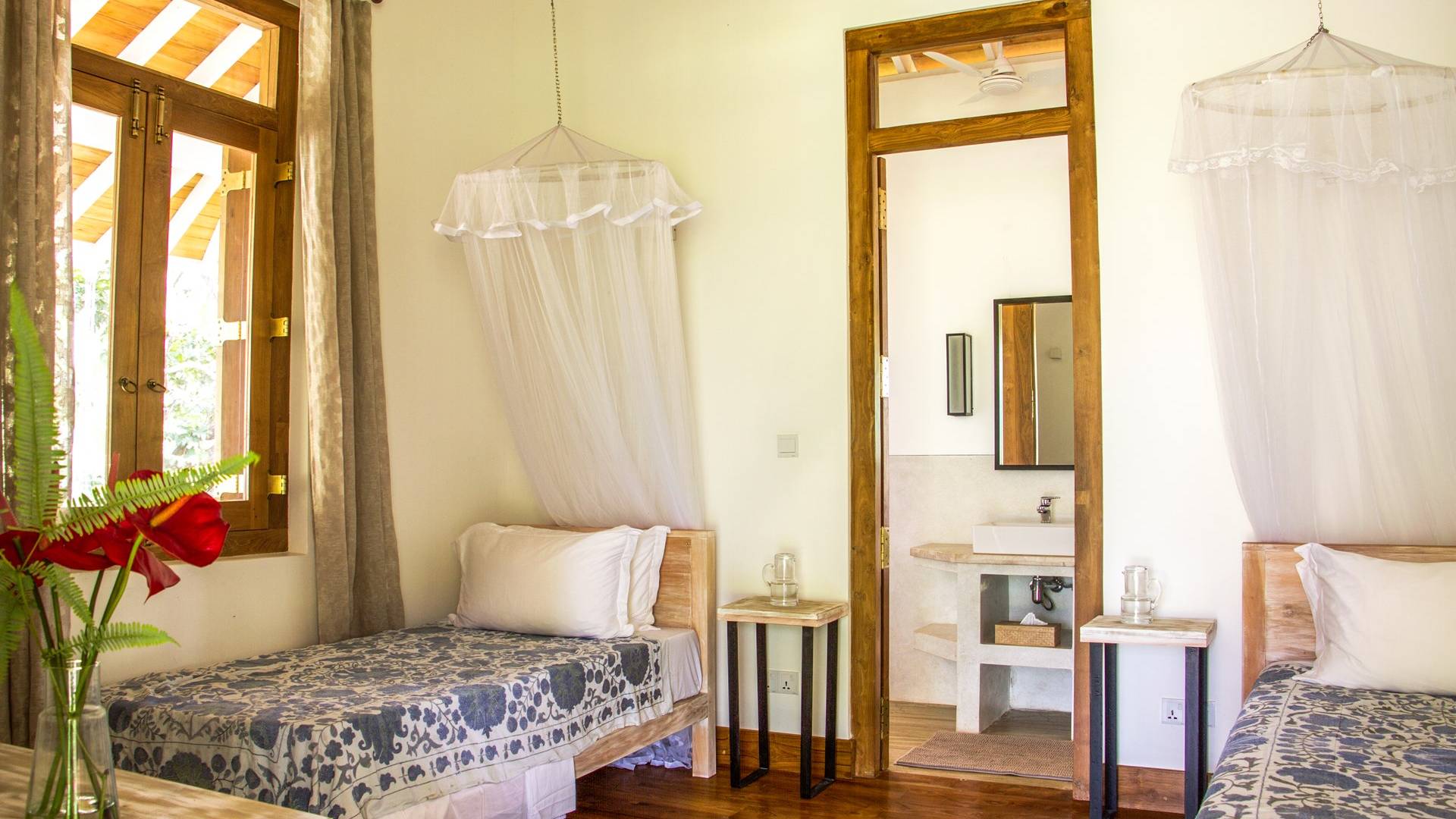 The final room, the master suite, sits beyond the twin and can either be accessed through the adjoining long walk-in wardrobe or via its own veranda entrance. A large king-sized 4-poster bed with a big en suite bathroom, double basins, a safe, and a bathtub. All of the rooms have teak floors and windows, A/C, overhead fans, mosquito nets, and en suite bathrooms with walk-in showers.