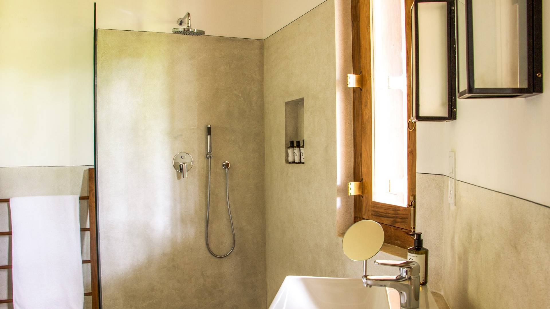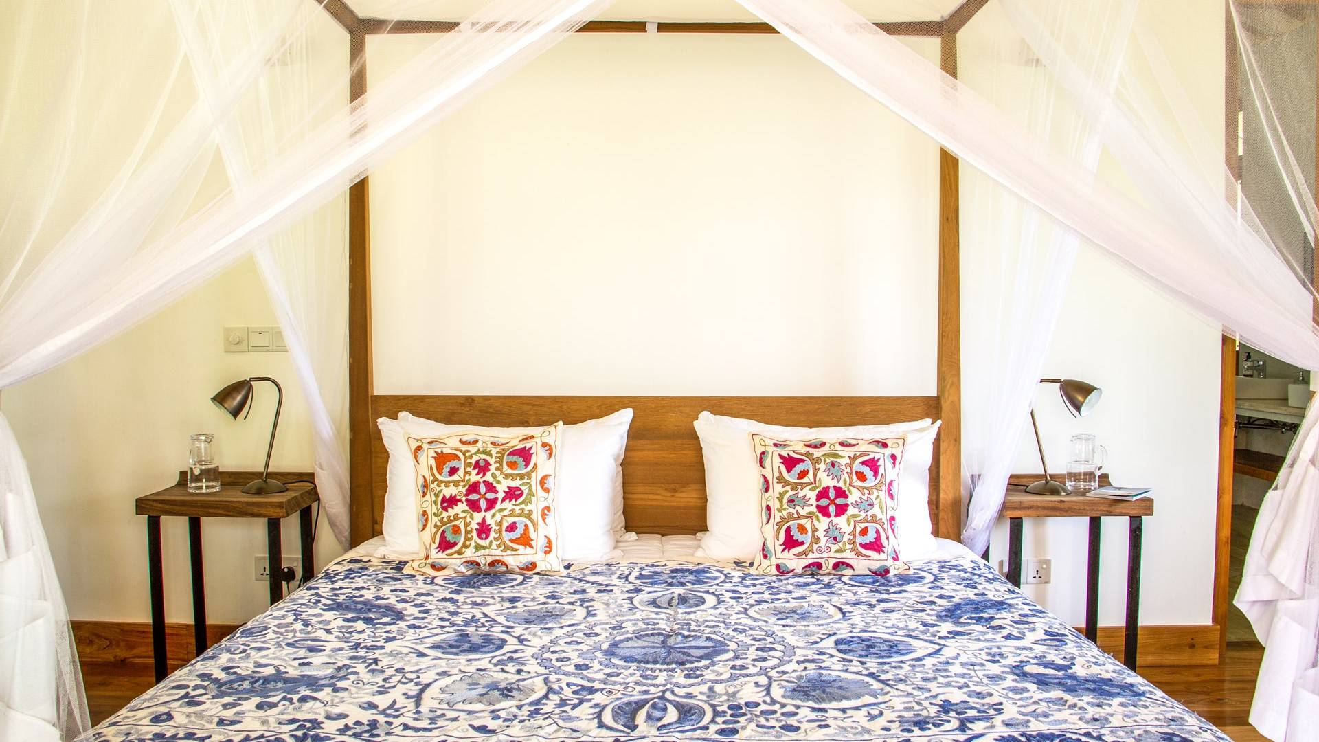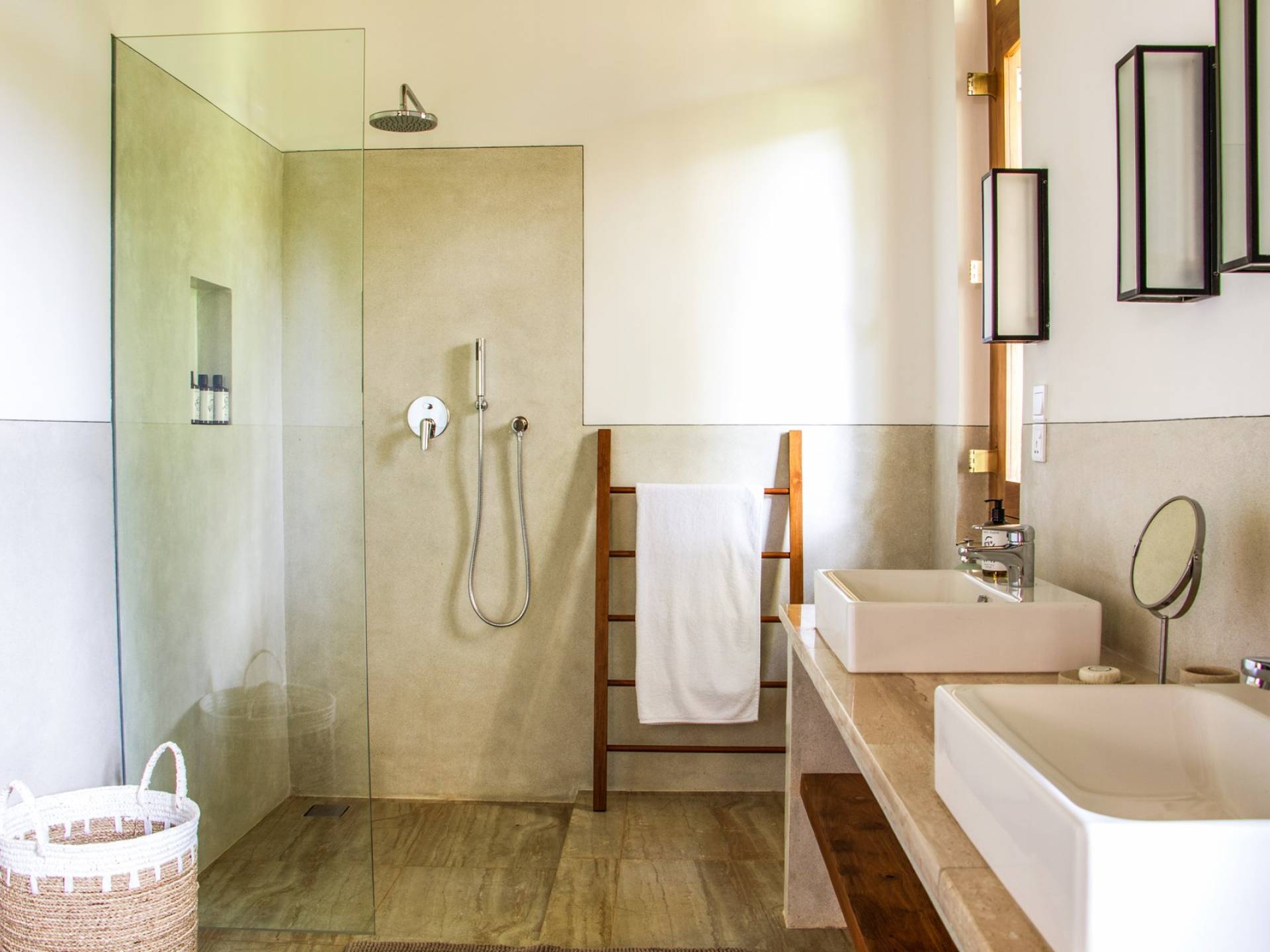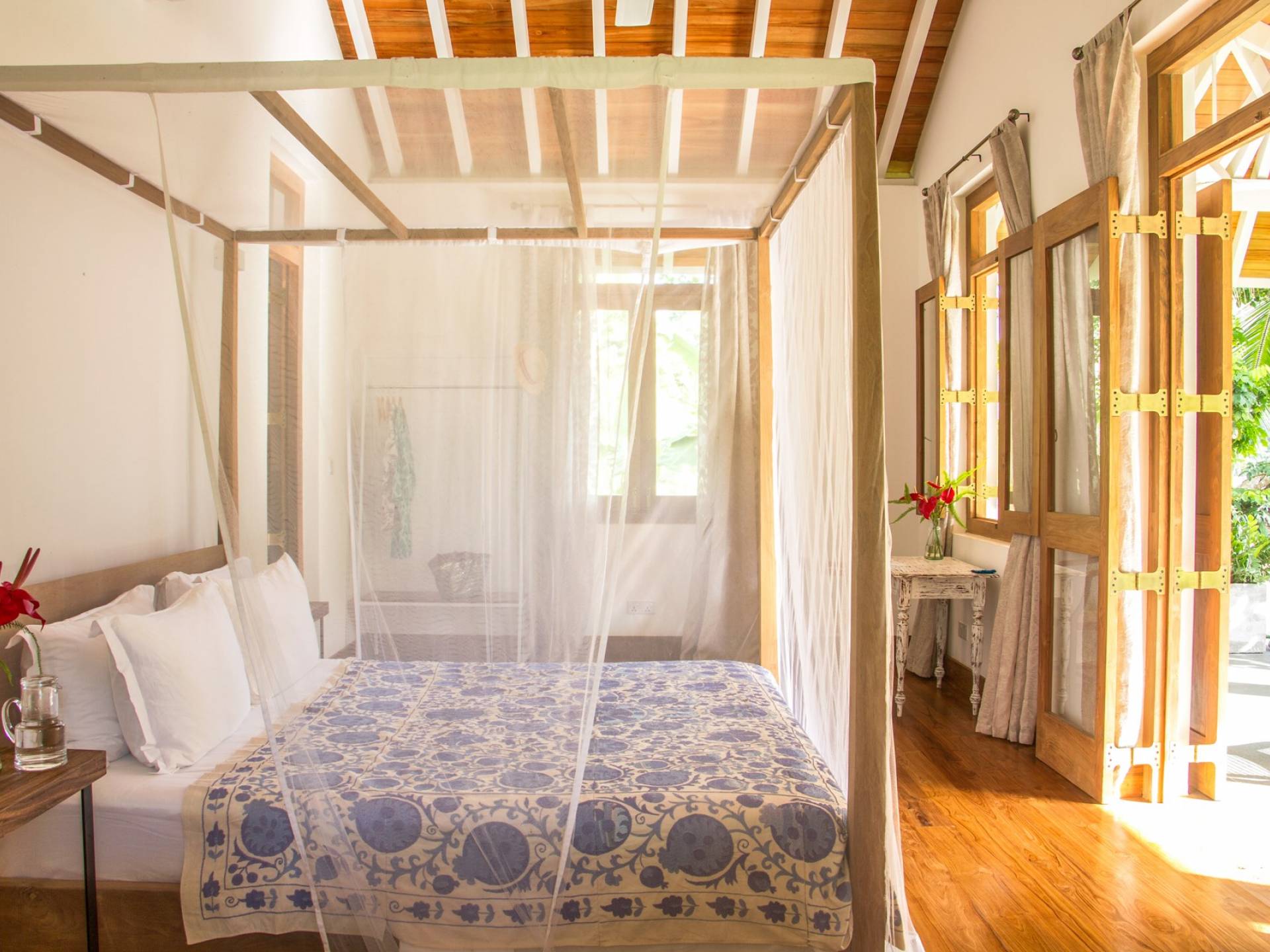 The final room, the master suite, sits beyond the twin and can either be accessed through the adjoining long walk-in wardrobe or via its own veranda entrance. A large king-sized 4-poster bed with a big en suite bathroom, double basins, a safe, and a bathtub. All of the rooms have teak floors and windows, A/C, overhead fans, mosquito nets, and en suite bathrooms with walk-in showers.