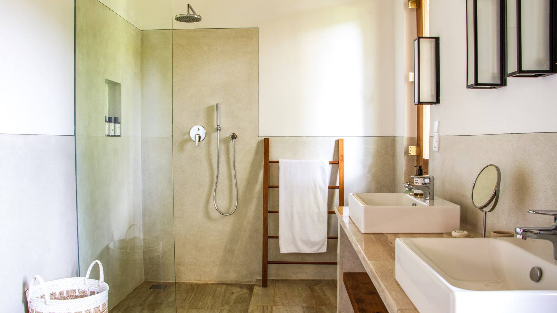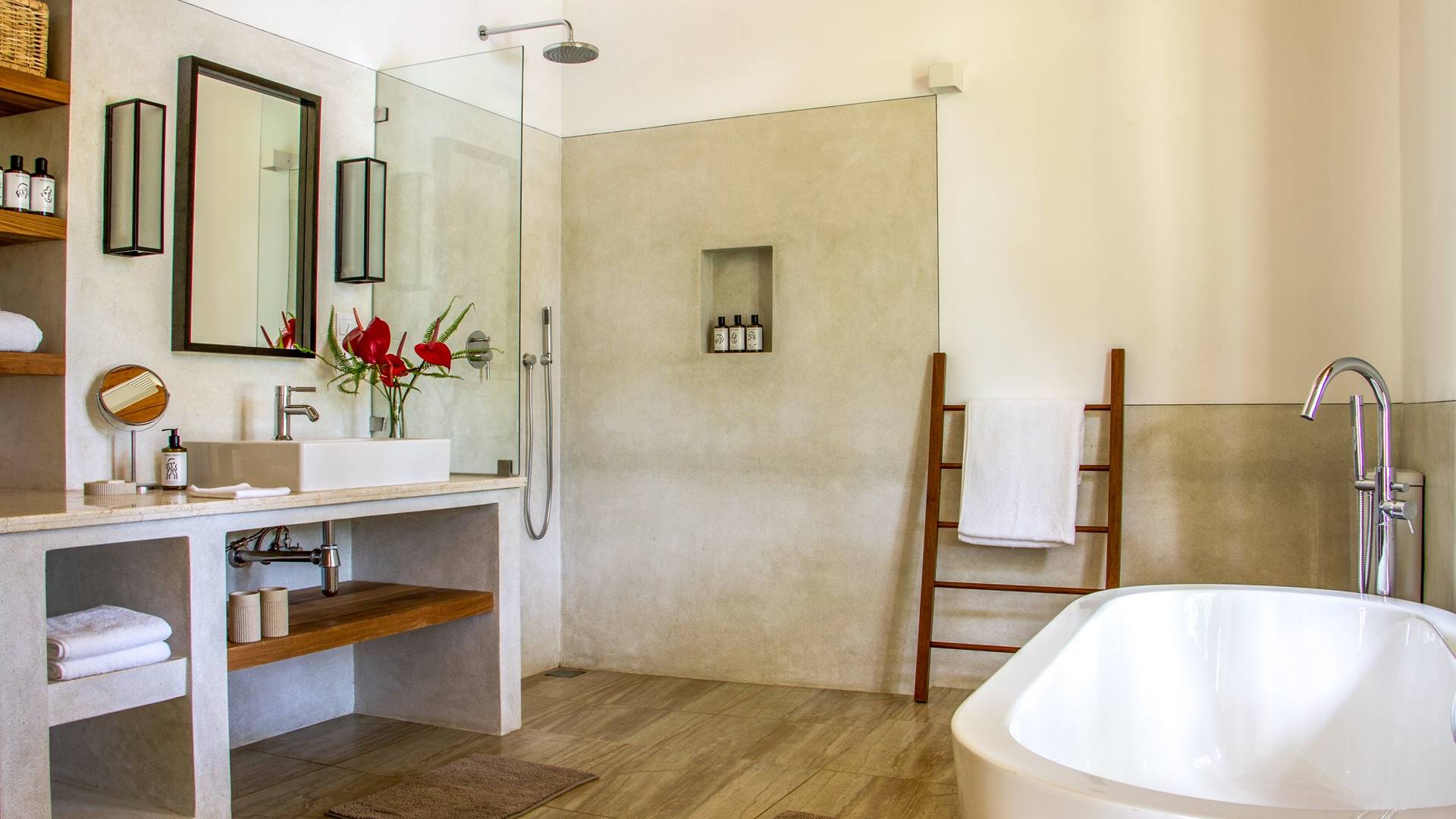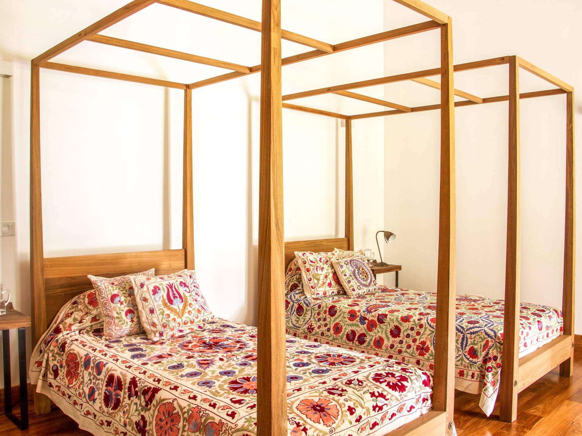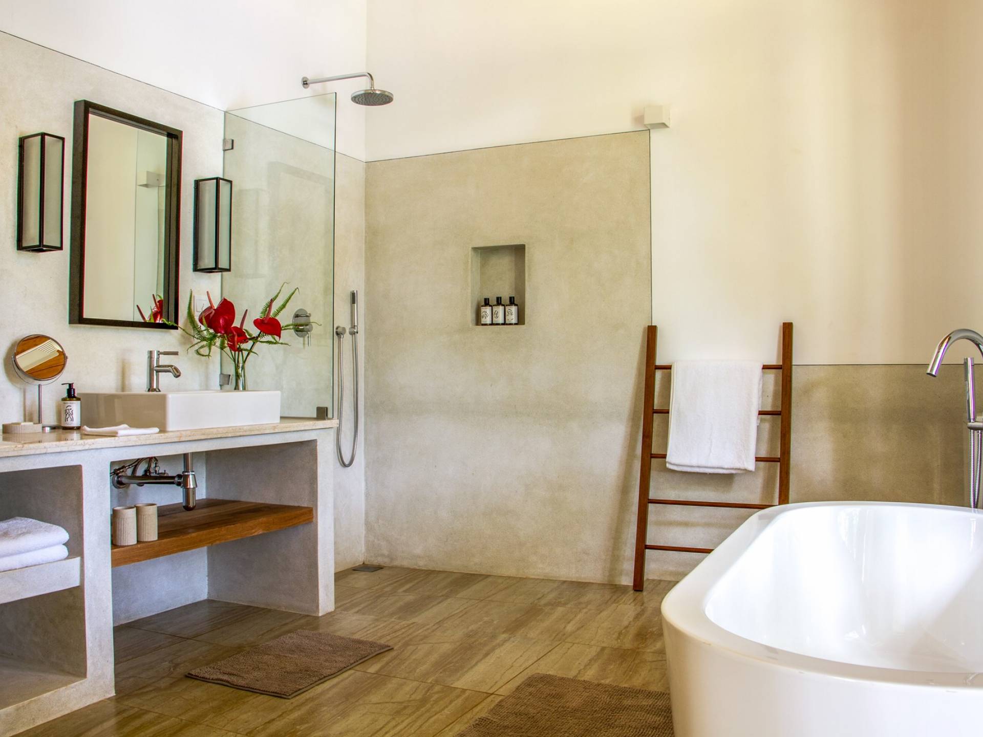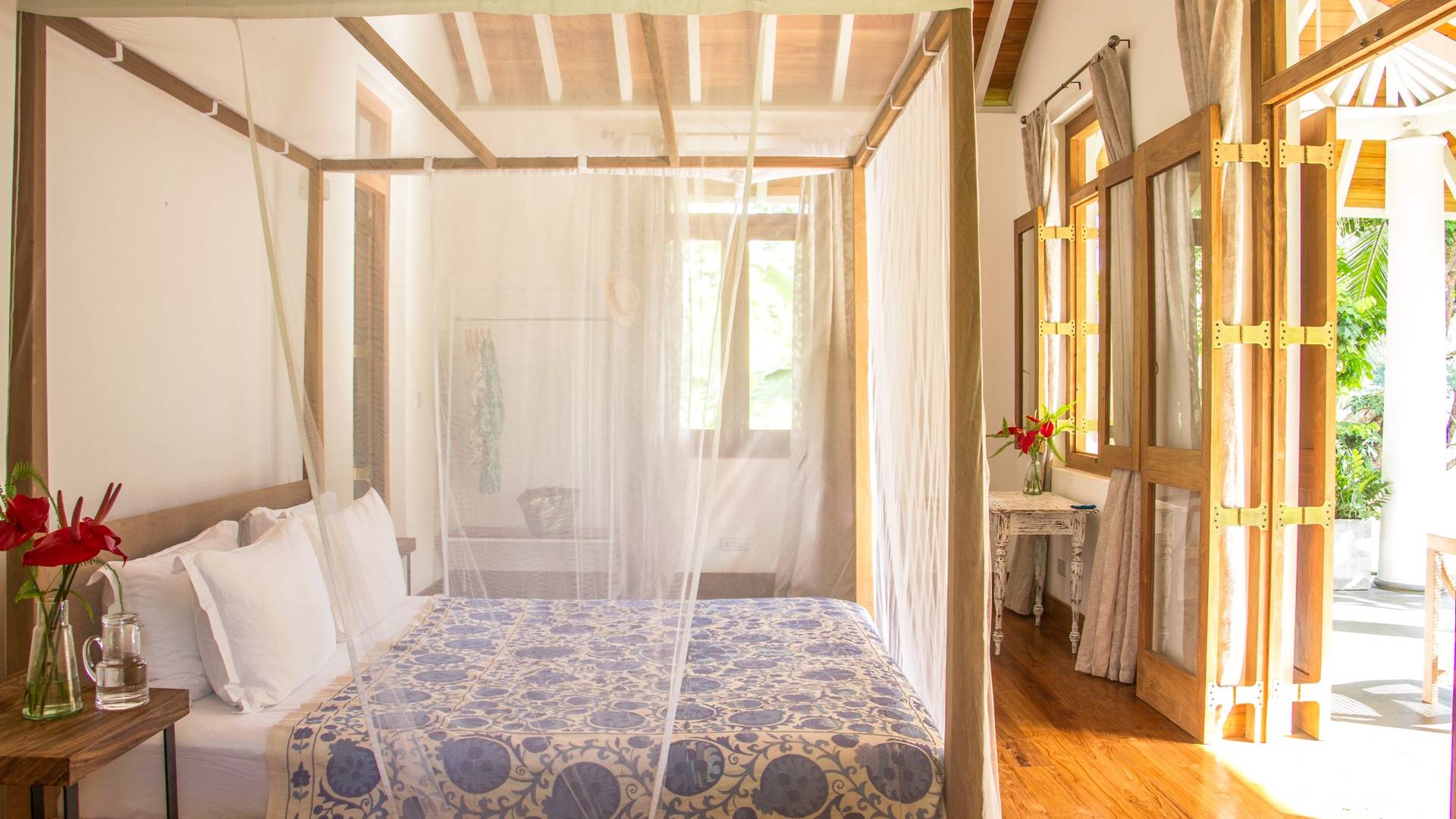 The final room, the master suite, sits beyond the twin and can either be accessed through the adjoining long walk-in wardrobe or via its own veranda entrance. A large king-sized 4-poster bed with a big en suite bathroom, double basins, a safe, and a bathtub. All of the rooms have teak floors and windows, A/C, overhead fans, mosquito nets, and en suite bathrooms with walk-in showers.