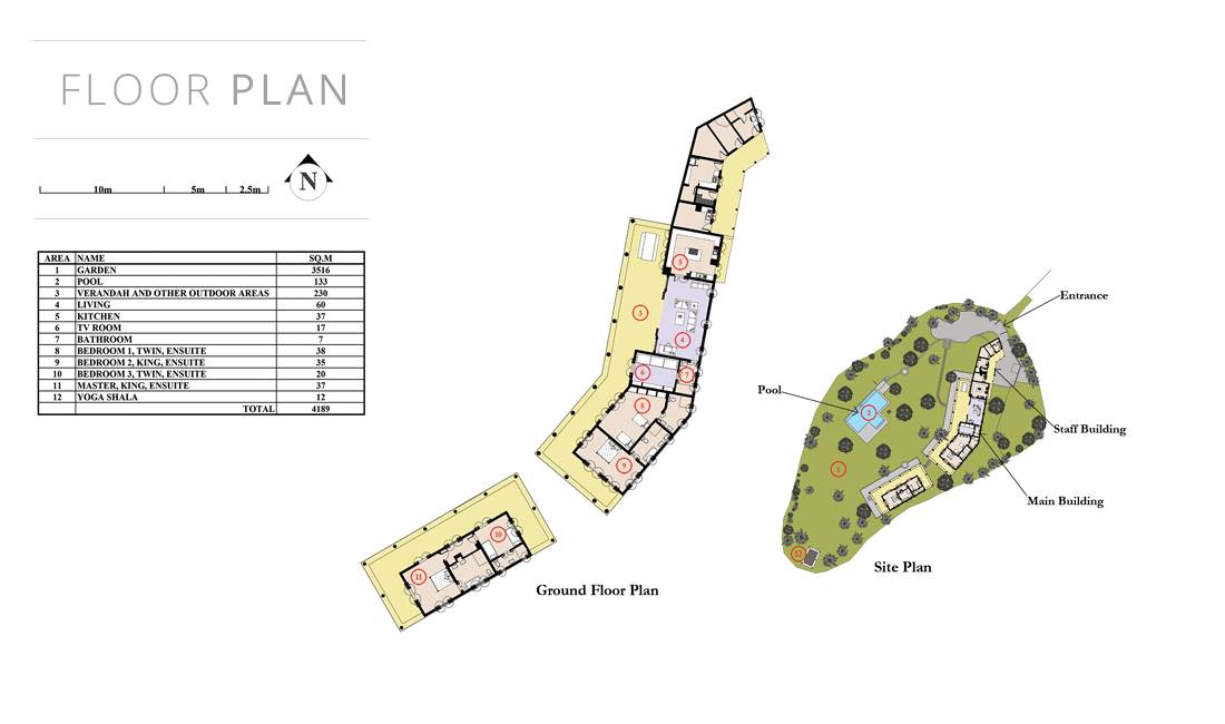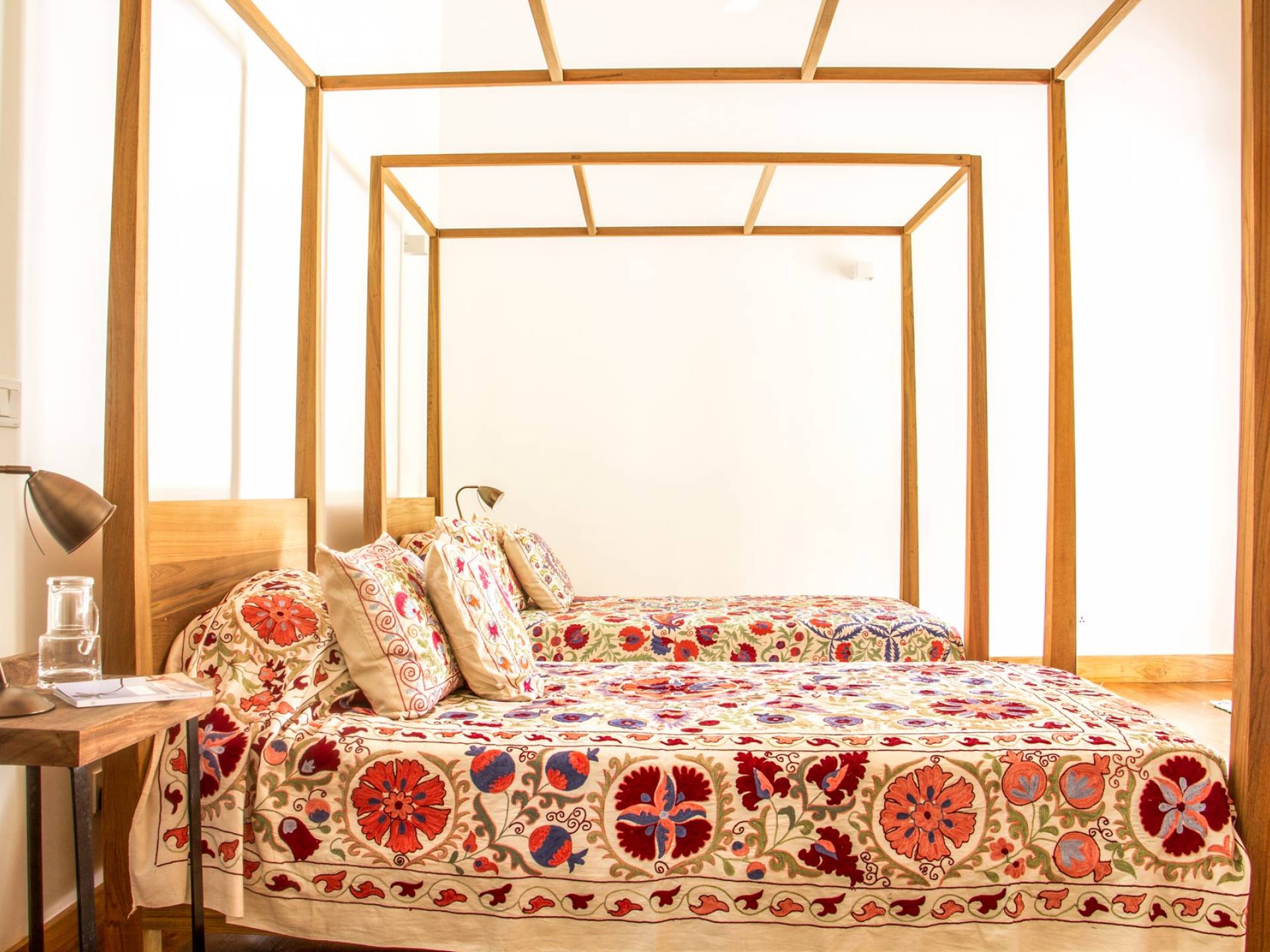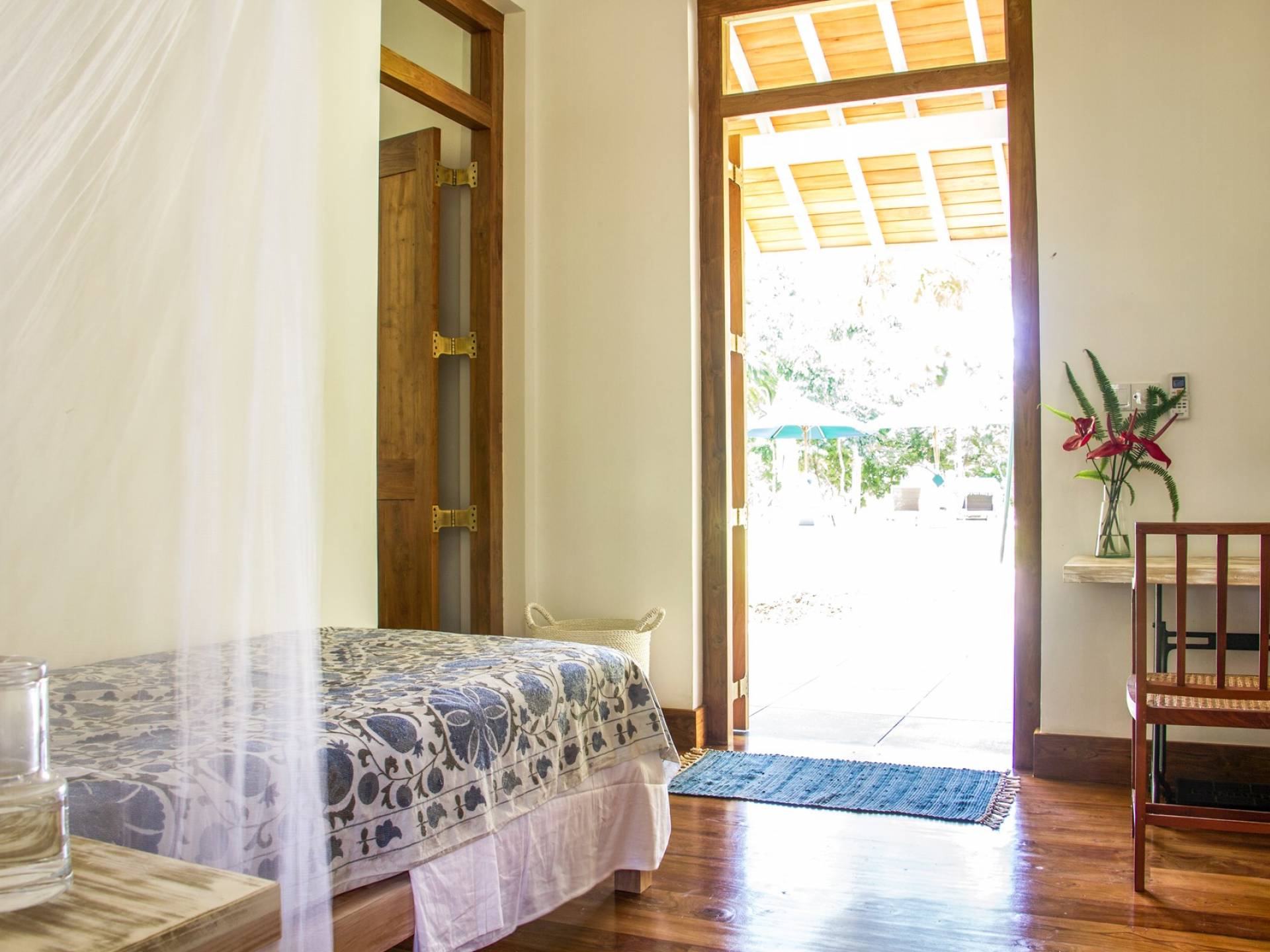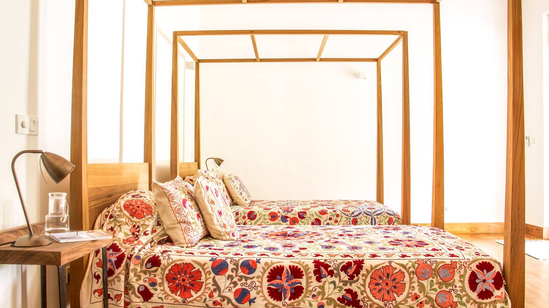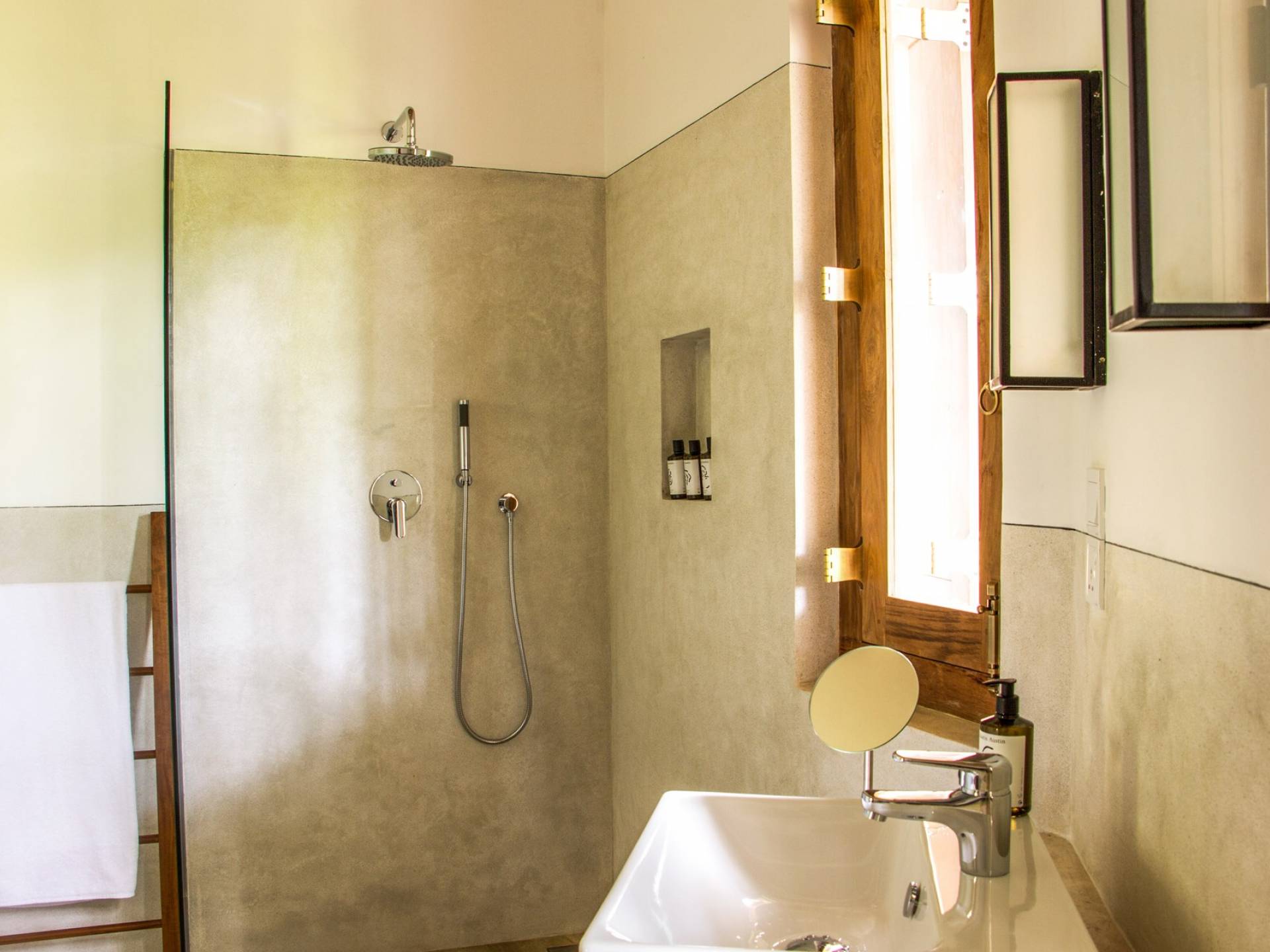 The final room, the master suite, sits beyond the twin and can either be accessed through the adjoining long walk-in wardrobe or via its own veranda entrance. A large king-sized 4-poster bed with a big en suite bathroom, double basins, a safe, and a bathtub. All of the rooms have teak floors and windows, A/C, overhead fans, mosquito nets, and en suite bathrooms with walk-in showers.