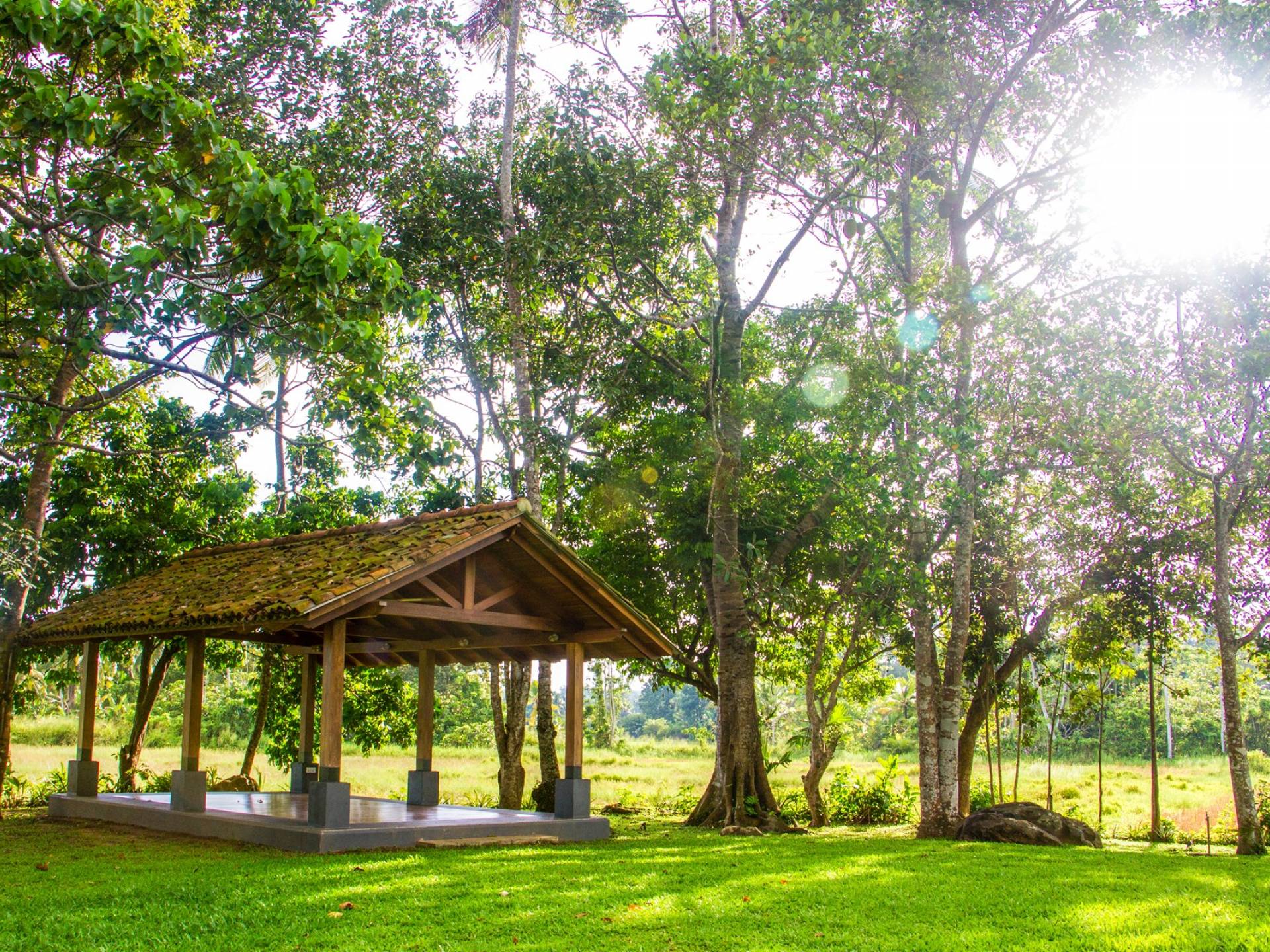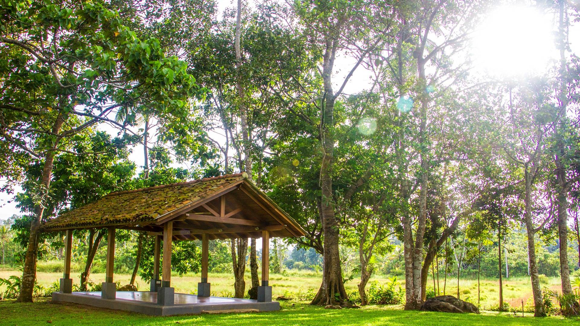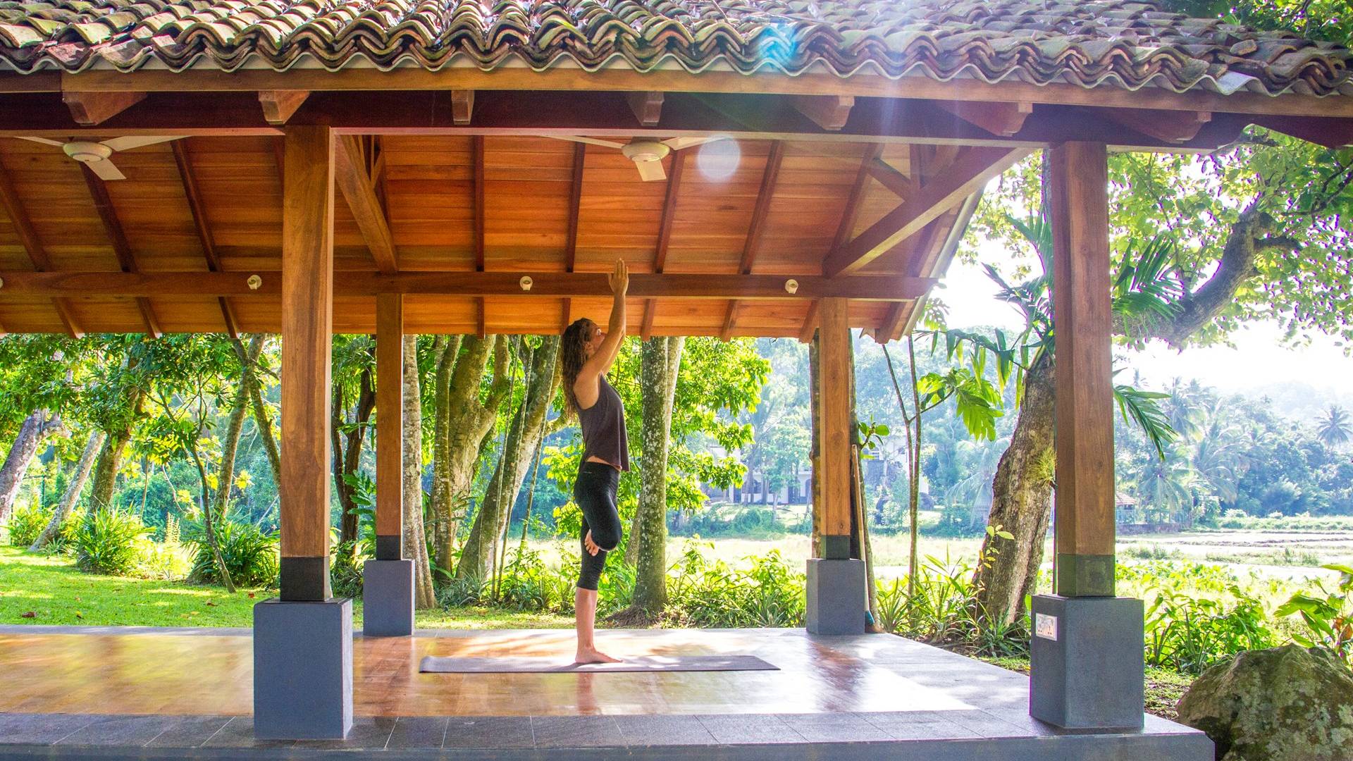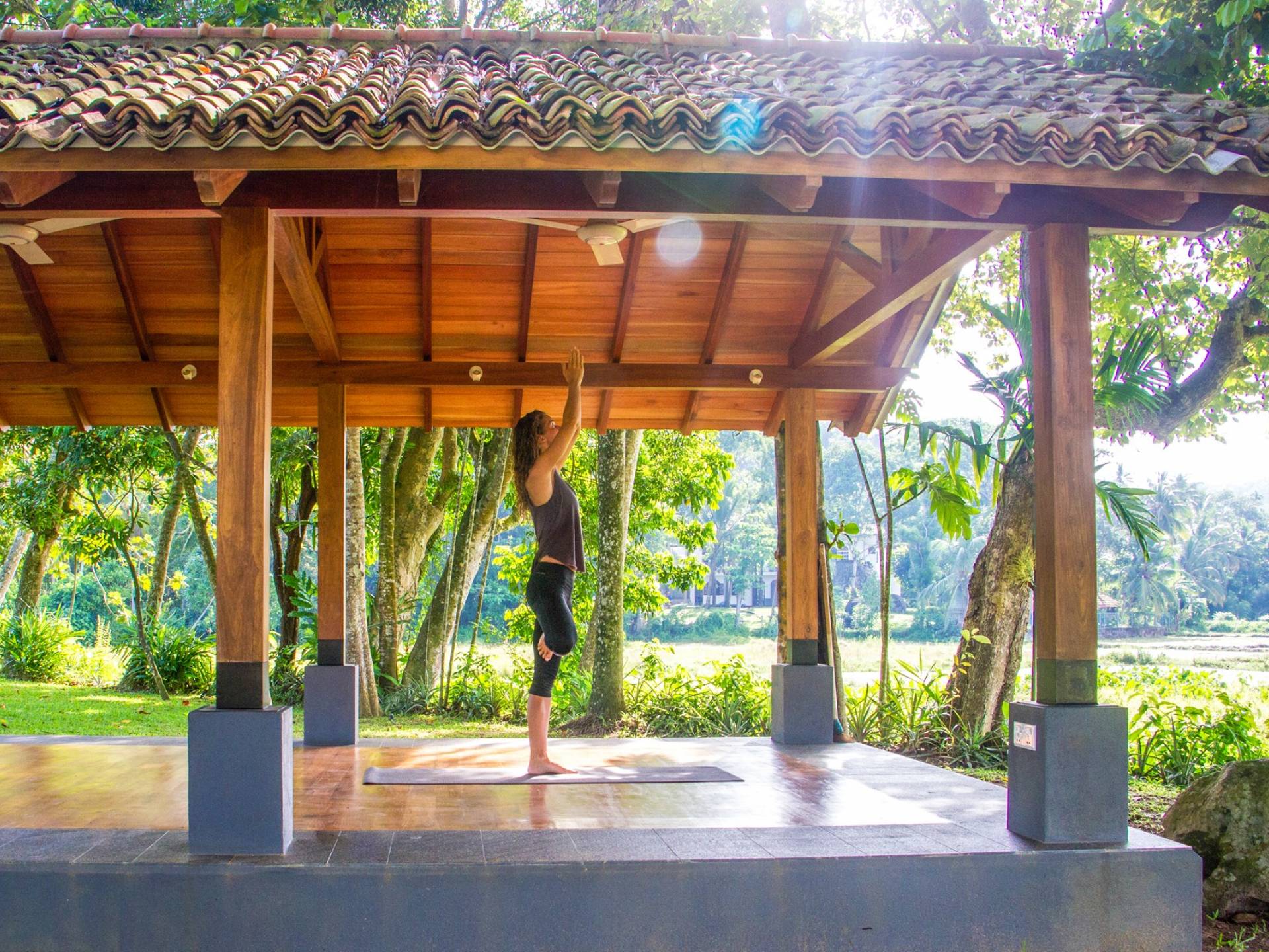 The yoga shala lies at the end of the garden boundary and boasts a 360-degree paddy field view.