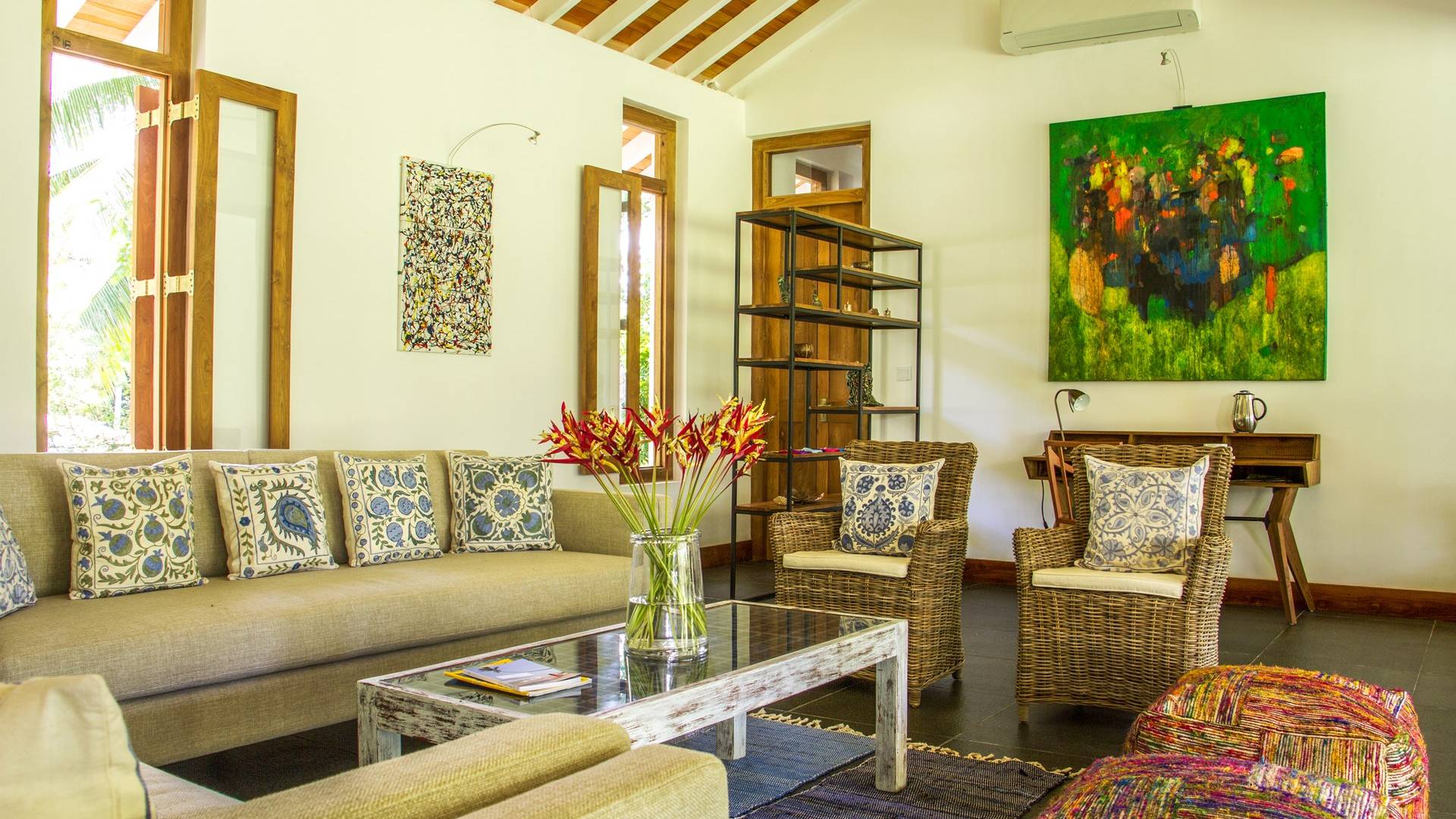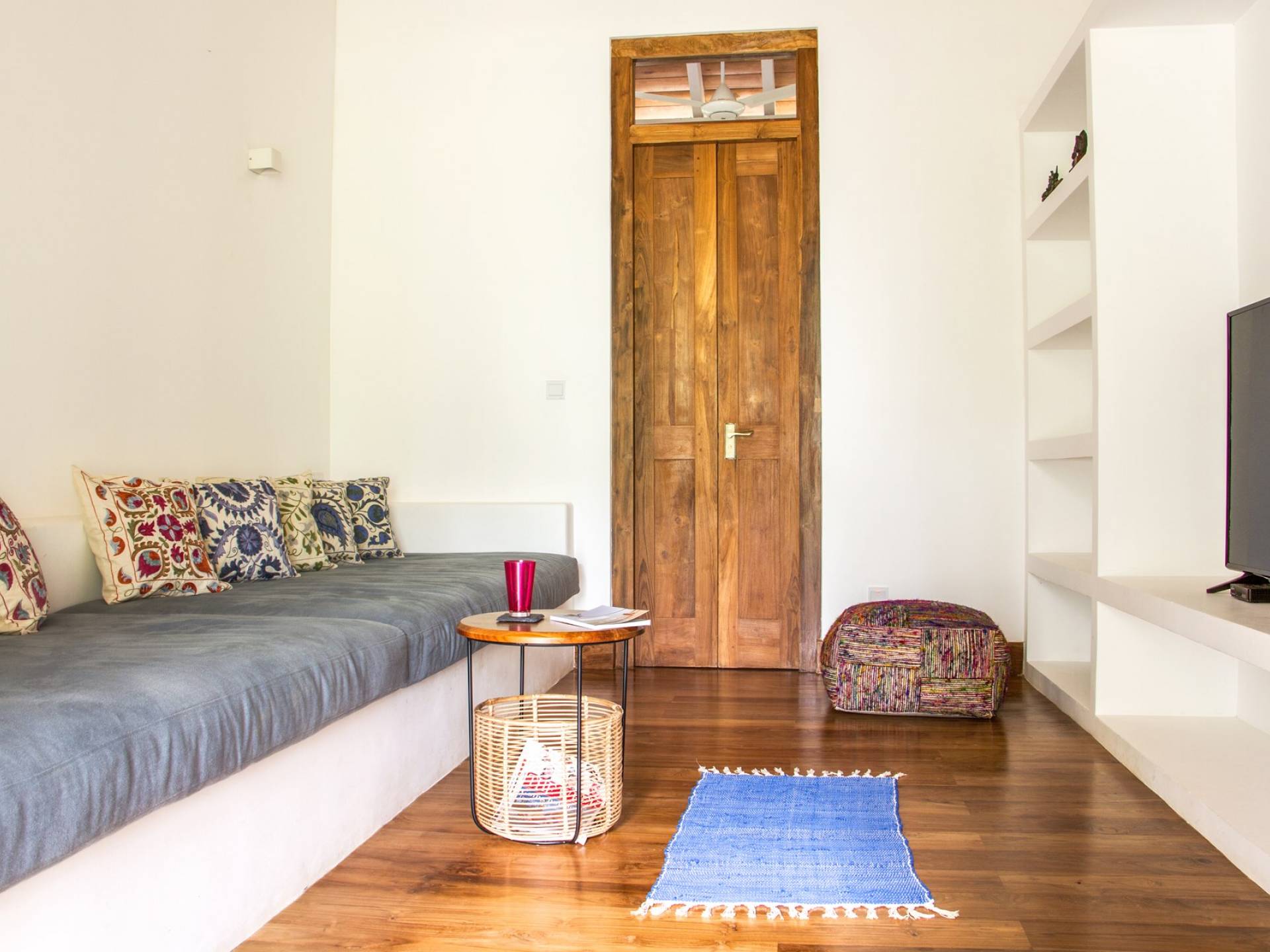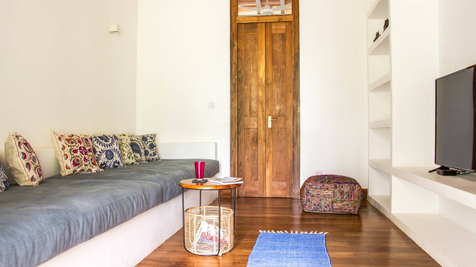 Walking onto the white colonnaded veranda, it is easy to admire the considered planning of this property and notice that all of the internal space is sealed with glass windows and well-fitted teak frames so that the rooms can be effectively cooled by A/C and overhead fans as well as minimizing on any visiting mosquitos and offering optimal light and paddy views. Beyond the veranda is the sitting room with colorful art, a scatter cushion-adorned sofa, comfortable chairs, and a dedicated desk area. Beyond the sitting room is the fully equipped and well-appointed working kitchen and on the other, an adjoining marble bathroom with a walk-in shower. The cozy yet chic TV room shares access with the bathroom and offer multi cushioned sofas, which could if necessary, double up as two children’s beds.