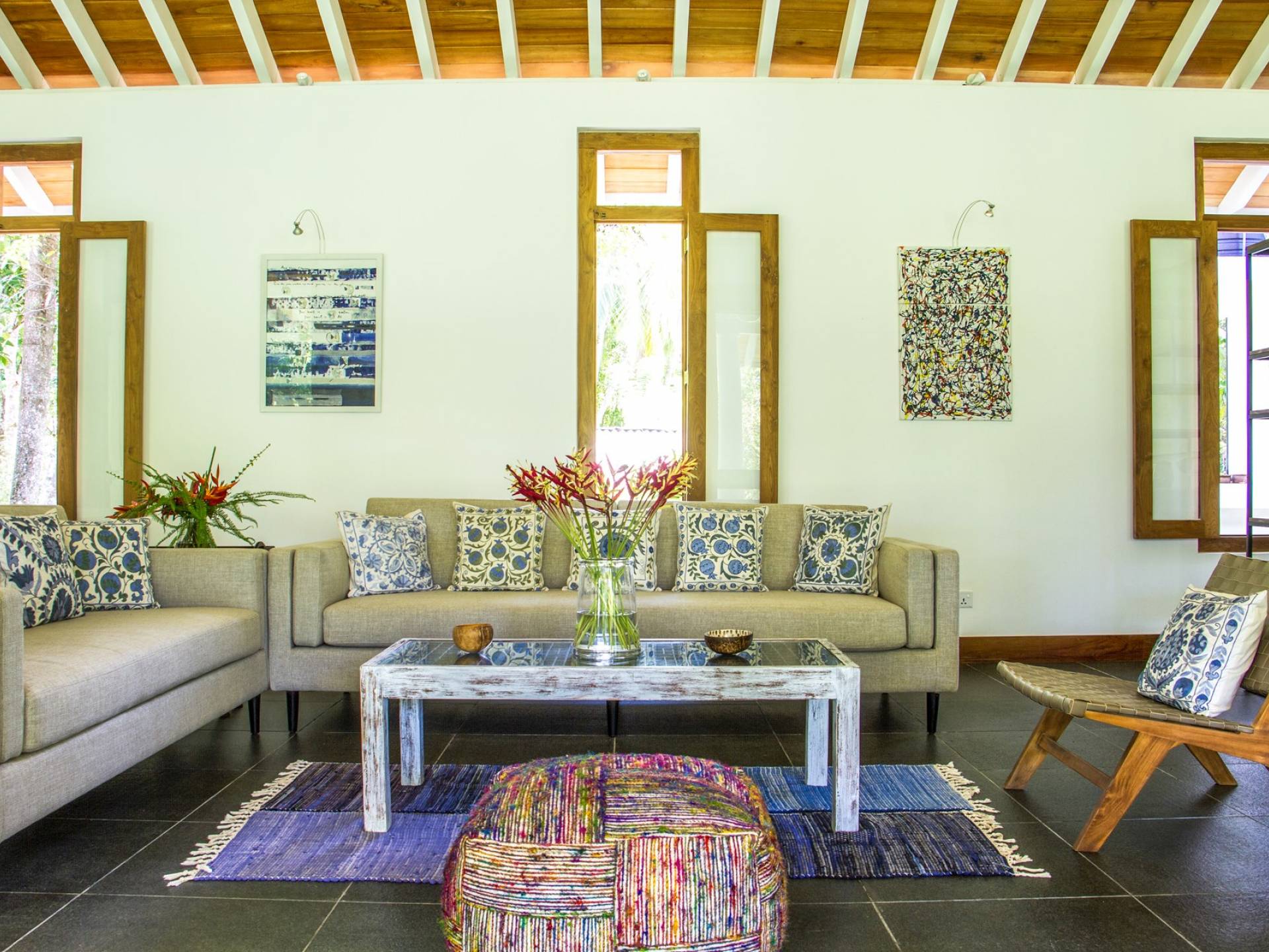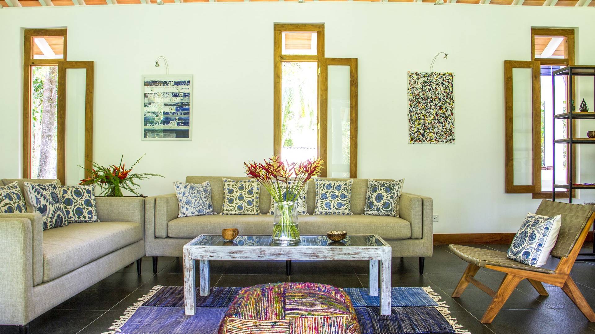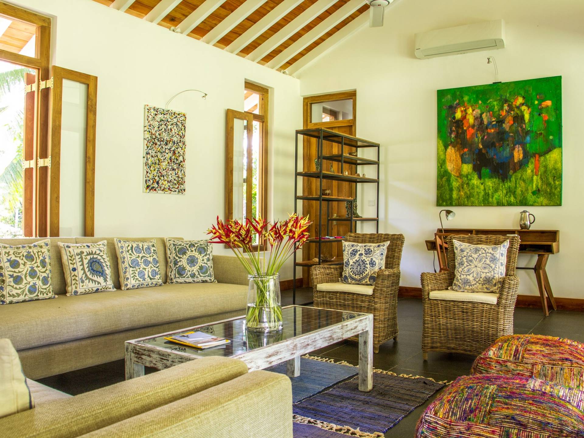 Walking onto the white colonnaded veranda, it is easy to admire the considered planning of this property and notice that all of the internal space is sealed with glass windows and well-fitted teak frames so that the rooms can be effectively cooled by A/C and overhead fans as well as minimizing on any visiting mosquitos and offering optimal light and paddy views. Beyond the veranda is the sitting room with colorful art, a scatter cushion-adorned sofa, comfortable chairs, and a dedicated desk area. Beyond the sitting room is the fully equipped and well-appointed working kitchen and on the other, an adjoining marble bathroom with a walk-in shower. The cozy yet chic TV room shares access with the bathroom and offer multi cushioned sofas, which could if necessary, double up as two children’s beds.