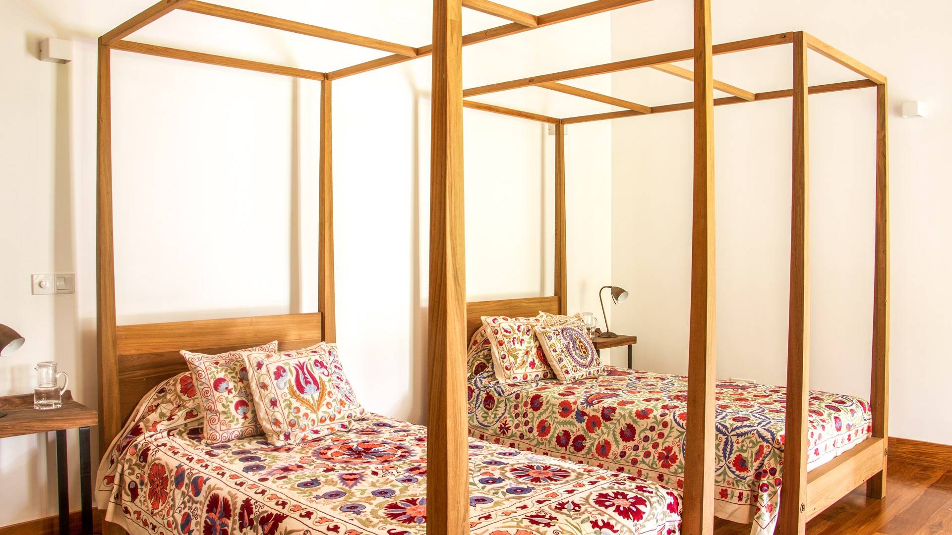 Next door is the first bedroom, a large spacious teak floored twin with two single 4 poster beds, great cupboard space, a long dress mirror, and big windows. It has an en suite bathroom with twin basins, extra storage space, and a safe.