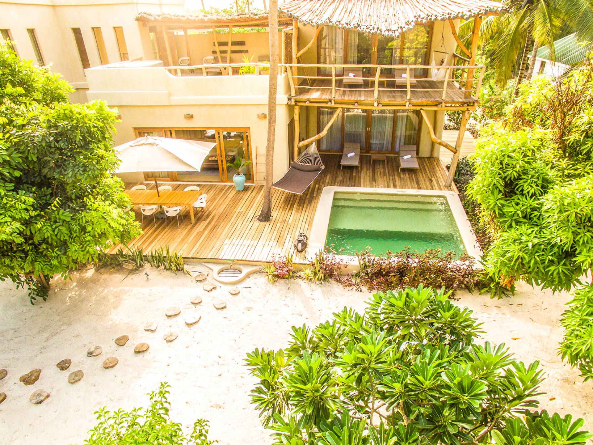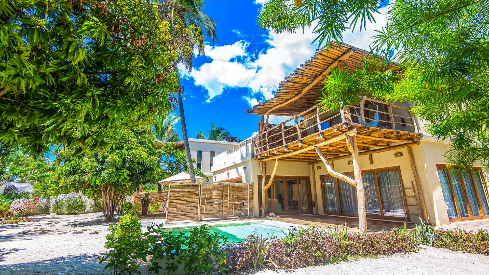 Zanzibar White Sand Luxury Villas & Spa includes 11 villas (Beachfront one-bedroom villas, Family two-bedroom villas, and Presidential five-bedroom villa) and Cinnamon rooms facing the seafront of Paje beach and spread over 4 hectares (10 acres) of a tropical garden. The resort includes also 3 Cinnamon rooms, an A-la-carte restaurant, a beach restaurant serving lunch, and 3 bars located in the different areas of the resort (lounge bar, beach bar, rooftop champagne bar). For day activities, a watersports and kitesurfing center, large swimming pools, an outdoor fitness center, children playground, and a spa including couple of treatment rooms will ensure radiant days.