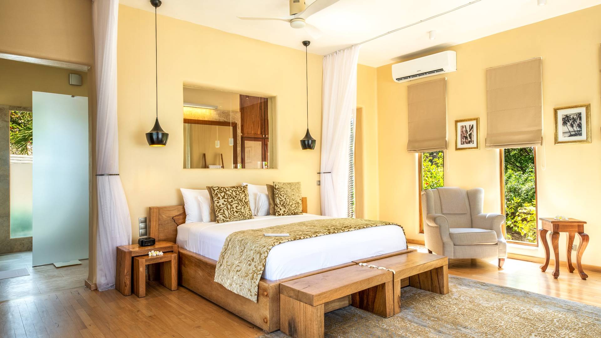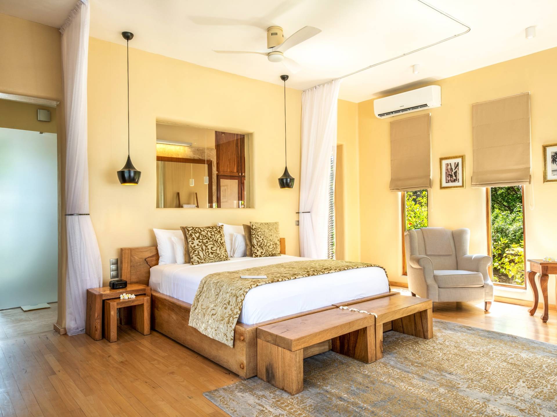 The Deluxe family room is composed of two rooms sharing one bathroom: one master room with King size bed and a second with 2 single beds. The room additionally has a private room entrance as well as a large private plunge pool. The Deluxe rooms are individual rooms located within the Presidential Luxury Villa. Guests staying in these rooms have access to the lavish rooms while sharing common villa amenities such as the villa entrance, lounge, and kitchen.