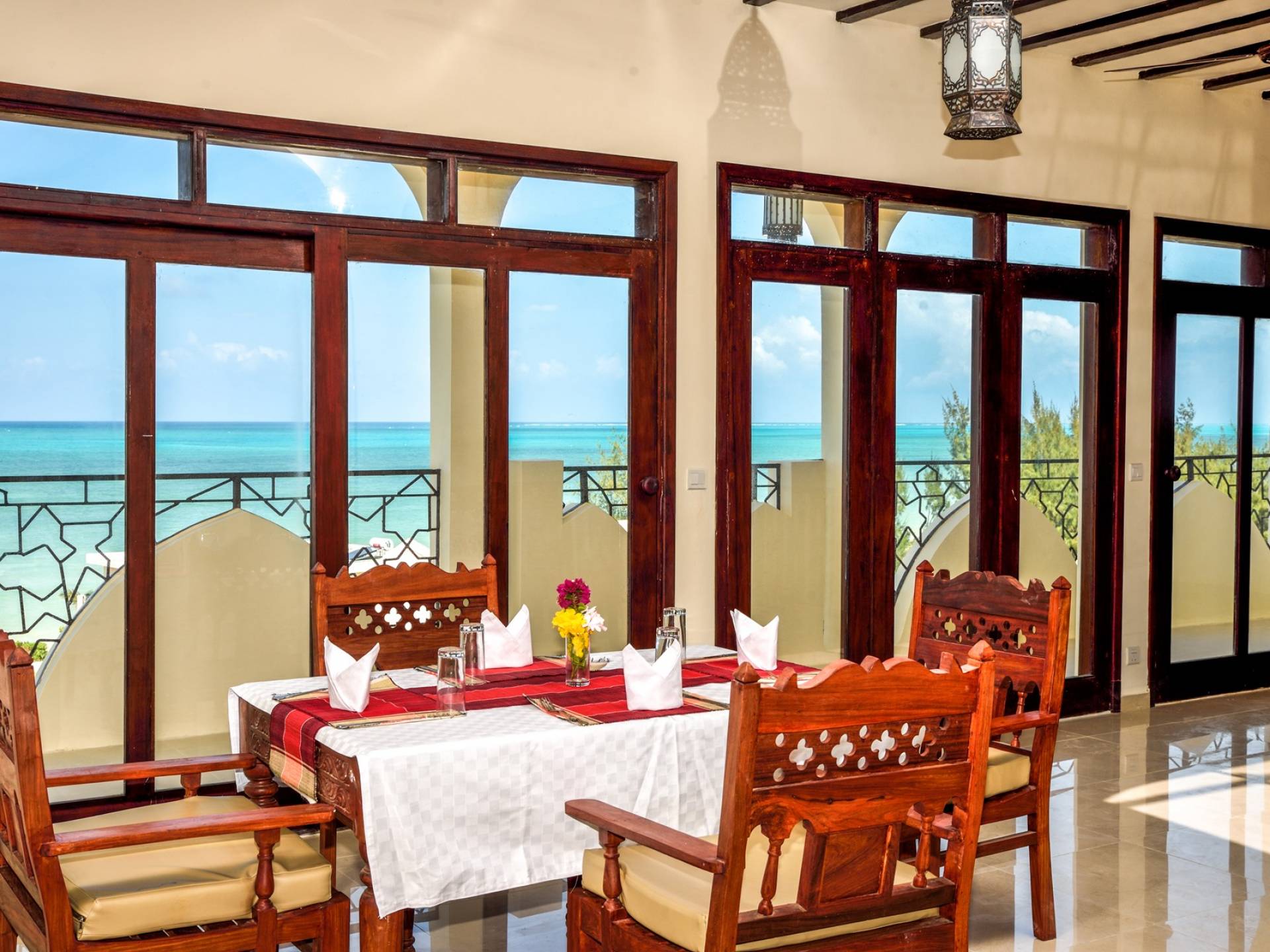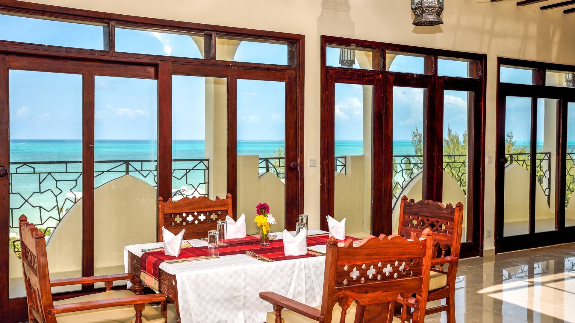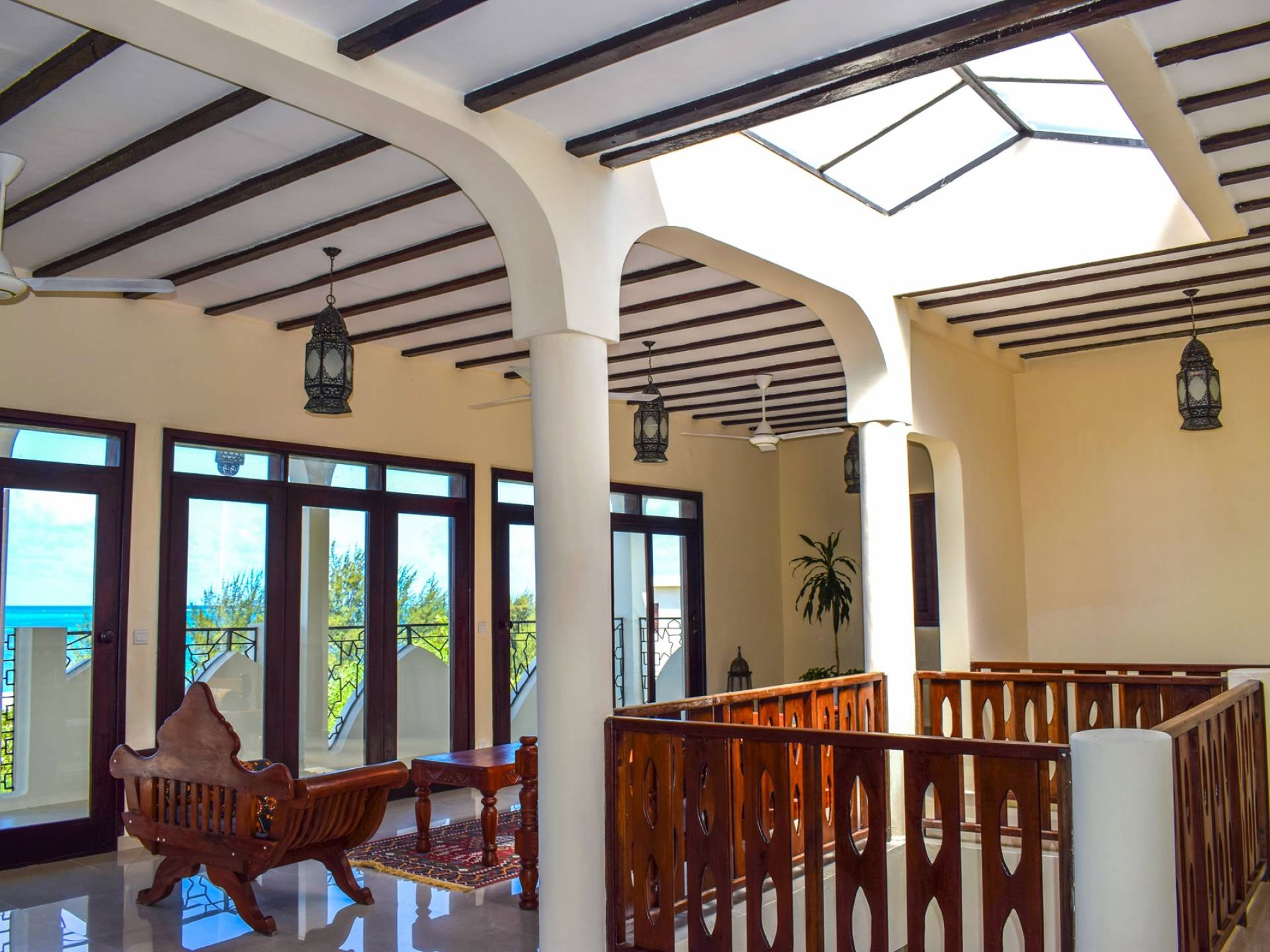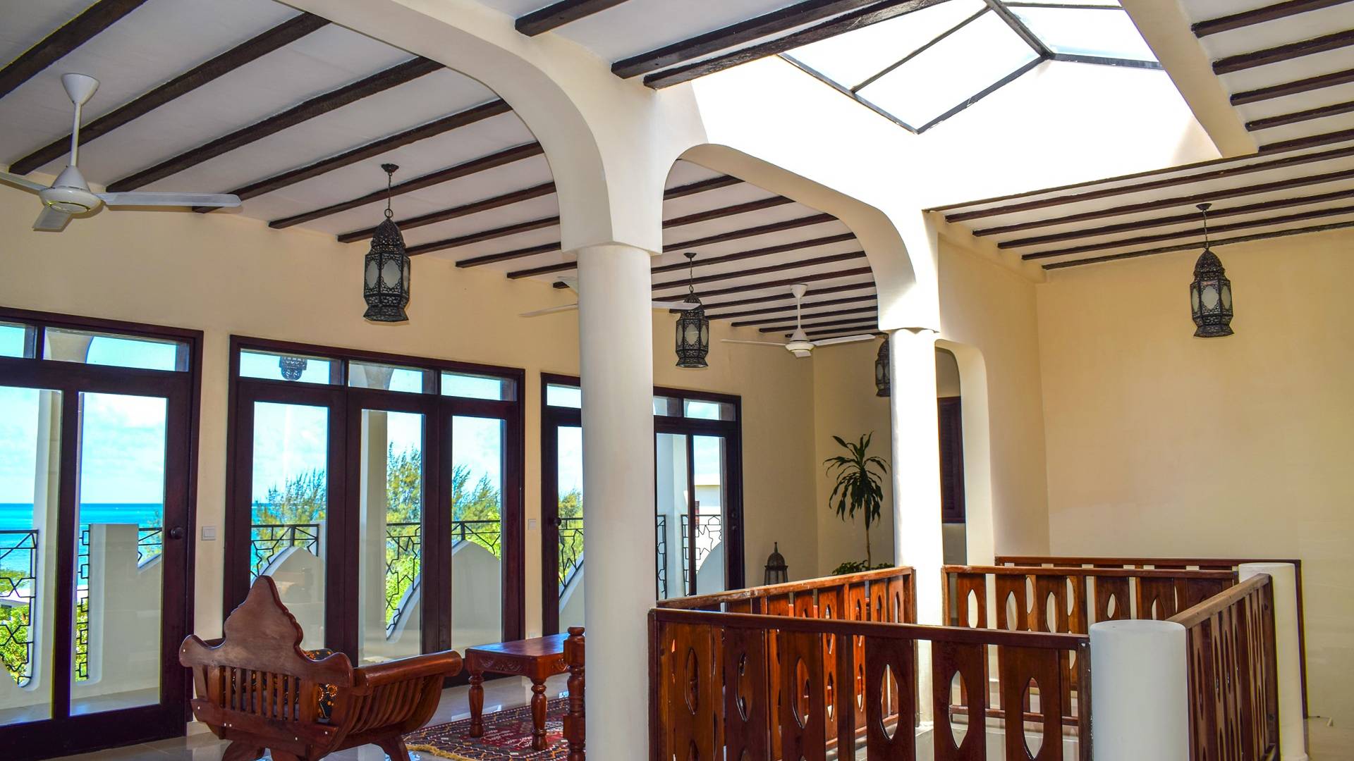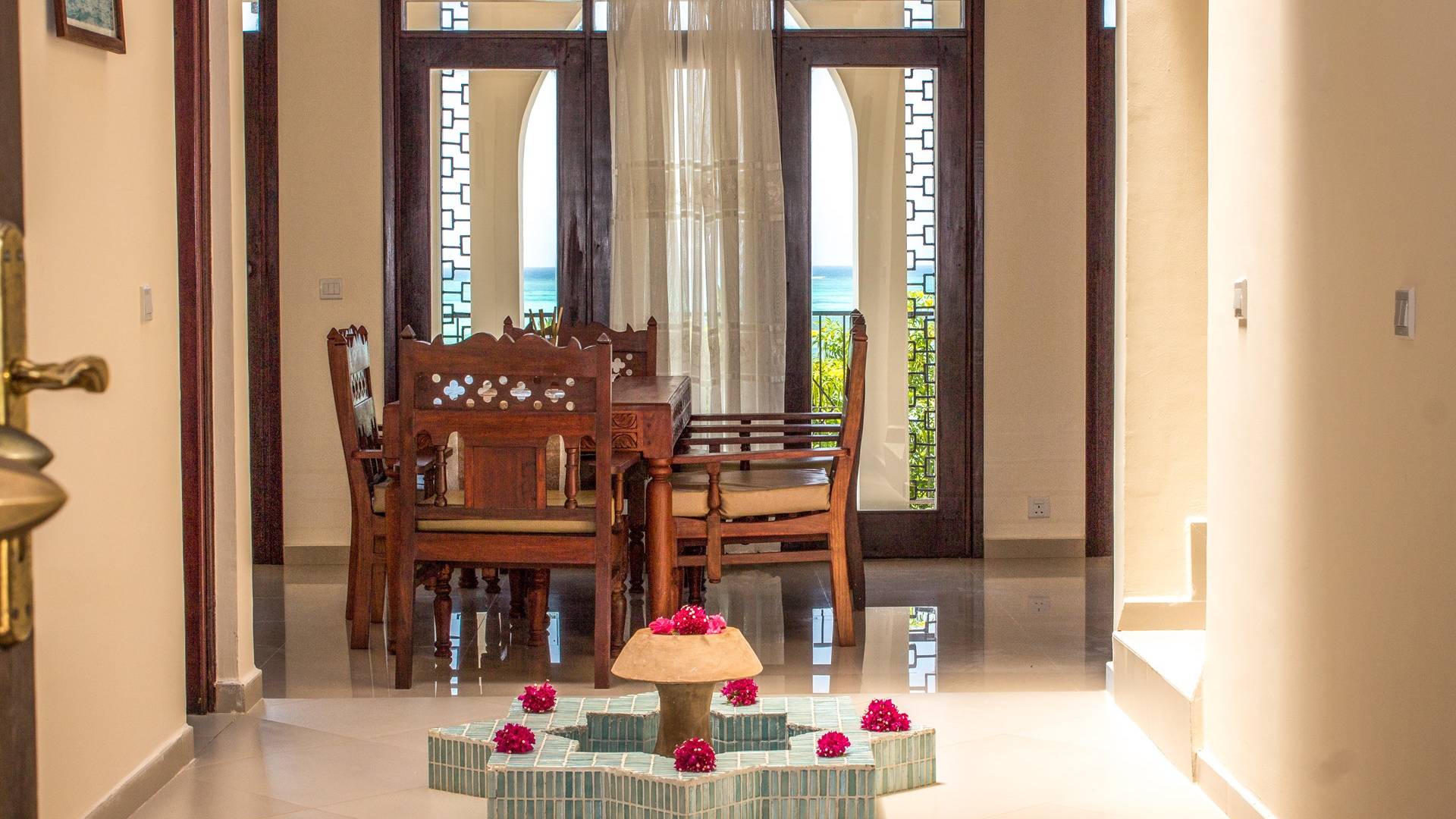 Serenity Ocean View Villa showcases an exotic blend of Moorish and Maghrebi-Andalusian-style features, from stunning cusped arches, heavy-beamed high ceilings and spectacular skylights, married with finely-crafted and traditional Zanzibari wooden doors and windows. Designed by renowned Austrian architect Rupert Weber, the villa is every bit as remarkable as its picturesque natural surroundings.