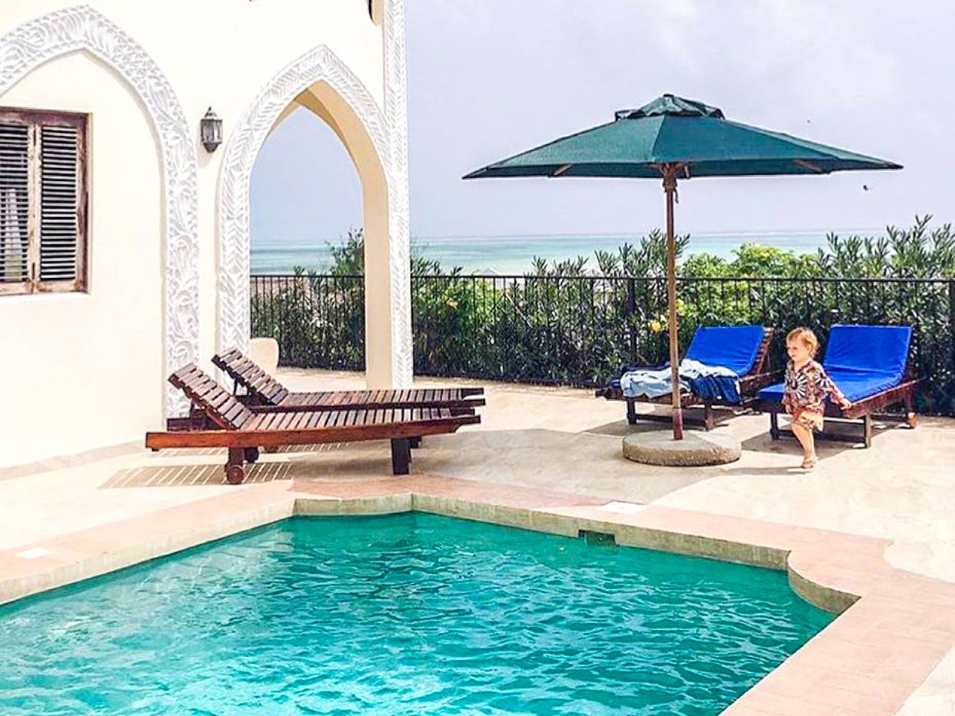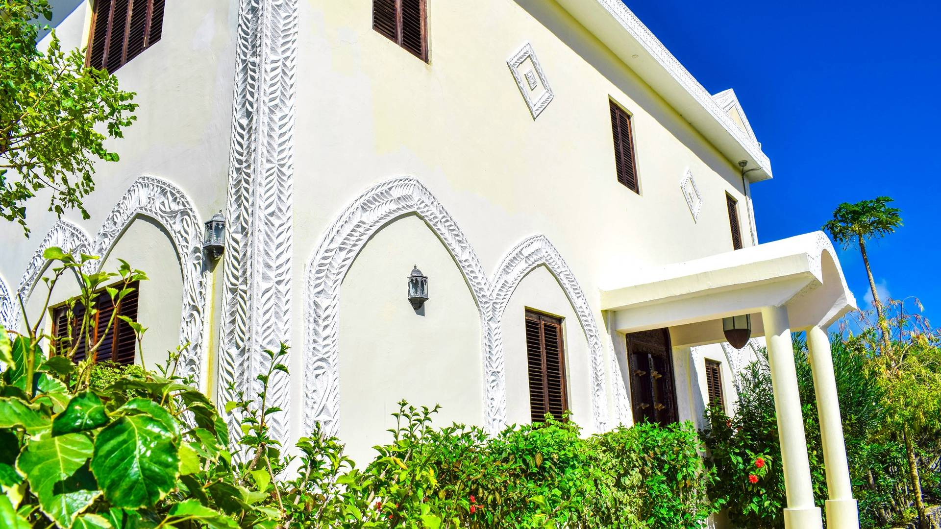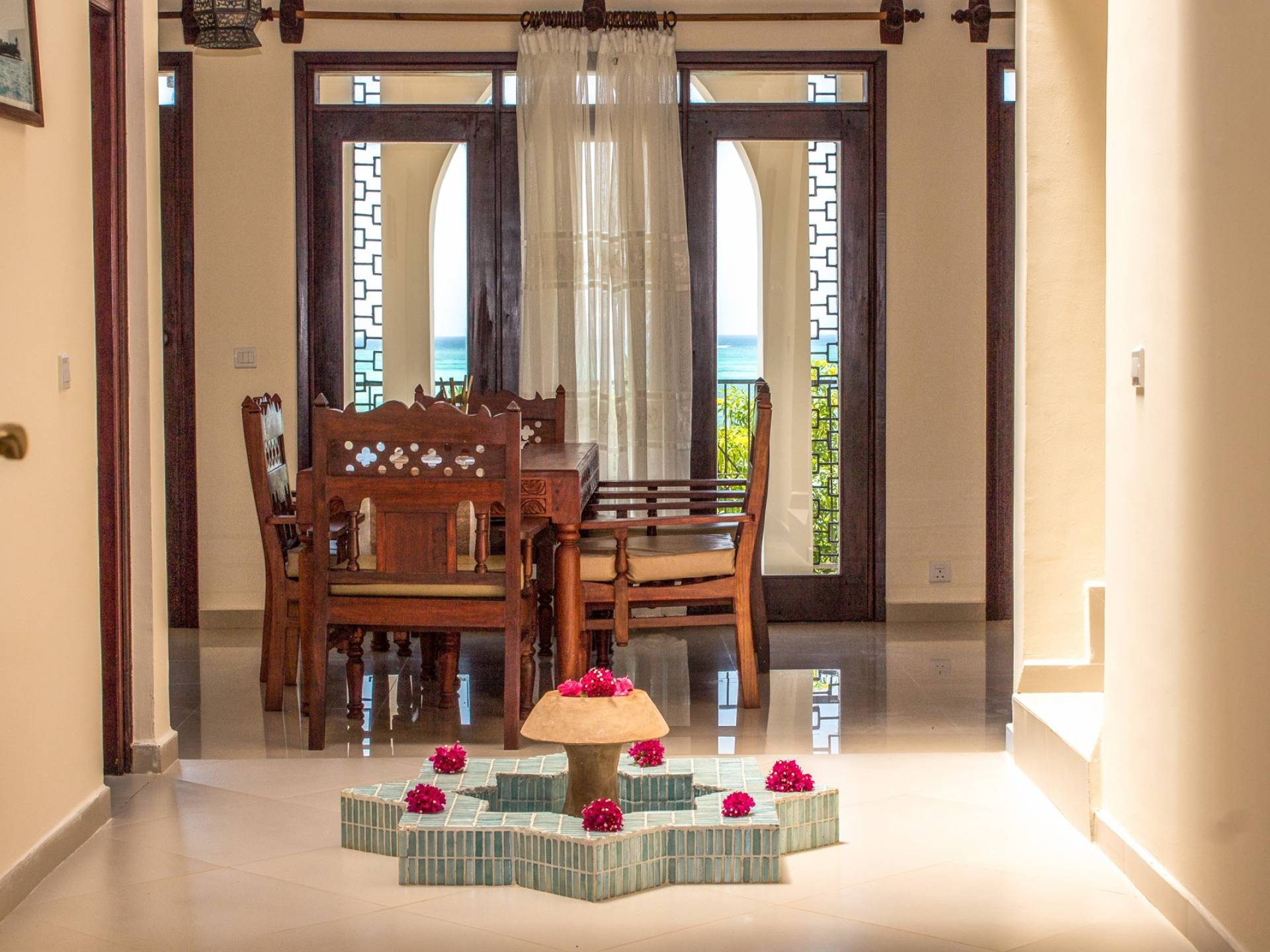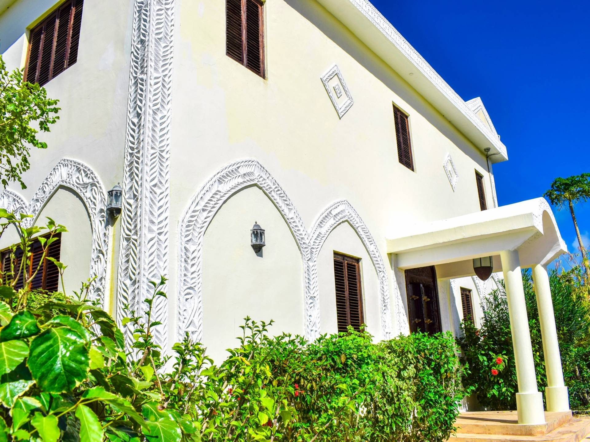 Serenity Ocean View Villa showcases an exotic blend of Moorish and Maghrebi-Andalusian-style features, from stunning cusped arches, heavy-beamed high ceilings and spectacular skylights, married with finely-crafted and traditional Zanzibari wooden doors and windows. Designed by renowned Austrian architect Rupert Weber, the villa is every bit as remarkable as its picturesque natural surroundings.