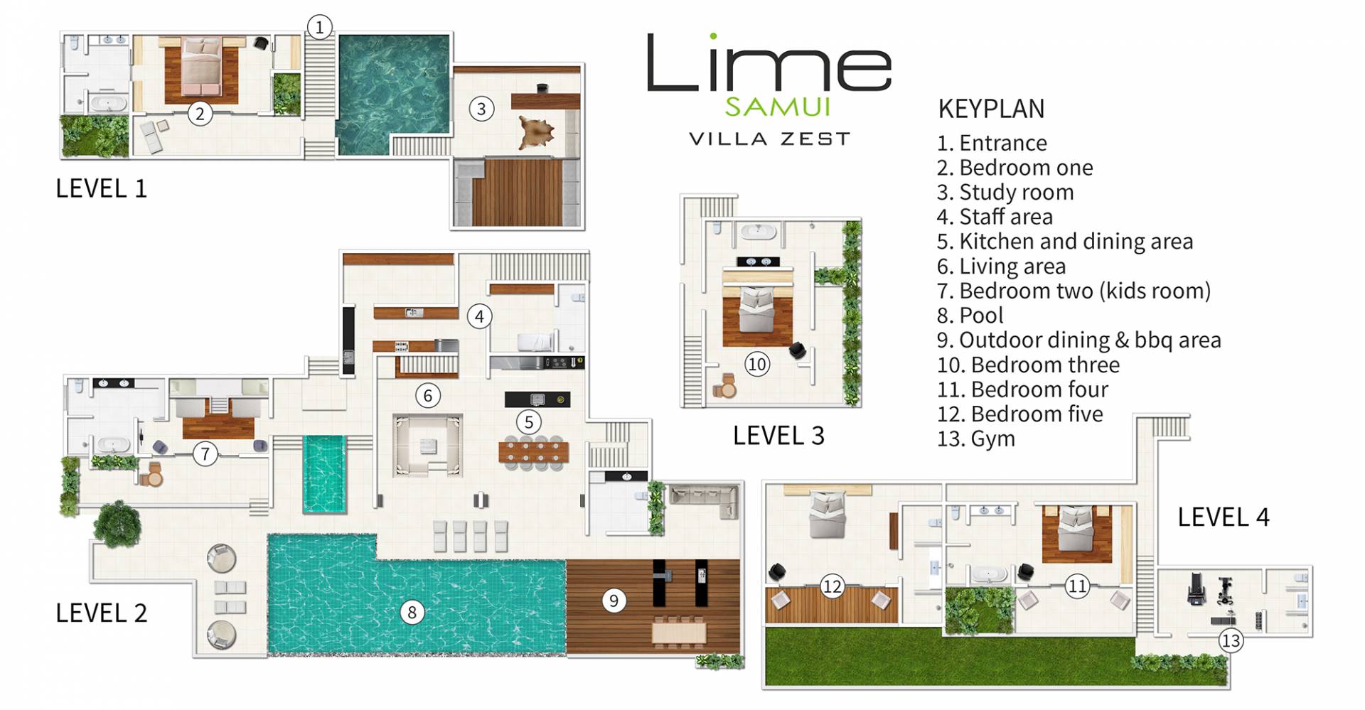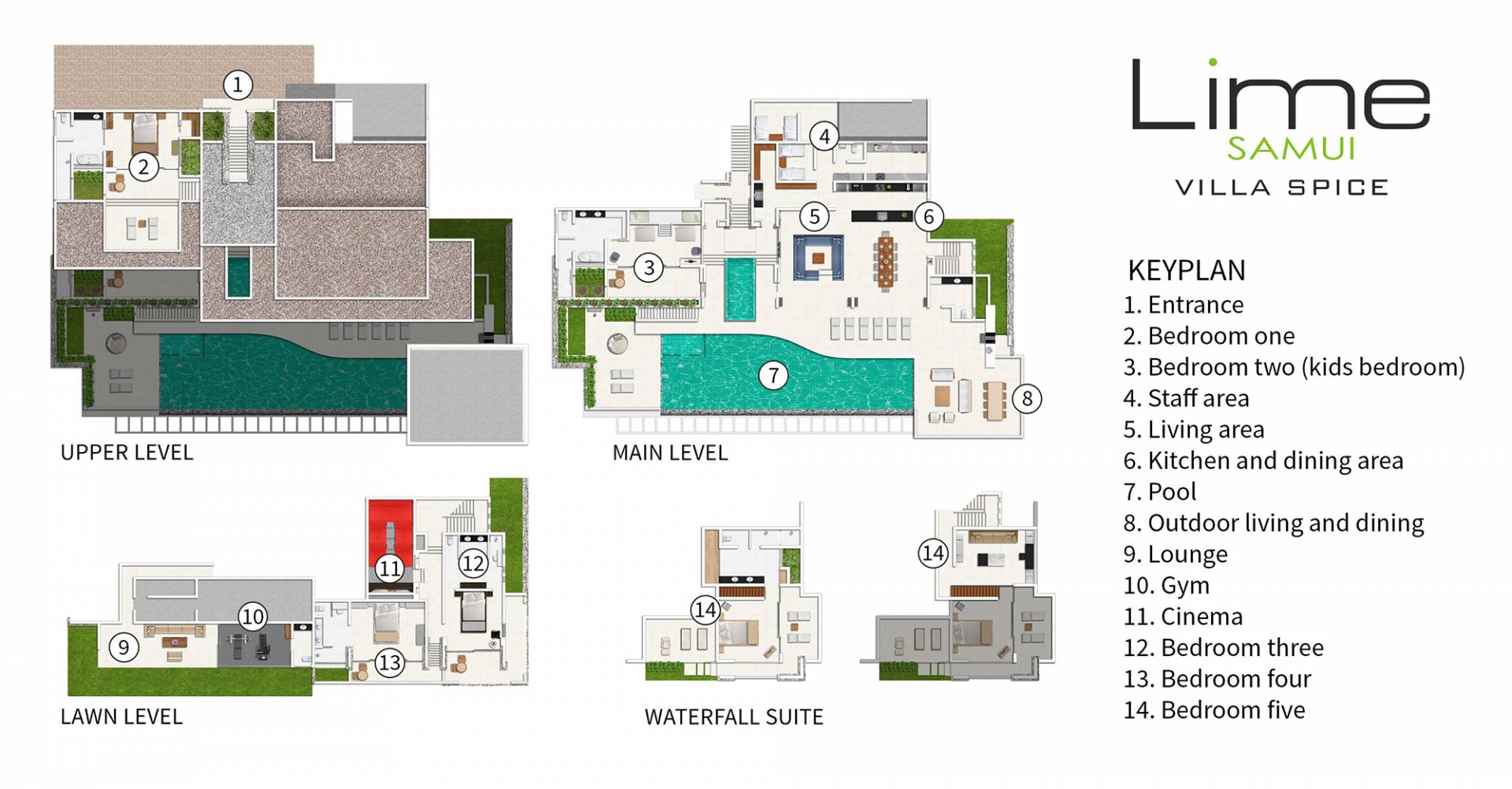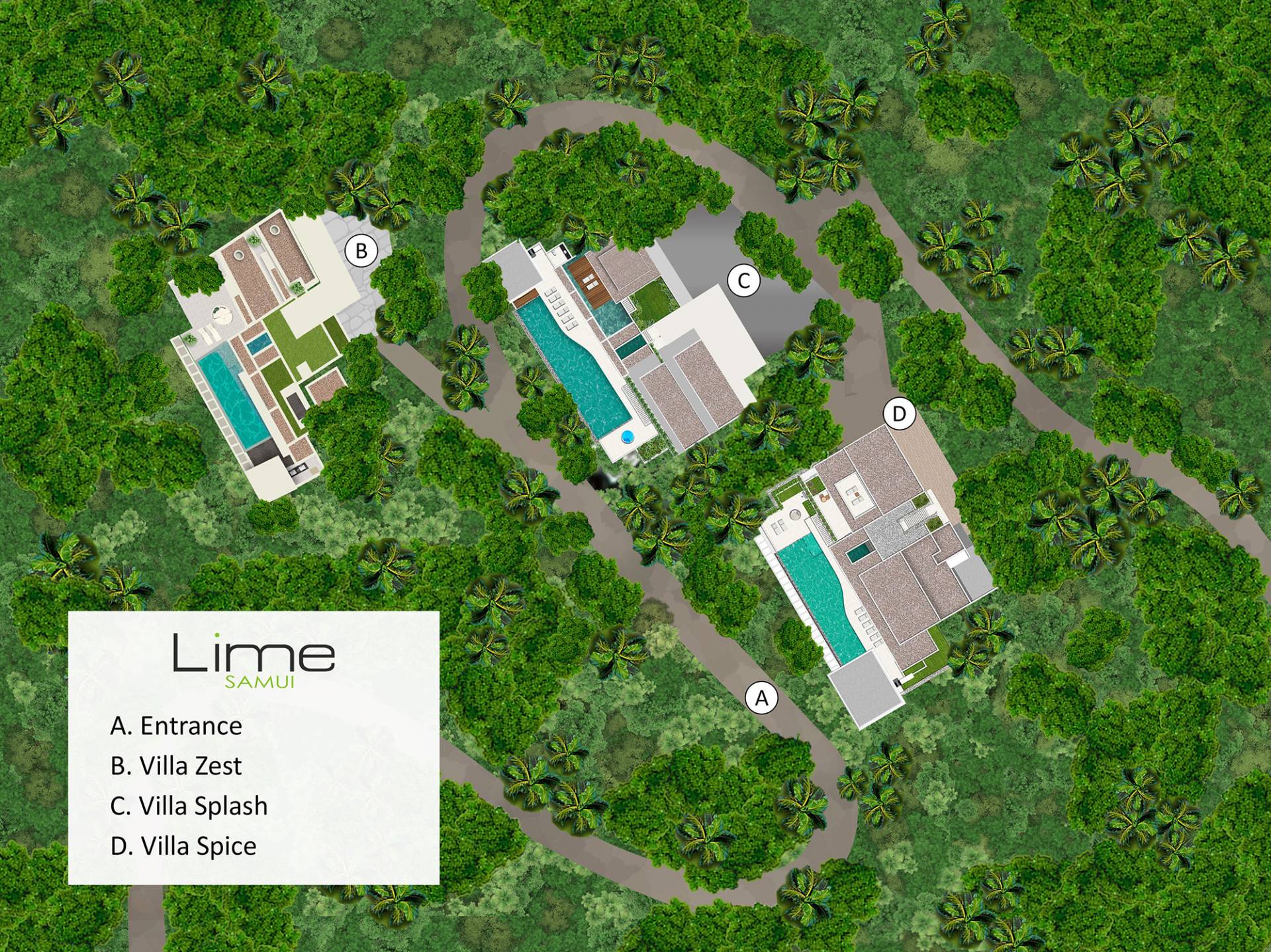 Lime Samui Estate is a luxury villa complex with 15 bedrooms and 3 private pools. Lime Samui Estate consists of three villas magnificent villas, Villa Splash, Villa Spice, and Villa Zest. The Lime Samui Estate is great for friends or families looking to spend some quality time together in their own complete privacy. The luxury villa complex can host up to 44 guests.