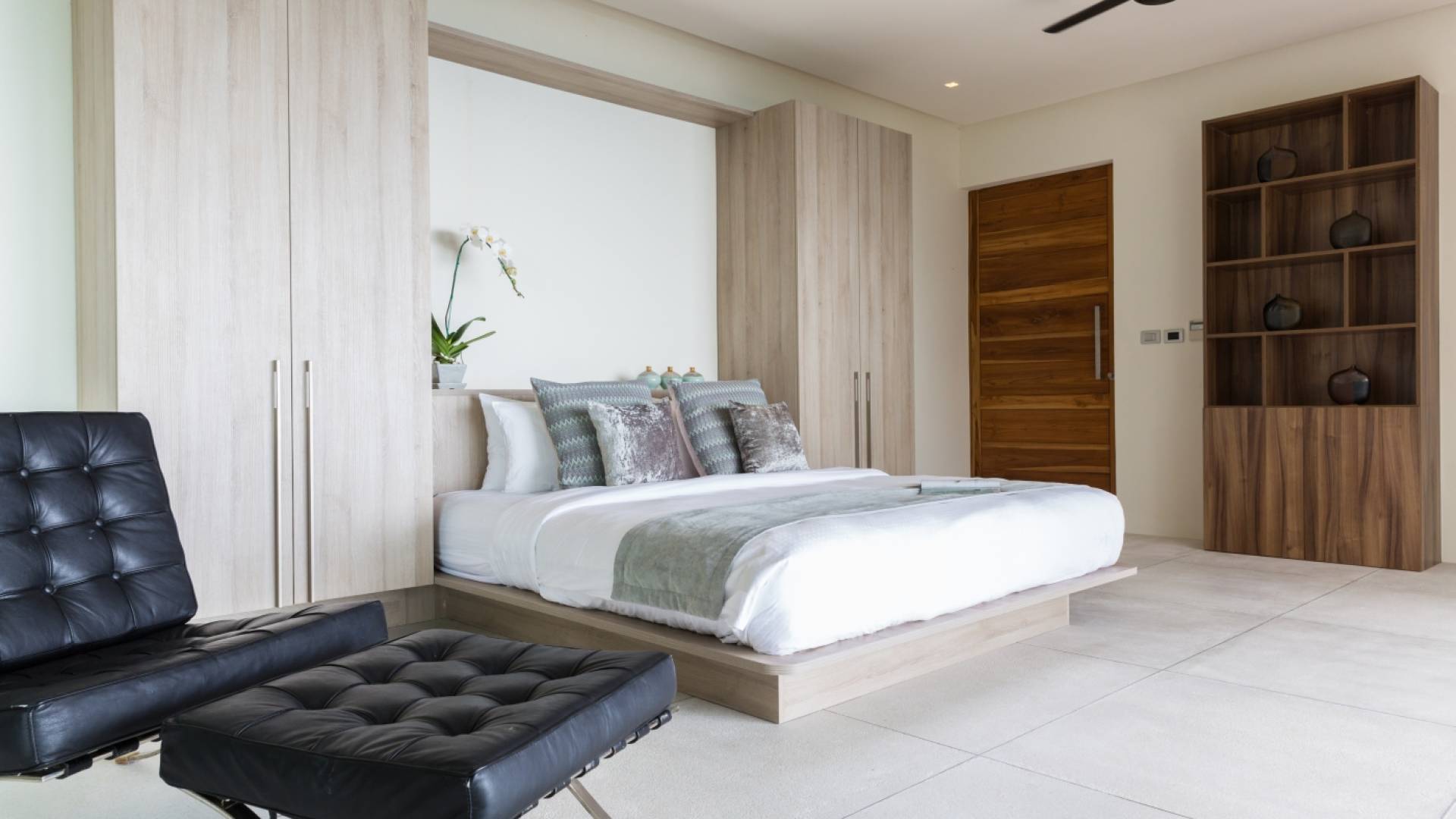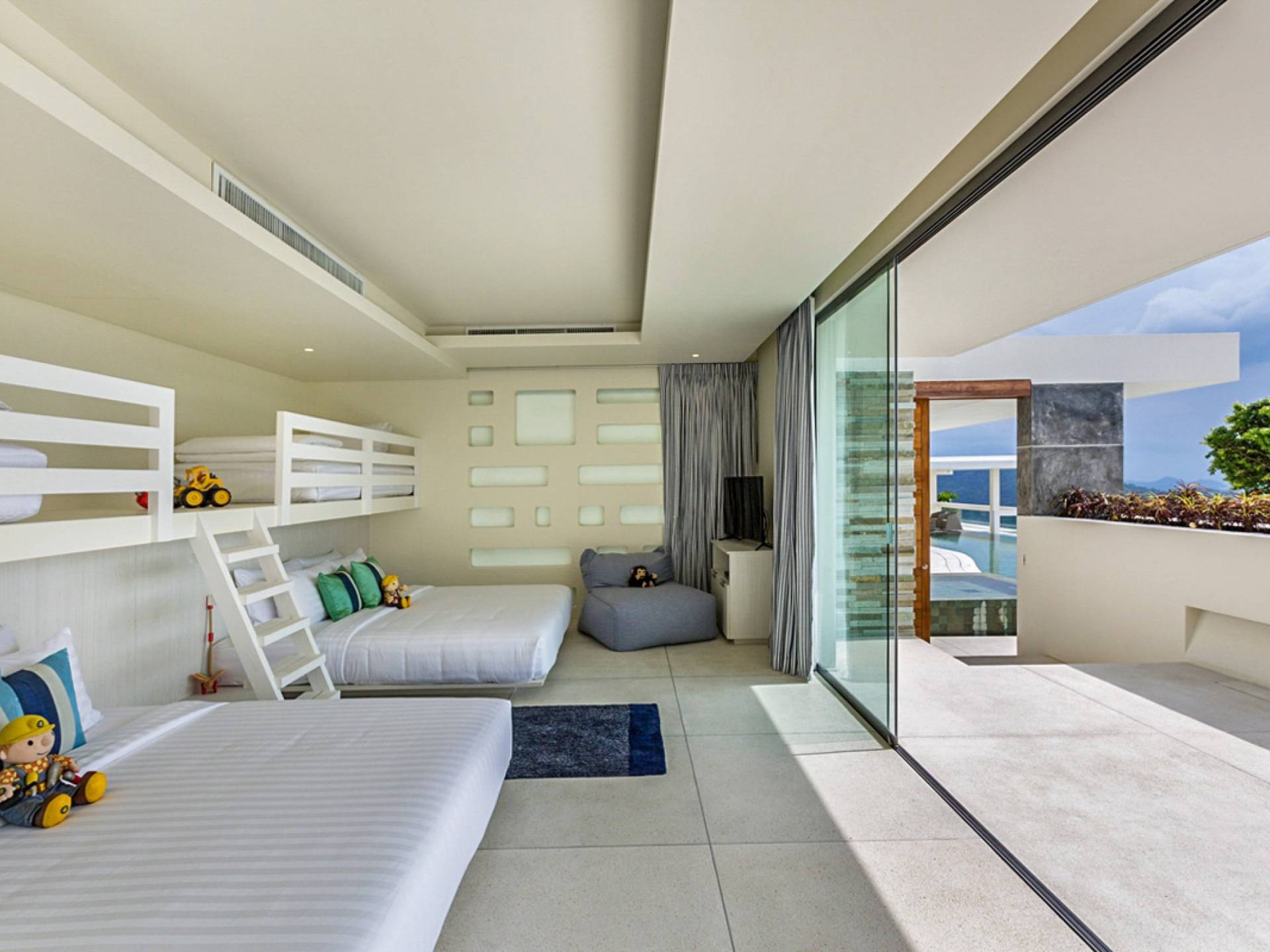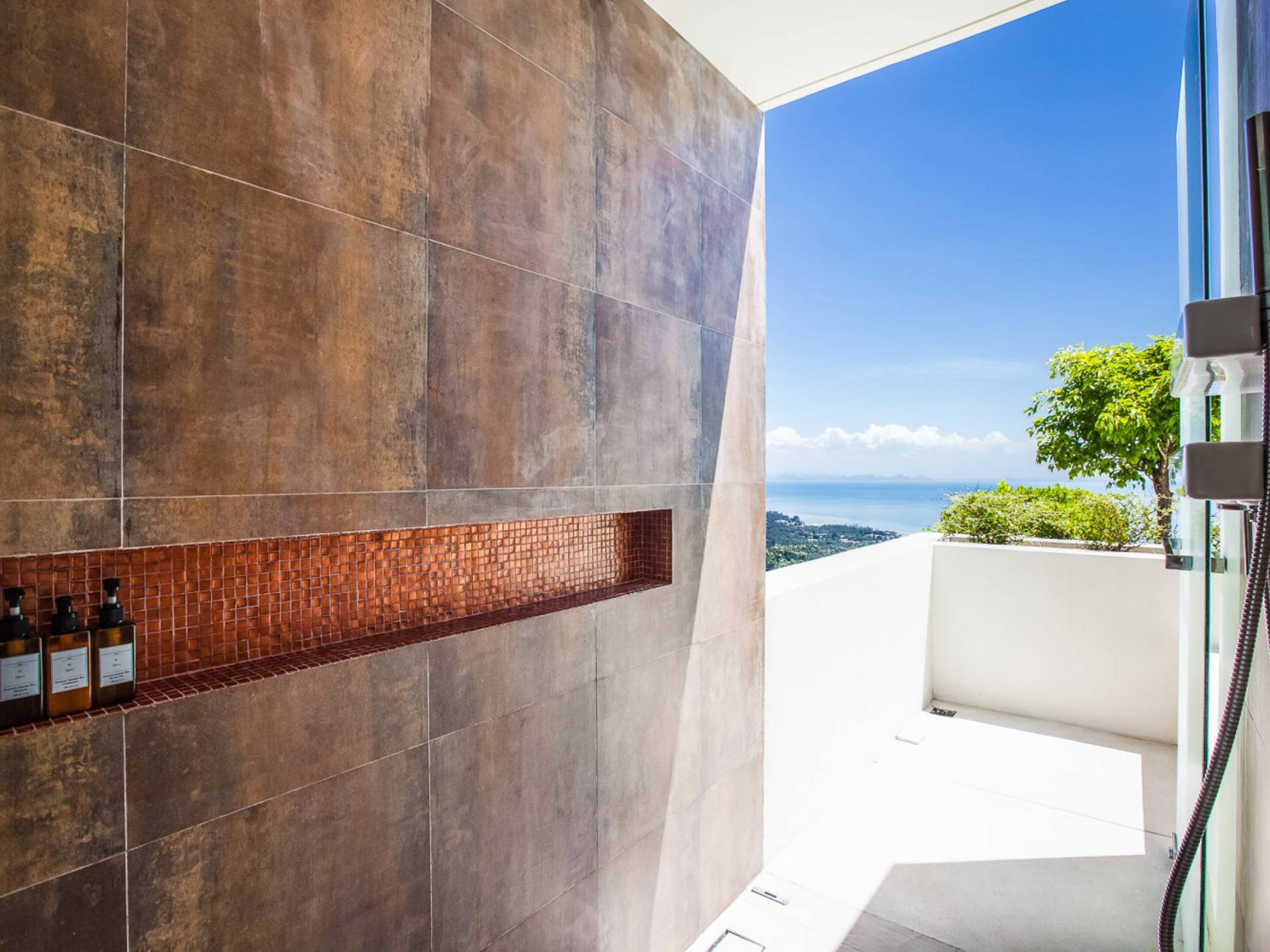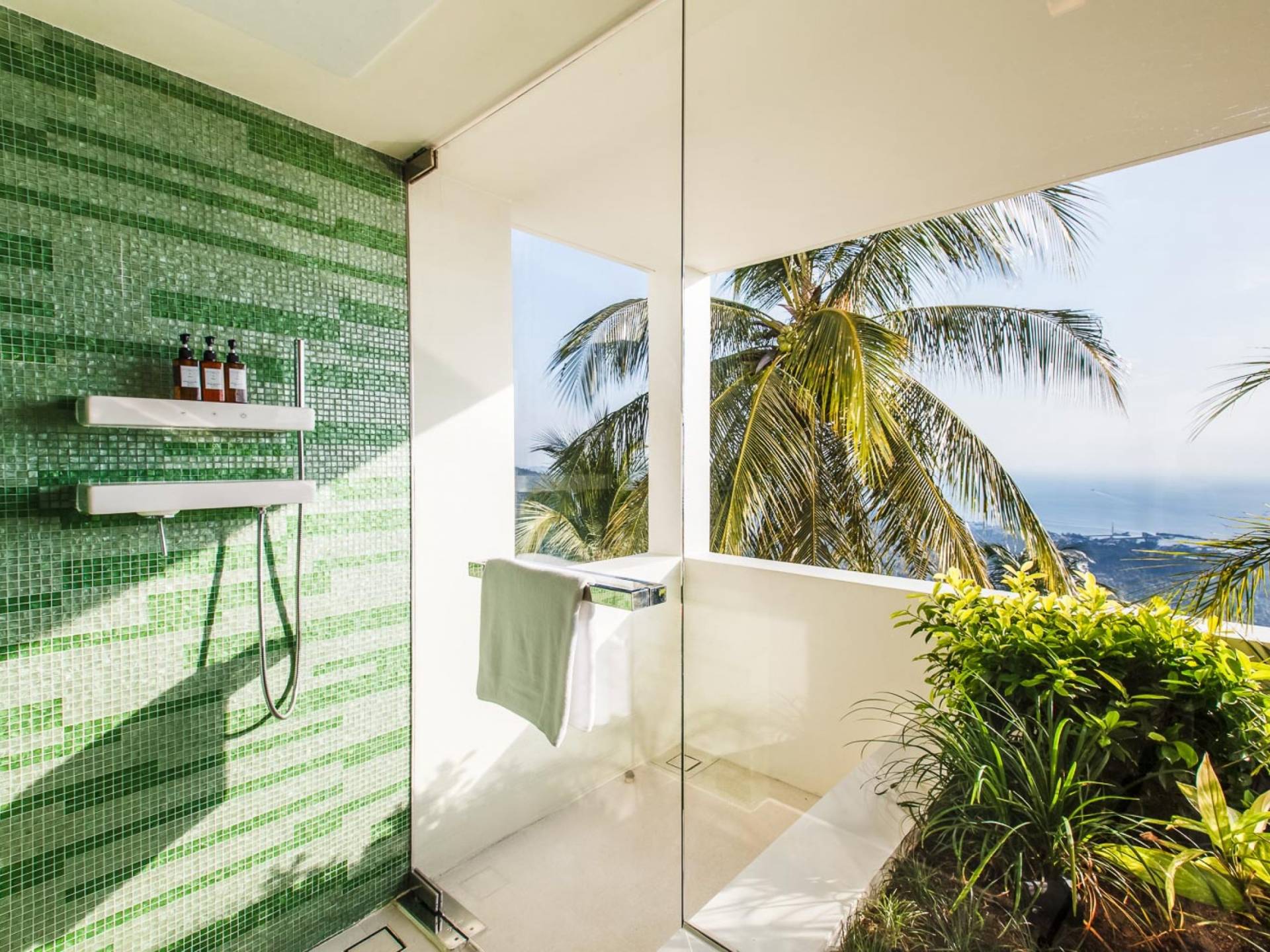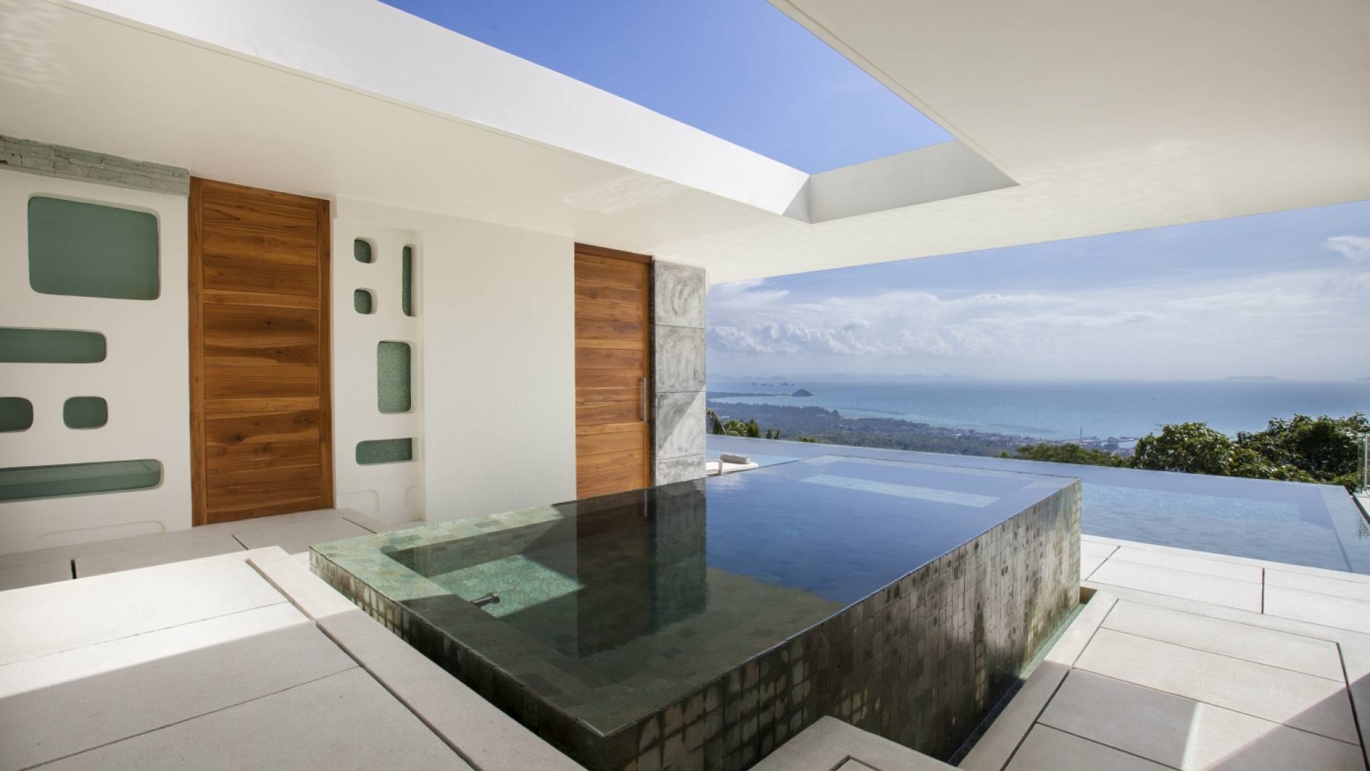 Villa Spice at Lime Samui itself hosts five en-suite bedrooms, including a children’s room and a stunning double-height master suite with an attached mezzanine office that can be curtained off to serve as an additional bedroom. The voluminous communal living area opens directly onto the outdoor terrace and private infinity pool area, with outstanding ocean views. Indoors, there is a modern sunken lounge, furnished with soft cushioned sofas, and a dining space featuring a 12-seater table handcrafted from a single cut of smooth acacia wood. Meals can be prepared in the villa’s ultra-modern fitted kitchen, which comes equipped with a host of high-end appliances and a full-length granite breakfast counter. There’s also a second concealed kitchen for use by the villa staff. The infinity pool is bordered on three sides by a wide terrace and is equipped with cushioned lounge chairs and sunbeds. The expansive covered poolside area includes a 10-seater dining table and a built-in barbeque, making it the perfect spot for enjoying meals and drinks during the day or after dark.