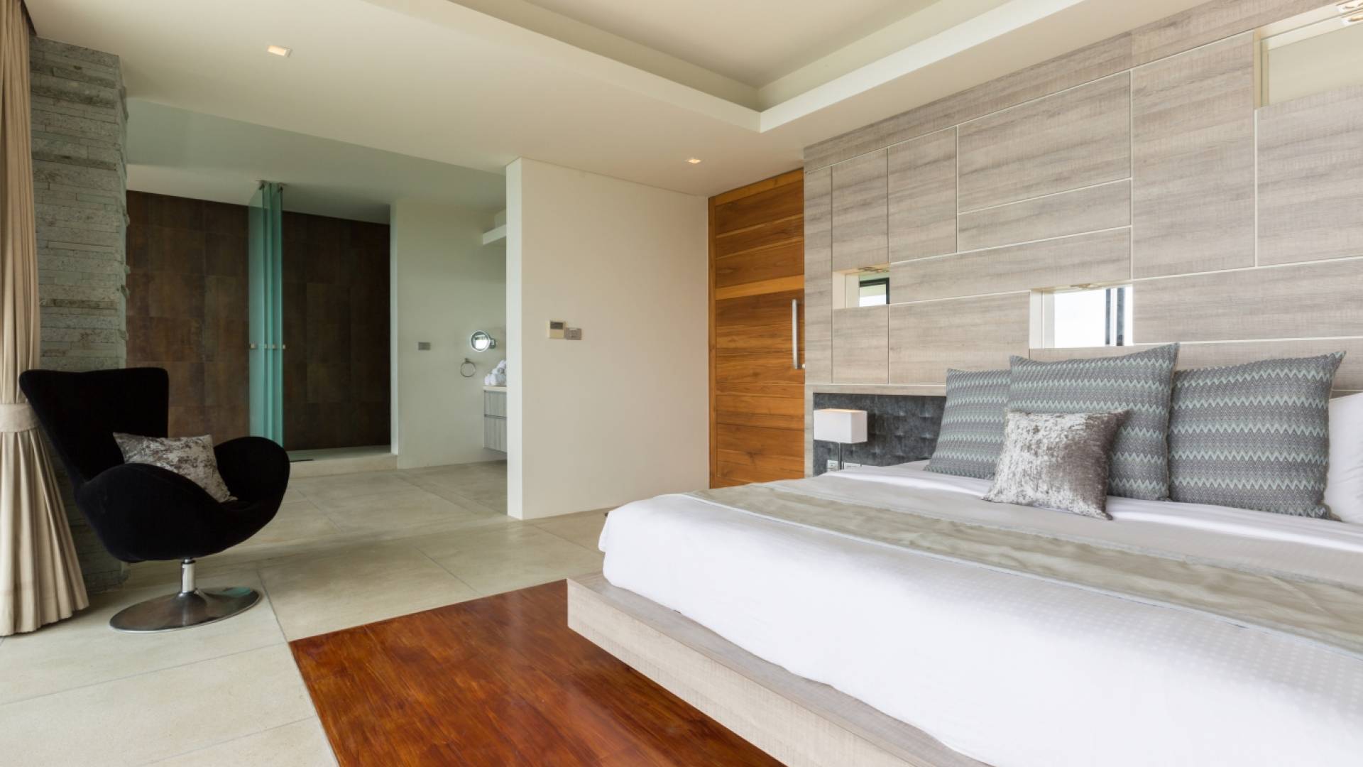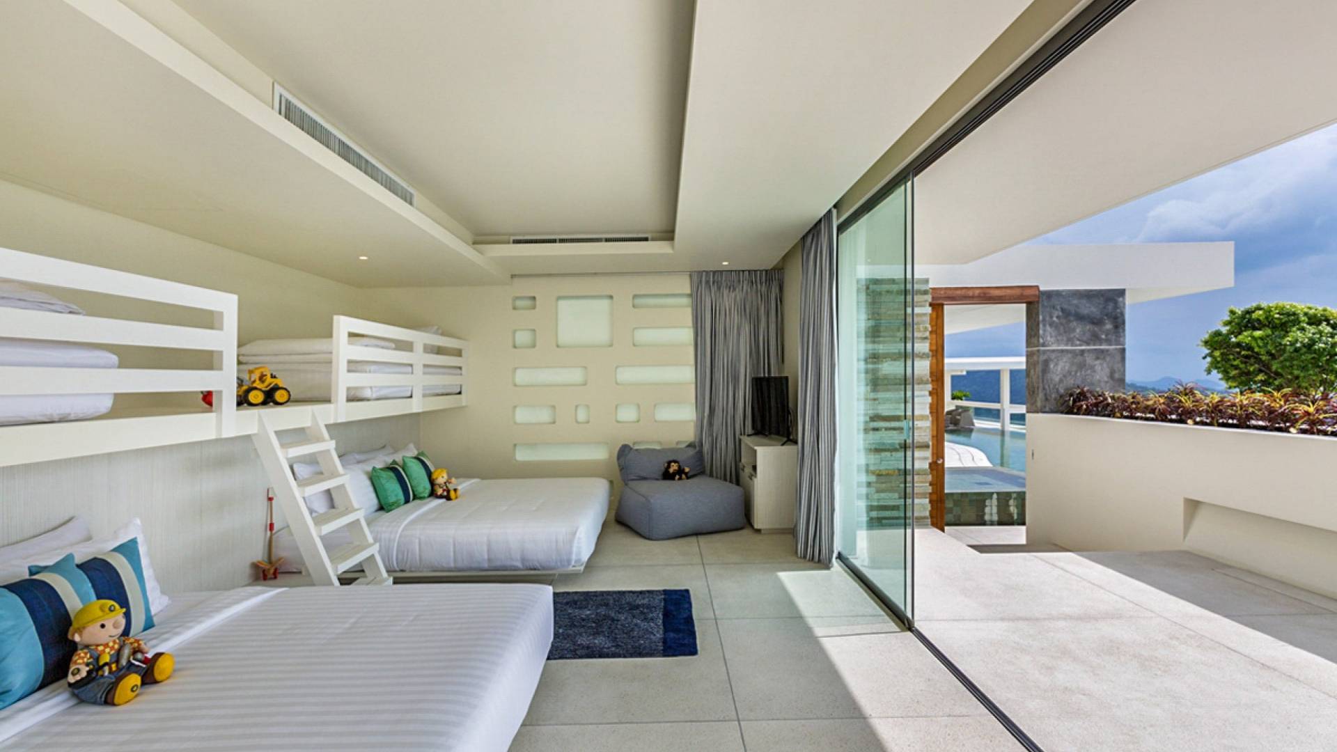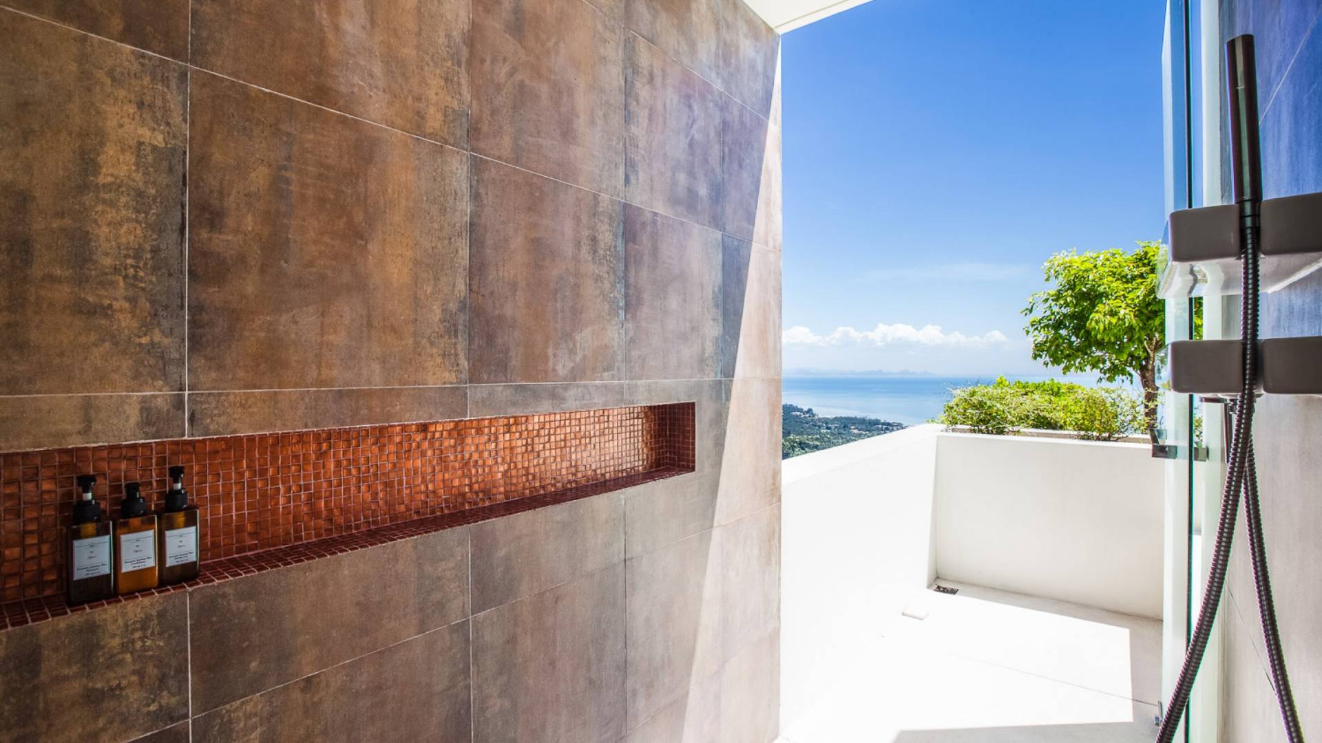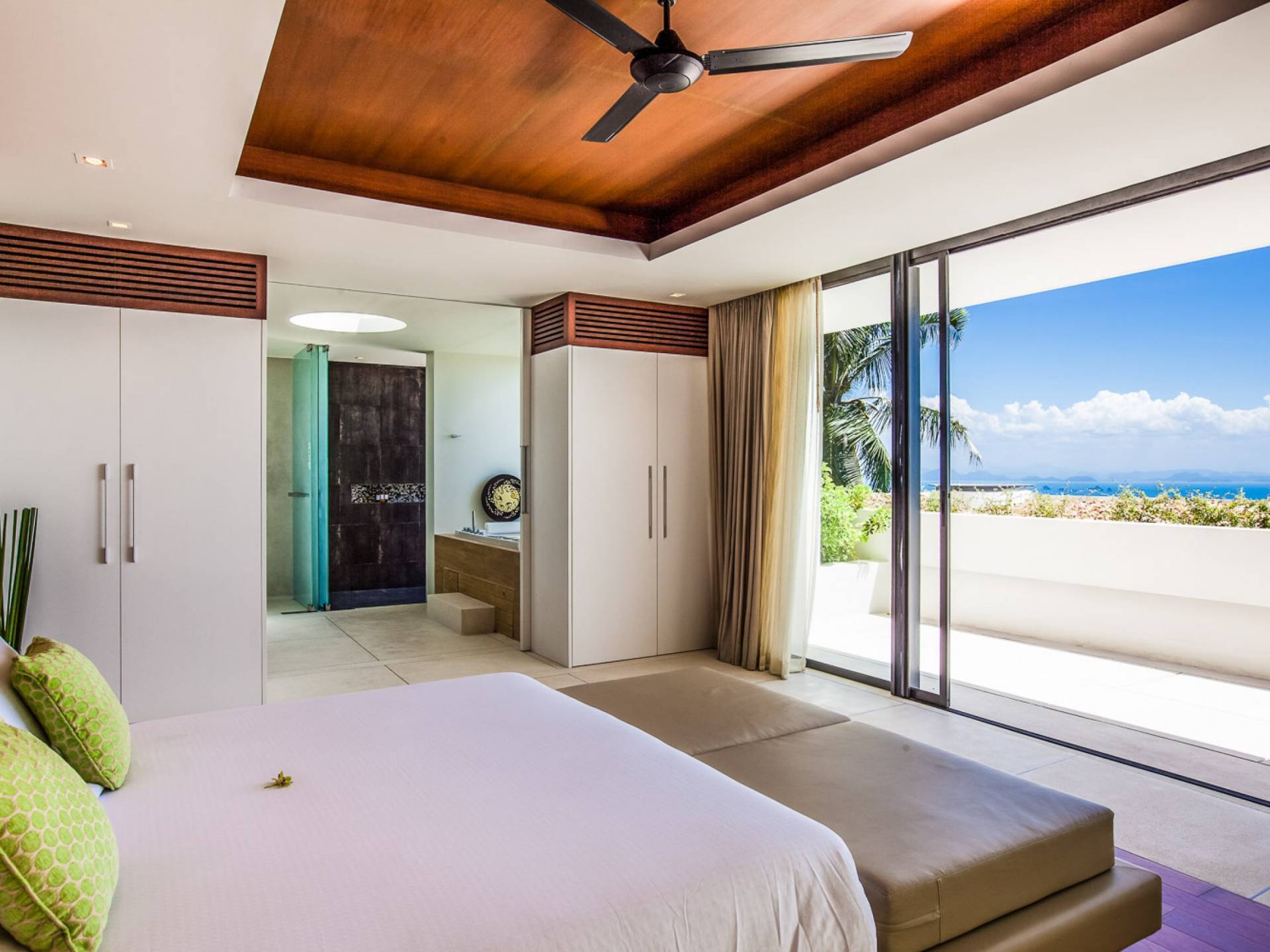 Villa Spice at Lime Samui itself hosts five en-suite bedrooms, including a children’s room and a stunning double-height master suite with an attached mezzanine office that can be curtained off to serve as an additional bedroom. The voluminous communal living area opens directly onto the outdoor terrace and private infinity pool area, with outstanding ocean views. Indoors, there is a modern sunken lounge, furnished with soft cushioned sofas, and a dining space featuring a 12-seater table handcrafted from a single cut of smooth acacia wood. Meals can be prepared in the villa’s ultra-modern fitted kitchen, which comes equipped with a host of high-end appliances and a full-length granite breakfast counter. There’s also a second concealed kitchen for use by the villa staff. The infinity pool is bordered on three sides by a wide terrace and is equipped with cushioned lounge chairs and sunbeds. The expansive covered poolside area includes a 10-seater dining table and a built-in barbeque, making it the perfect spot for enjoying meals and drinks during the day or after dark.