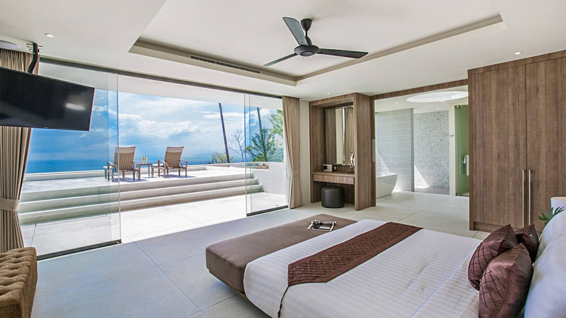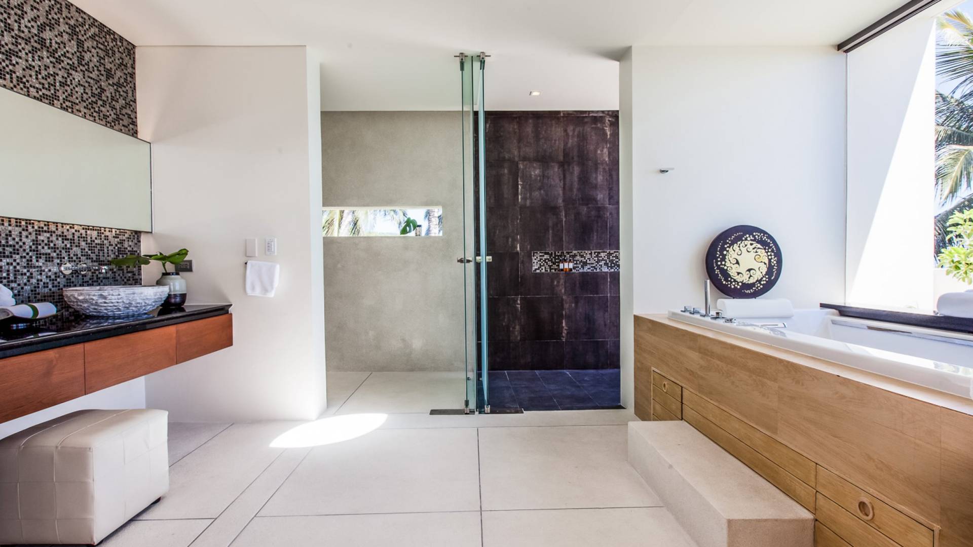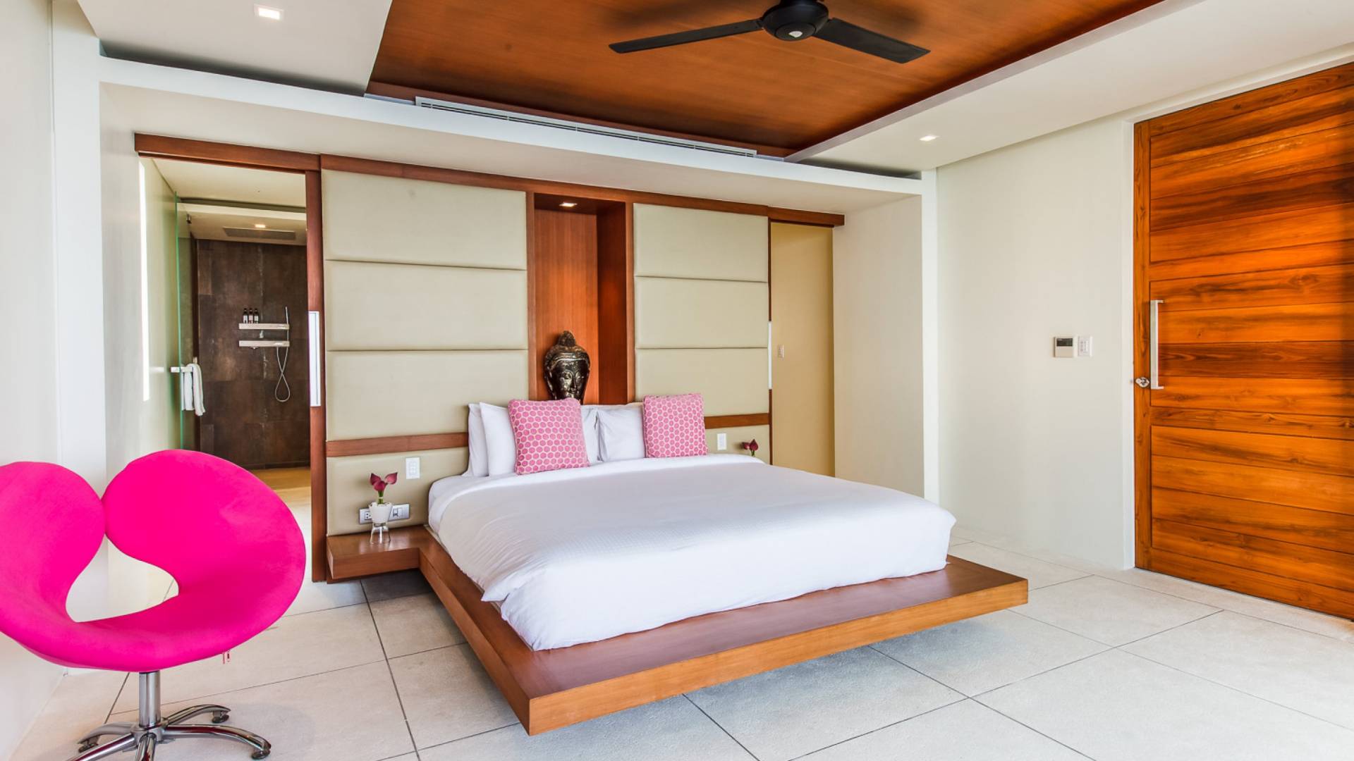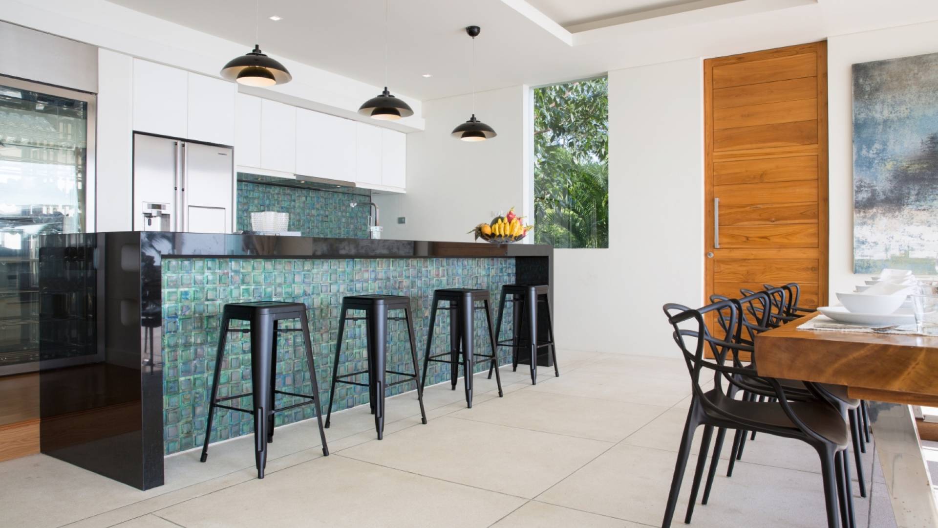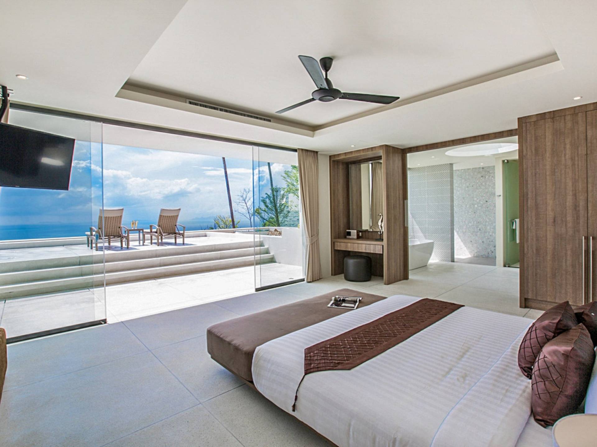 Villa Spice at Lime Samui itself hosts five en-suite bedrooms, including a children’s room and a stunning double-height master suite with an attached mezzanine office that can be curtained off to serve as an additional bedroom. The voluminous communal living area opens directly onto the outdoor terrace and private infinity pool area, with outstanding ocean views. Indoors, there is a modern sunken lounge, furnished with soft cushioned sofas, and a dining space featuring a 12-seater table handcrafted from a single cut of smooth acacia wood. Meals can be prepared in the villa’s ultra-modern fitted kitchen, which comes equipped with a host of high-end appliances and a full-length granite breakfast counter. There’s also a second concealed kitchen for use by the villa staff. The infinity pool is bordered on three sides by a wide terrace and is equipped with cushioned lounge chairs and sunbeds. The expansive covered poolside area includes a 10-seater dining table and a built-in barbeque, making it the perfect spot for enjoying meals and drinks during the day or after dark.