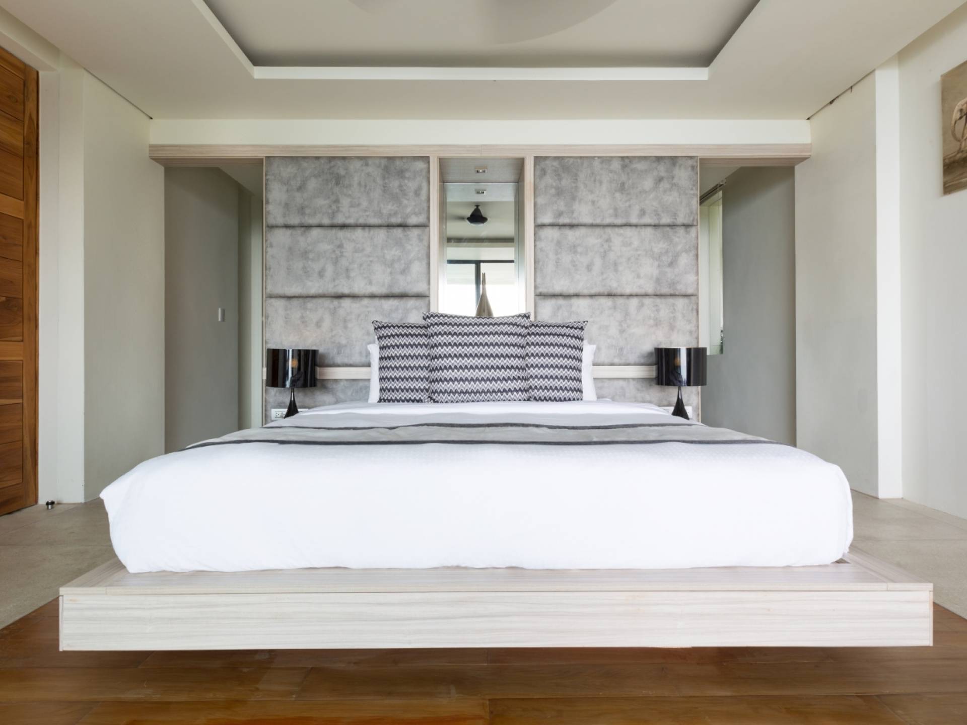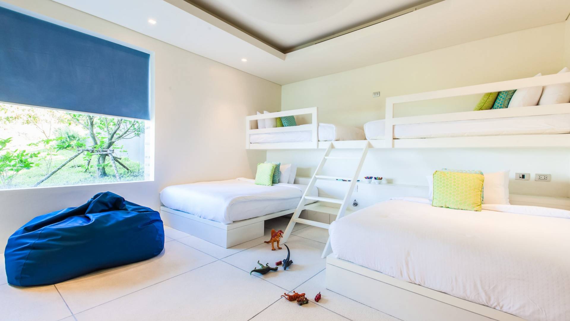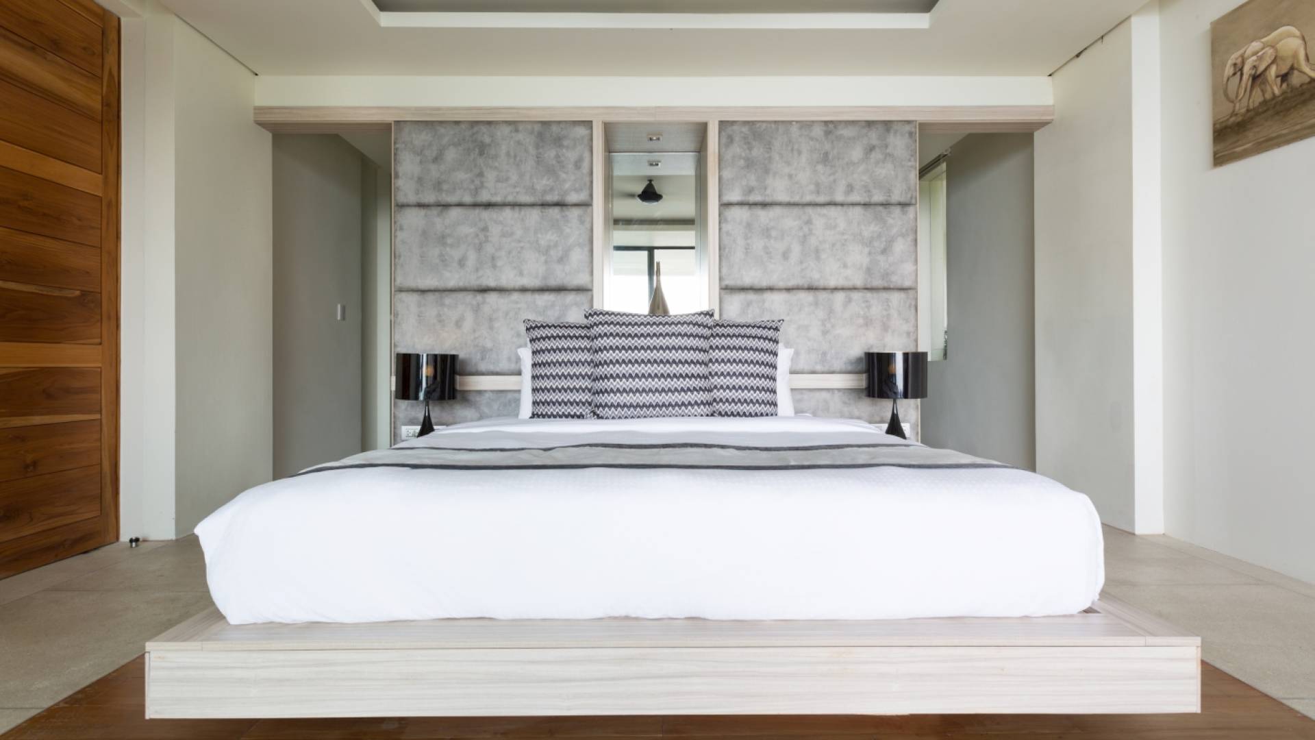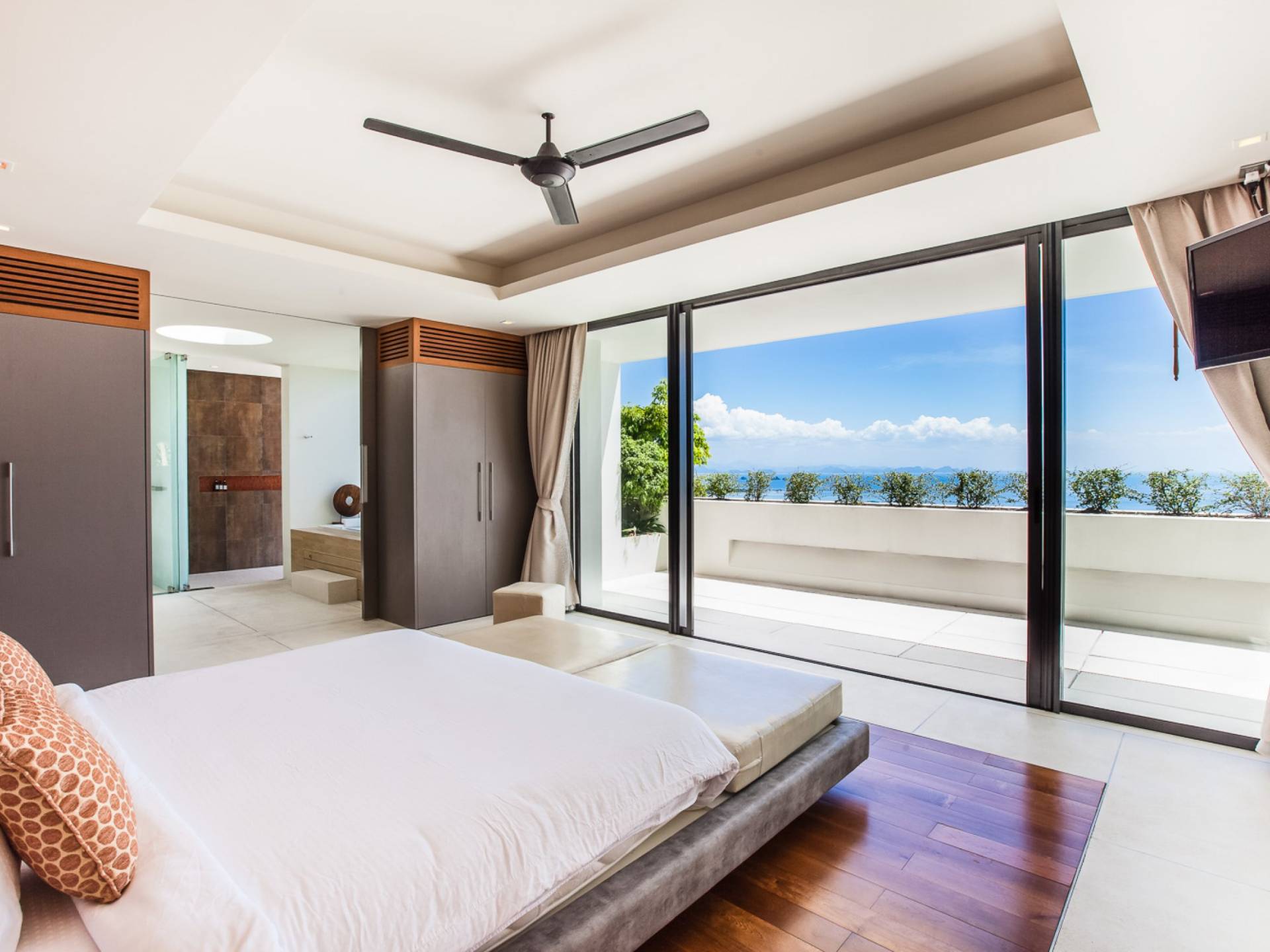 Villa Spice at Lime Samui itself hosts five en-suite bedrooms, including a children’s room and a stunning double-height master suite with an attached mezzanine office that can be curtained off to serve as an additional bedroom. The voluminous communal living area opens directly onto the outdoor terrace and private infinity pool area, with outstanding ocean views. Indoors, there is a modern sunken lounge, furnished with soft cushioned sofas, and a dining space featuring a 12-seater table handcrafted from a single cut of smooth acacia wood. Meals can be prepared in the villa’s ultra-modern fitted kitchen, which comes equipped with a host of high-end appliances and a full-length granite breakfast counter. There’s also a second concealed kitchen for use by the villa staff. The infinity pool is bordered on three sides by a wide terrace and is equipped with cushioned lounge chairs and sunbeds. The expansive covered poolside area includes a 10-seater dining table and a built-in barbeque, making it the perfect spot for enjoying meals and drinks during the day or after dark.