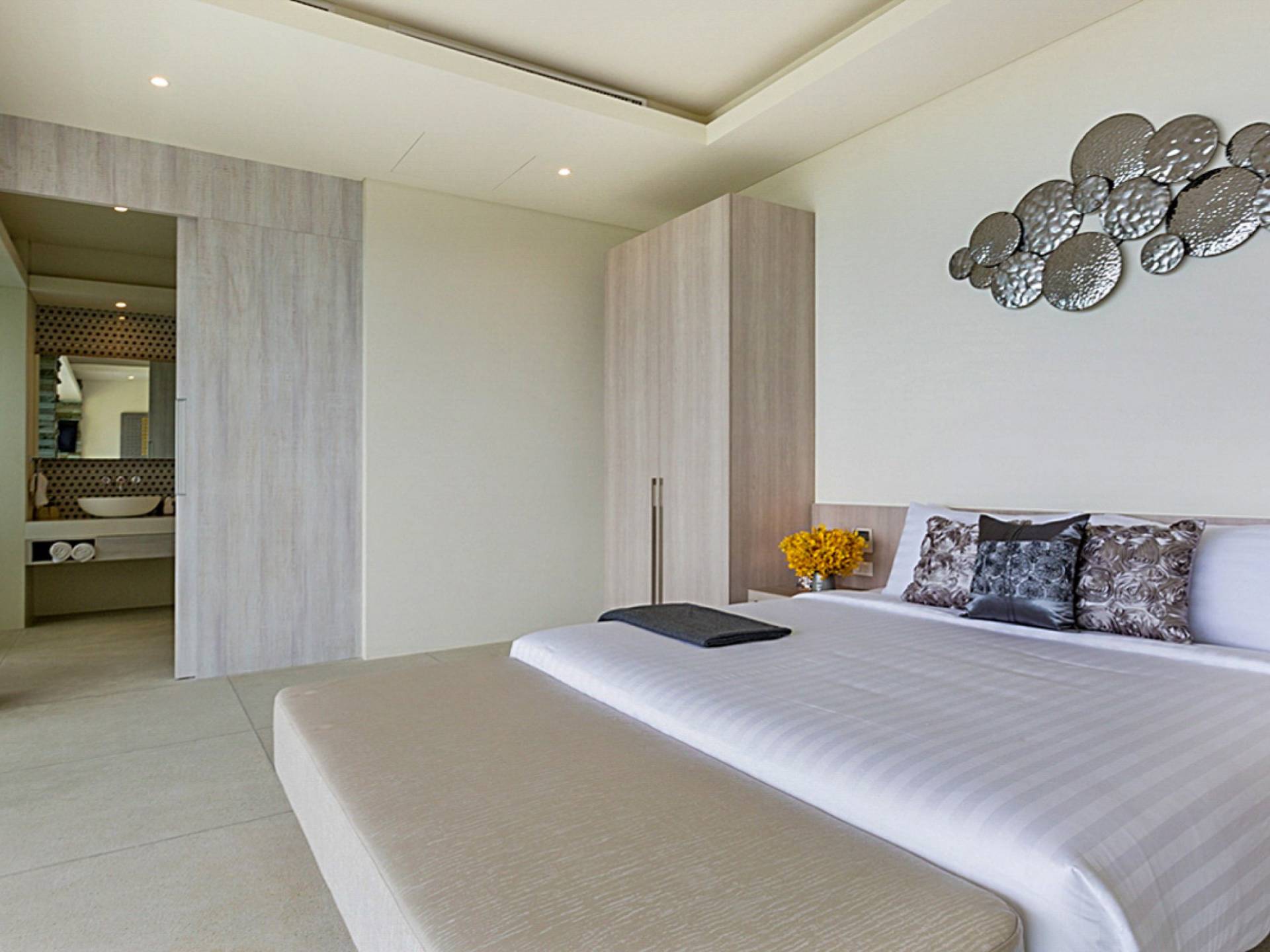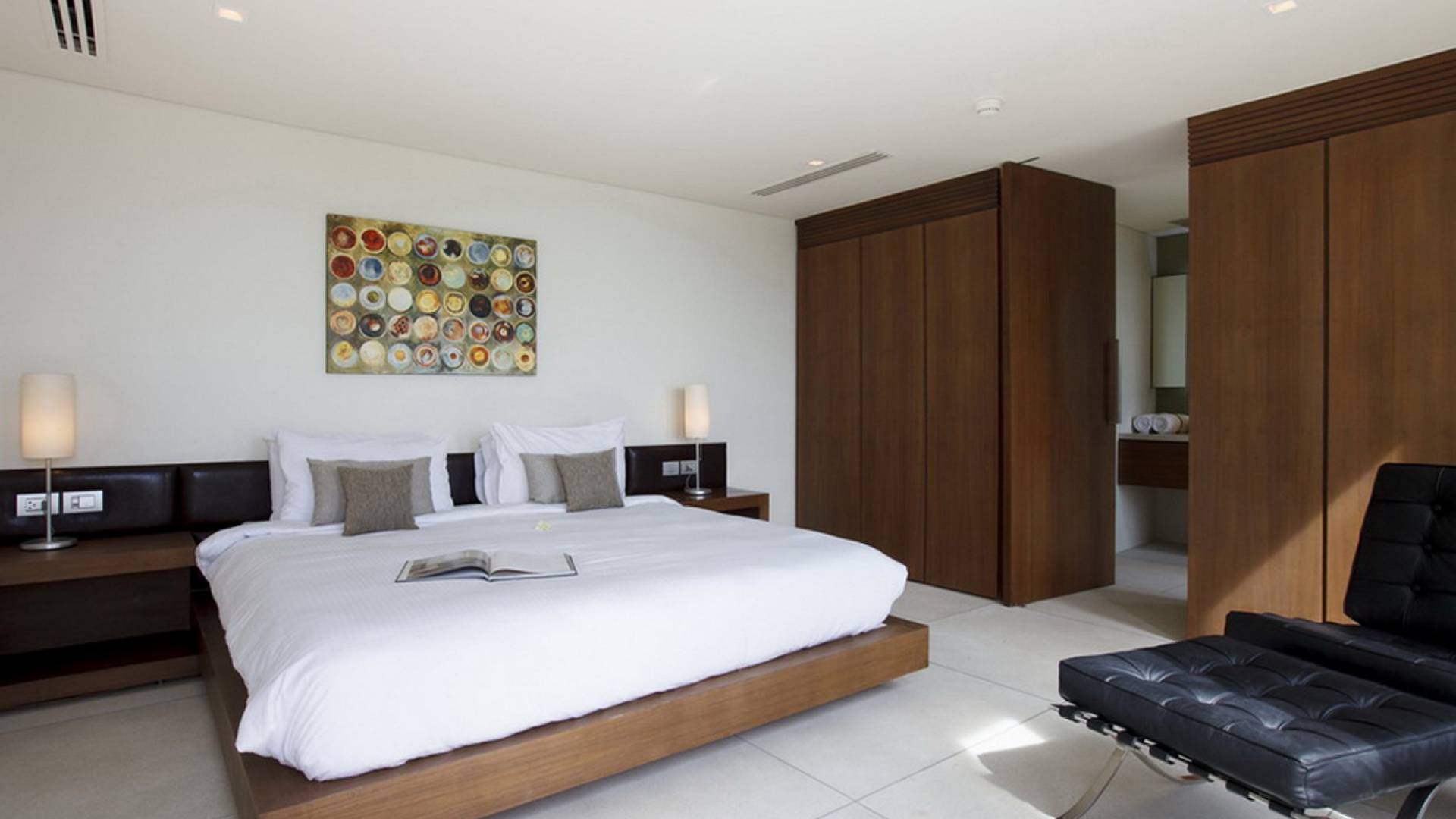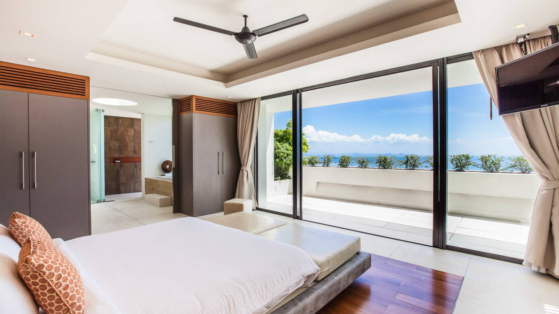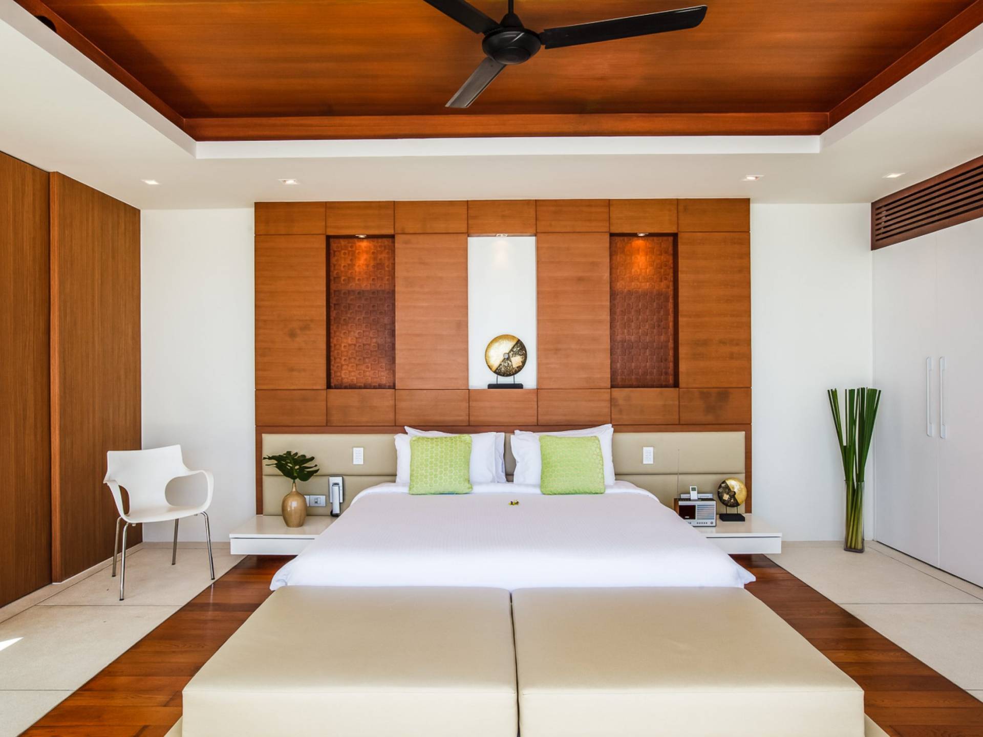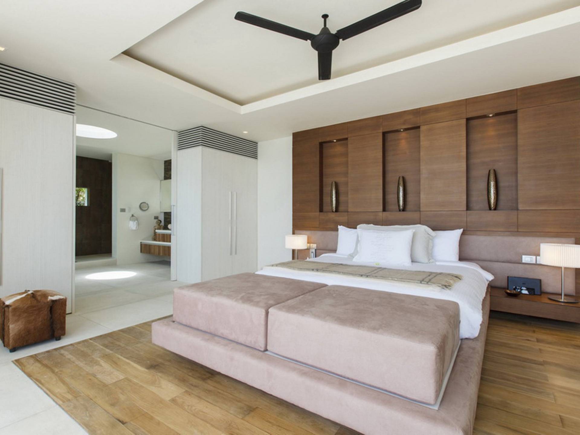 Villa Spice at Lime Samui itself hosts five en-suite bedrooms, including a children’s room and a stunning double-height master suite with an attached mezzanine office that can be curtained off to serve as an additional bedroom. The voluminous communal living area opens directly onto the outdoor terrace and private infinity pool area, with outstanding ocean views. Indoors, there is a modern sunken lounge, furnished with soft cushioned sofas, and a dining space featuring a 12-seater table handcrafted from a single cut of smooth acacia wood. Meals can be prepared in the villa’s ultra-modern fitted kitchen, which comes equipped with a host of high-end appliances and a full-length granite breakfast counter. There’s also a second concealed kitchen for use by the villa staff. The infinity pool is bordered on three sides by a wide terrace and is equipped with cushioned lounge chairs and sunbeds. The expansive covered poolside area includes a 10-seater dining table and a built-in barbeque, making it the perfect spot for enjoying meals and drinks during the day or after dark.