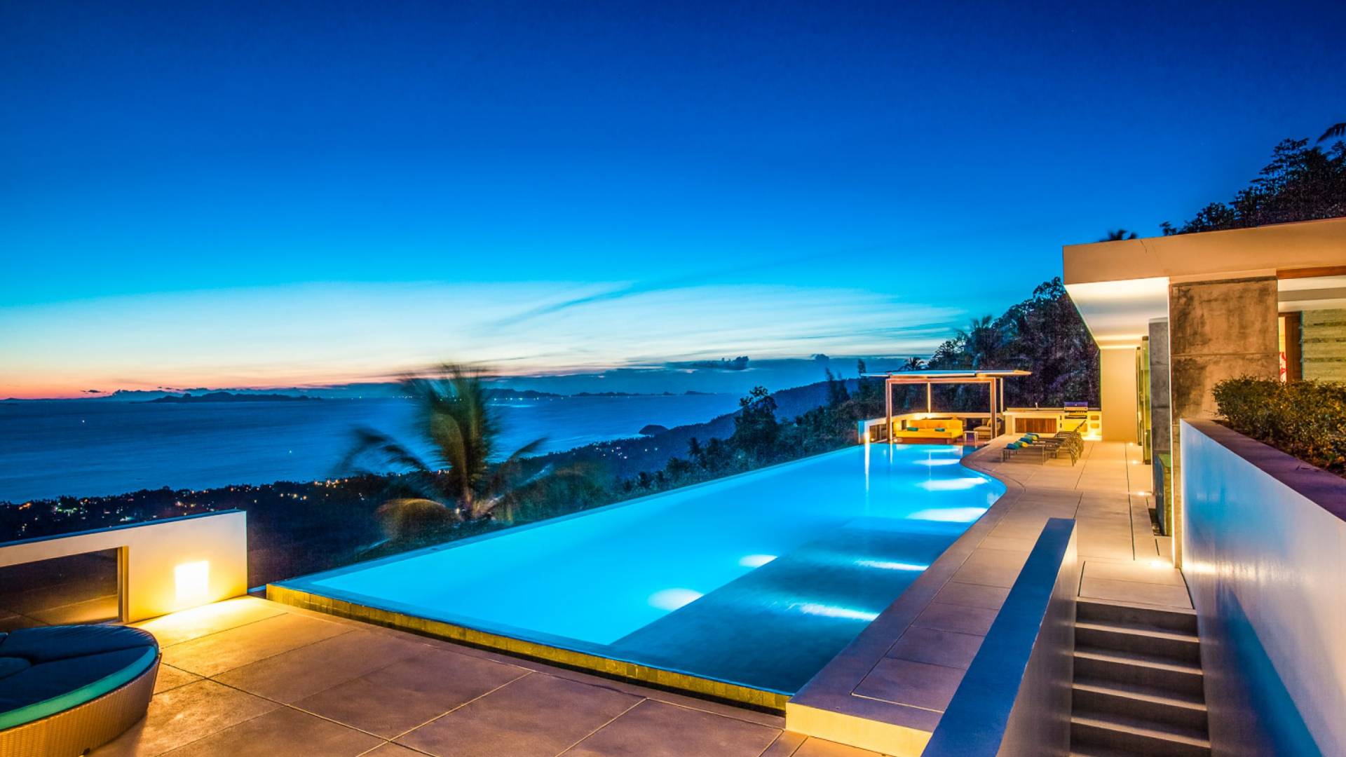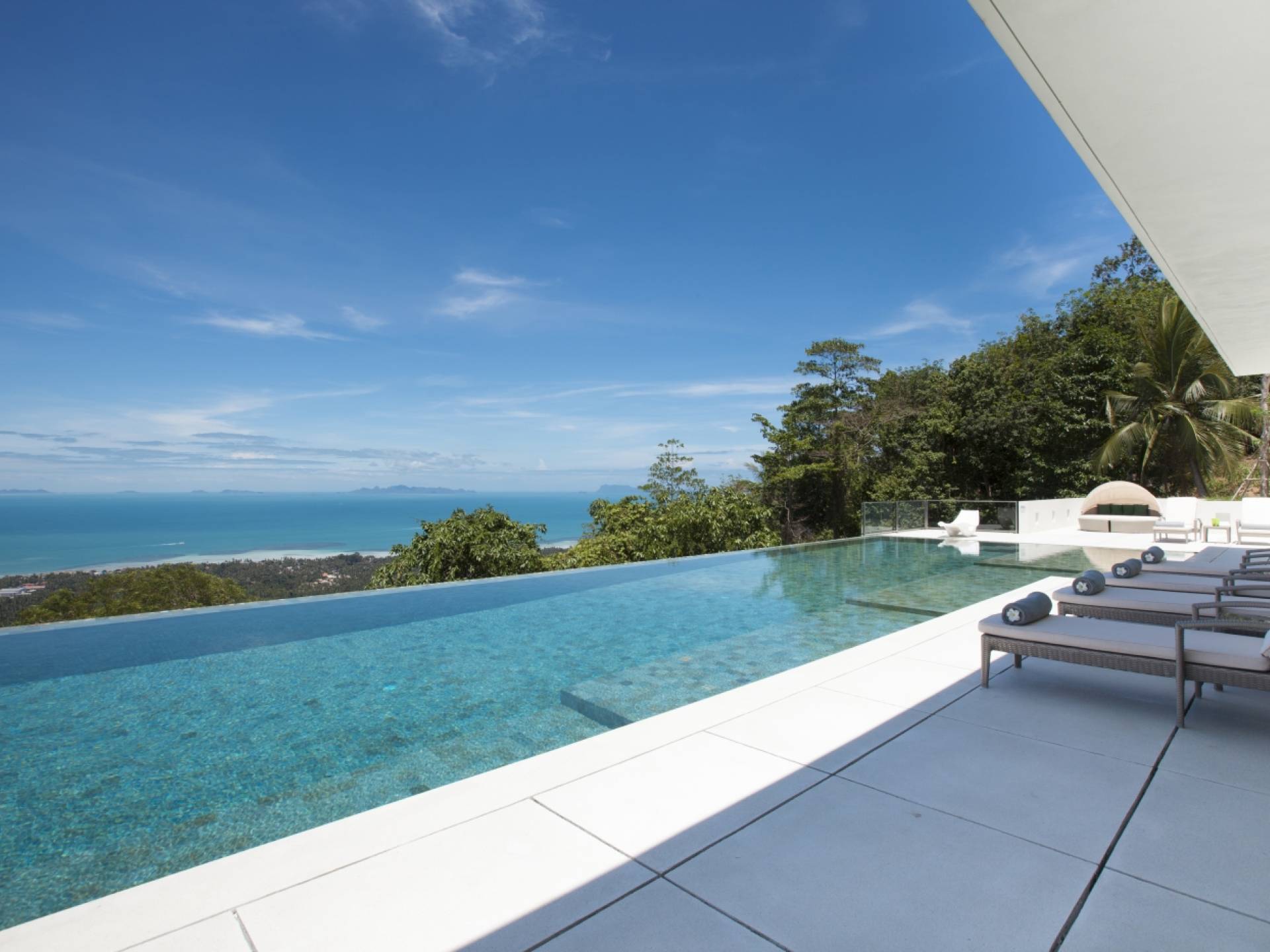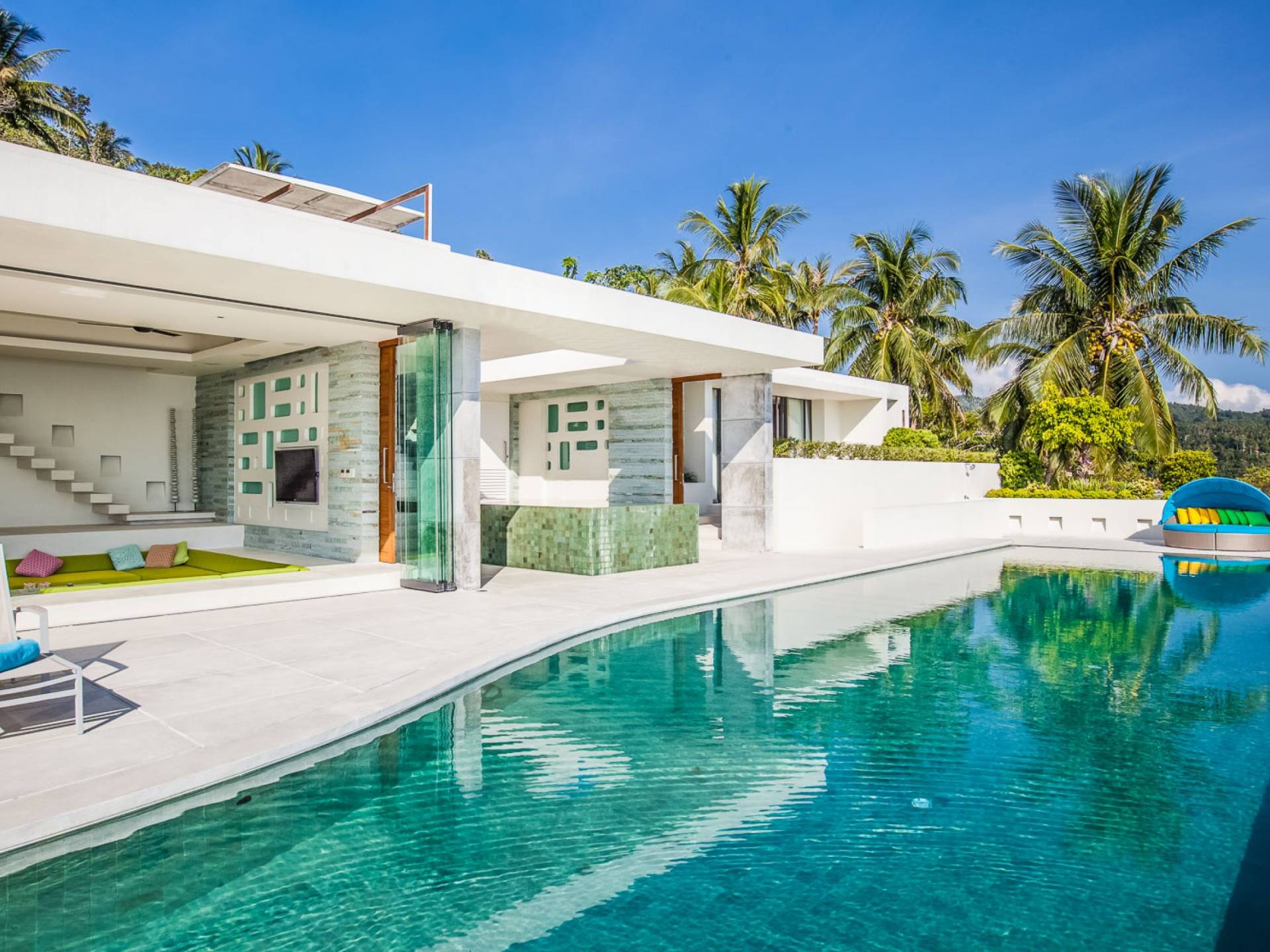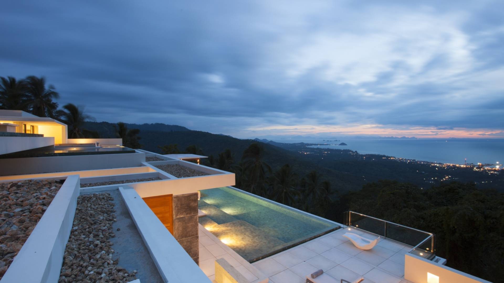 Villa Splash at Lime Samui Estate is peacefully positioned high on the hills above Koh Samui’s quaint port town of Nathon. This prestigious villa rental offers unparalleled panoramic views of the sea, Angthong Marine Park, and the Five Islands. The guests are provided with the chance to watch fishing boats and ferries as they arrive and depart from Koh Samui, as well as a variety of colorful and mesmerizing sunsets. Villa Splash at Lime Samui Estate presents a contemporary open-plan design with intelligent use of space and distinctive character that sets it apart from the typical island villa layouts.