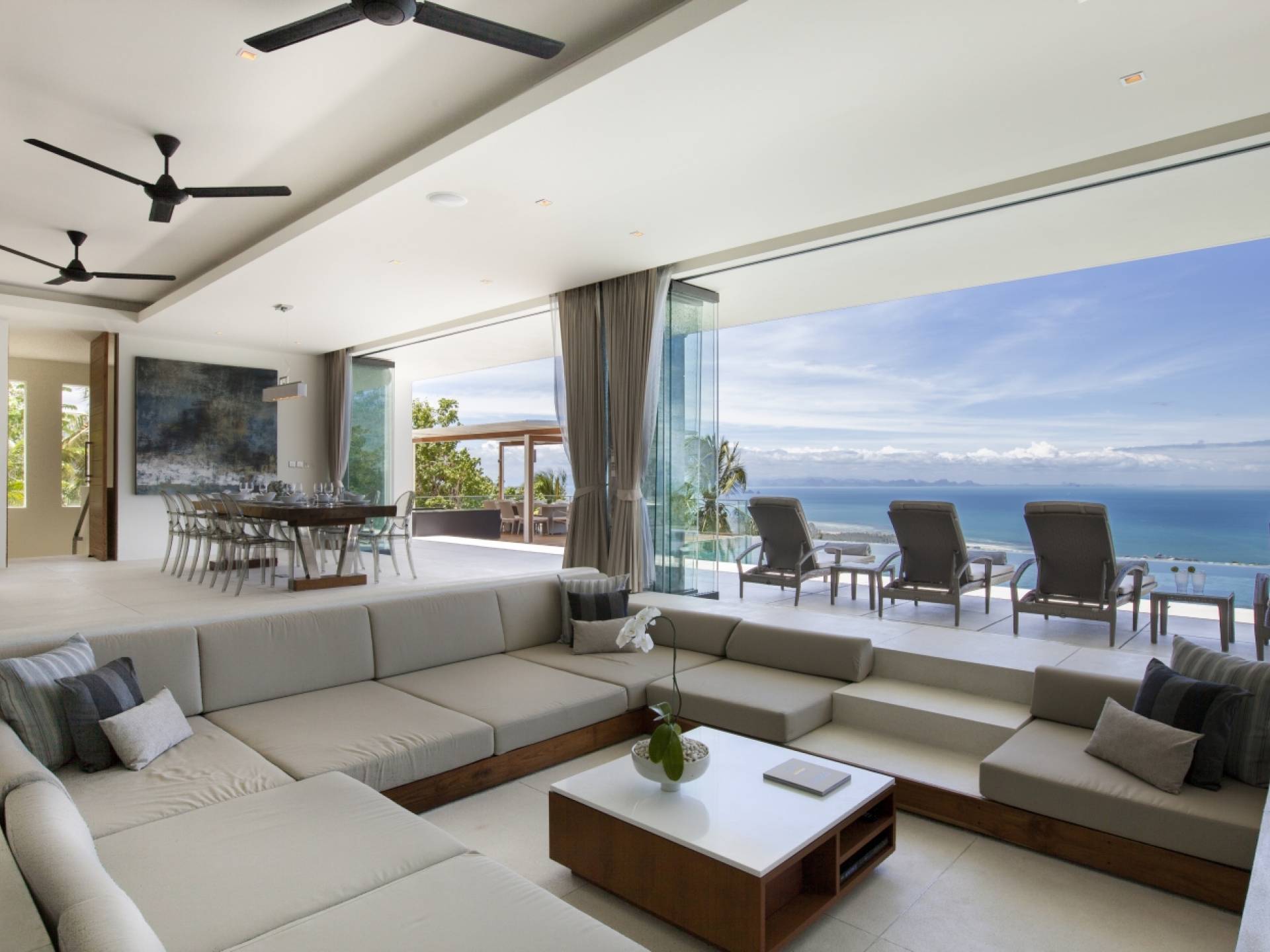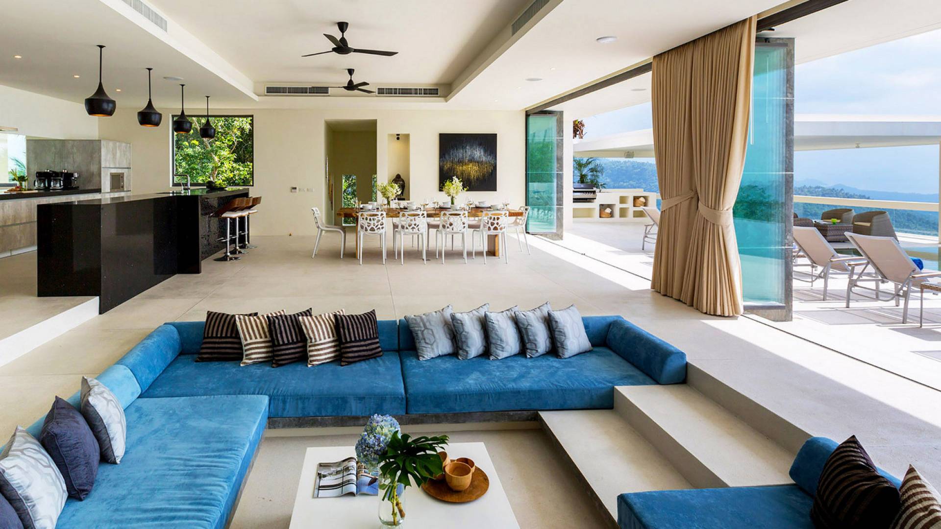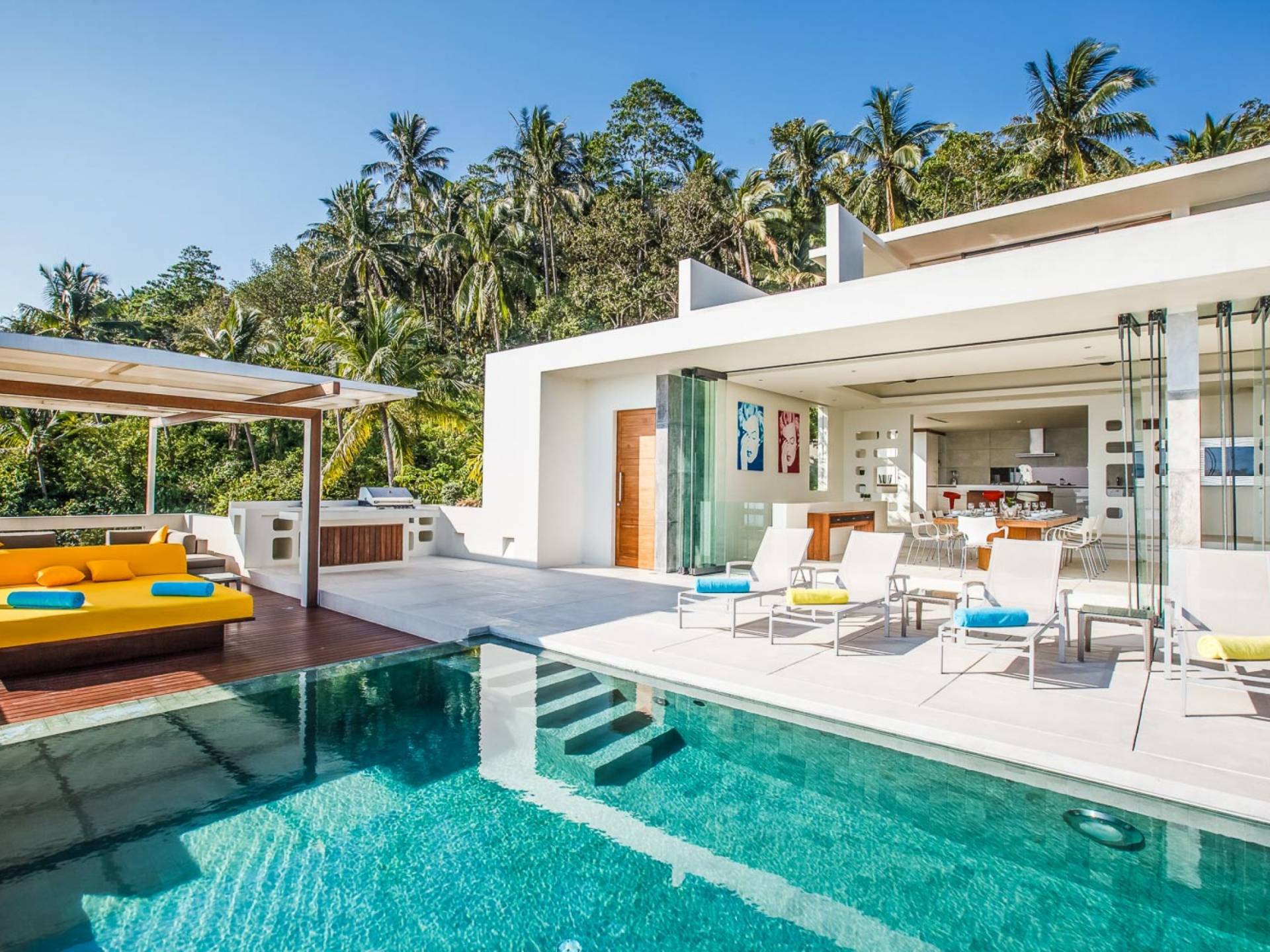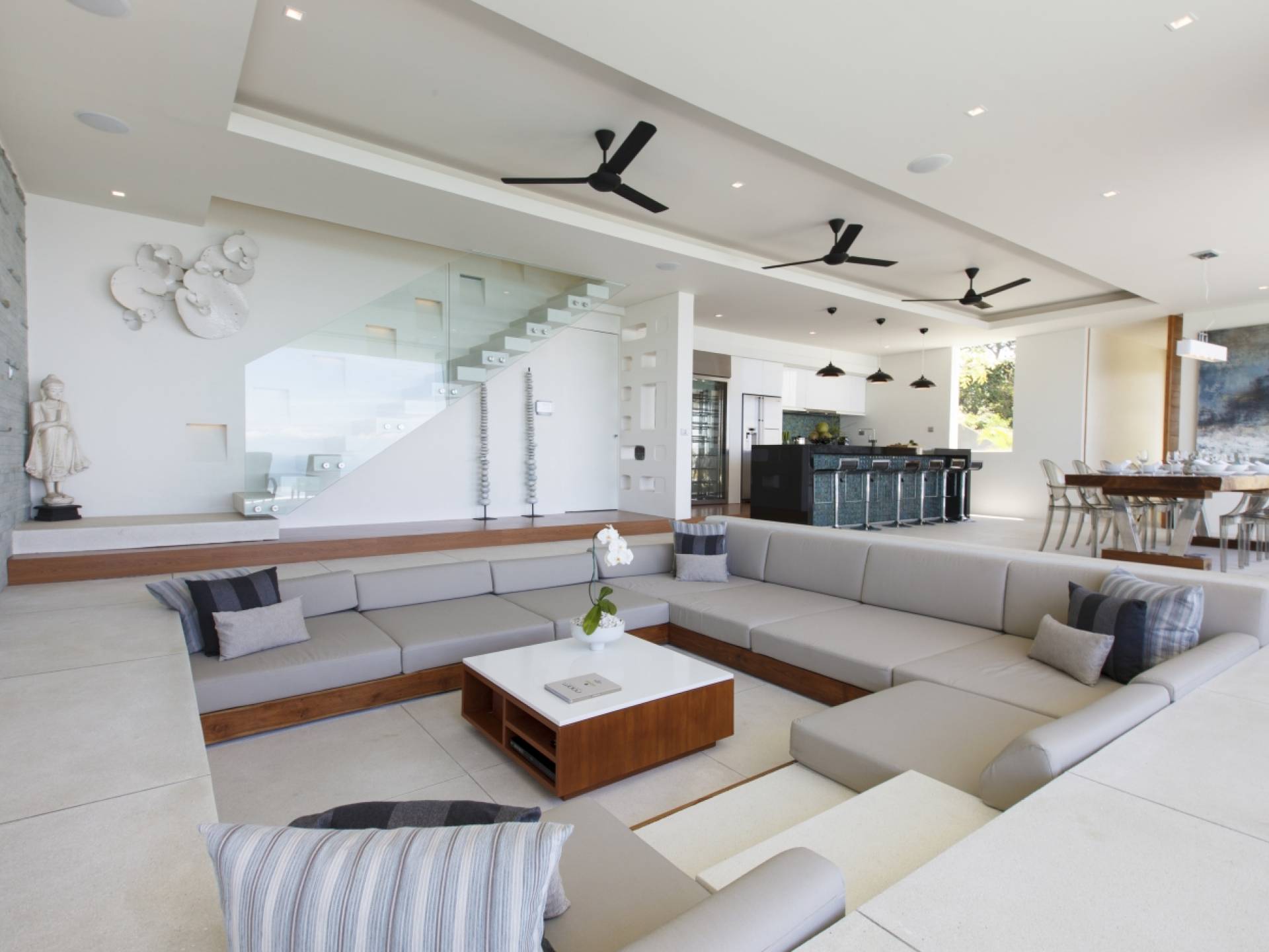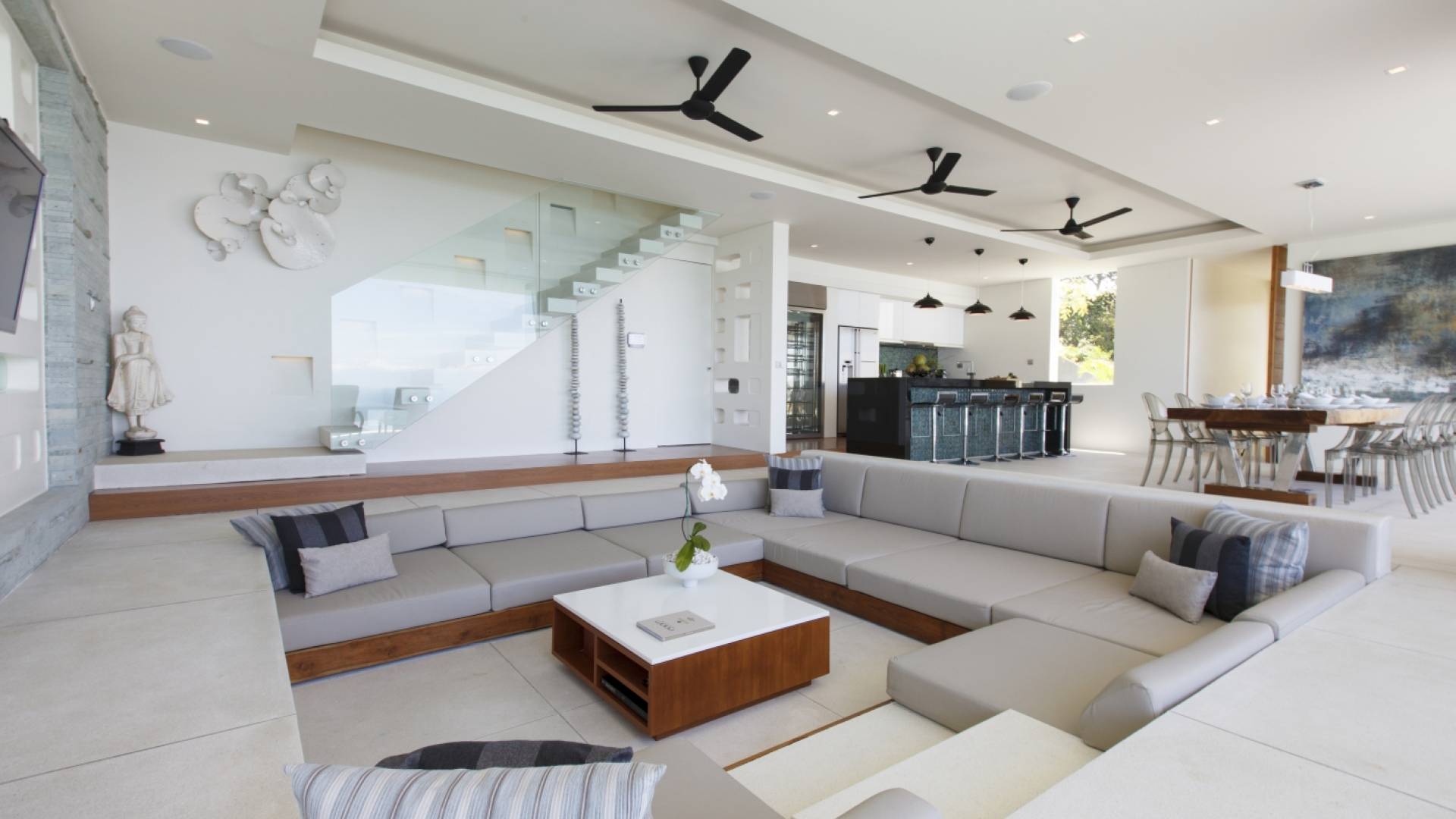 Villa Zest at Lime Samui itself extends over three separate levels, offering guests an impressive choice of private and communal areas to relax and enjoy their spectacular surroundings in style. This luxury villa features five bedrooms, seven bathrooms, a pool sala, a fully equipped gym, and a study room with its own comfortable terrace and built-in sofas. With the huge private infinity pool as a focal point, the rooms open onto outdoor terraces to merge indoor and outdoor areas, creating a real sense of space and freedom. The Great Room combines a comfortable lounge, dining area, and fully fitted western kitchen, each positioned at different levels connected by steps. Comfortable sofas in the sunken living space are poised before a wall-mounted flat-screen TV, while a 10-seater dining table awaits evening meals prepared in the modern, luxury-fitted kitchen. In addition to the indoor dining space, the villa also features an outside dining Sala with a BBQ area for the ultimate alfresco feast.