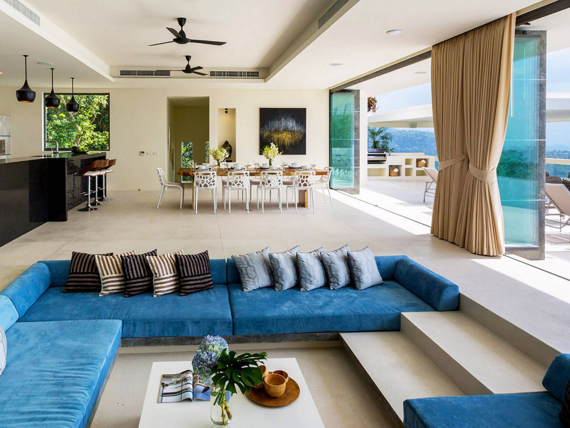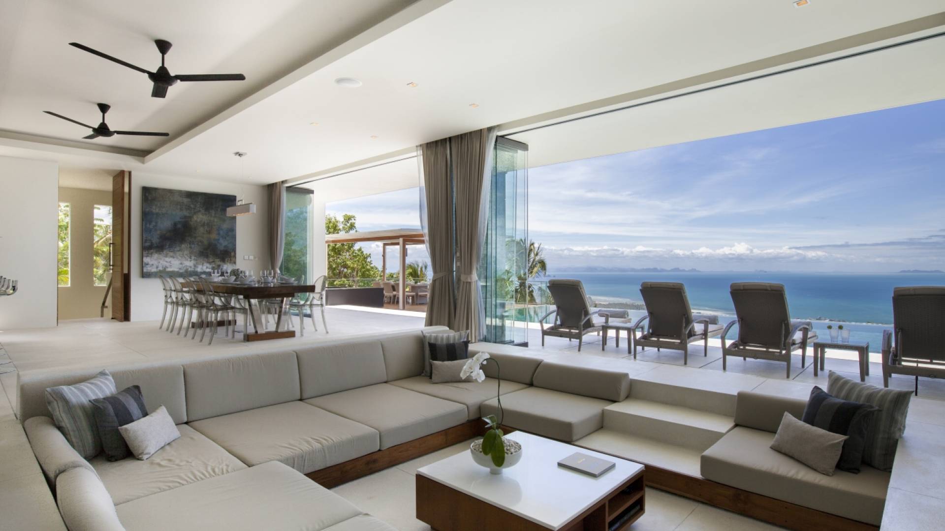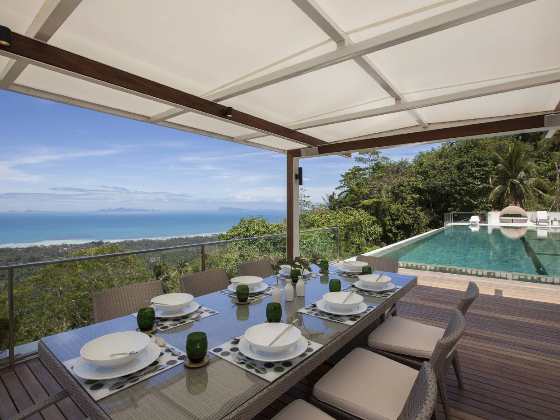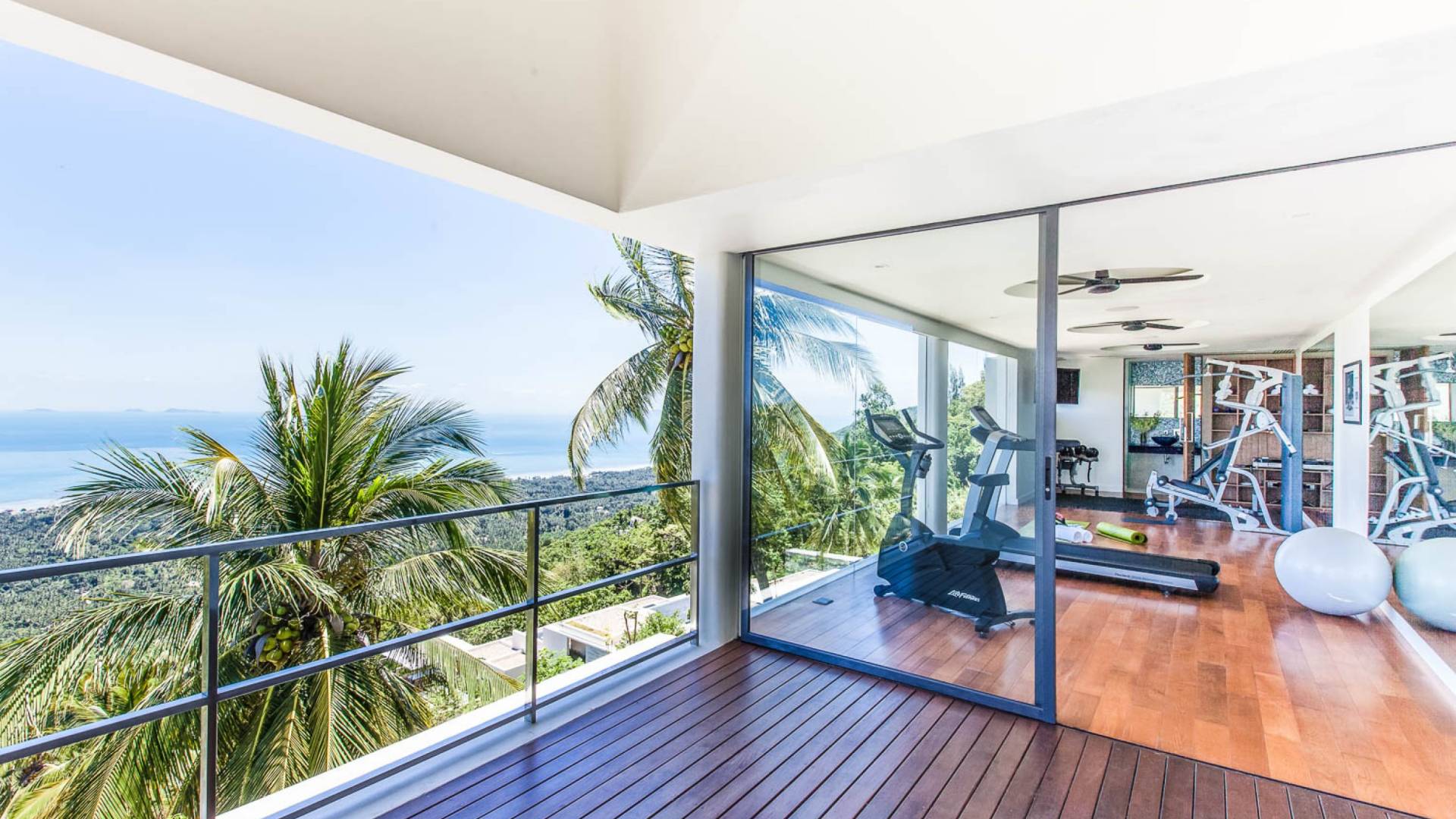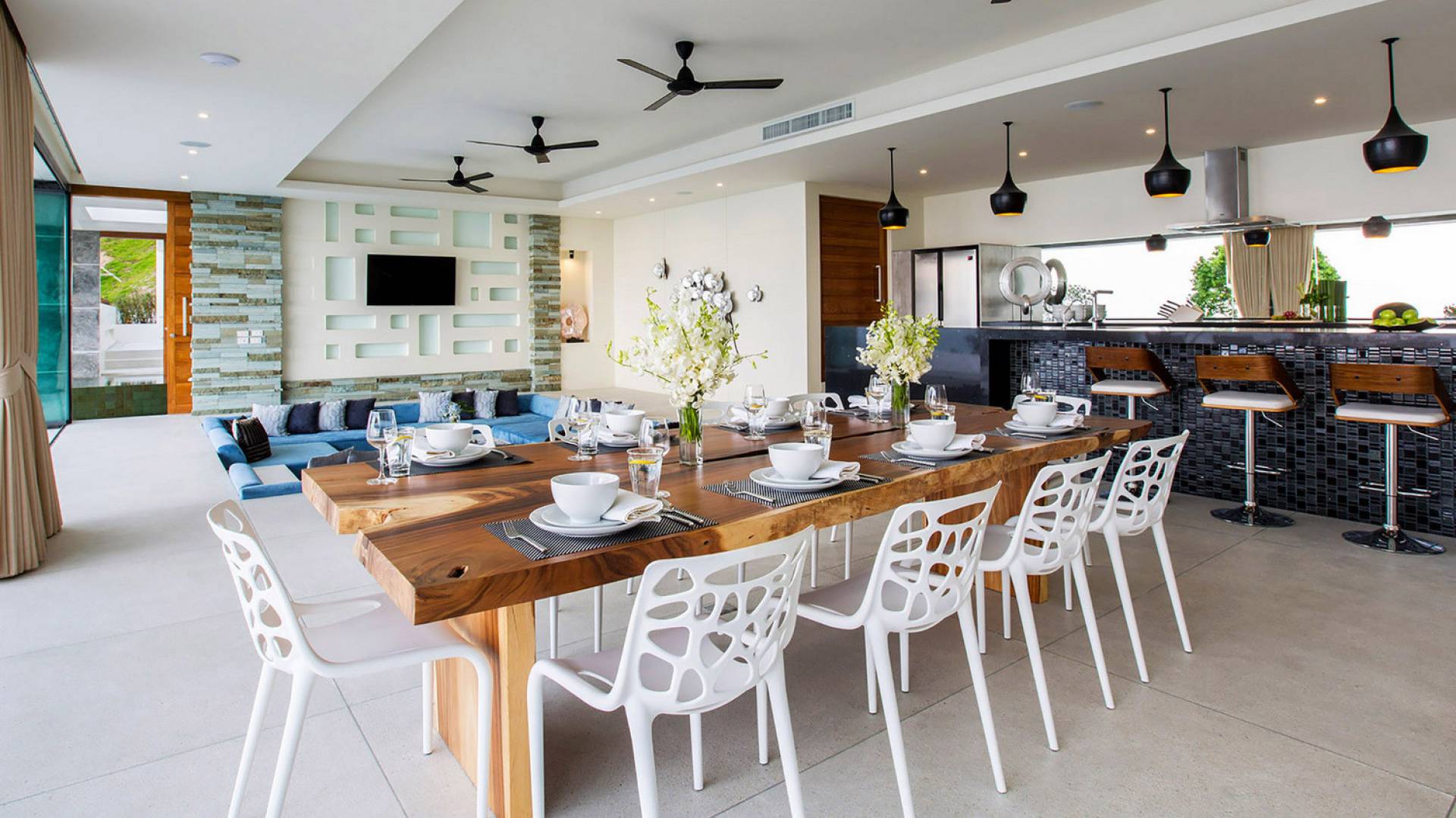 Villa Zest at Lime Samui itself extends over three separate levels, offering guests an impressive choice of private and communal areas to relax and enjoy their spectacular surroundings in style. This luxury villa features five bedrooms, seven bathrooms, a pool sala, a fully equipped gym, and a study room with its own comfortable terrace and built-in sofas. With the huge private infinity pool as a focal point, the rooms open onto outdoor terraces to merge indoor and outdoor areas, creating a real sense of space and freedom. The Great Room combines a comfortable lounge, dining area, and fully fitted western kitchen, each positioned at different levels connected by steps. Comfortable sofas in the sunken living space are poised before a wall-mounted flat-screen TV, while a 10-seater dining table awaits evening meals prepared in the modern, luxury-fitted kitchen. In addition to the indoor dining space, the villa also features an outside dining Sala with a BBQ area for the ultimate alfresco feast.