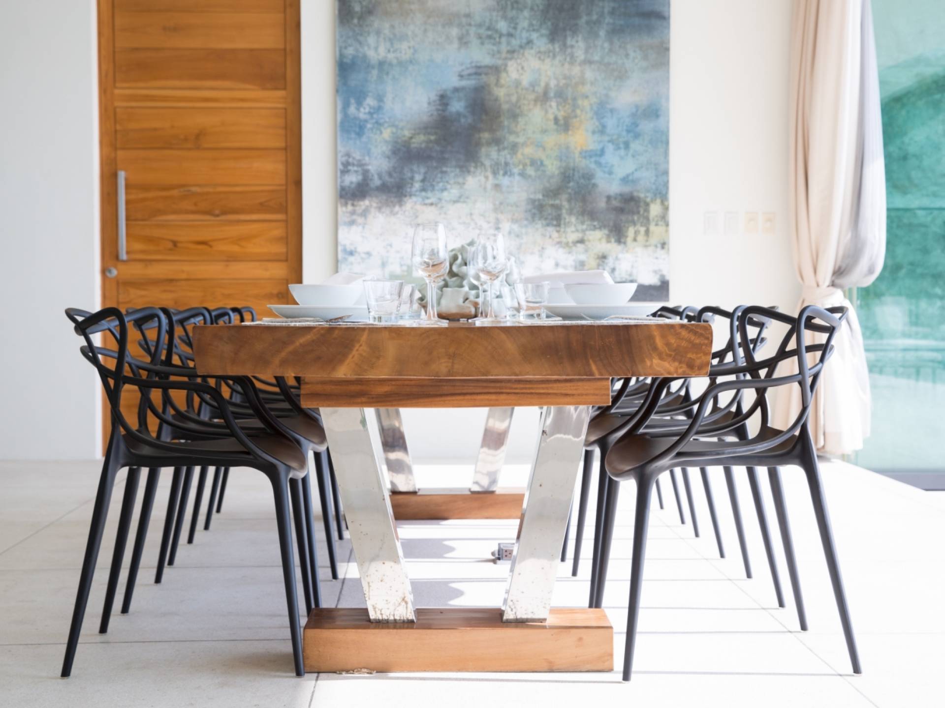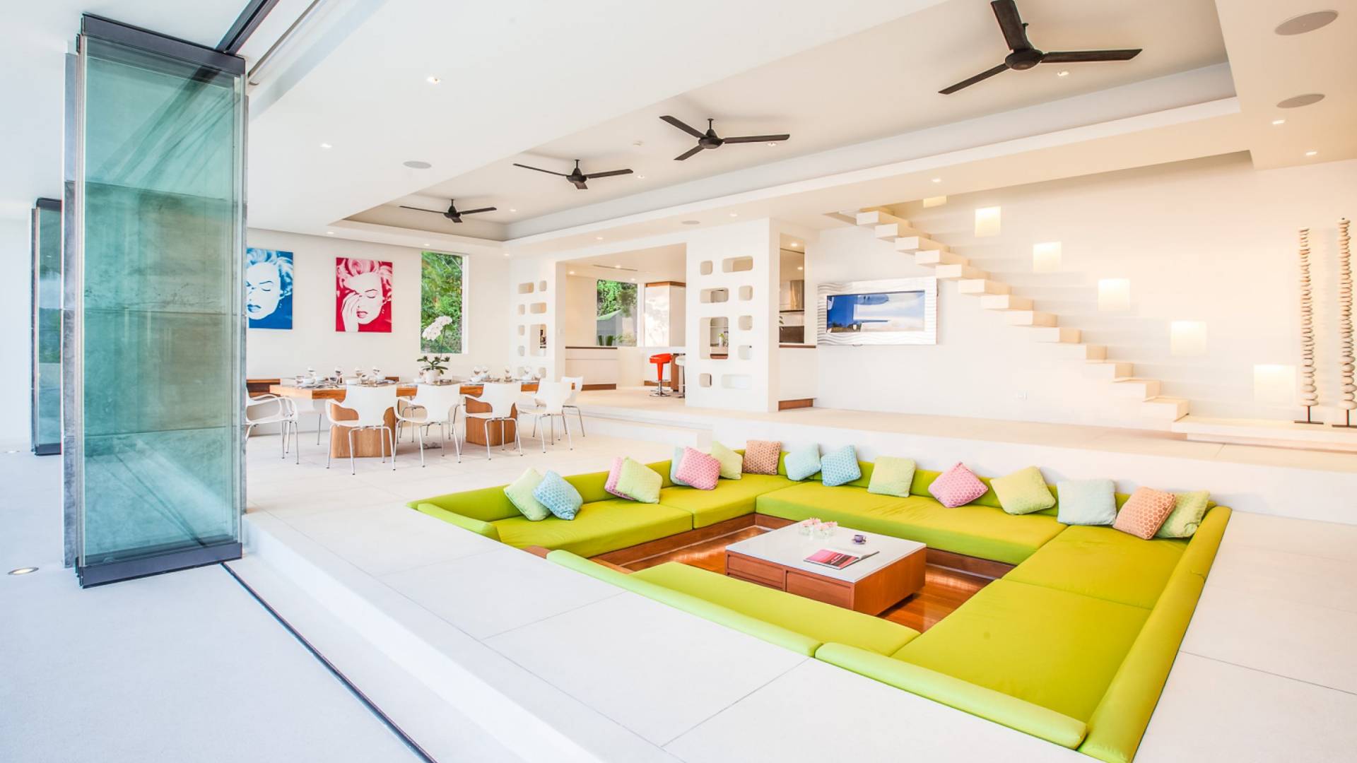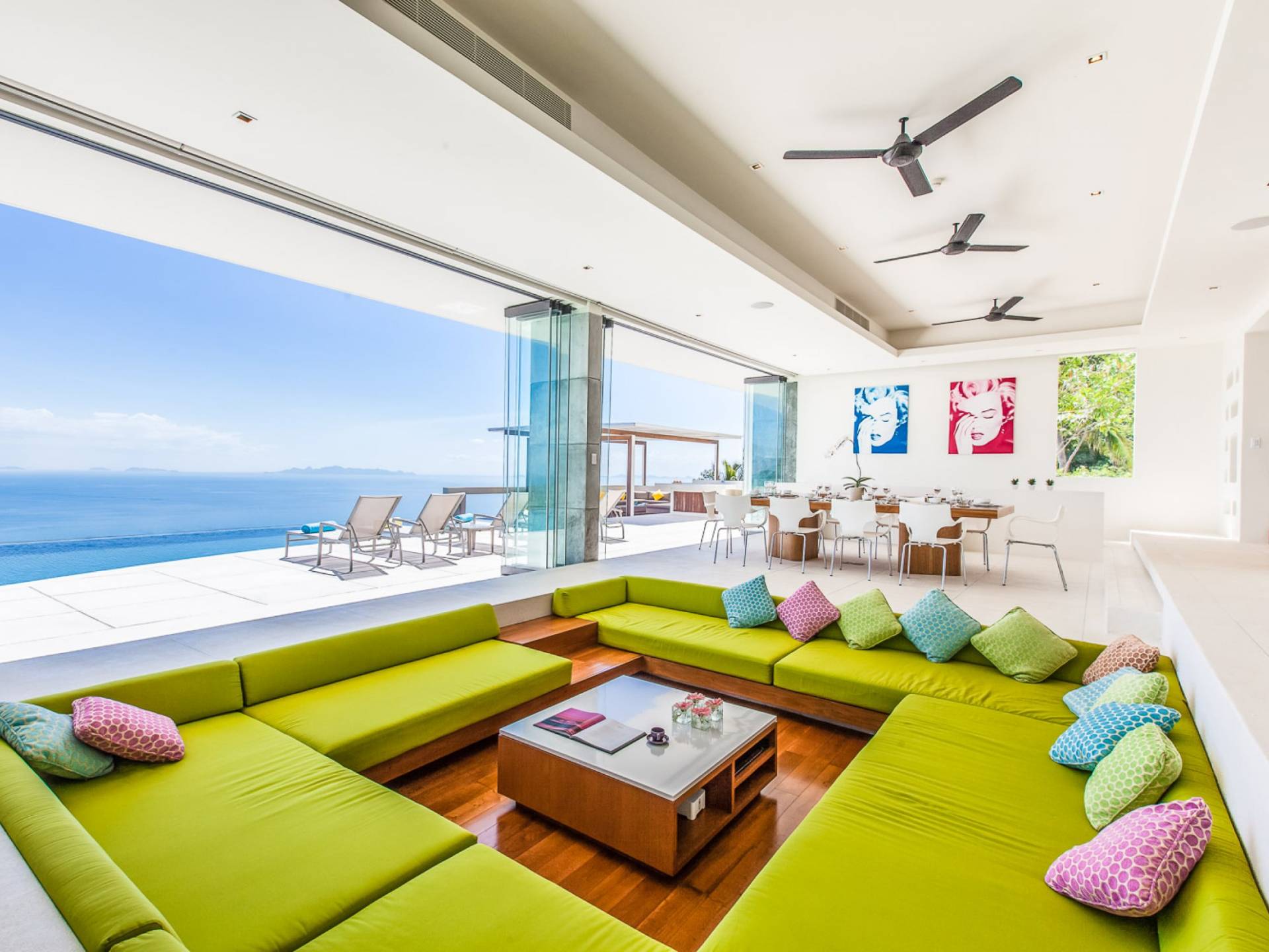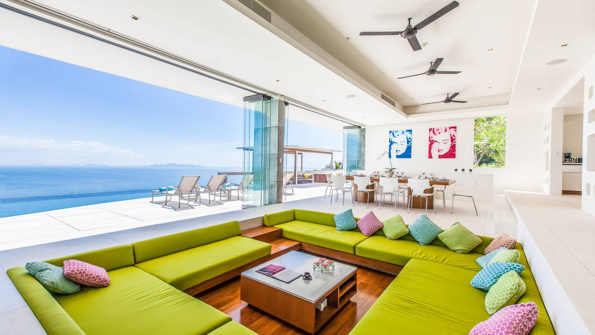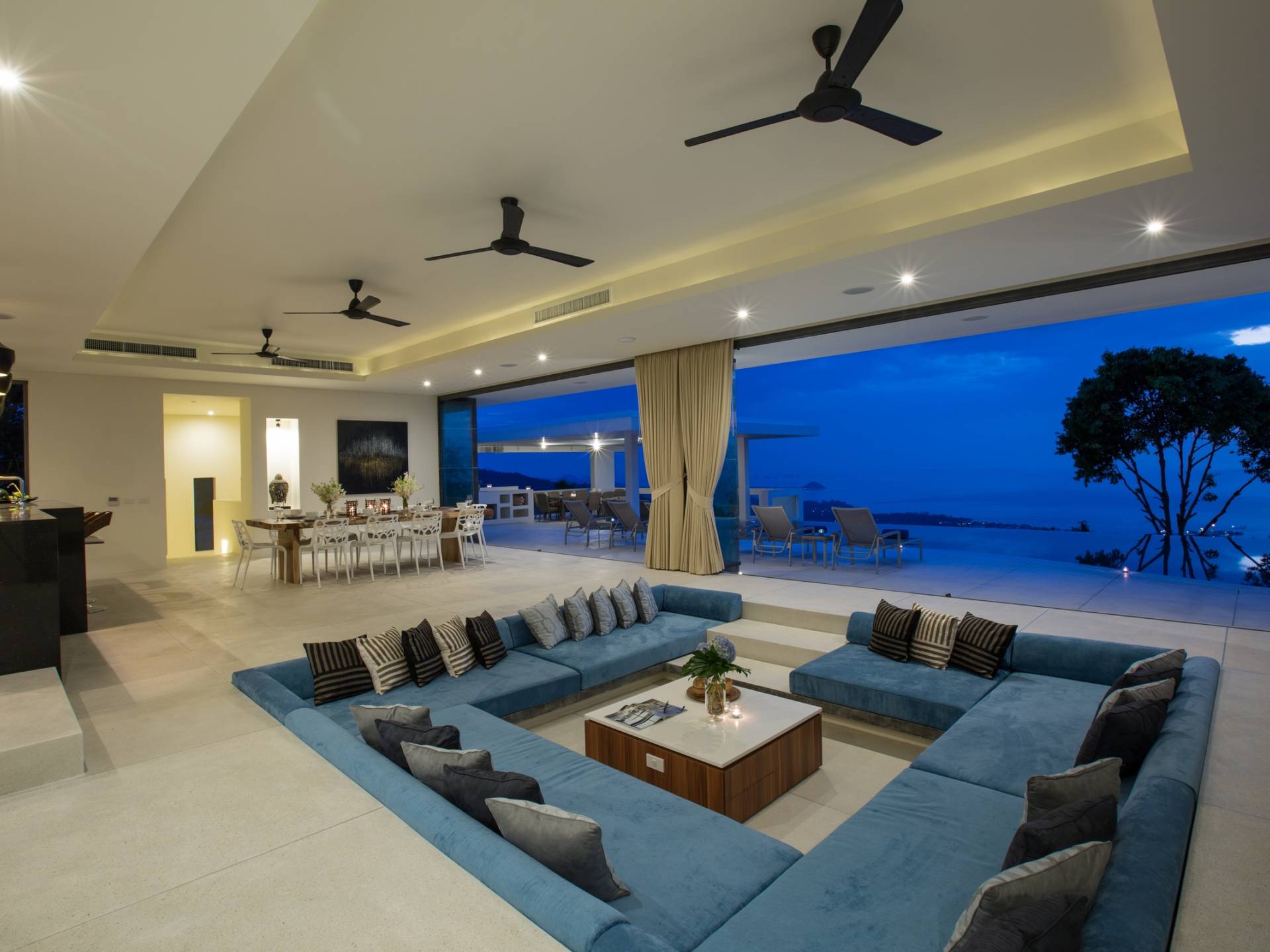 Villa Zest at Lime Samui itself extends over three separate levels, offering guests an impressive choice of private and communal areas to relax and enjoy their spectacular surroundings in style. This luxury villa features five bedrooms, seven bathrooms, a pool sala, a fully equipped gym, and a study room with its own comfortable terrace and built-in sofas. With the huge private infinity pool as a focal point, the rooms open onto outdoor terraces to merge indoor and outdoor areas, creating a real sense of space and freedom. The Great Room combines a comfortable lounge, dining area, and fully fitted western kitchen, each positioned at different levels connected by steps. Comfortable sofas in the sunken living space are poised before a wall-mounted flat-screen TV, while a 10-seater dining table awaits evening meals prepared in the modern, luxury-fitted kitchen. In addition to the indoor dining space, the villa also features an outside dining Sala with a BBQ area for the ultimate alfresco feast.