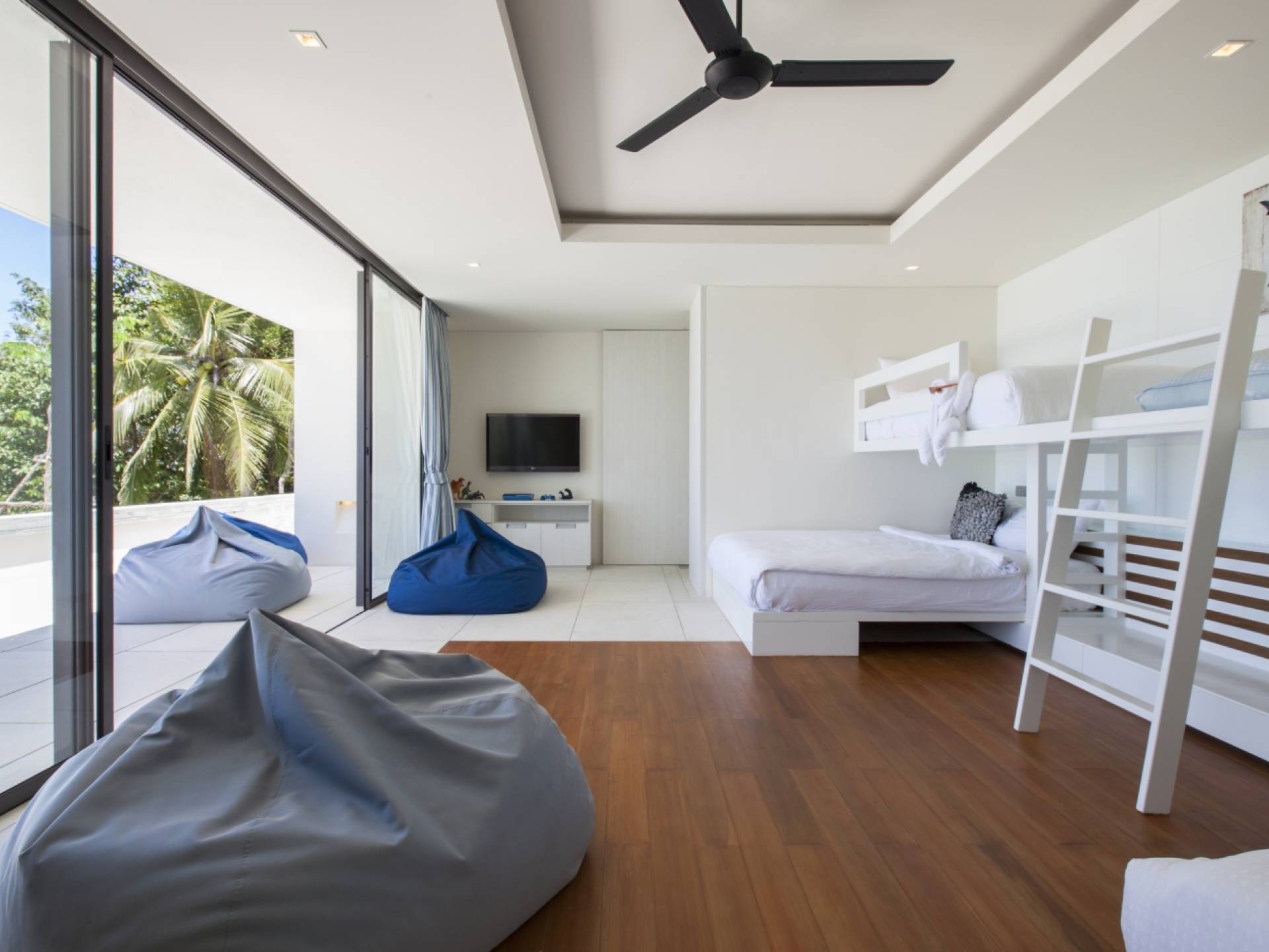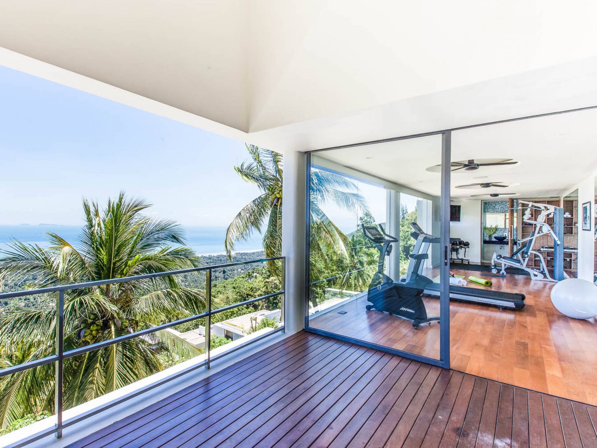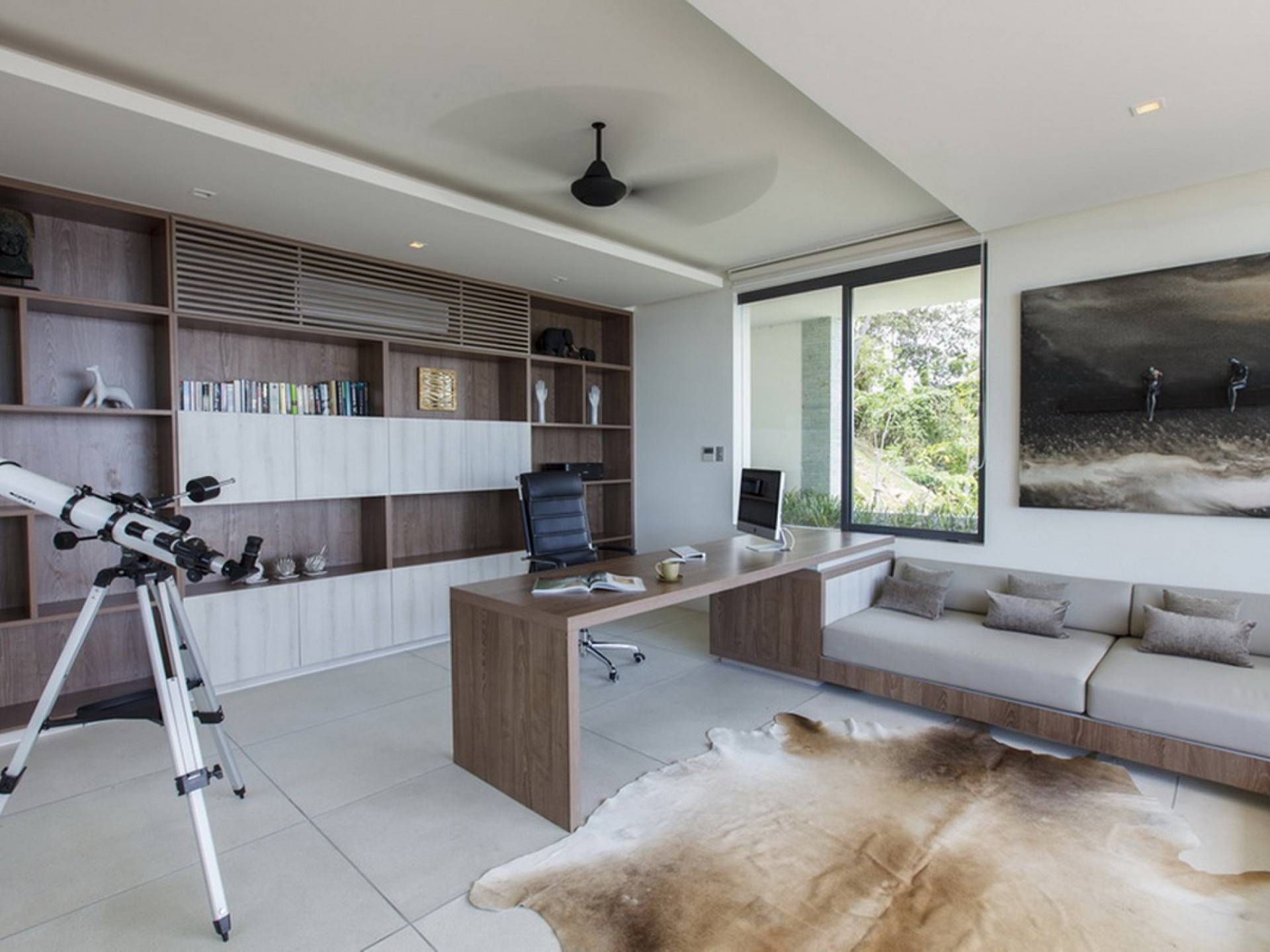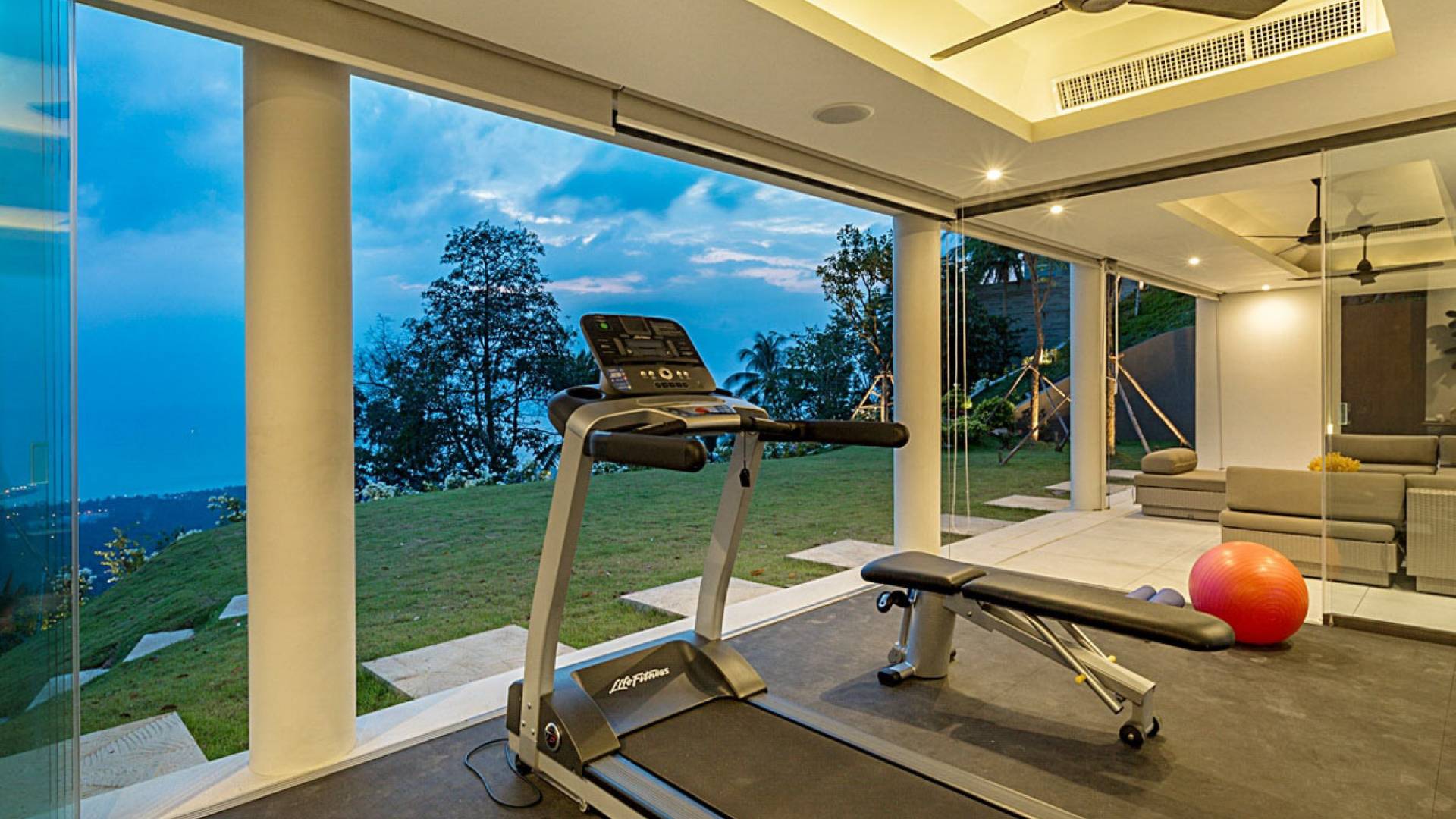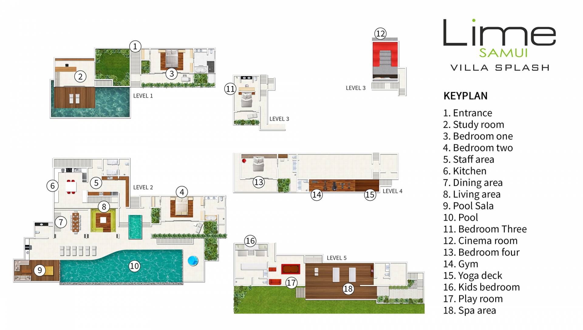 Rather than being built as stand-alone pavilions, all amenities are conveniently contained within a single, spacious, three-level property. The supreme layout and design ensure a unique, private tropical experience. Villa Splash at Lime Samui has five superior bedrooms, eight elegant bathrooms, a pool sala, a spa room, a fully equipped gym, a library room with a sun deck, and a deluxe private cinema with the most comfortable couches set before a three-meter screen. Another standout feature is the Great Room, which opens directly onto the pool deck and combines a lounge, a dining room, and a kitchen, each one on different levels.
