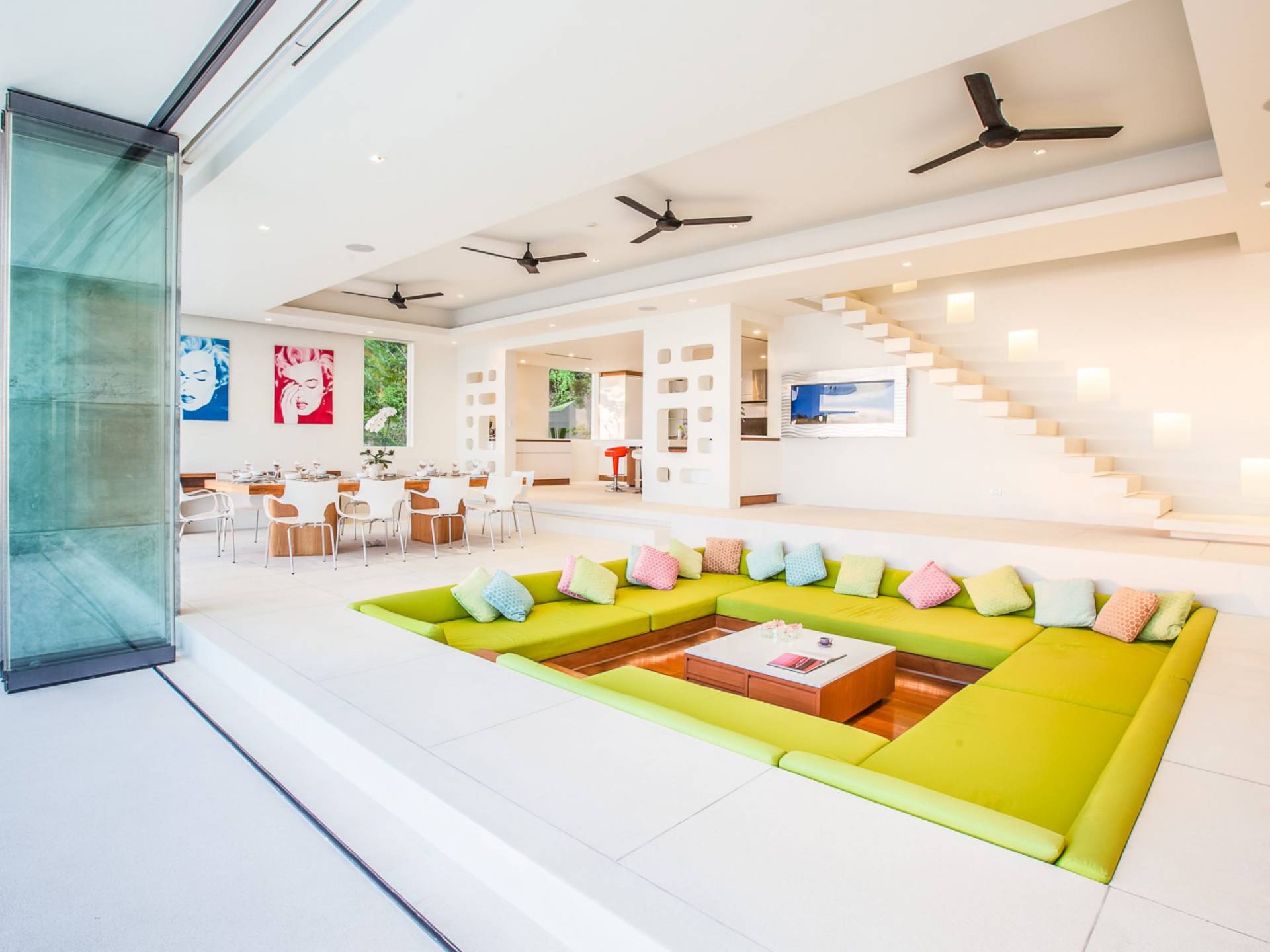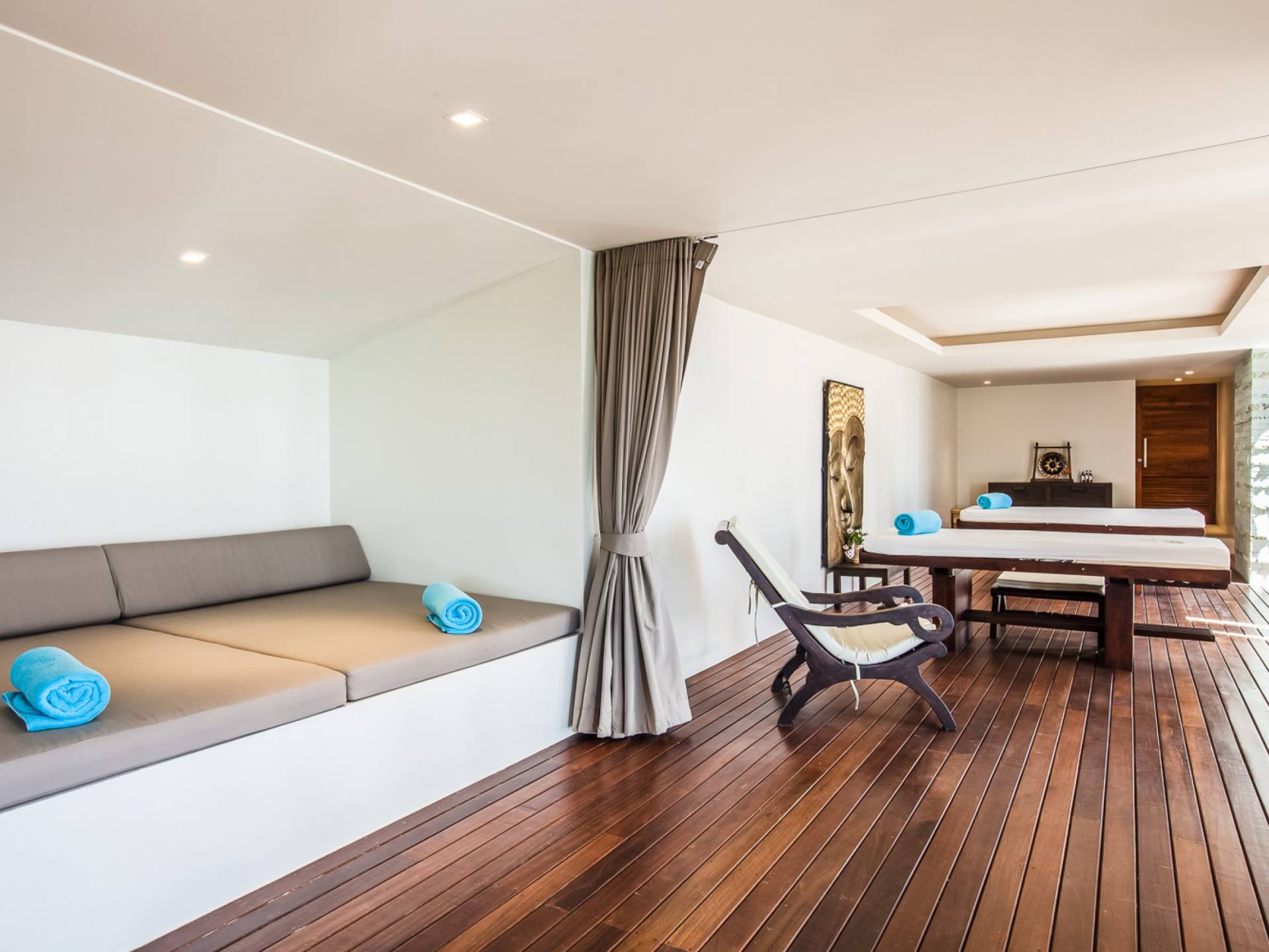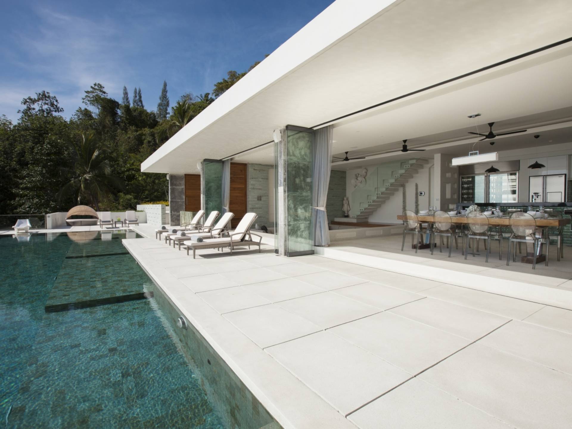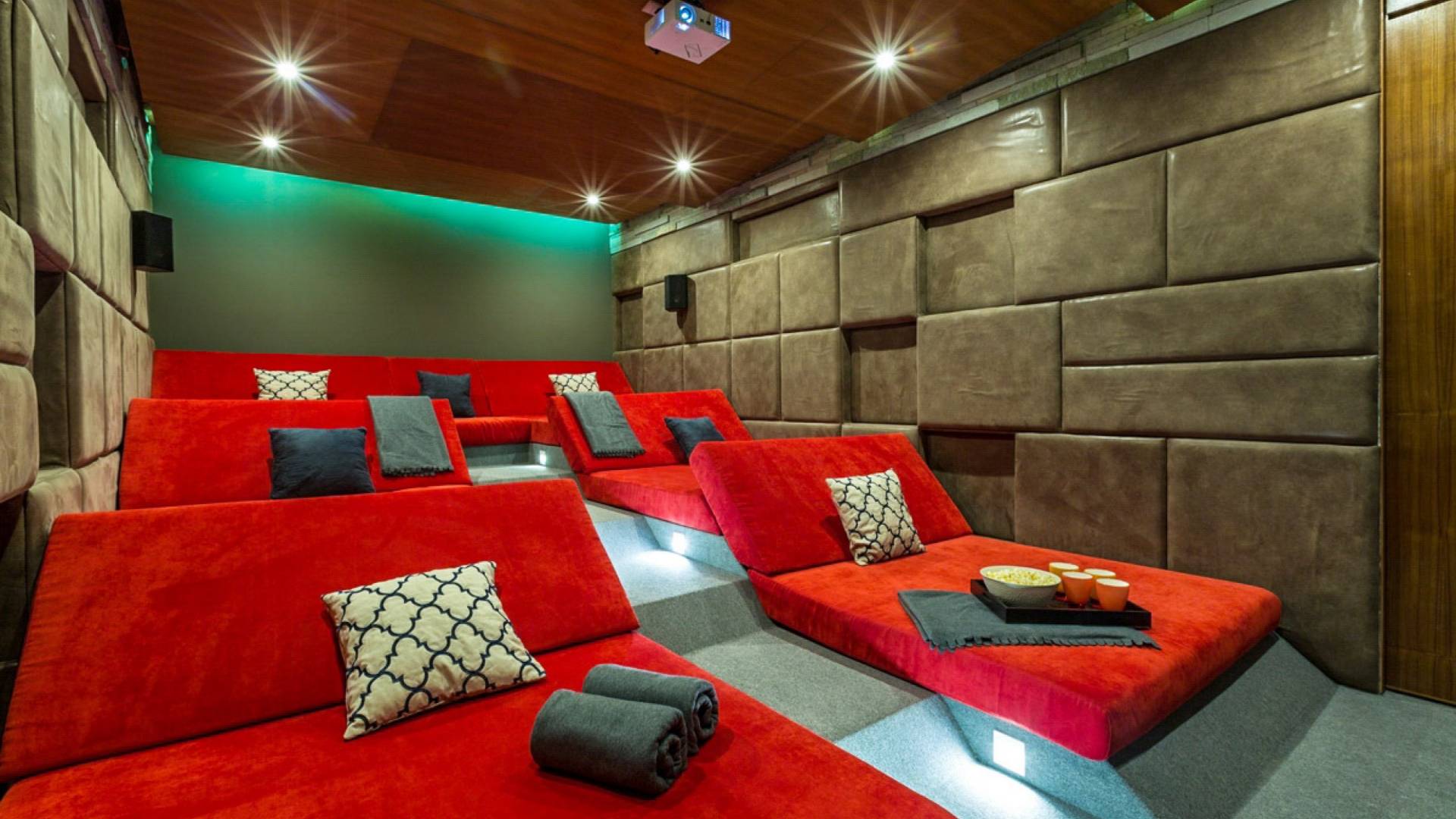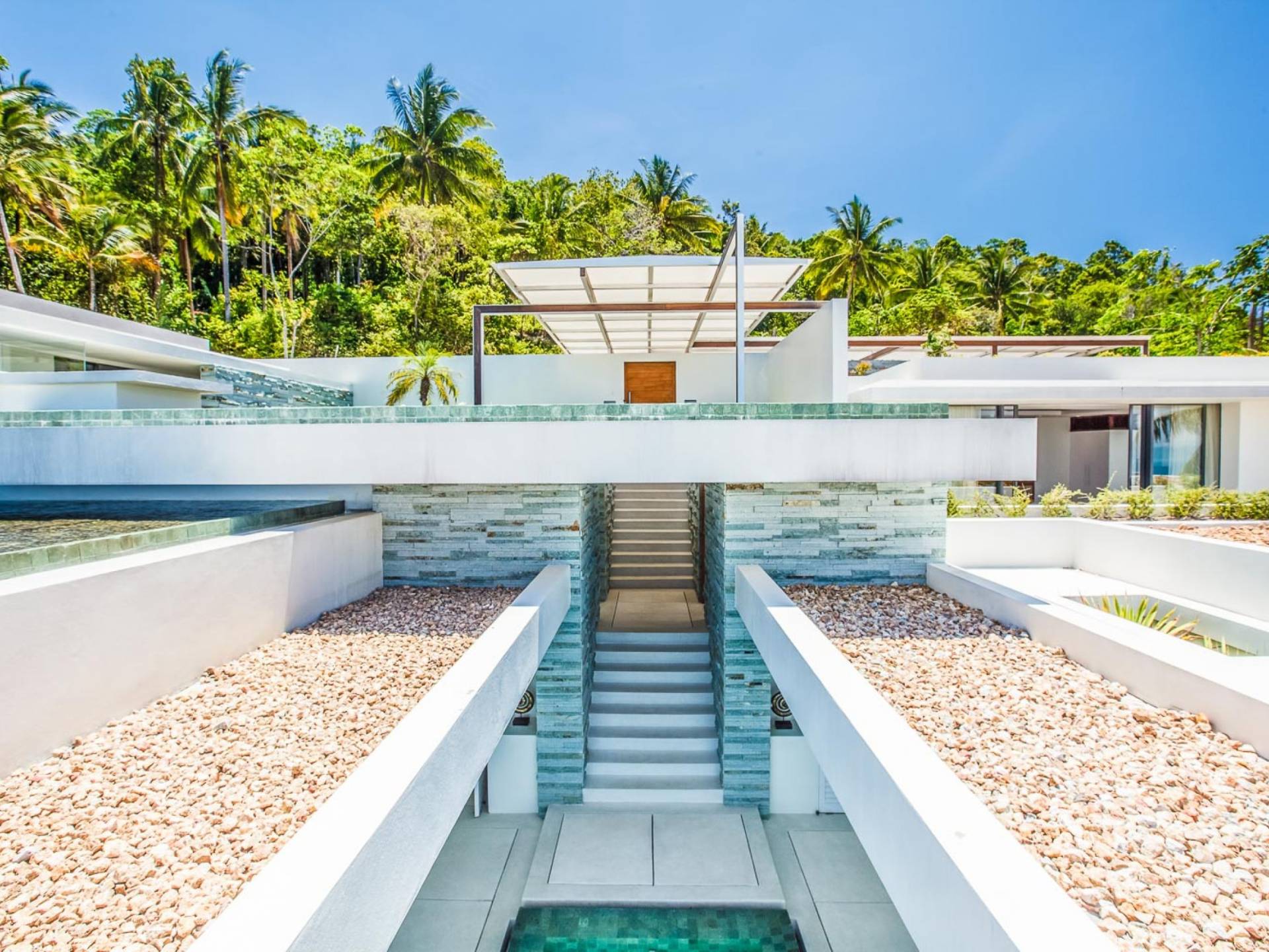 Rather than being built as stand-alone pavilions, all amenities are conveniently contained within a single, spacious, three-level property. The supreme layout and design ensure a unique, private tropical experience. Villa Splash at Lime Samui has five superior bedrooms, eight elegant bathrooms, a pool sala, a spa room, a fully equipped gym, a library room with a sun deck, and a deluxe private cinema with the most comfortable couches set before a three-meter screen. Another standout feature is the Great Room, which opens directly onto the pool deck and combines a lounge, a dining room, and a kitchen, each one on different levels.